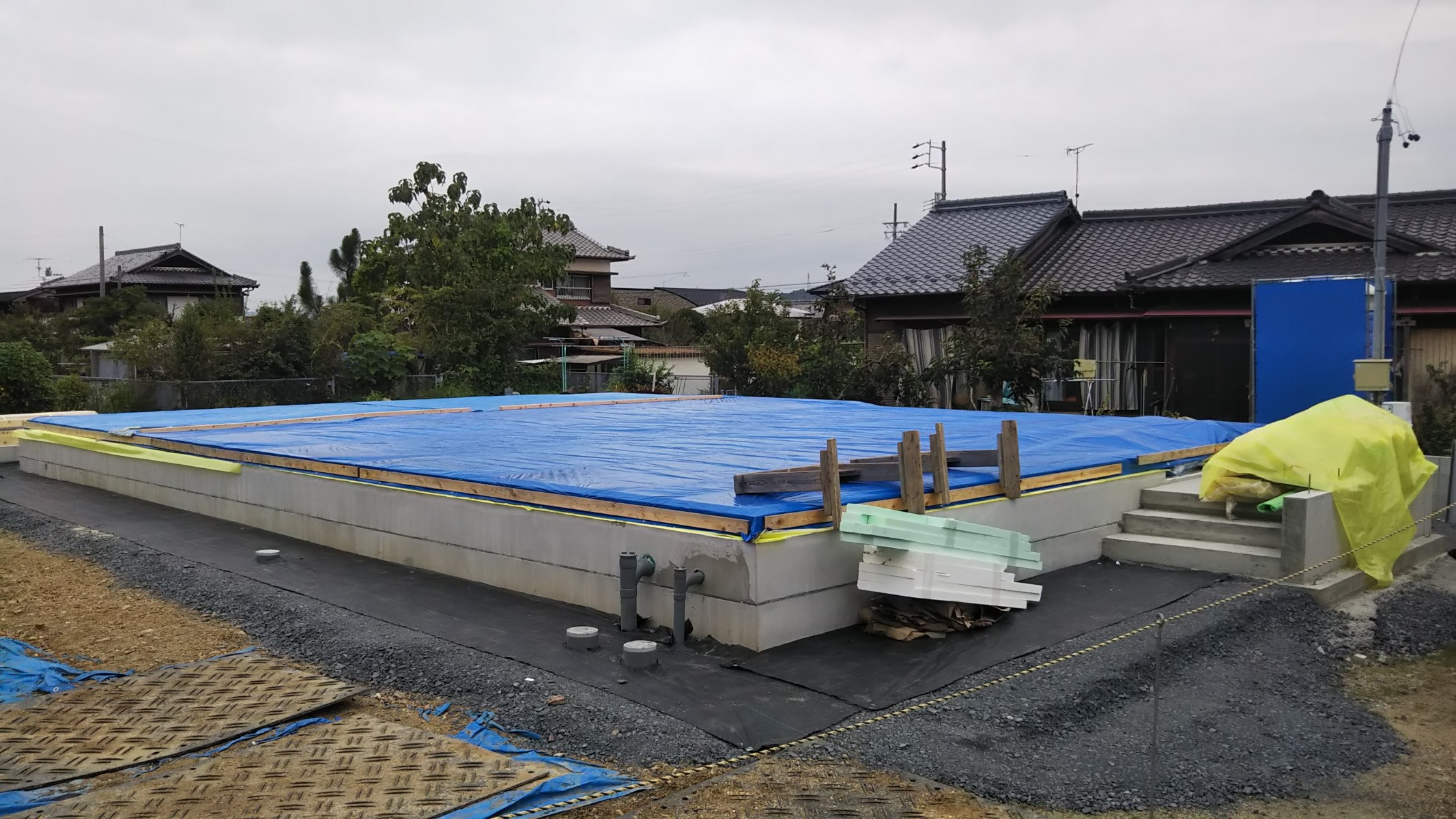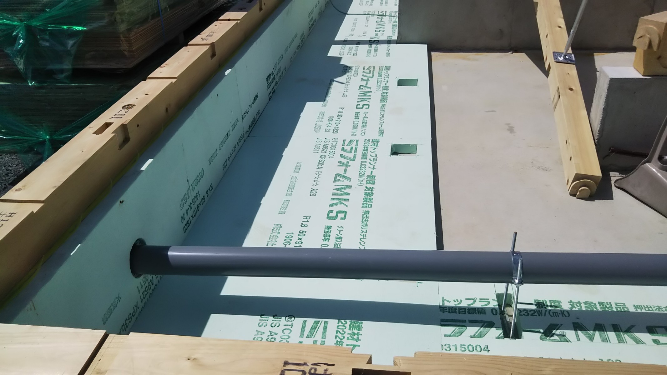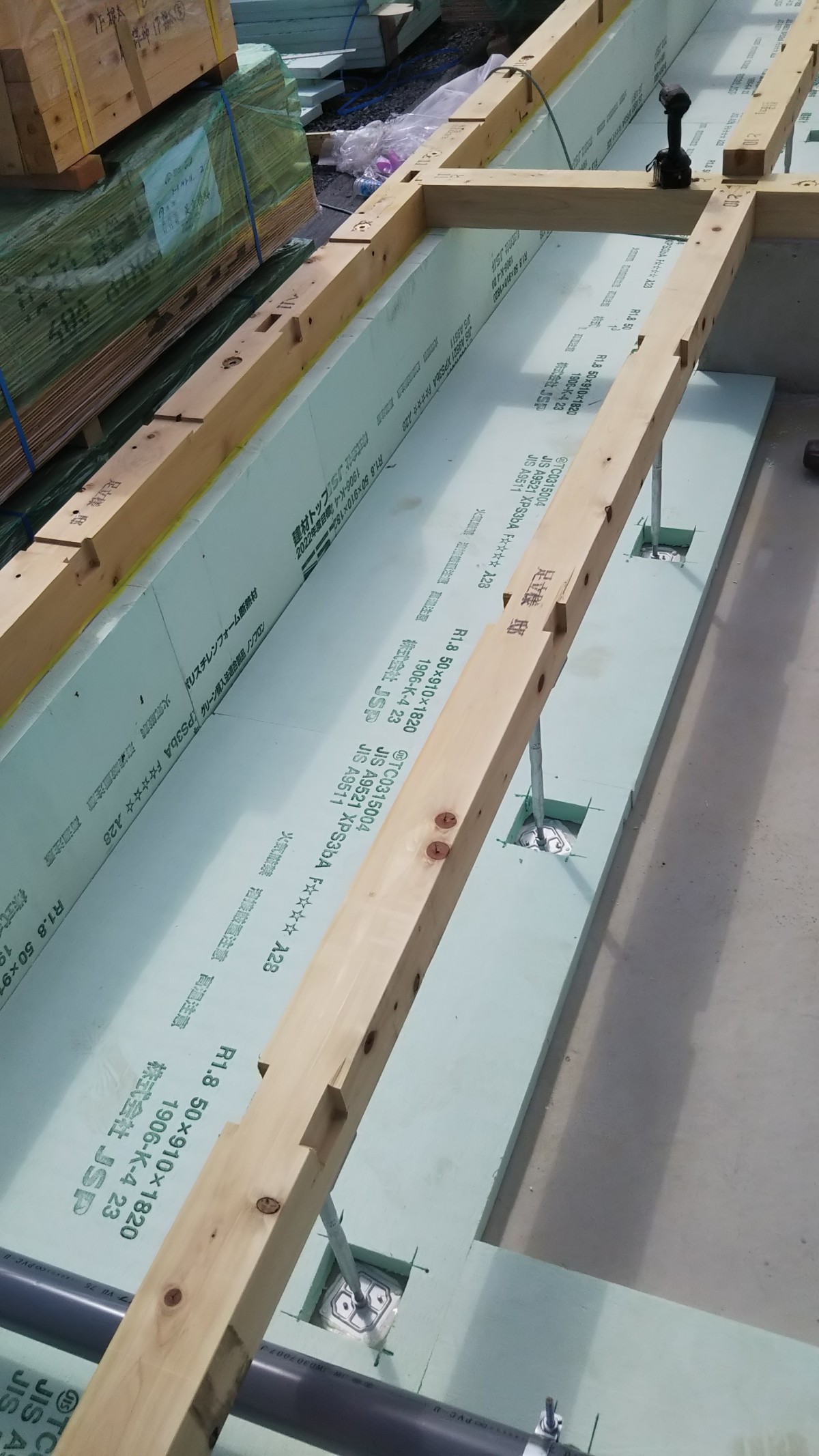 外周1m以内に断熱材ミラフォームを敷きつめます。土台伏せとの並行作業です。