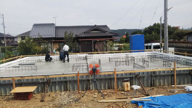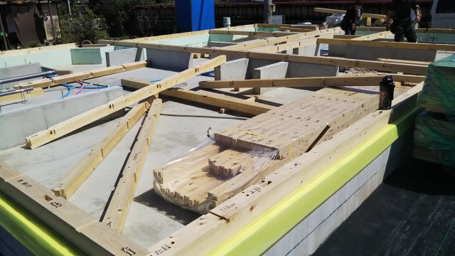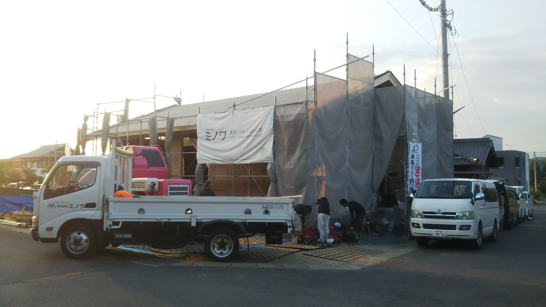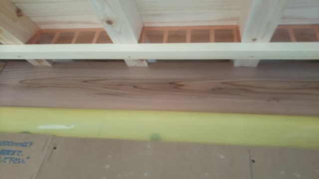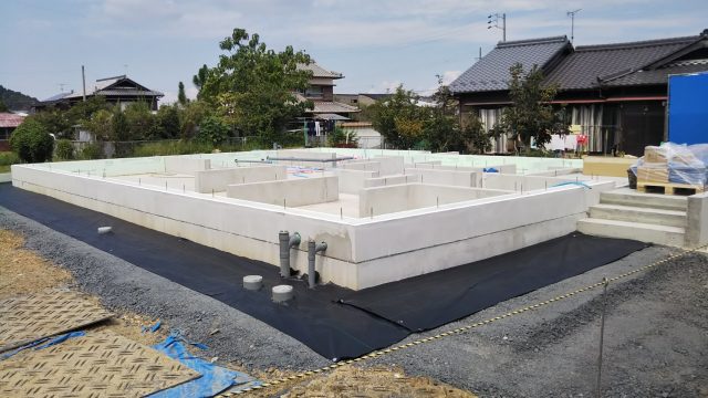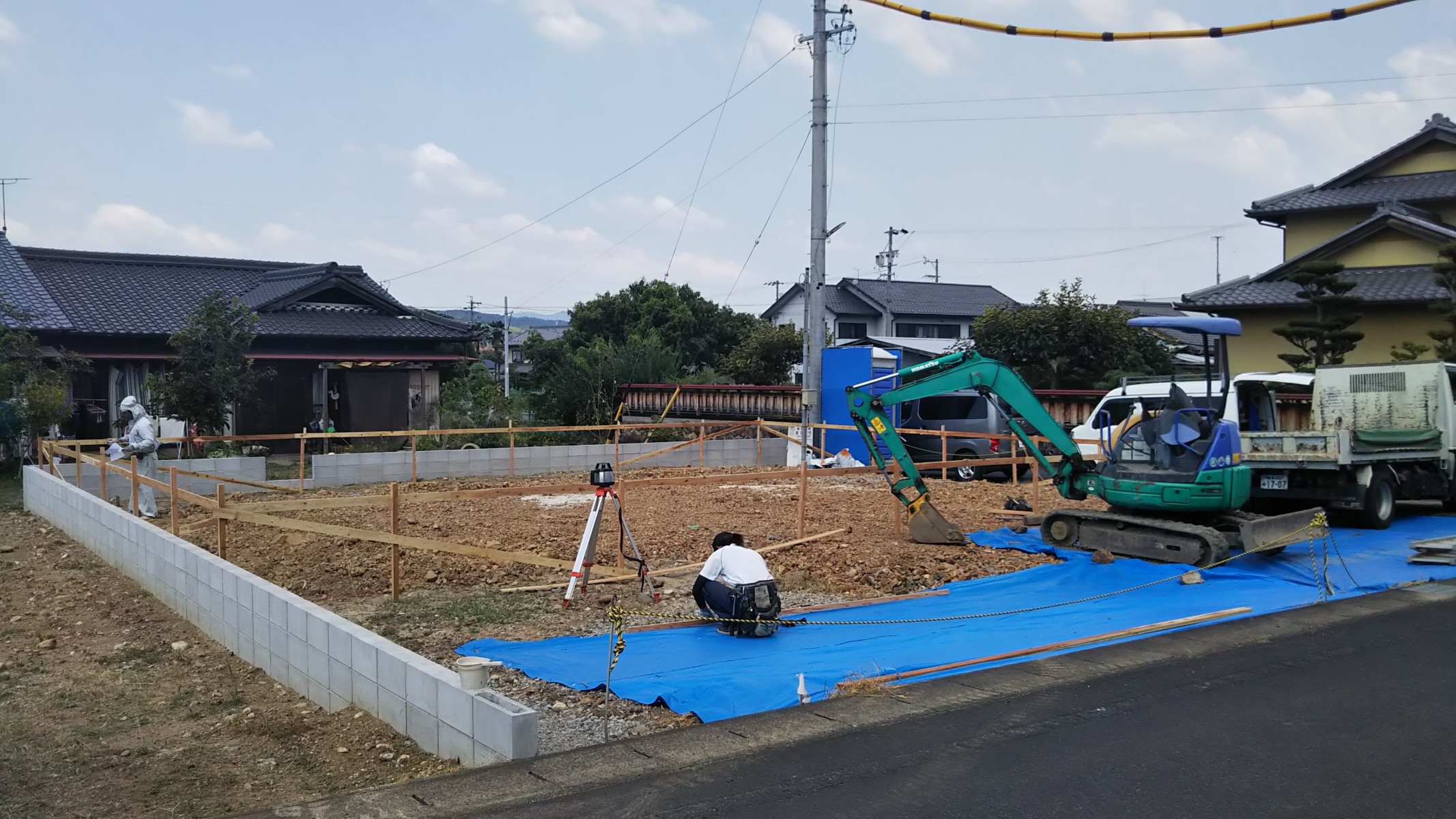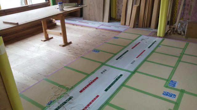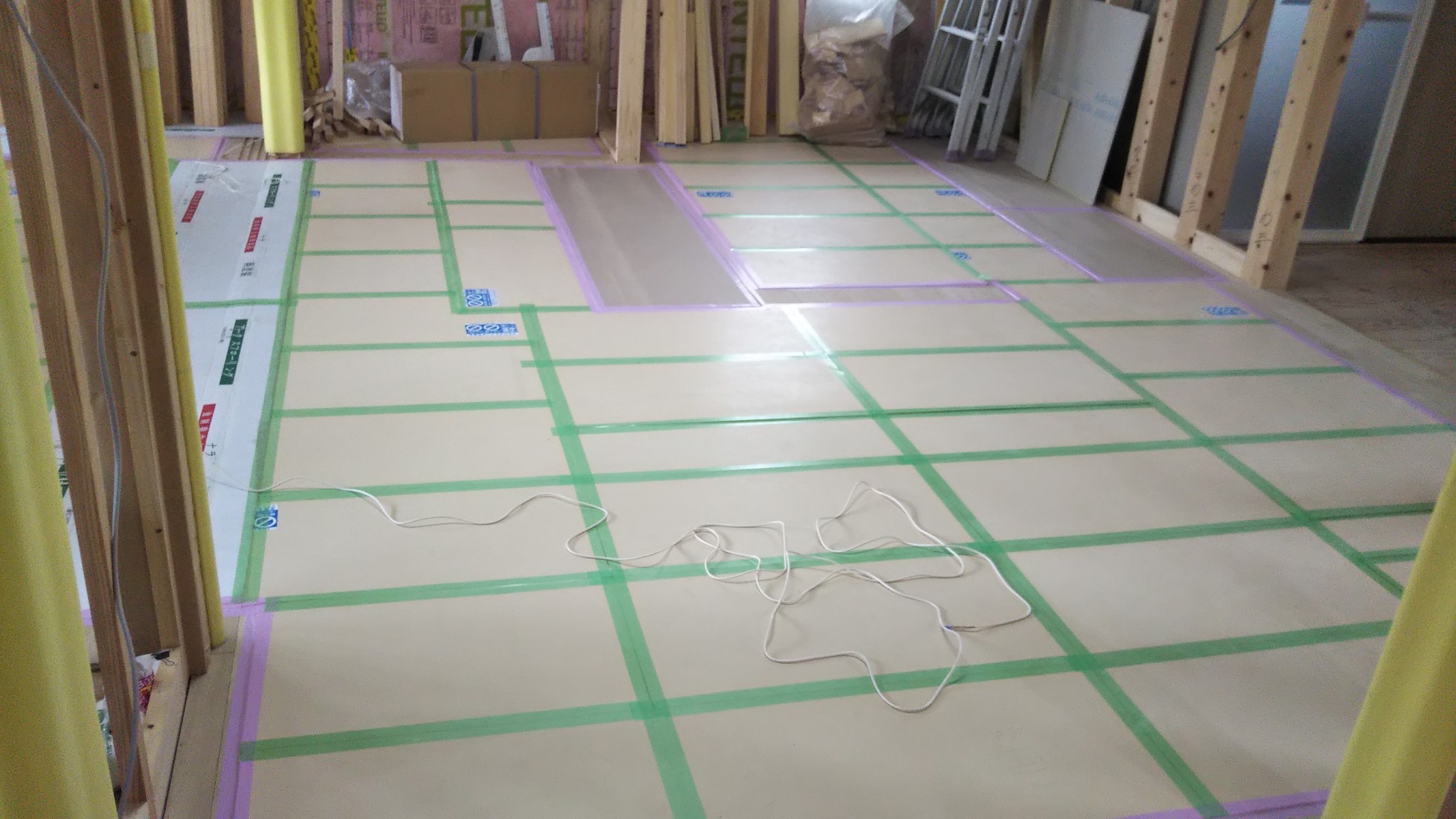 外周1m以内に断熱材ミラフォームを敷きつめます。土台伏せとの並行作業です。