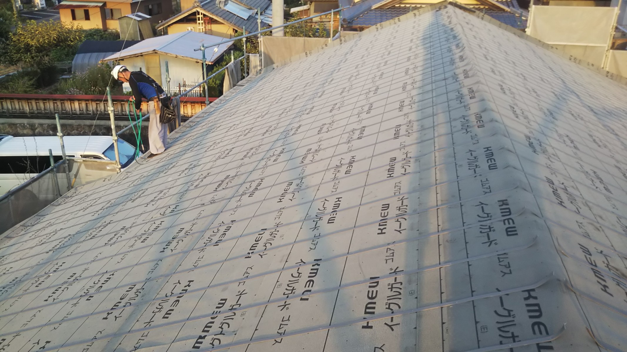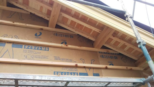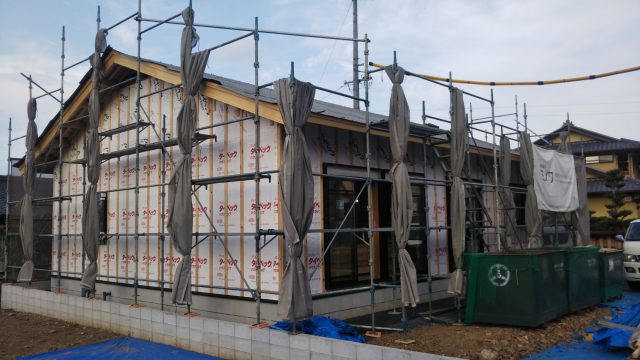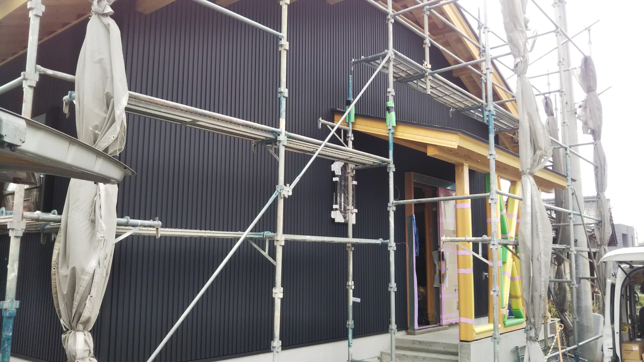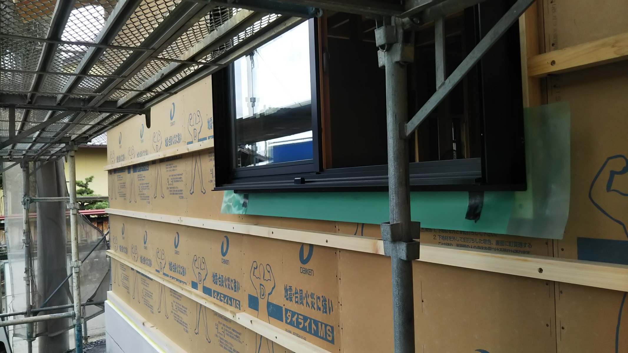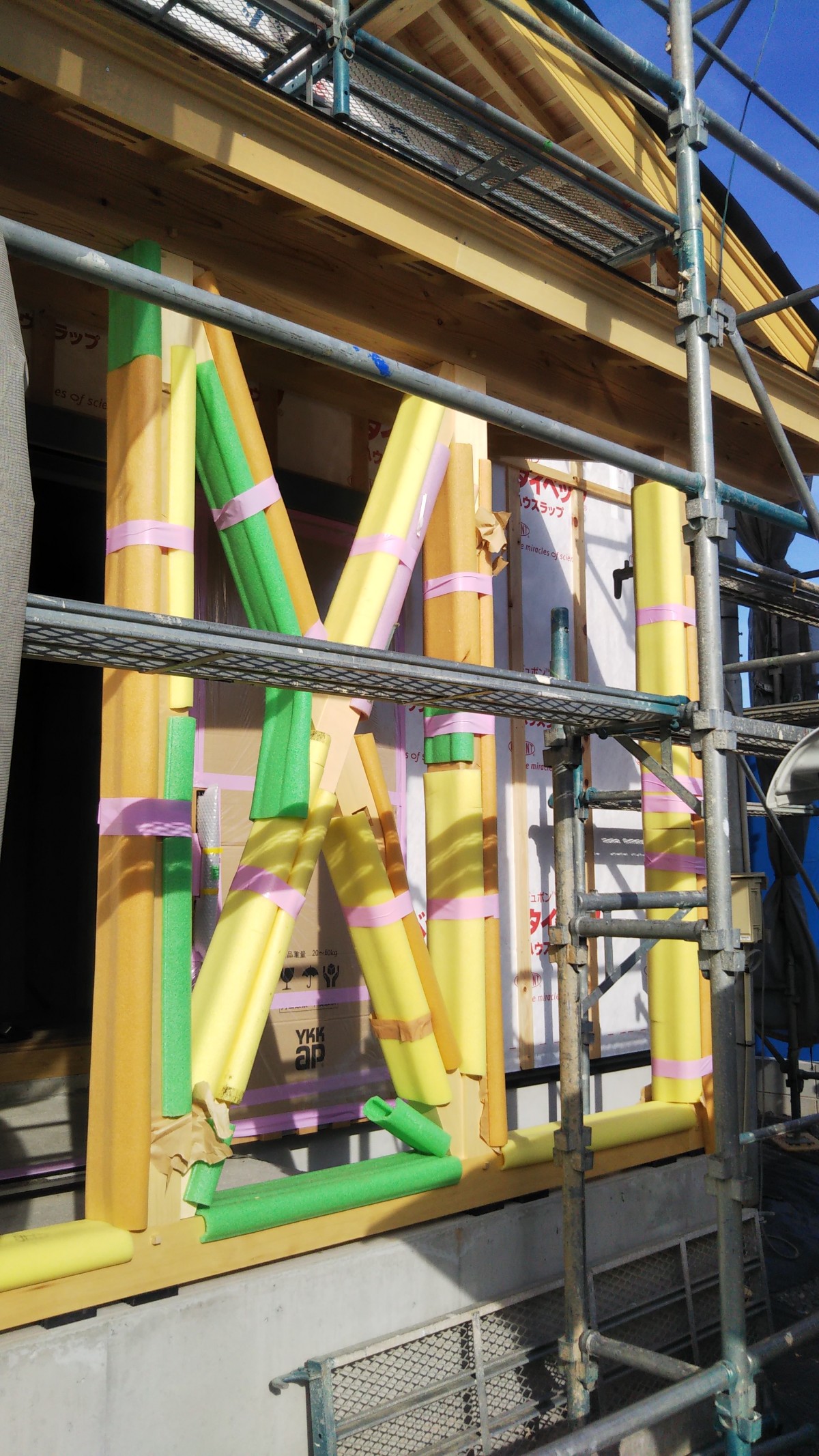 外断熱施工後透湿防水シートを貼り、通気胴縁を取り付けました。