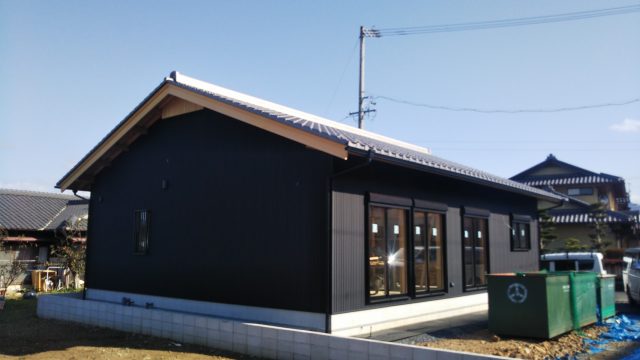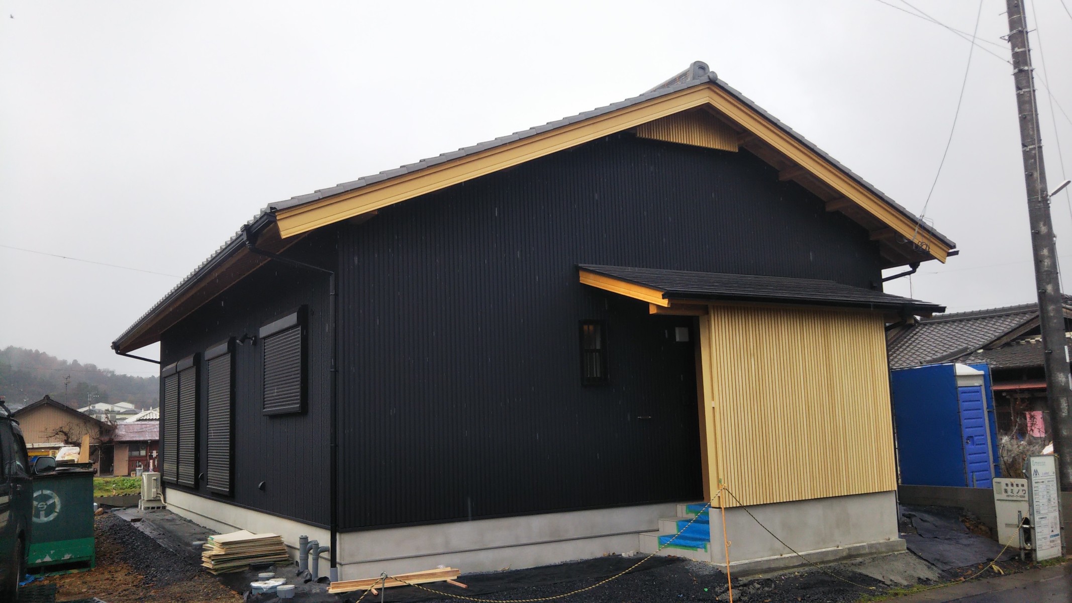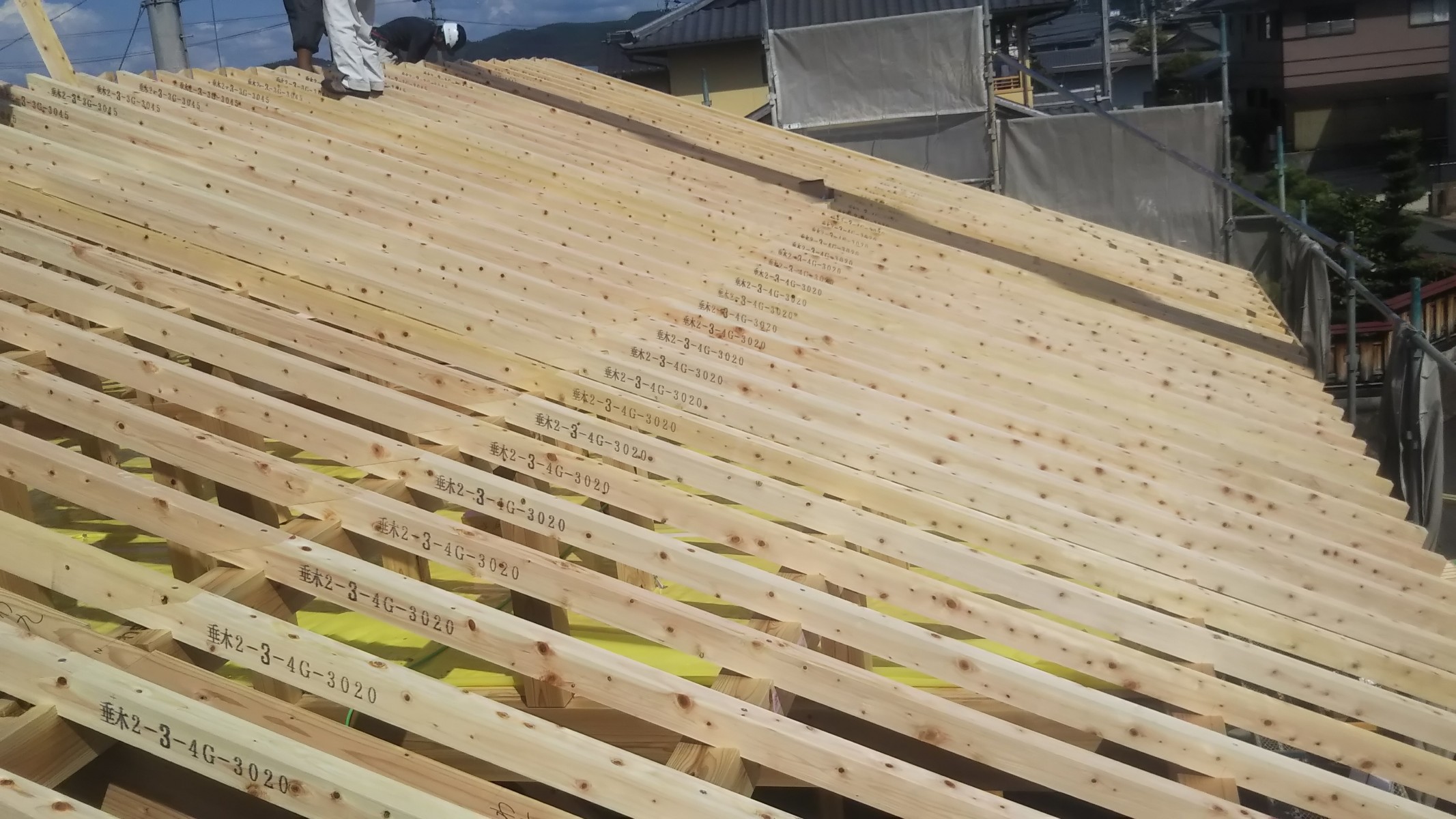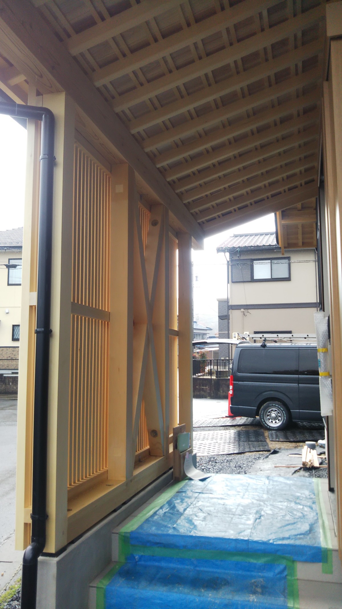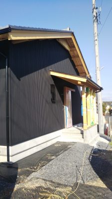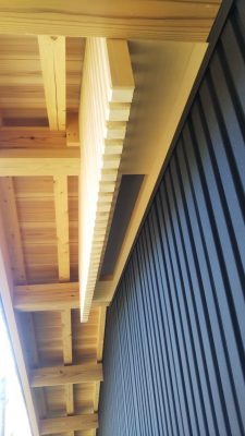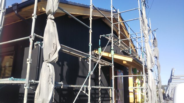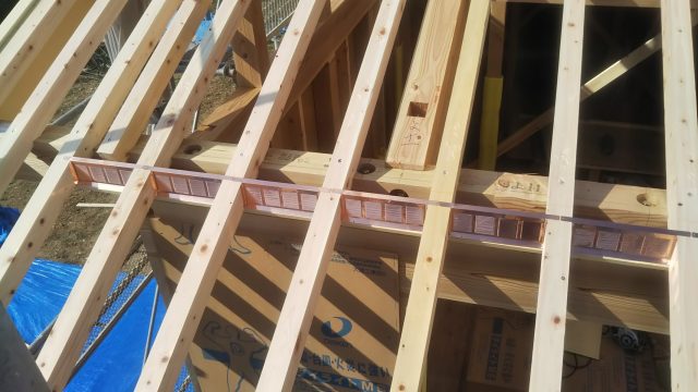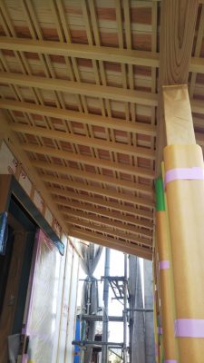 外断熱施工後透湿防水シートを貼り、通気胴縁を取り付けました。