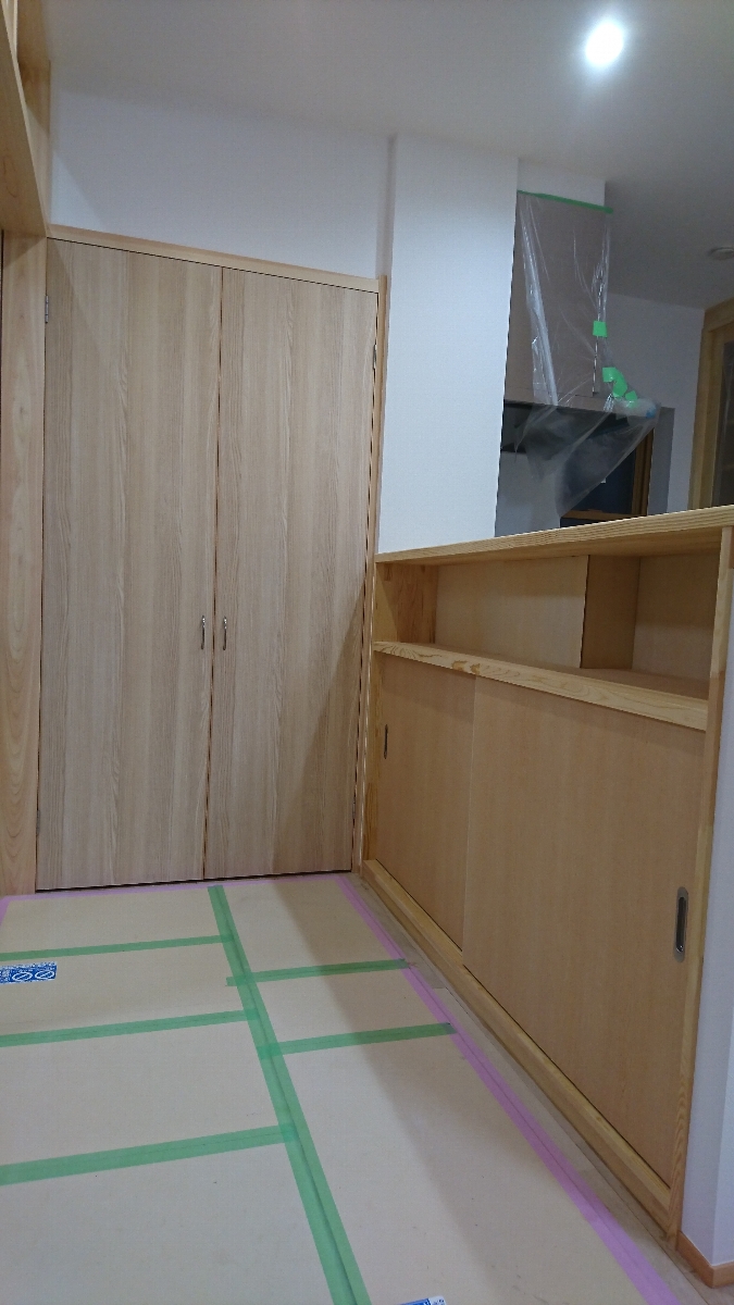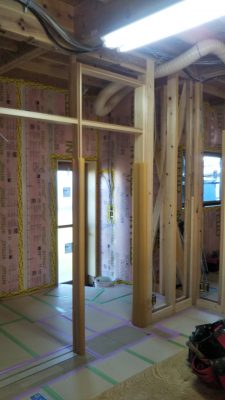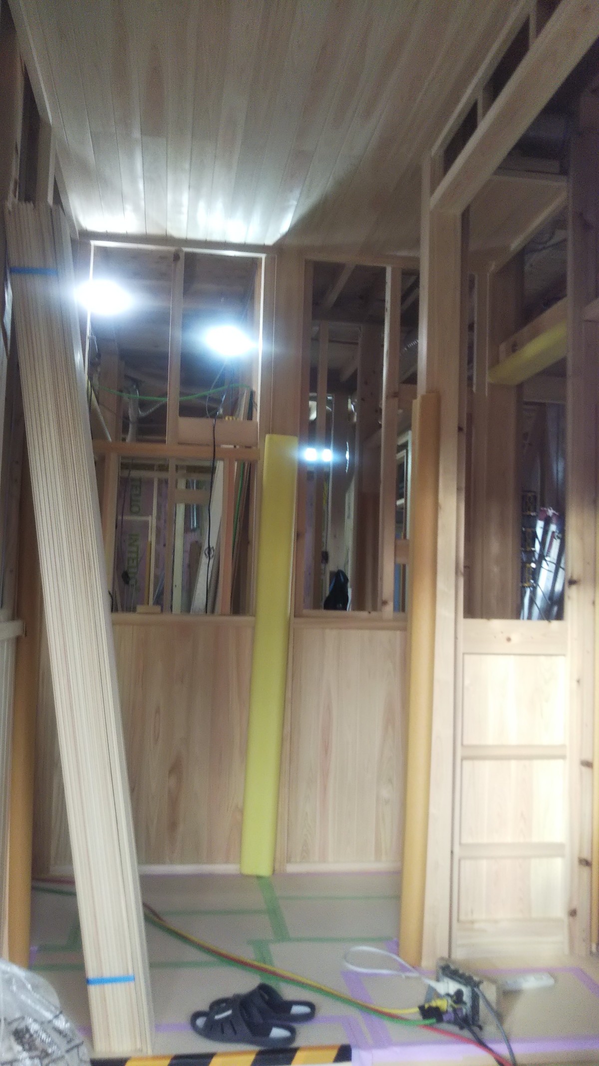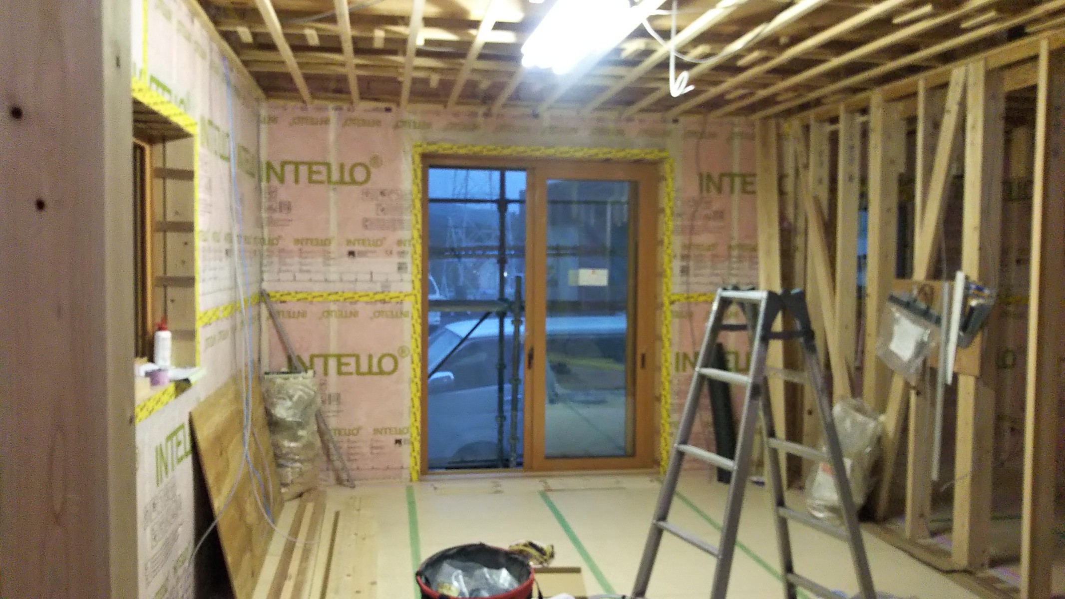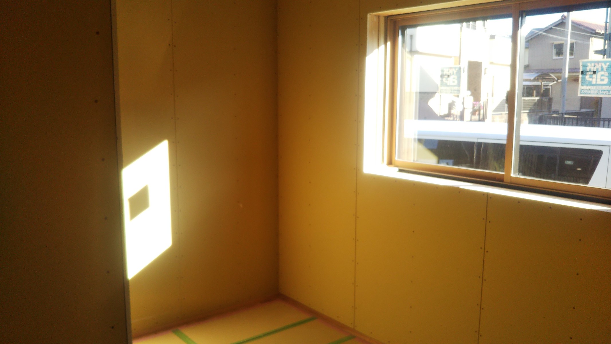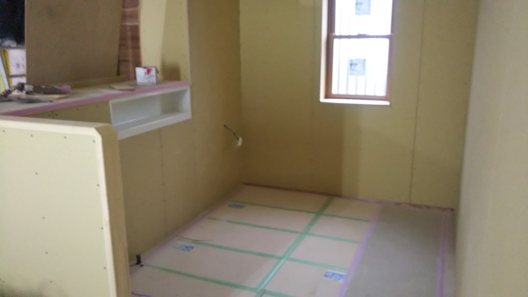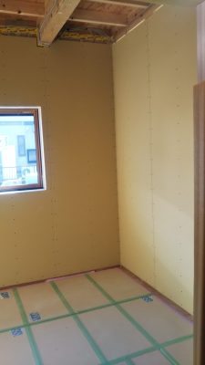 居室はプラスターボード施工中。パテ埋め後クロス貼りです。