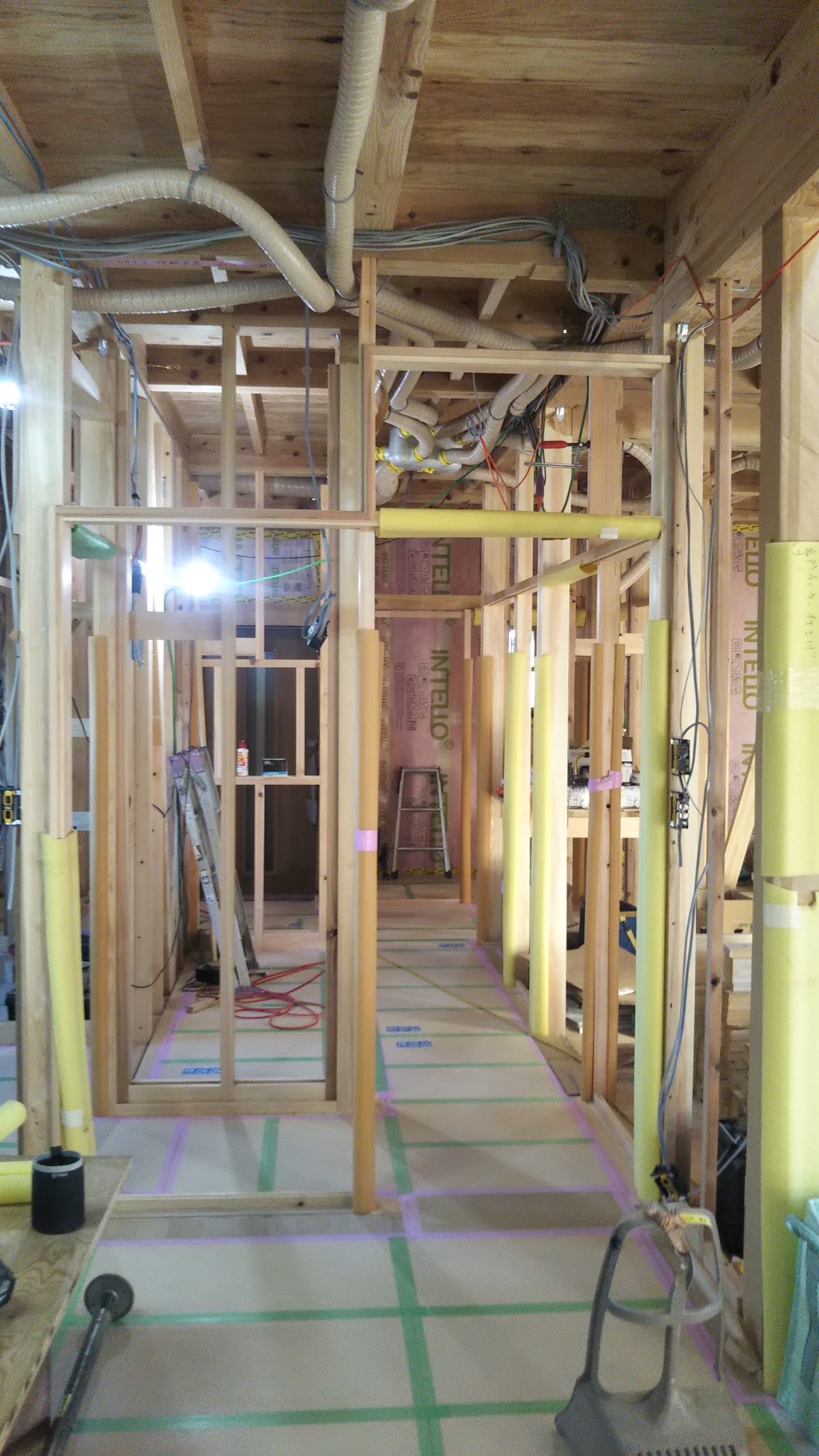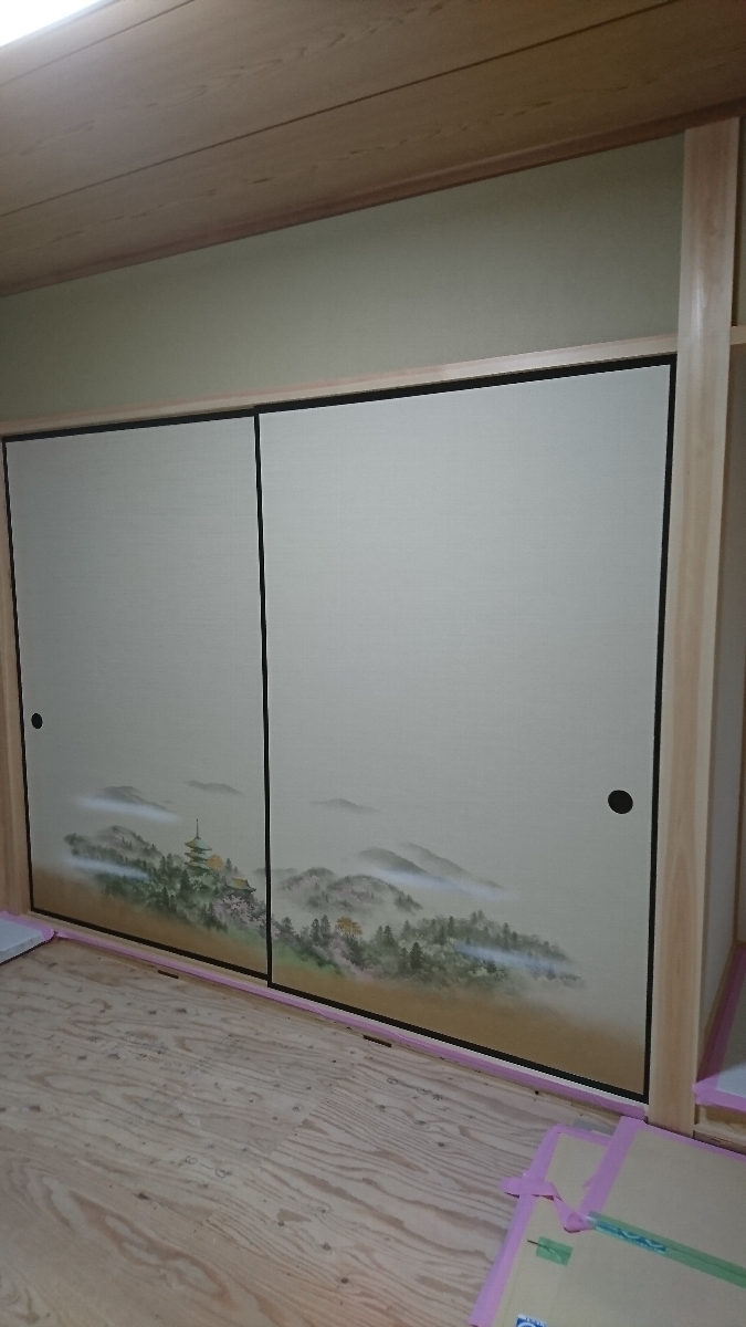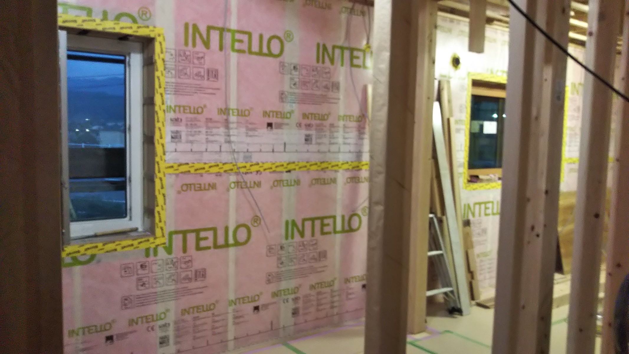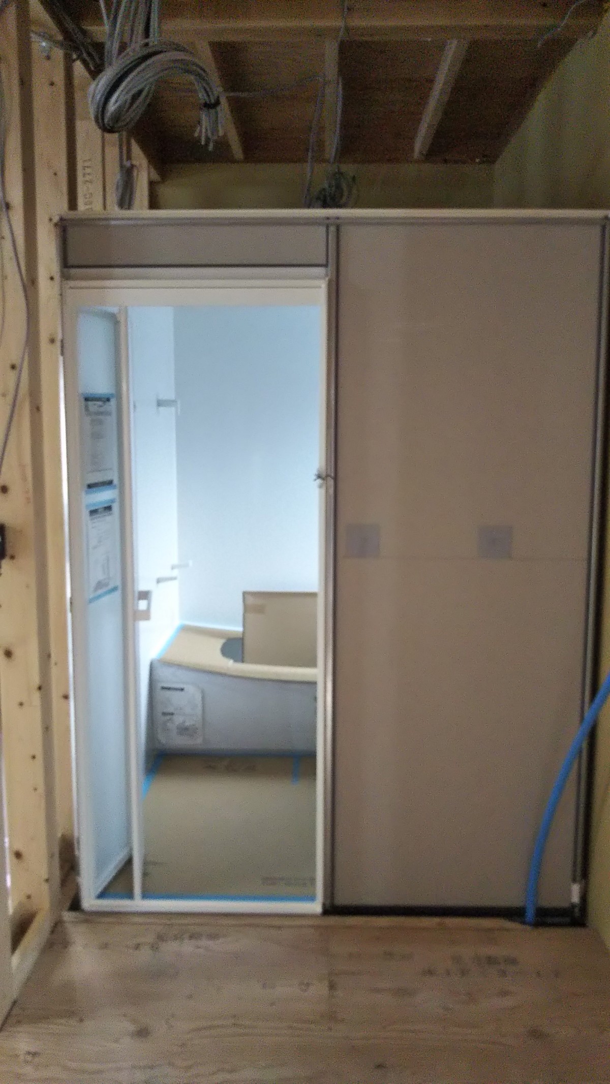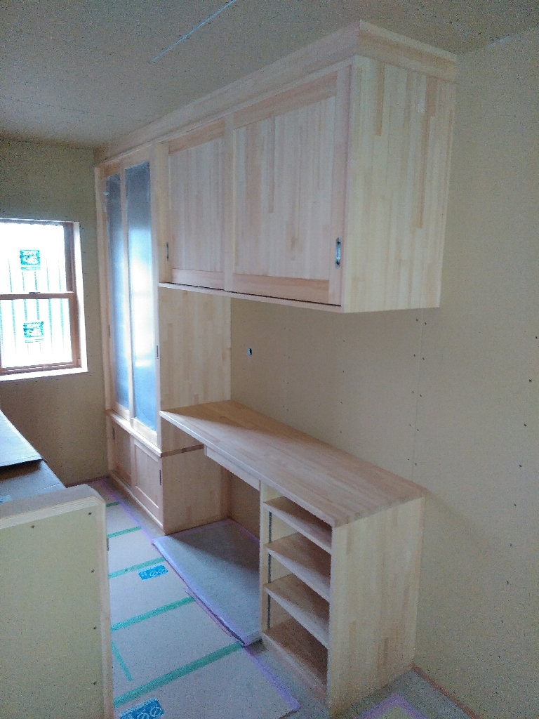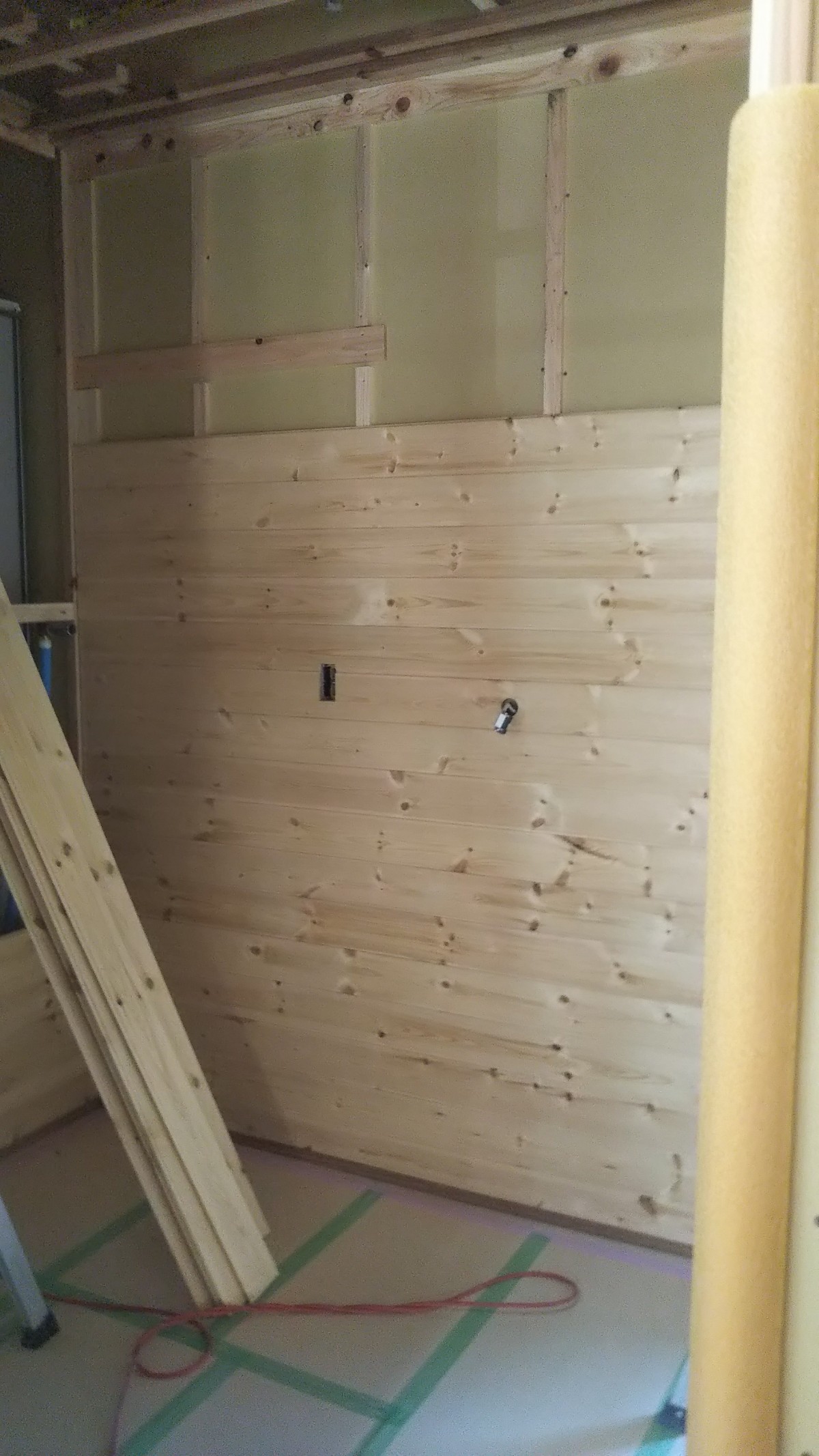 居室はプラスターボード施工中。パテ埋め後クロス貼りです。
