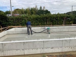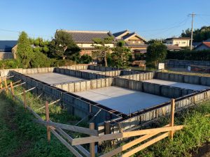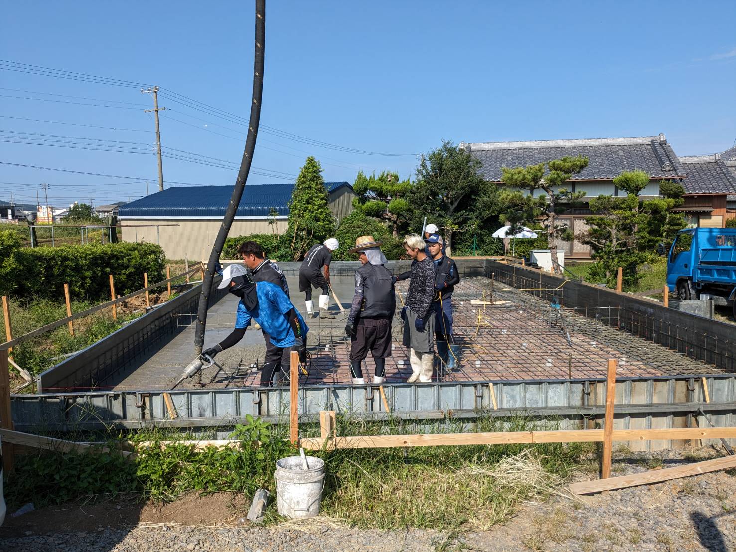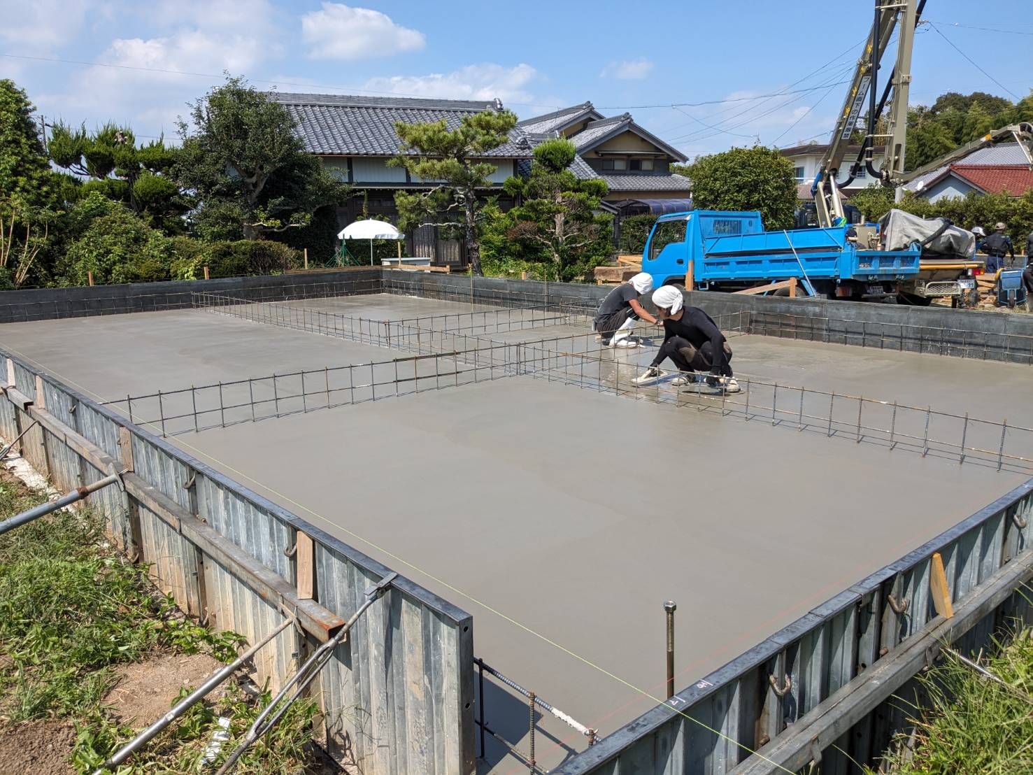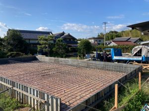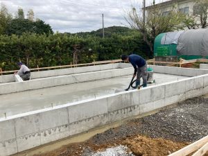 晴天に恵まれ、基礎のスラブコンクリート打設を行っています。本日はy様が現場から作業の写真を送ってくださいました。通常に増して職人の人数がたくさんいますが、同日に2棟分のスラブを打設するため、片方が終わったら天端をコテで押さえるために左官業者さんに応援を依頼しています。