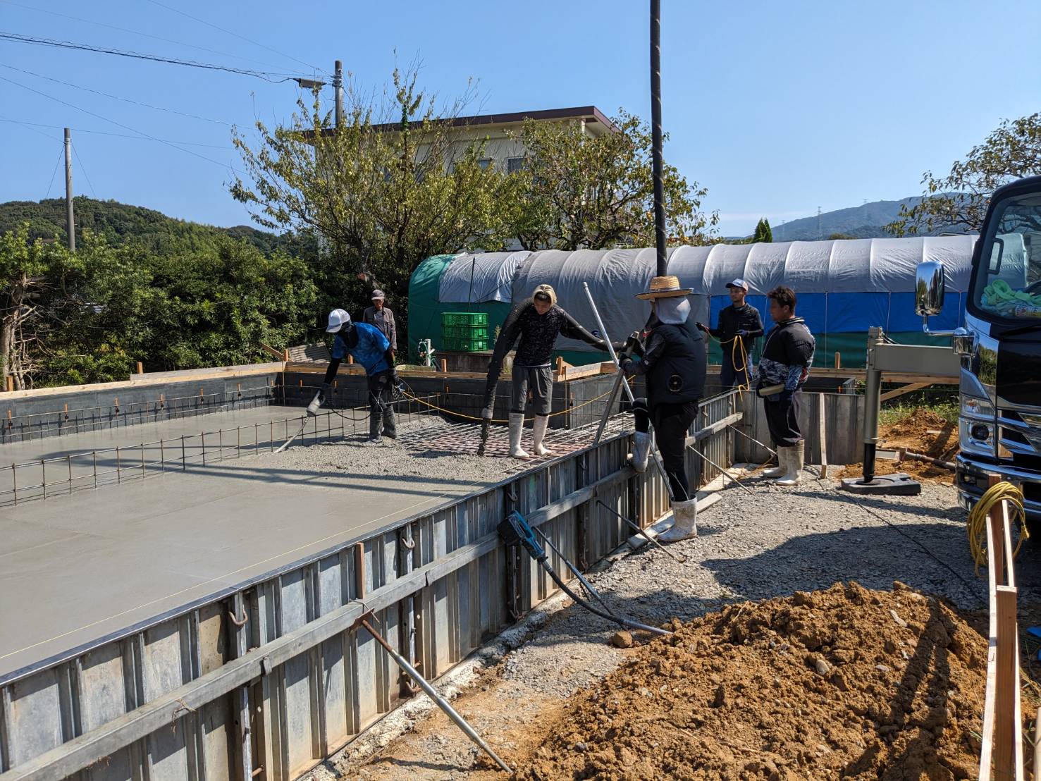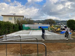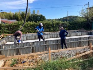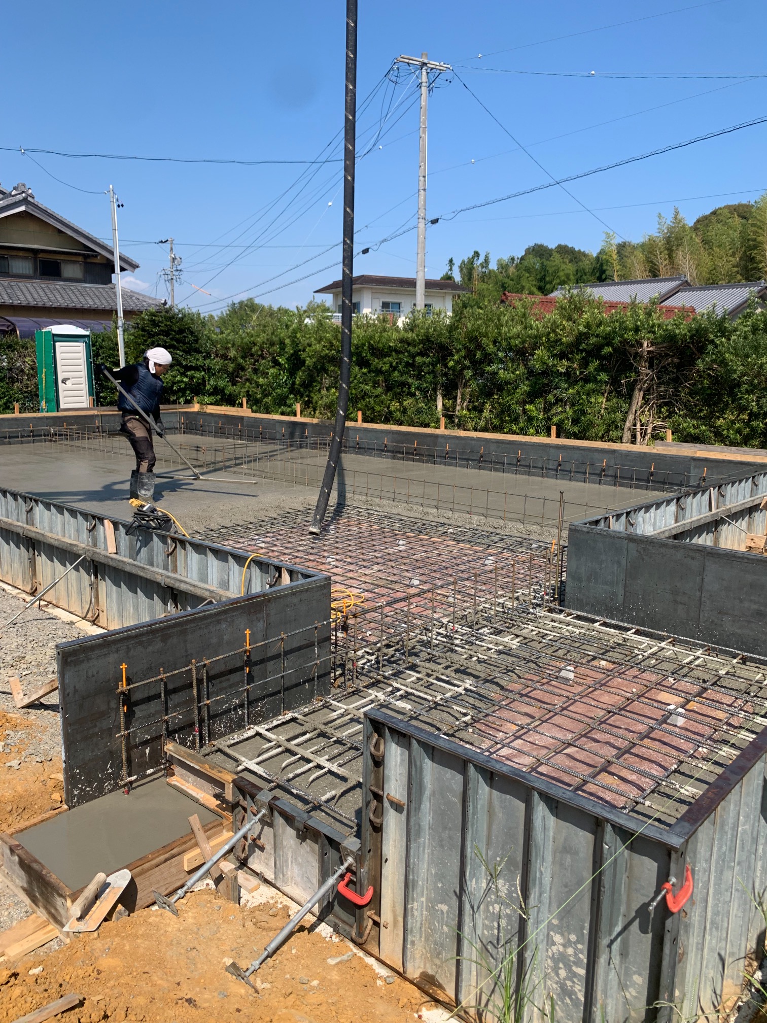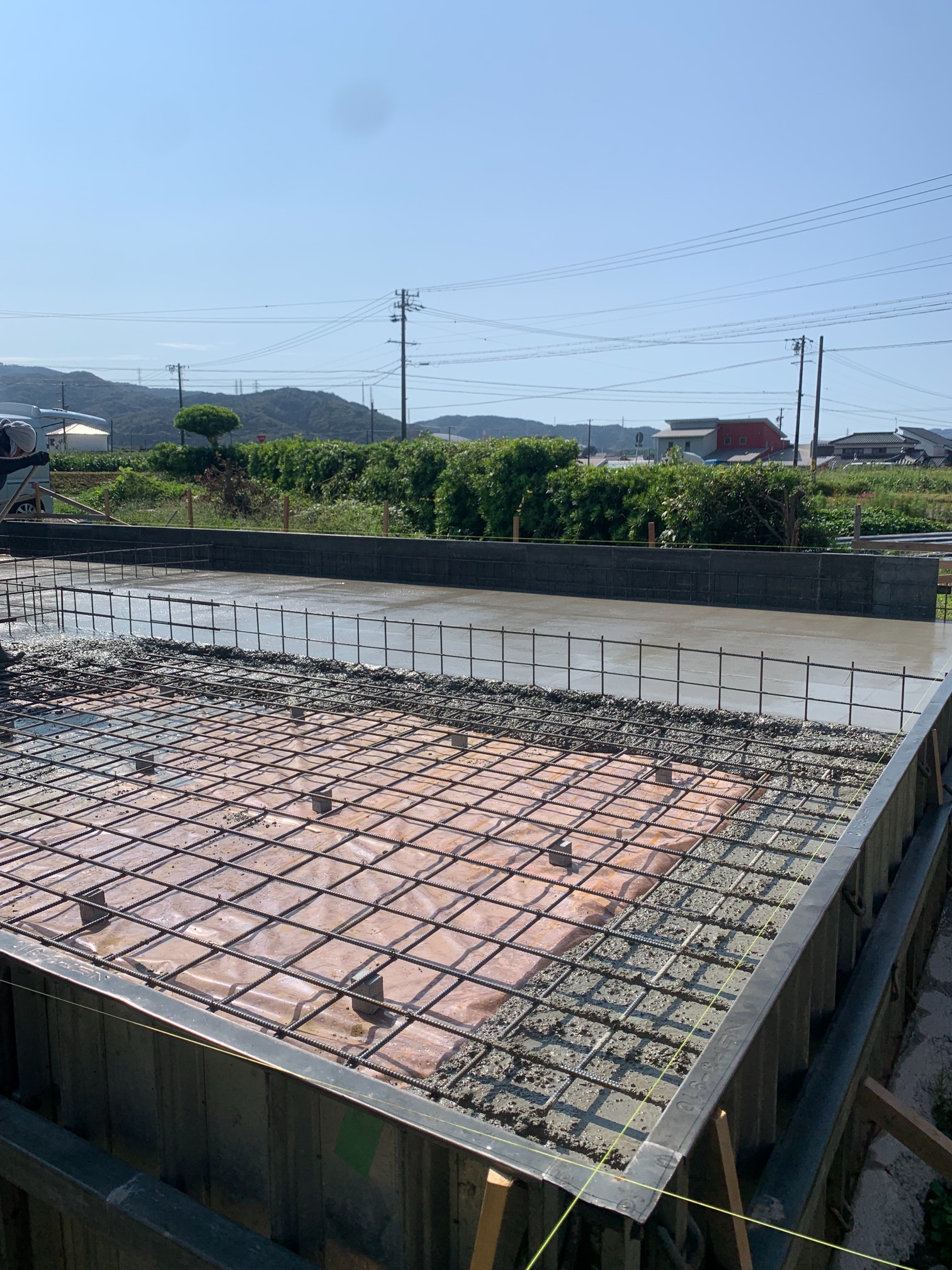 晴天に恵まれ、基礎のスラブコンクリート打設を行っています。本日はy様が現場から作業の写真を送ってくださいました。通常に増して職人の人数がたくさんいますが、同日に2棟分のスラブを打設するため、片方が終わったら天端をコテで押さえるために左官業者さんに応援を依頼しています。
