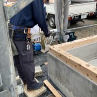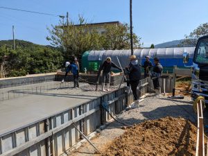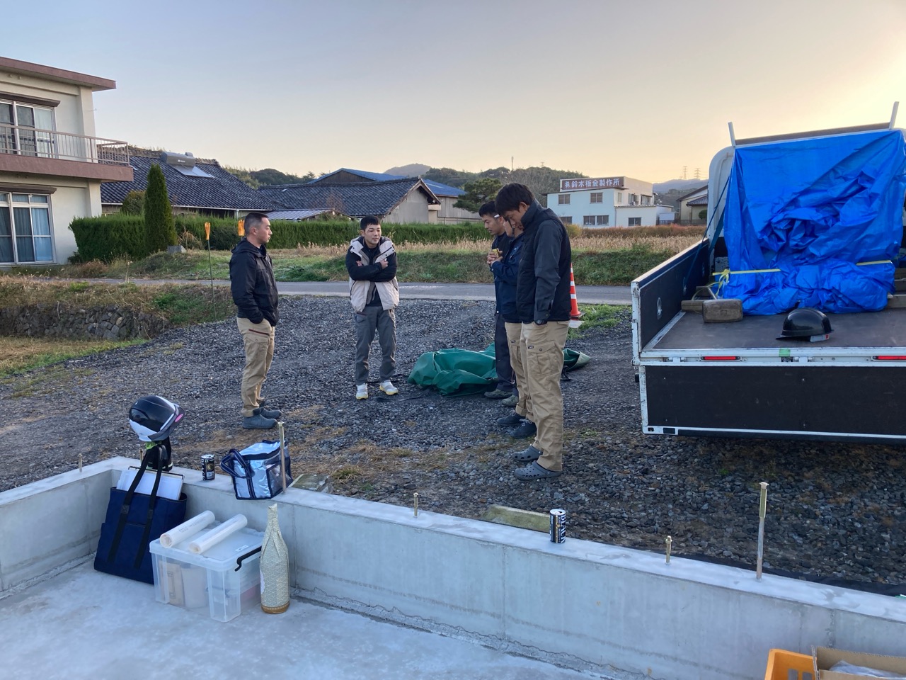 早朝より基礎立上りコンクリートを打設するべく、本日のメンバーは全員昨夜から現場近くの宿舎へ前乗りしてザコ寝。早朝から気力十分で現場にのぞみます。打設直前にアンカーボルトのチェックをし、微修正も行います。
