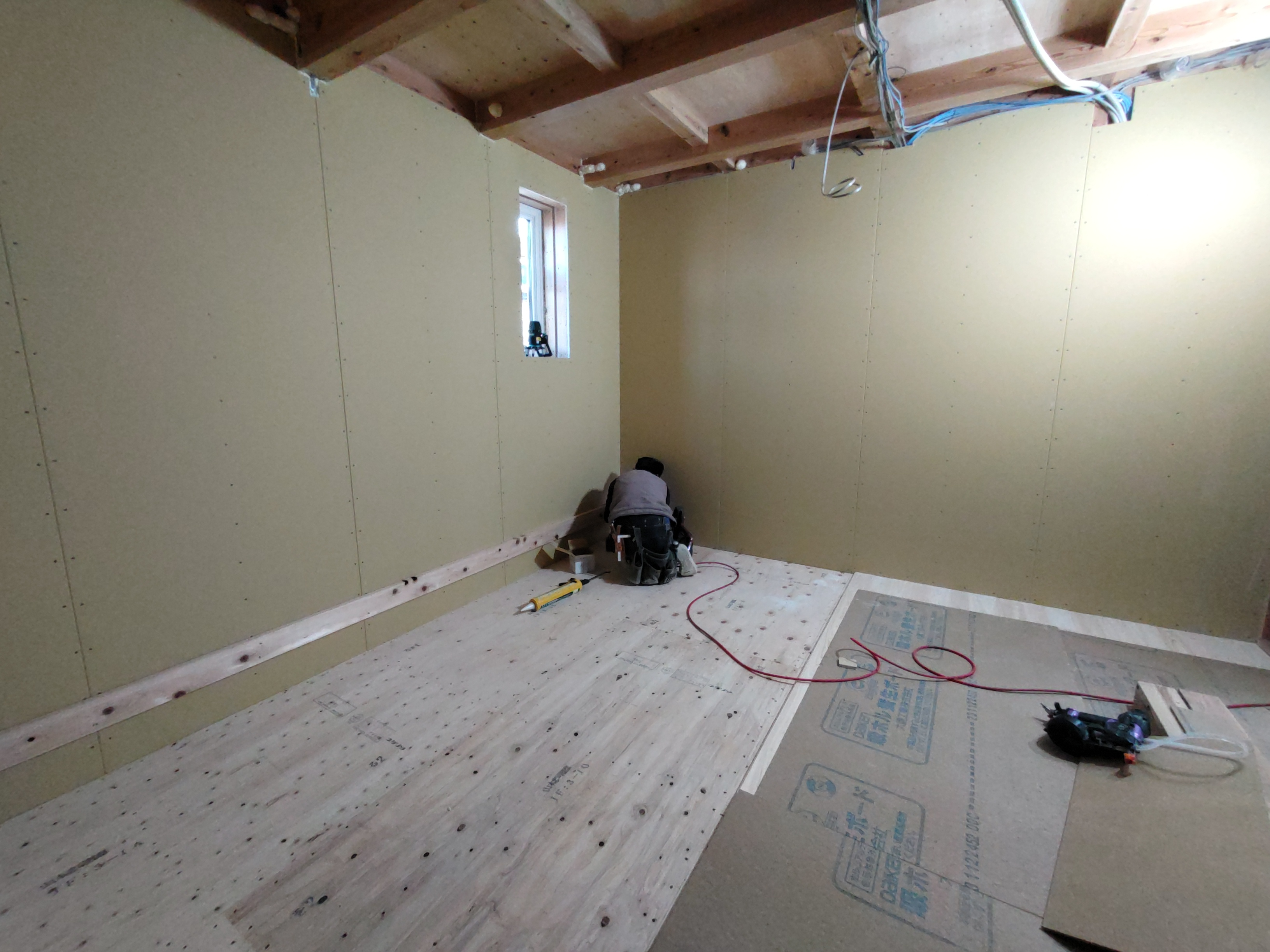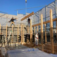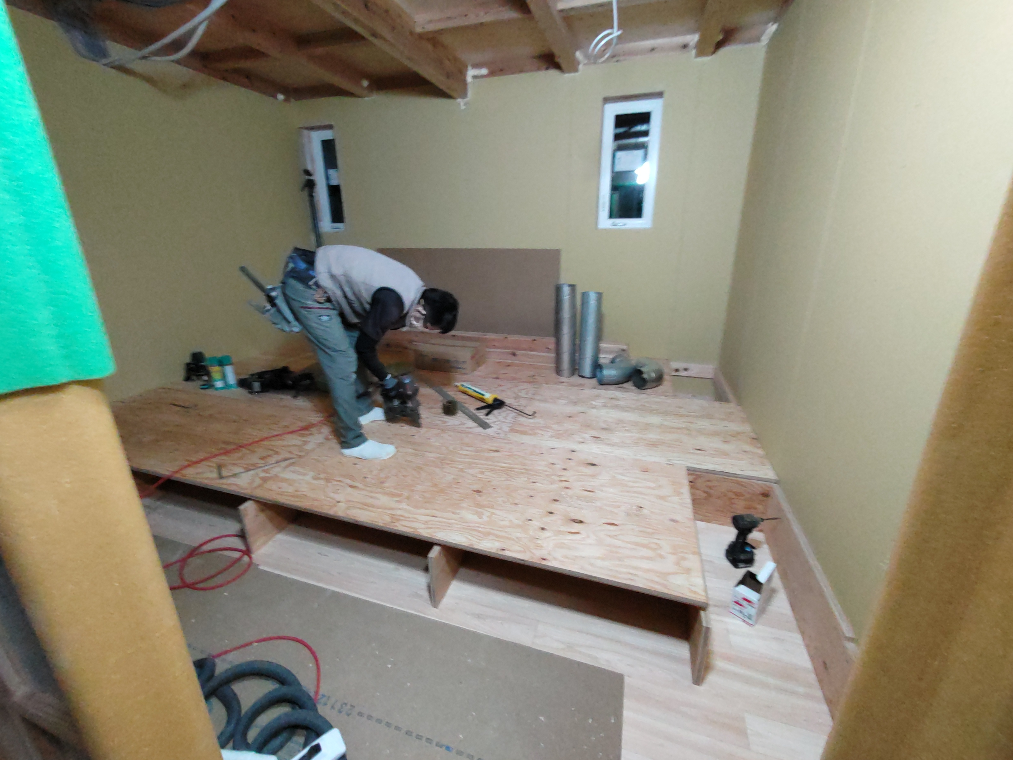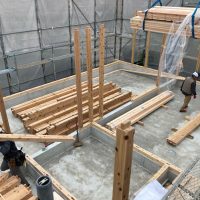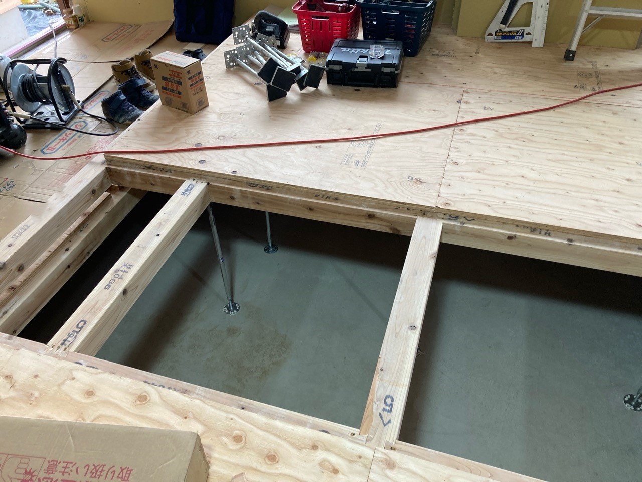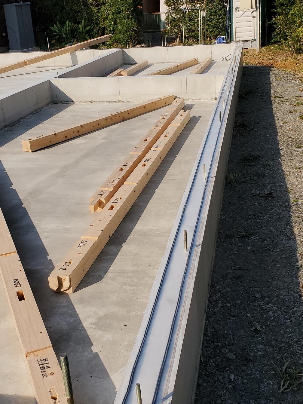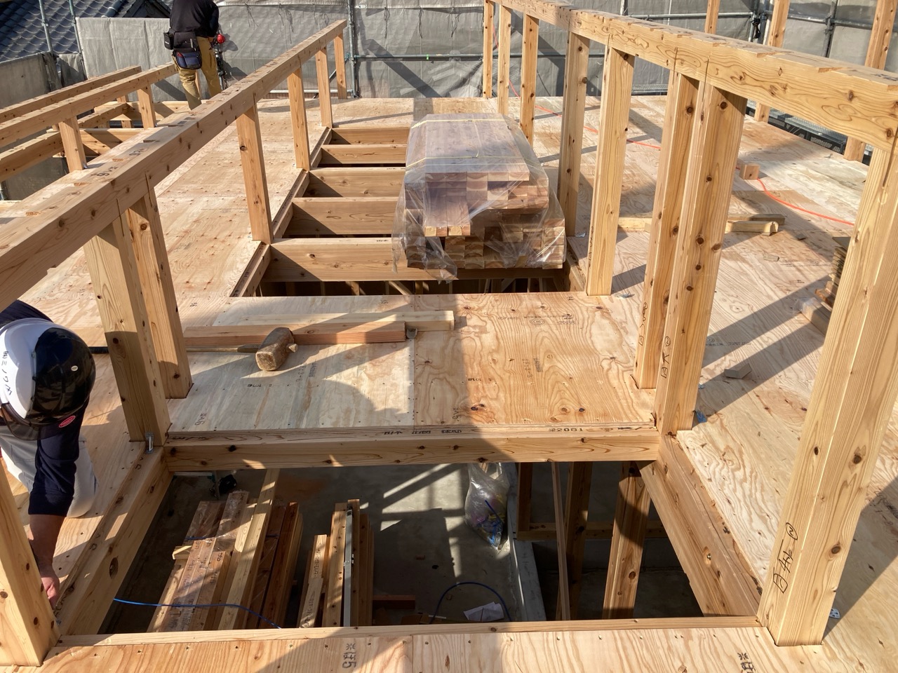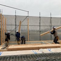 k長先生の提唱する仕様により、1階の床を土台から少し上げて床下空間を高めにとる構造のため、床下地の合板を敷設するのは、上棟後内部がある程度捜索で来てからとなります。