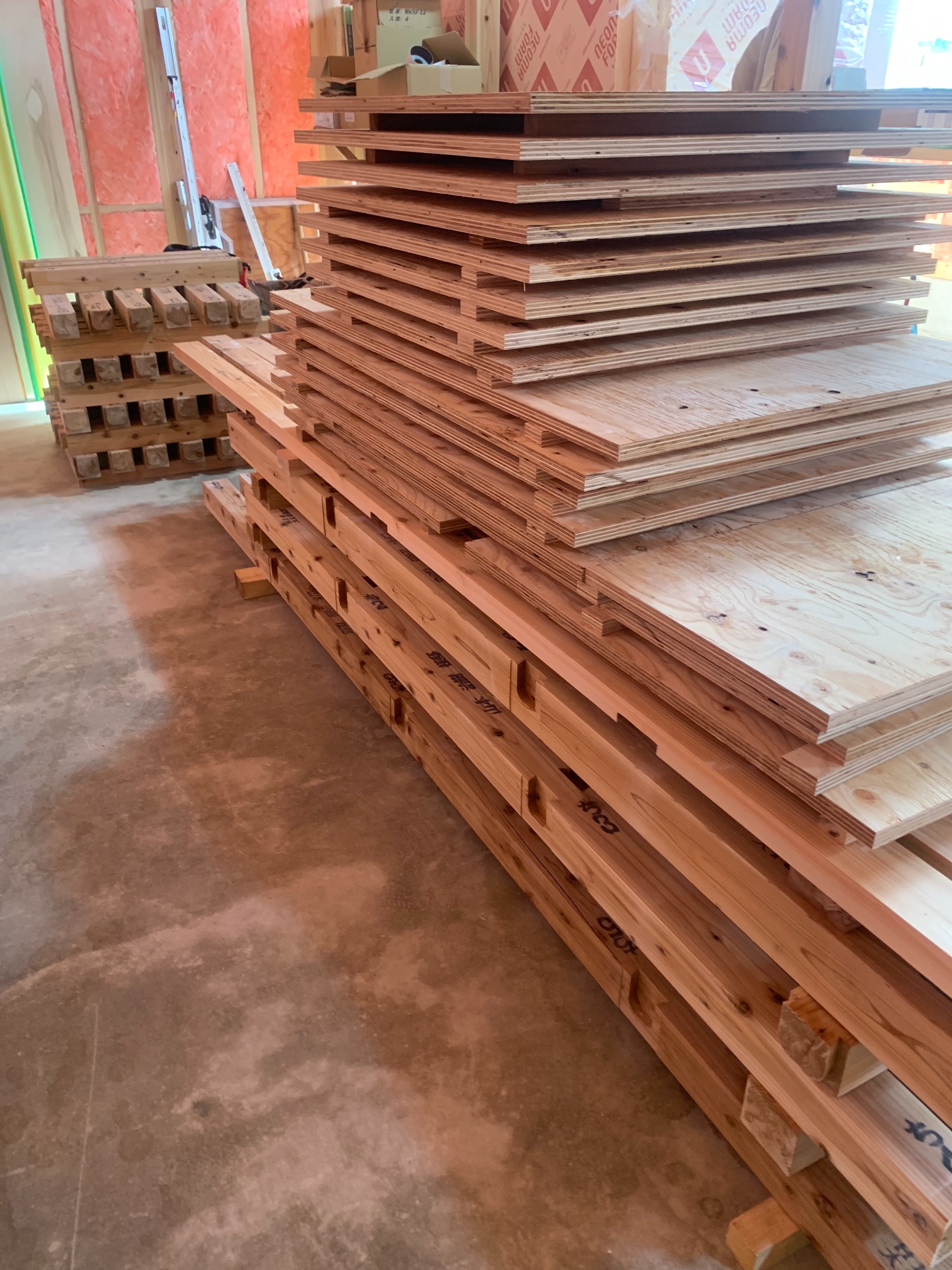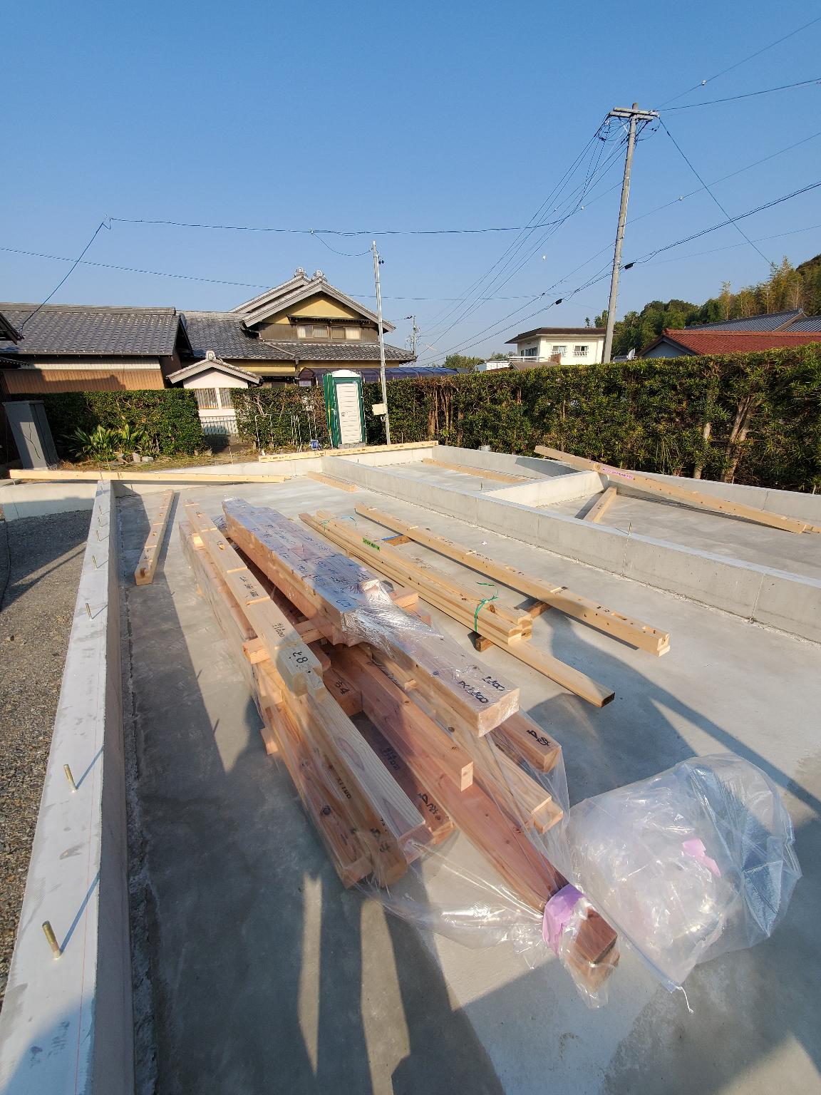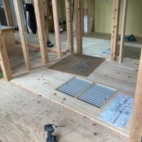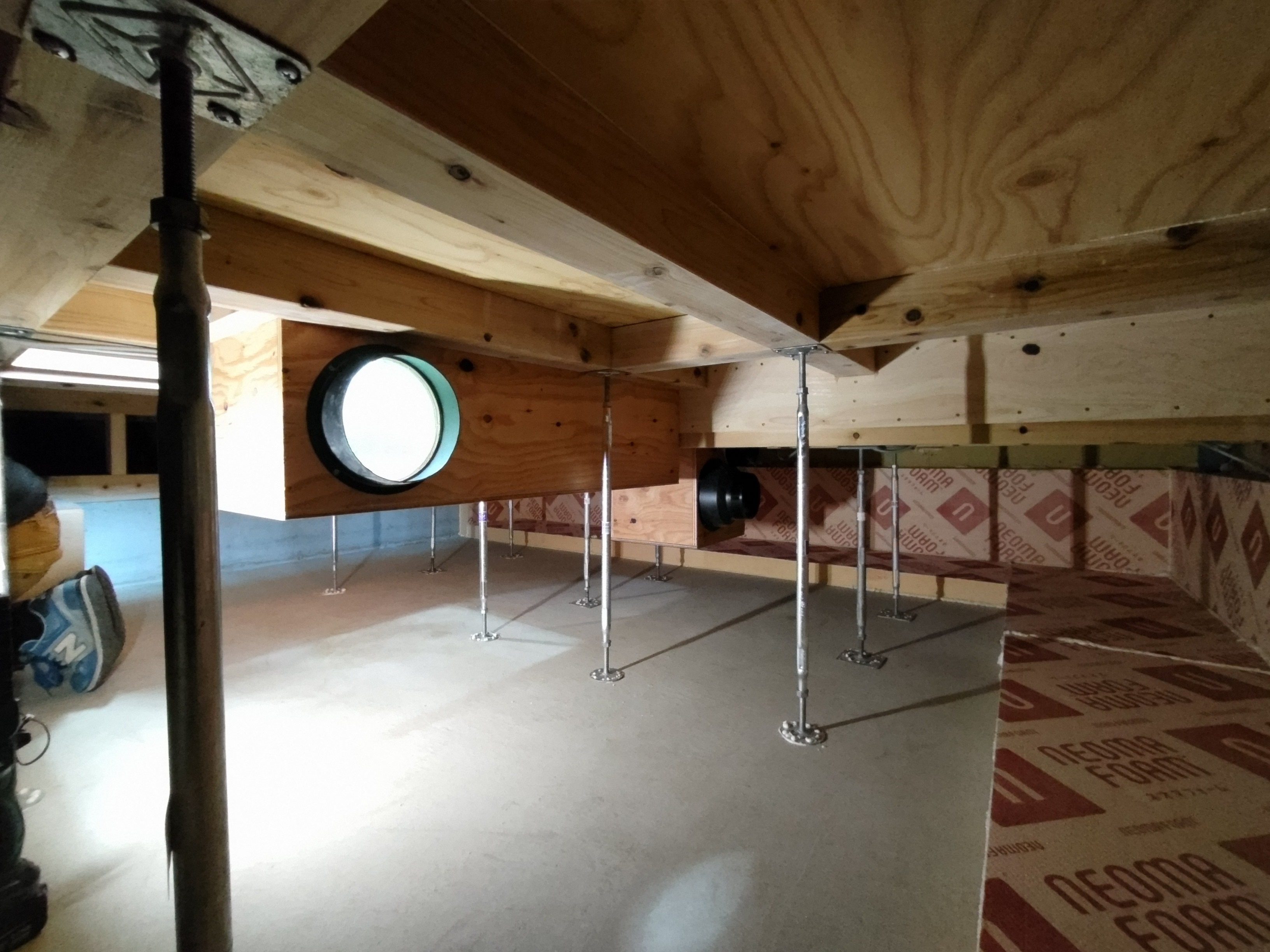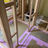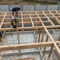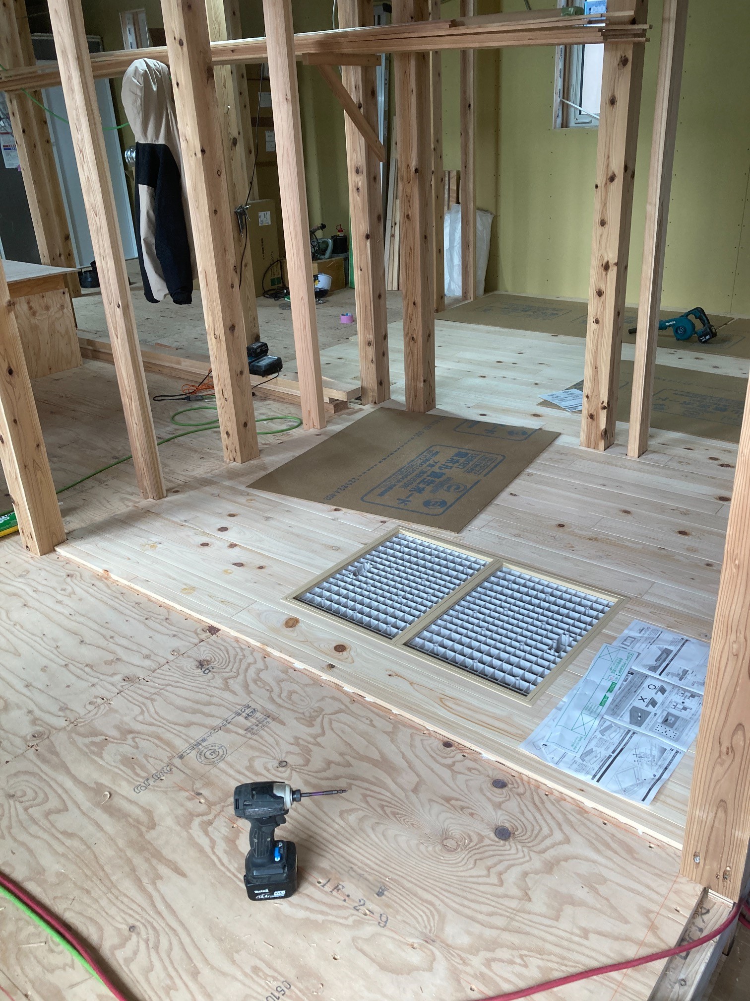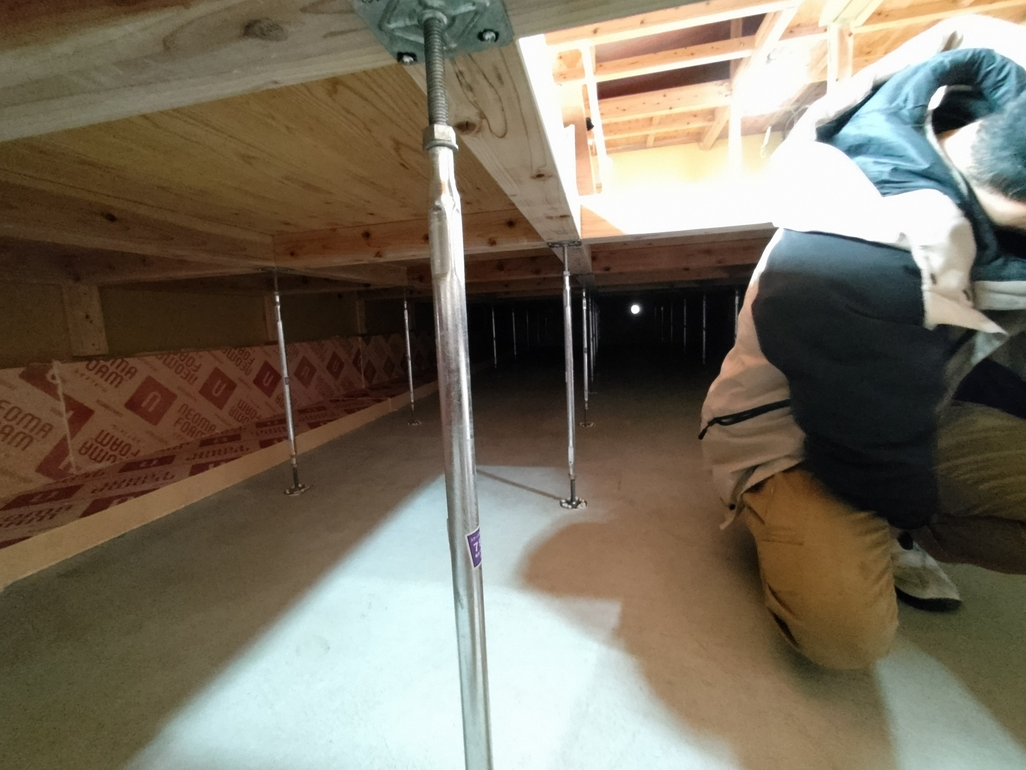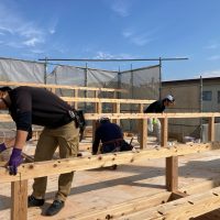 k長先生の提唱する仕様により、1階の床を土台から少し上げて床下空間を高めにとる構造のため、床下地の合板を敷設するのは、上棟後内部がある程度捜索で来てからとなります。