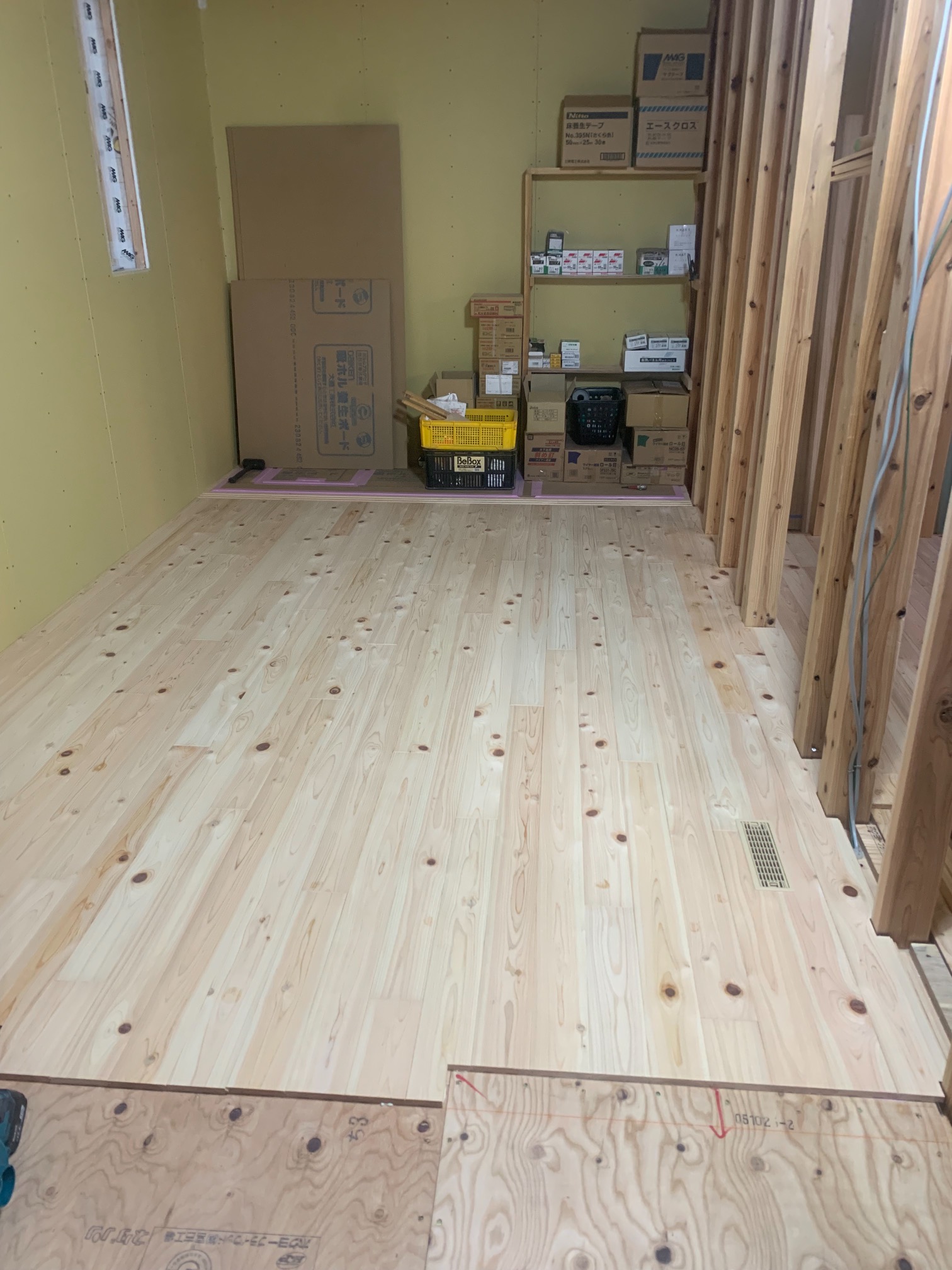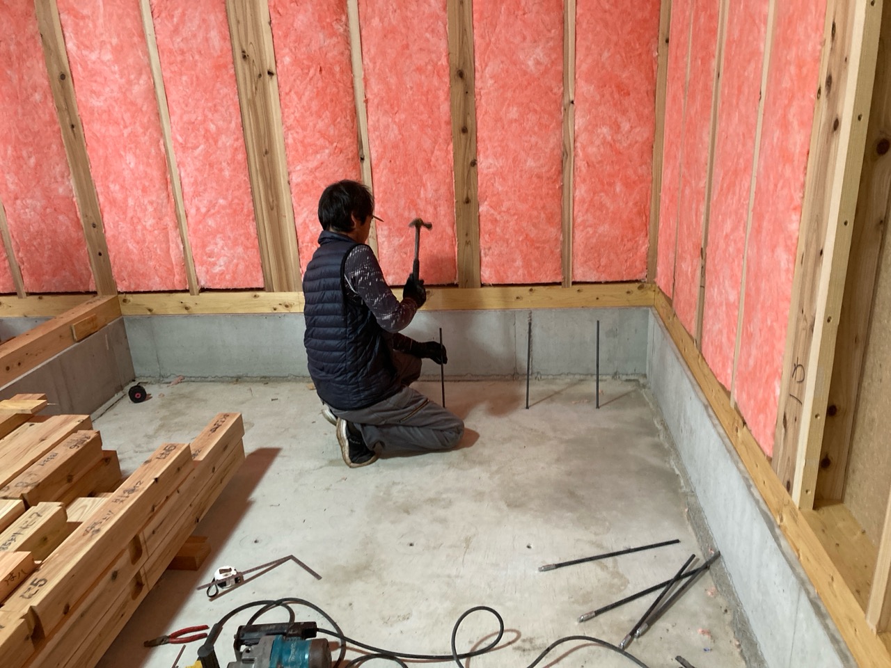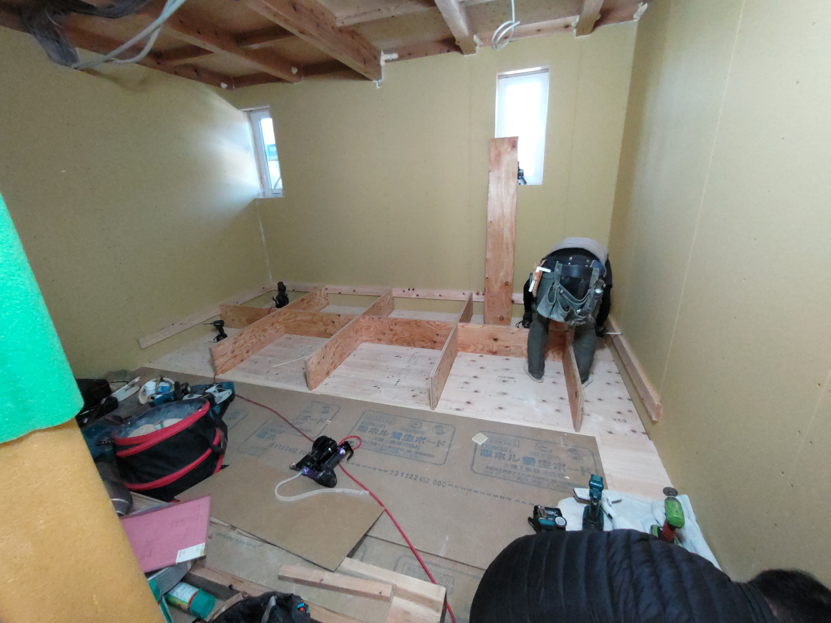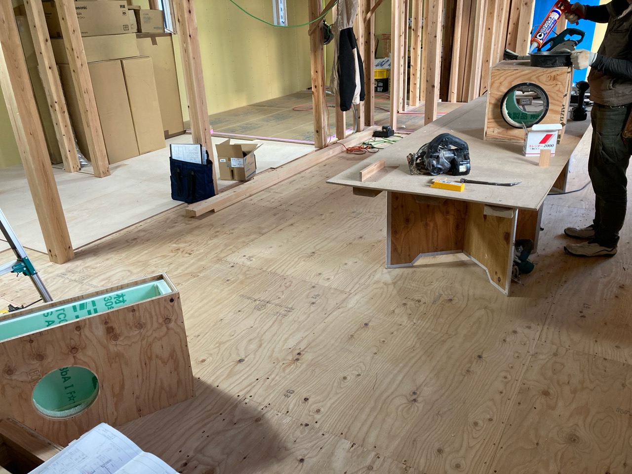 k長先生の提唱する仕様により、1階の床を土台から少し上げて床下空間を高めにとる構造のため、床下地の合板を敷設するのは、上棟後内部がある程度捜索で来てからとなります。