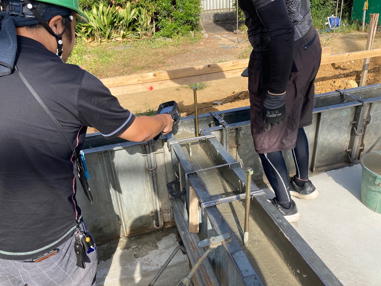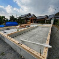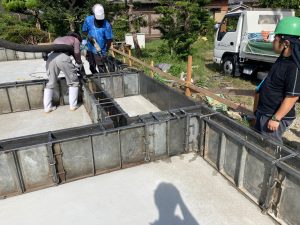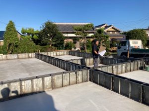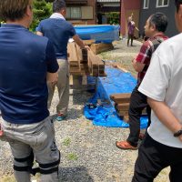 養生期間を終え、鋼製型枠が外されました。昨日まで降っていた雨によって基礎の中がプールのようになっています。k長先生によると雨水が溜まるのもある程度水中養生になるので良し、としていますが、この後の作業のため一旦水を抜きます。