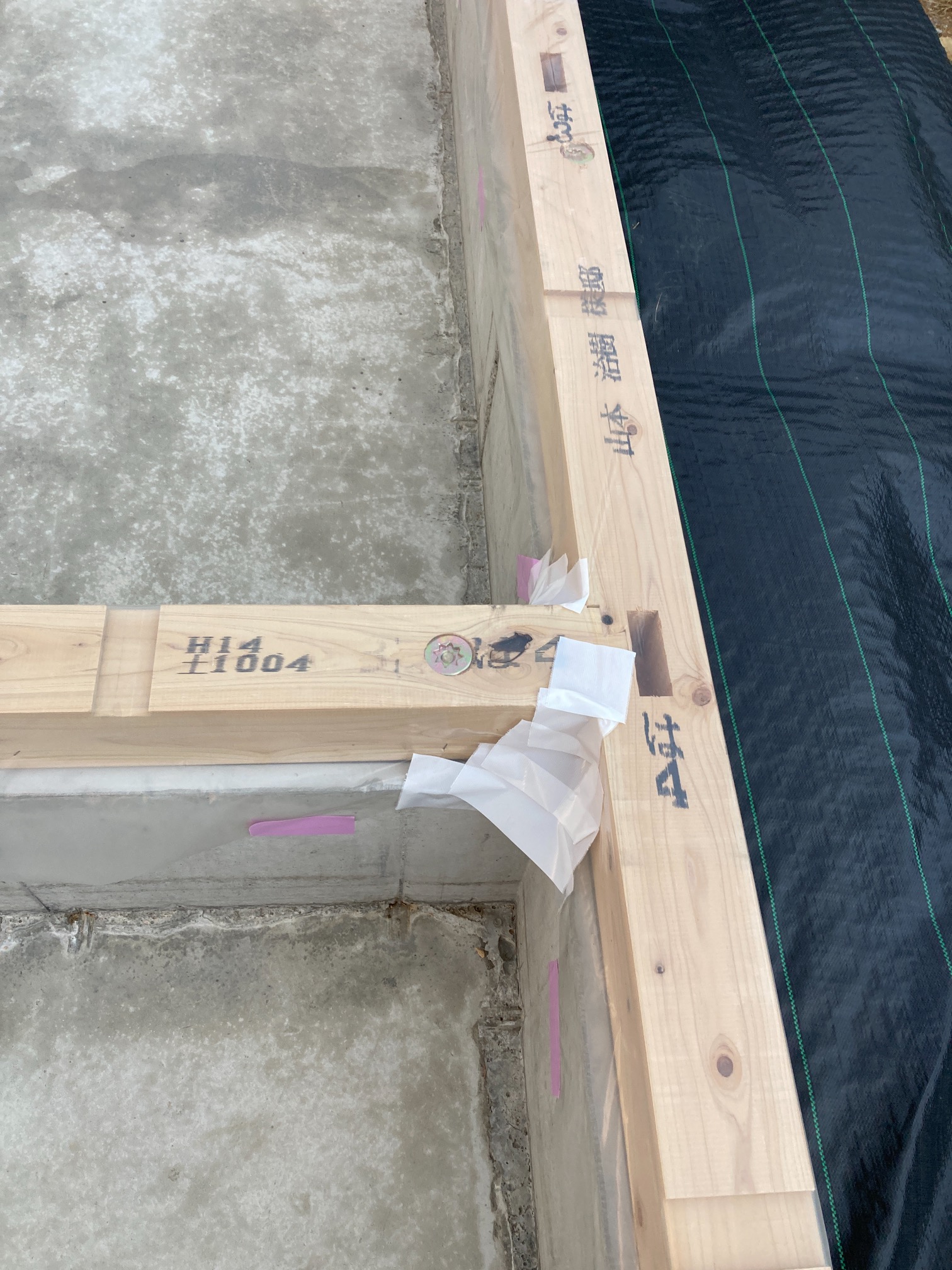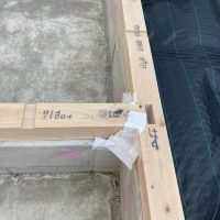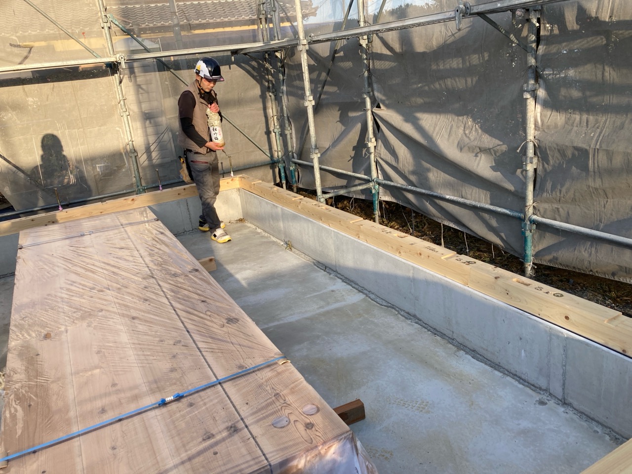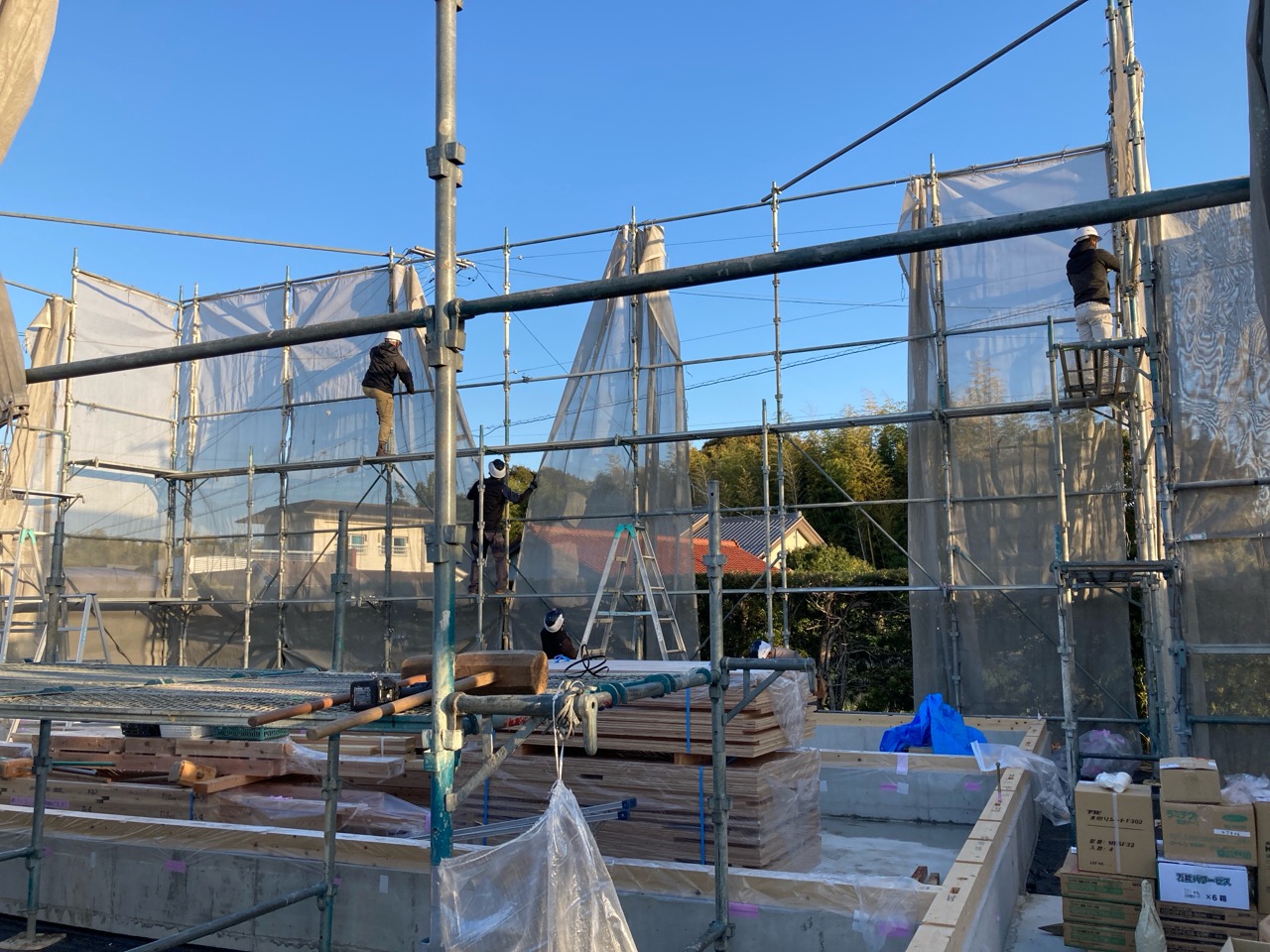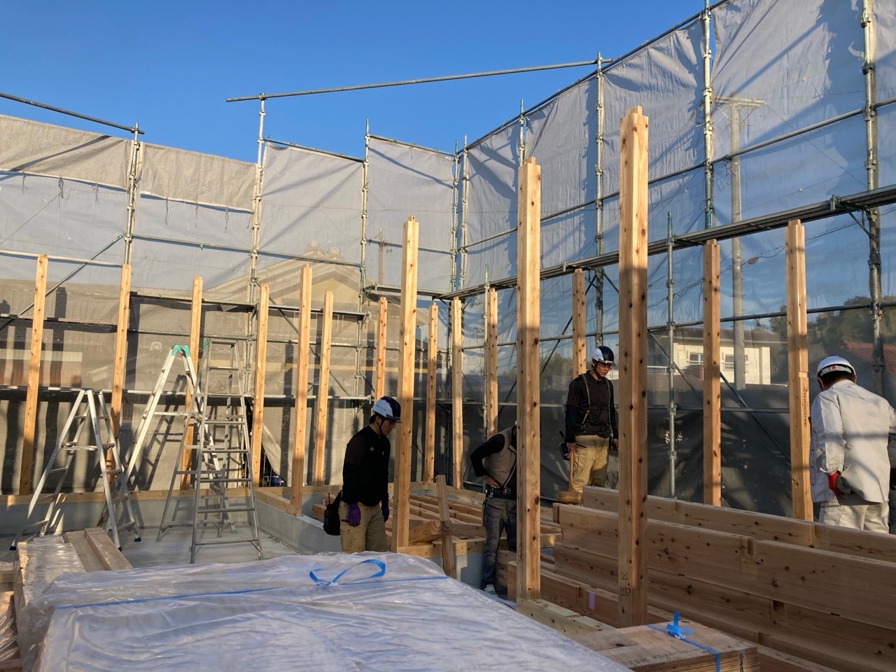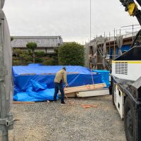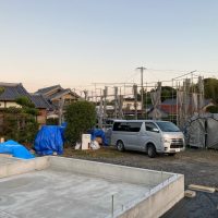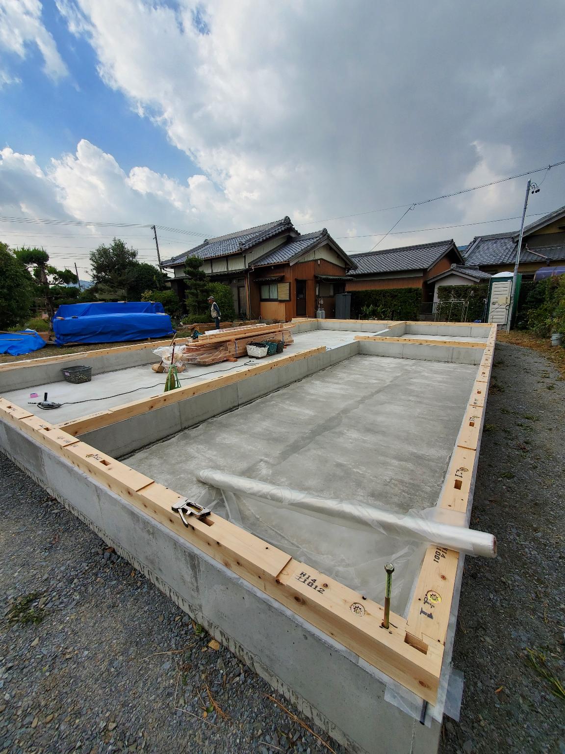 今回は土台敷きのみのため、作業はあっという間に終了。土台の上のみ雨養生をしておきます。普段であれば、鋼製束、大引を設置してその上に1階床下地の合板を敷くまでの作業を行いますので二人で丸一日、大きい物件ならば2日かかる工程です。