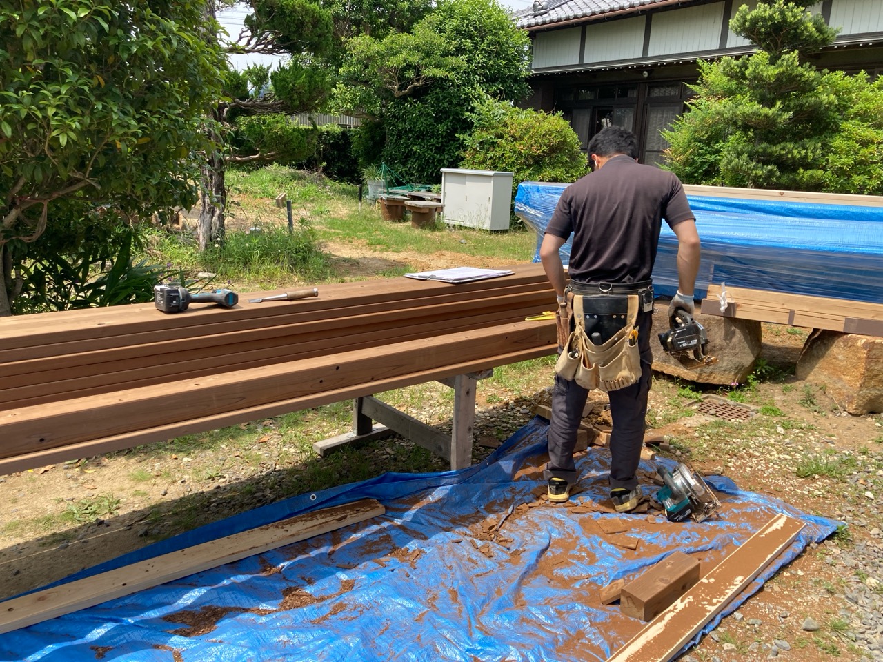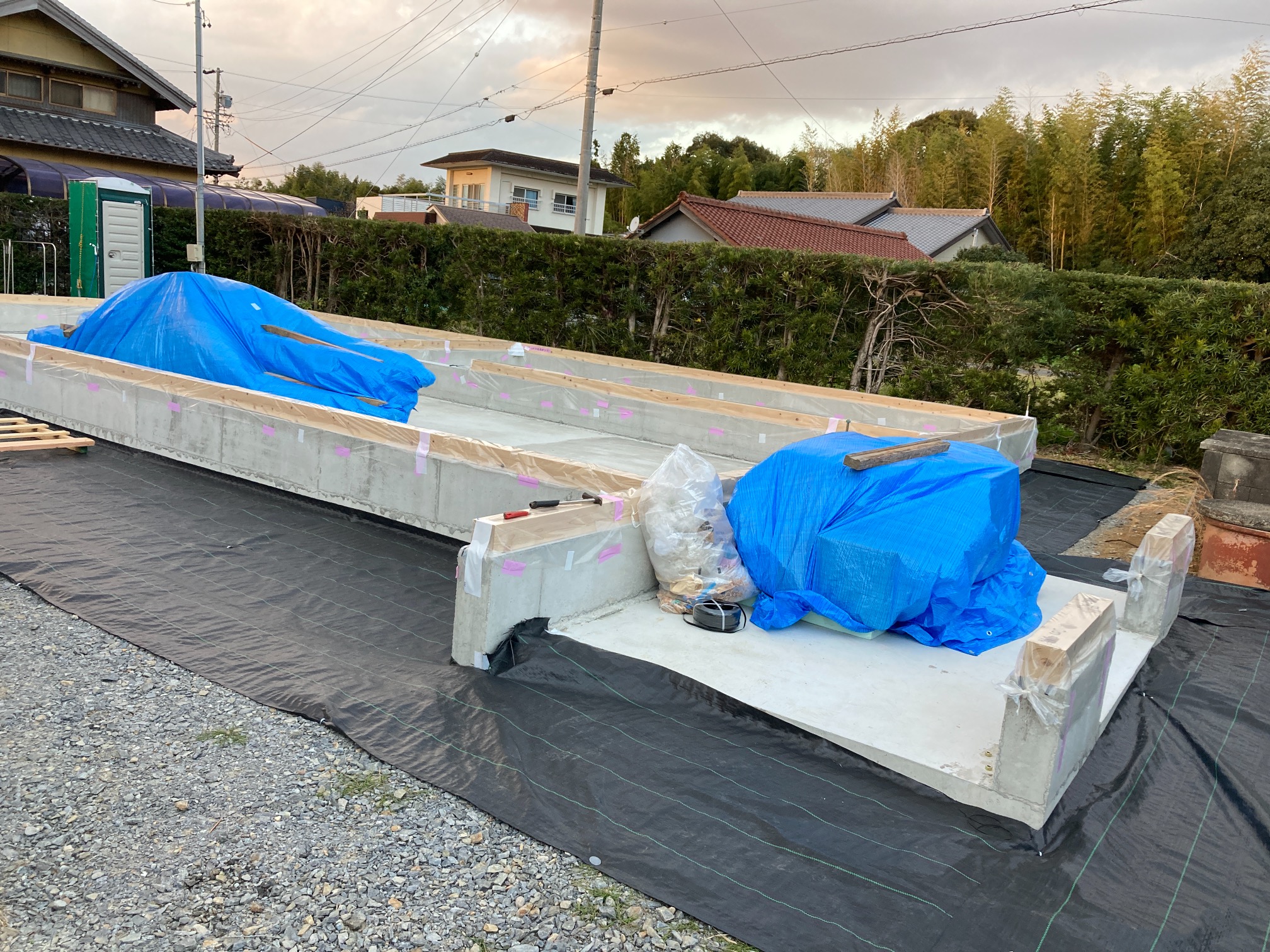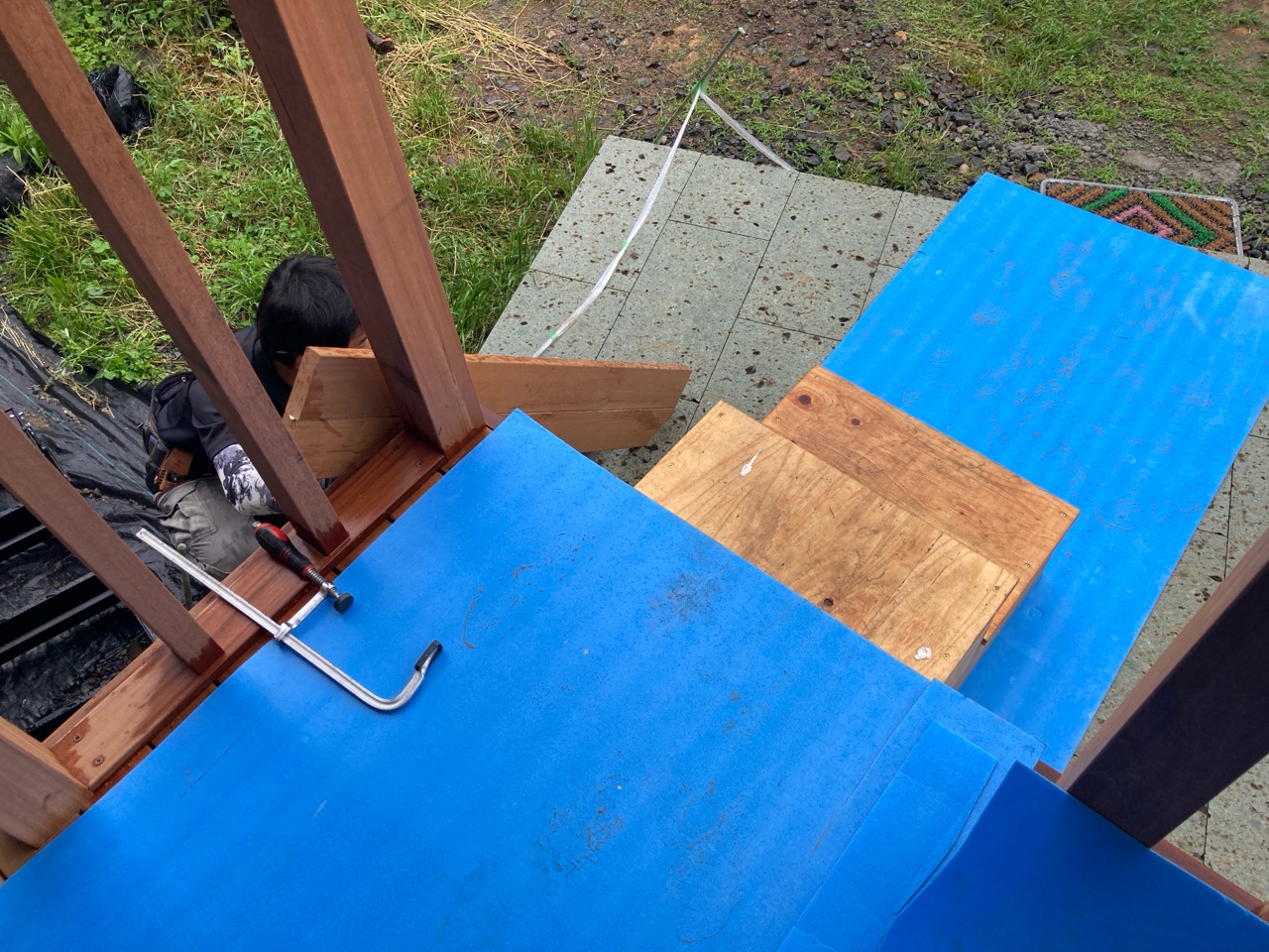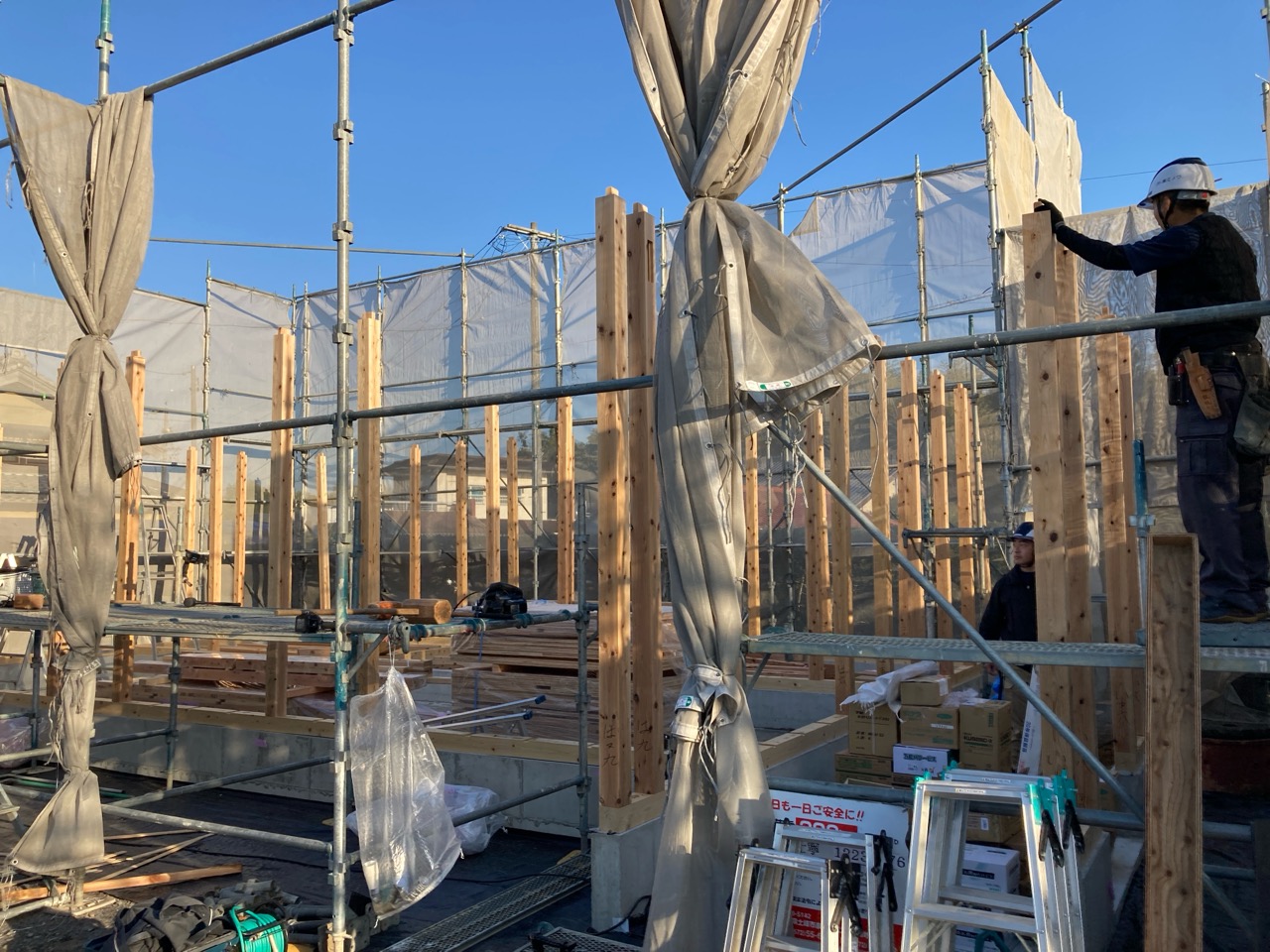 今回は土台敷きのみのため、作業はあっという間に終了。土台の上のみ雨養生をしておきます。普段であれば、鋼製束、大引を設置してその上に1階床下地の合板を敷くまでの作業を行いますので二人で丸一日、大きい物件ならば2日かかる工程です。