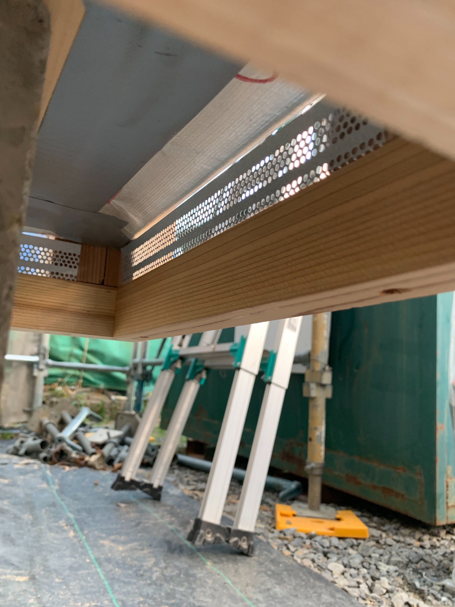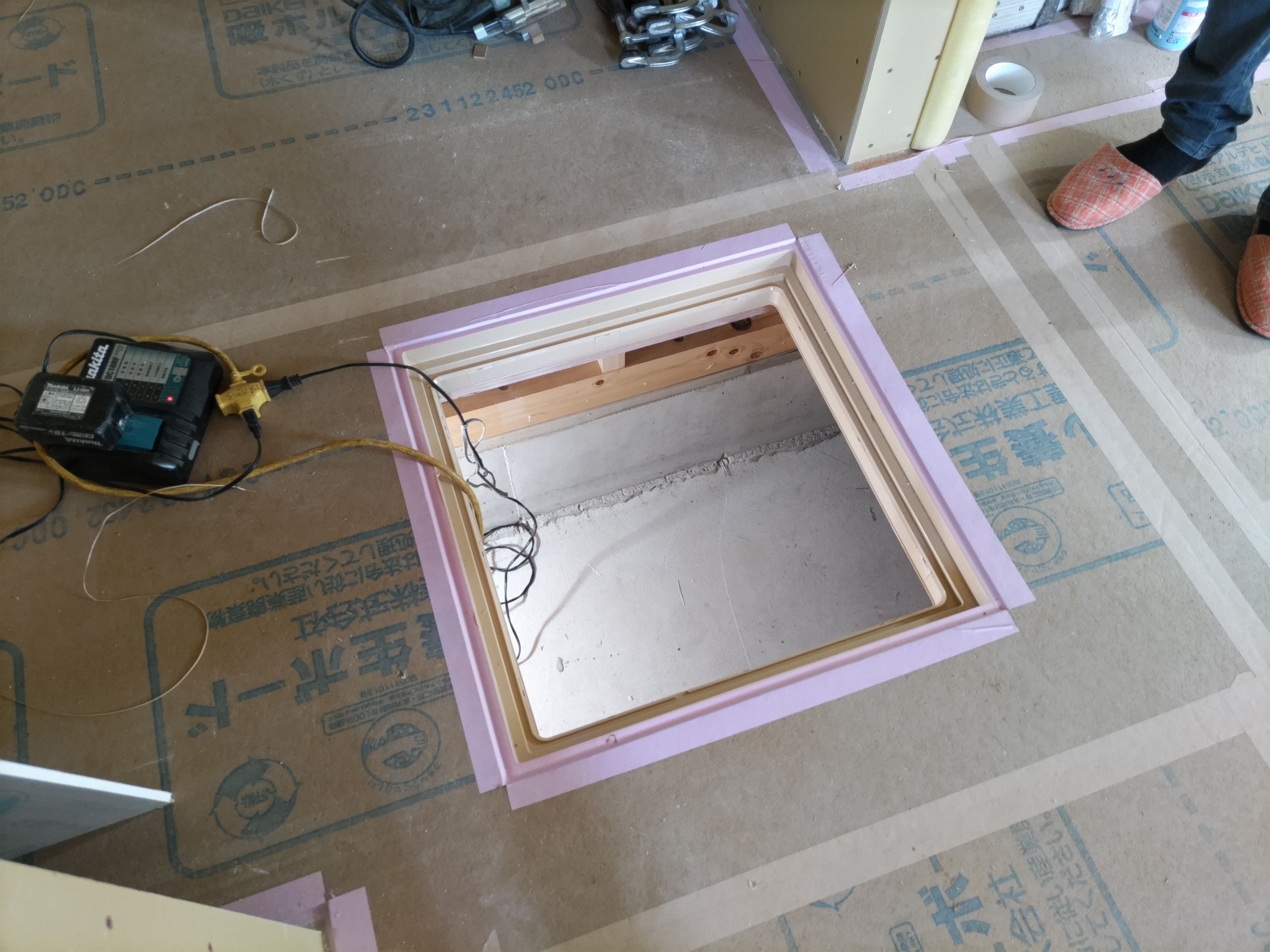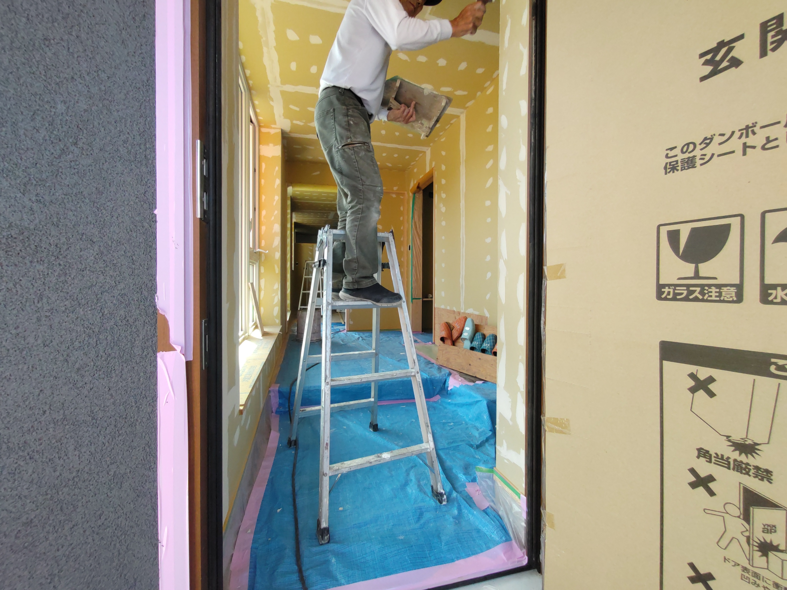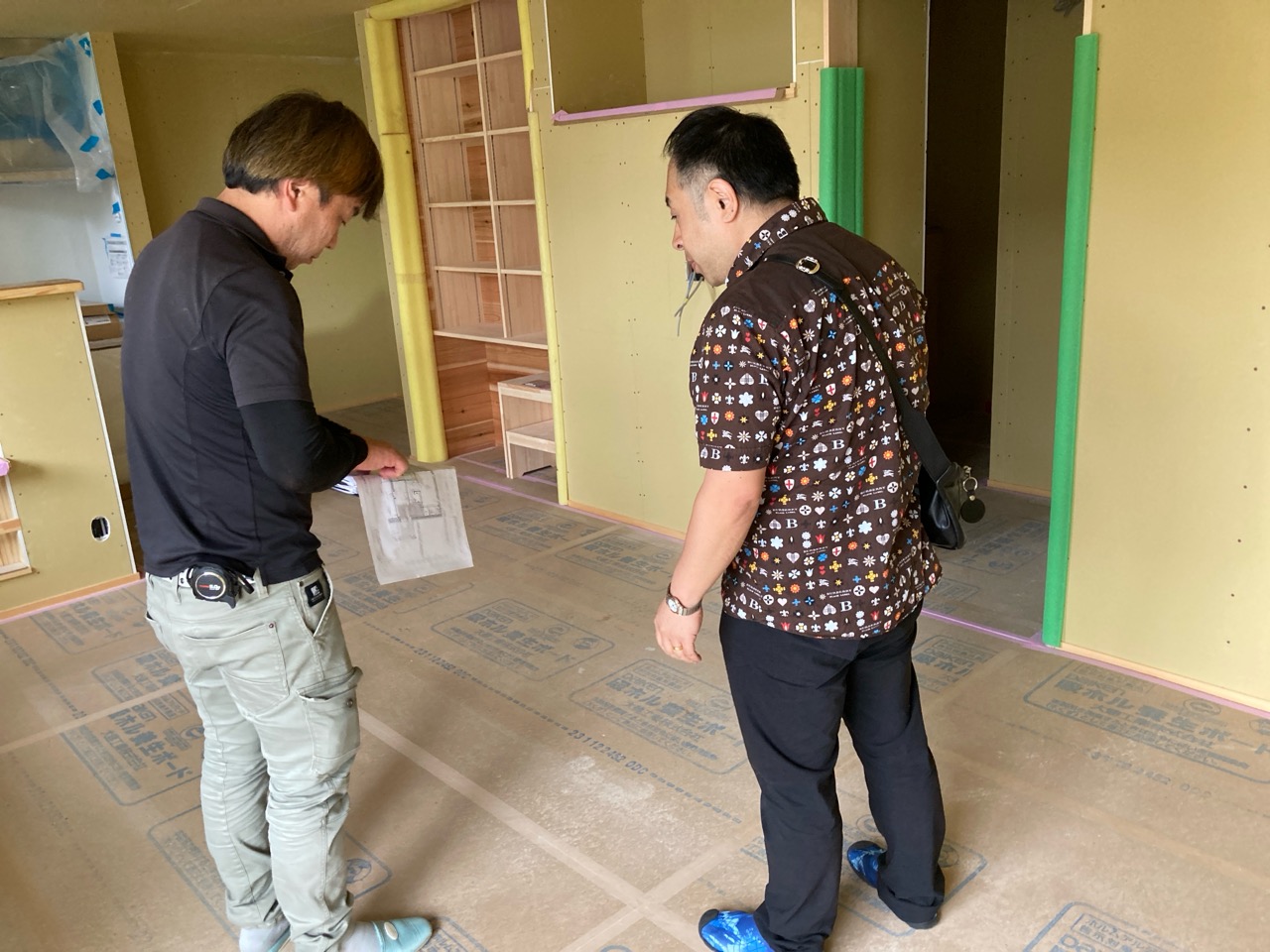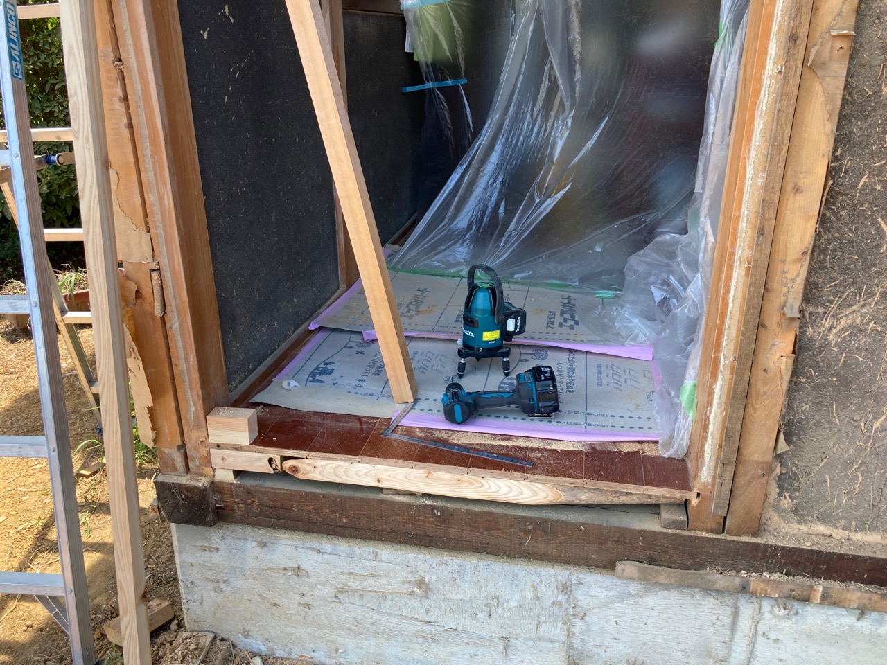 今回は土台敷きのみのため、作業はあっという間に終了。土台の上のみ雨養生をしておきます。普段であれば、鋼製束、大引を設置してその上に1階床下地の合板を敷くまでの作業を行いますので二人で丸一日、大きい物件ならば2日かかる工程です。