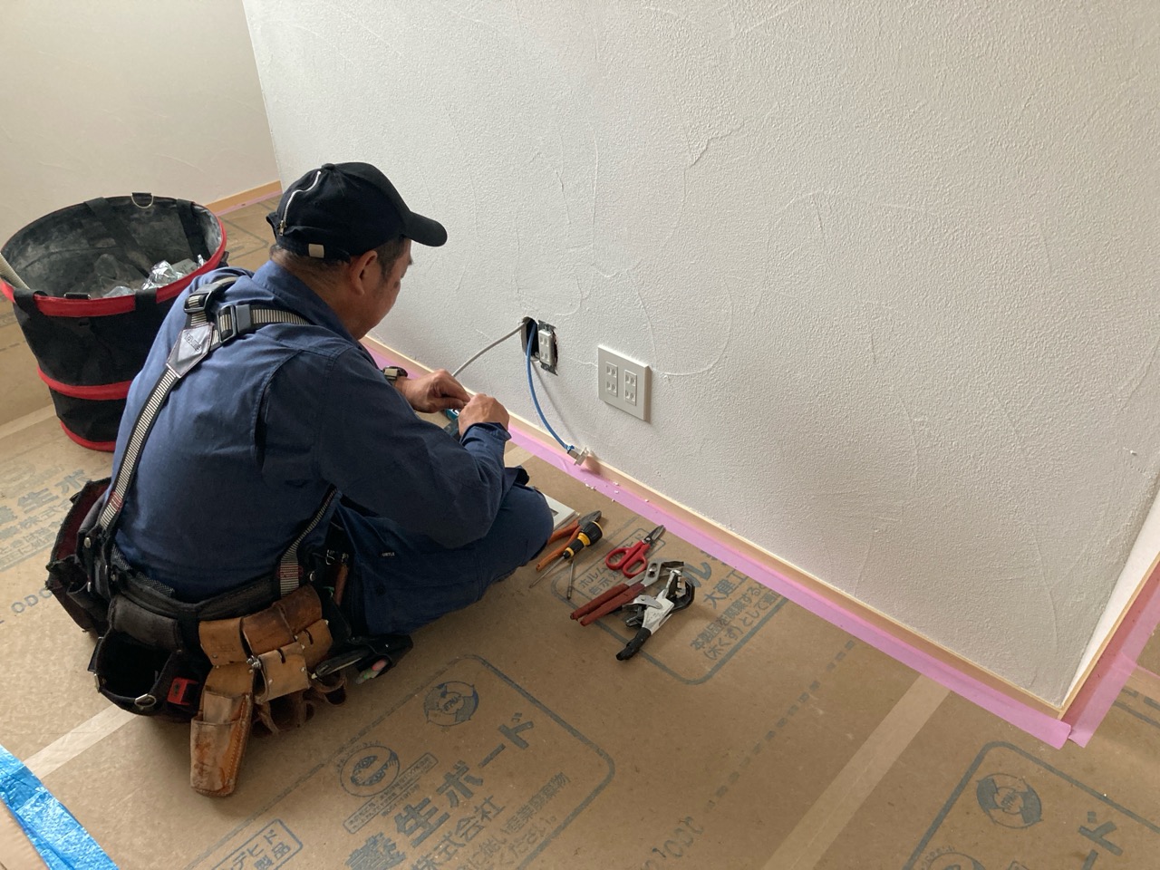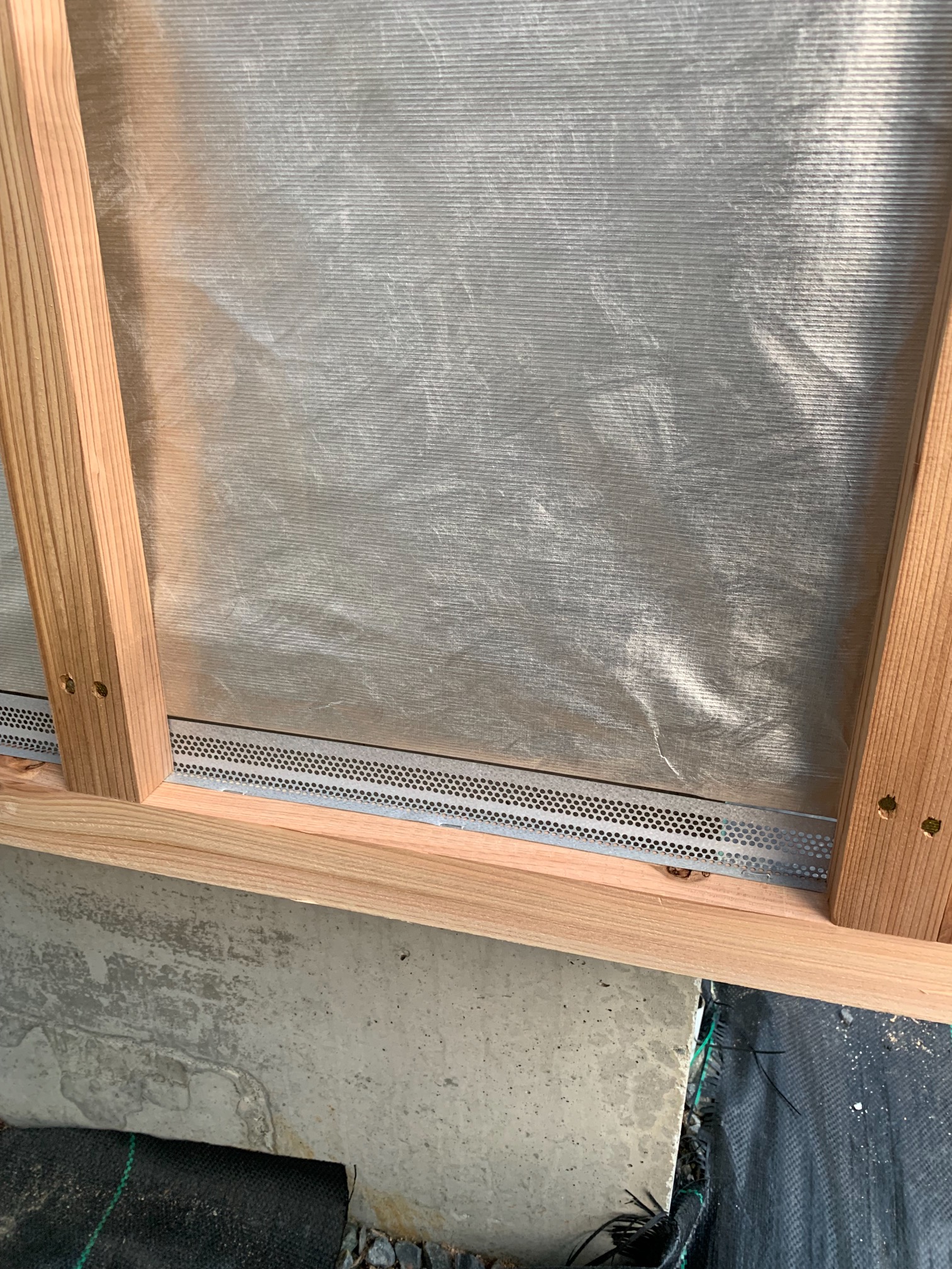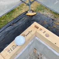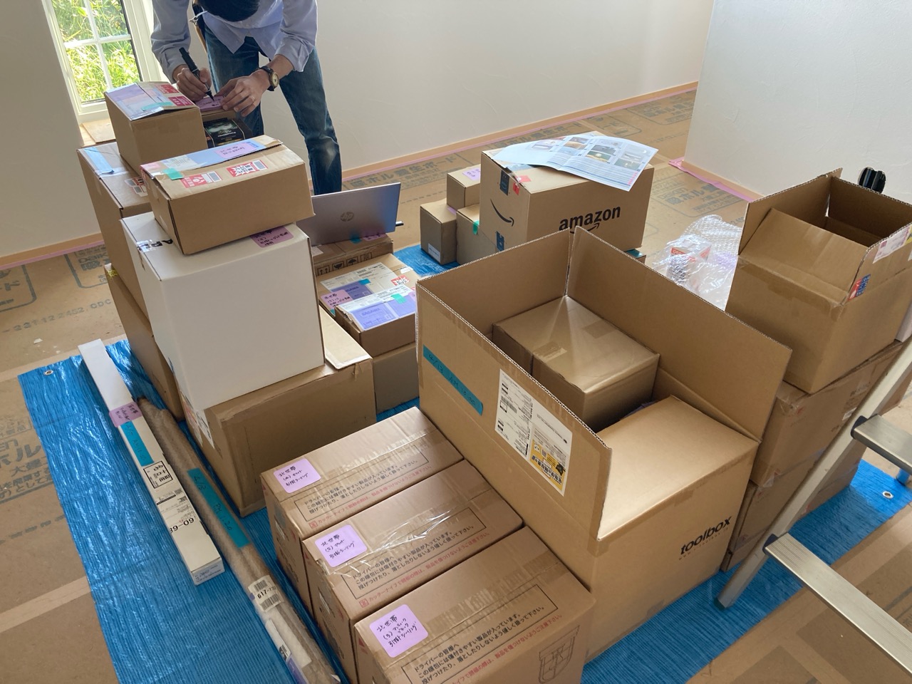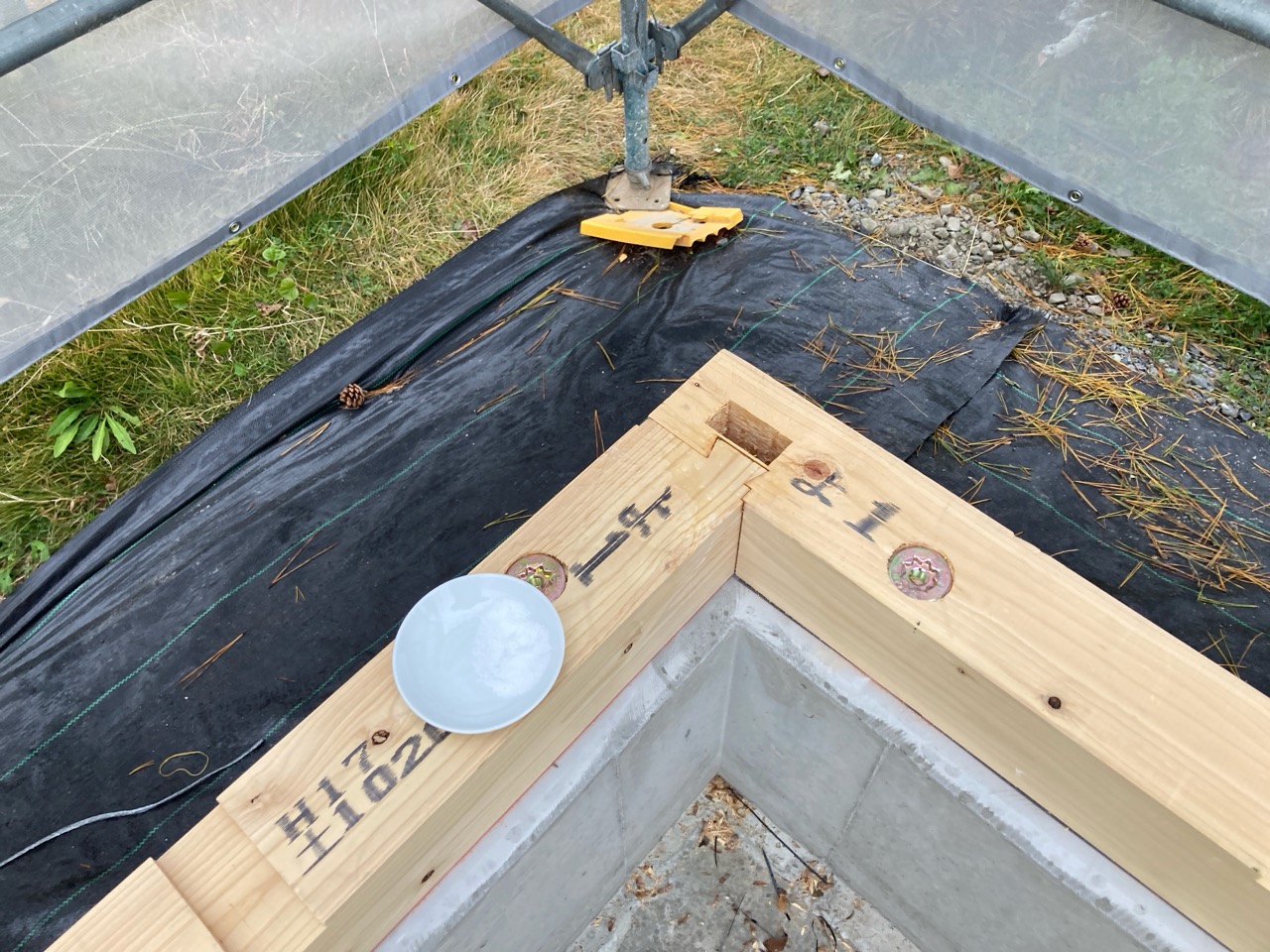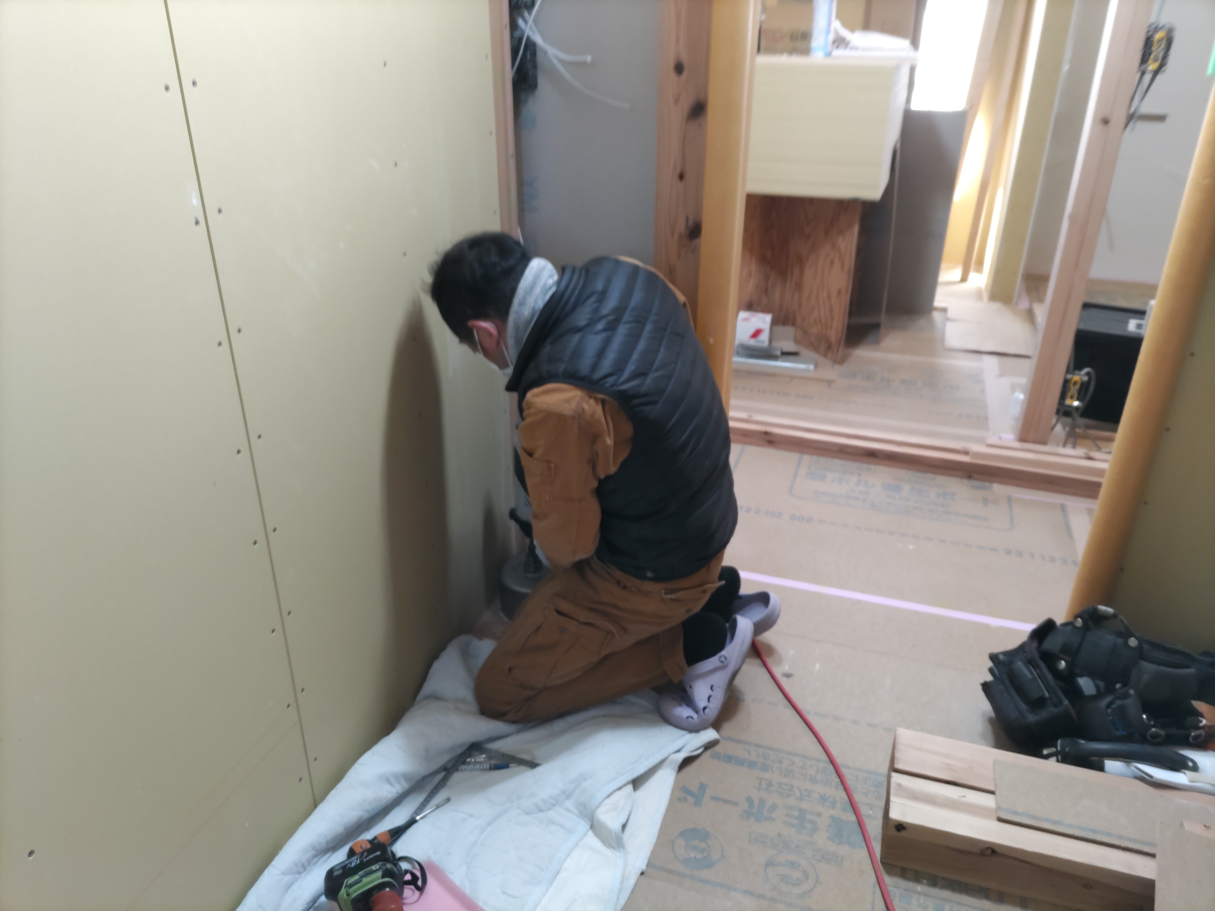 今回は土台敷きのみのため、作業はあっという間に終了。土台の上のみ雨養生をしておきます。普段であれば、鋼製束、大引を設置してその上に1階床下地の合板を敷くまでの作業を行いますので二人で丸一日、大きい物件ならば2日かかる工程です。
