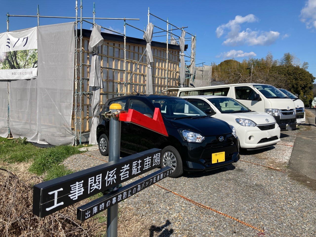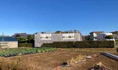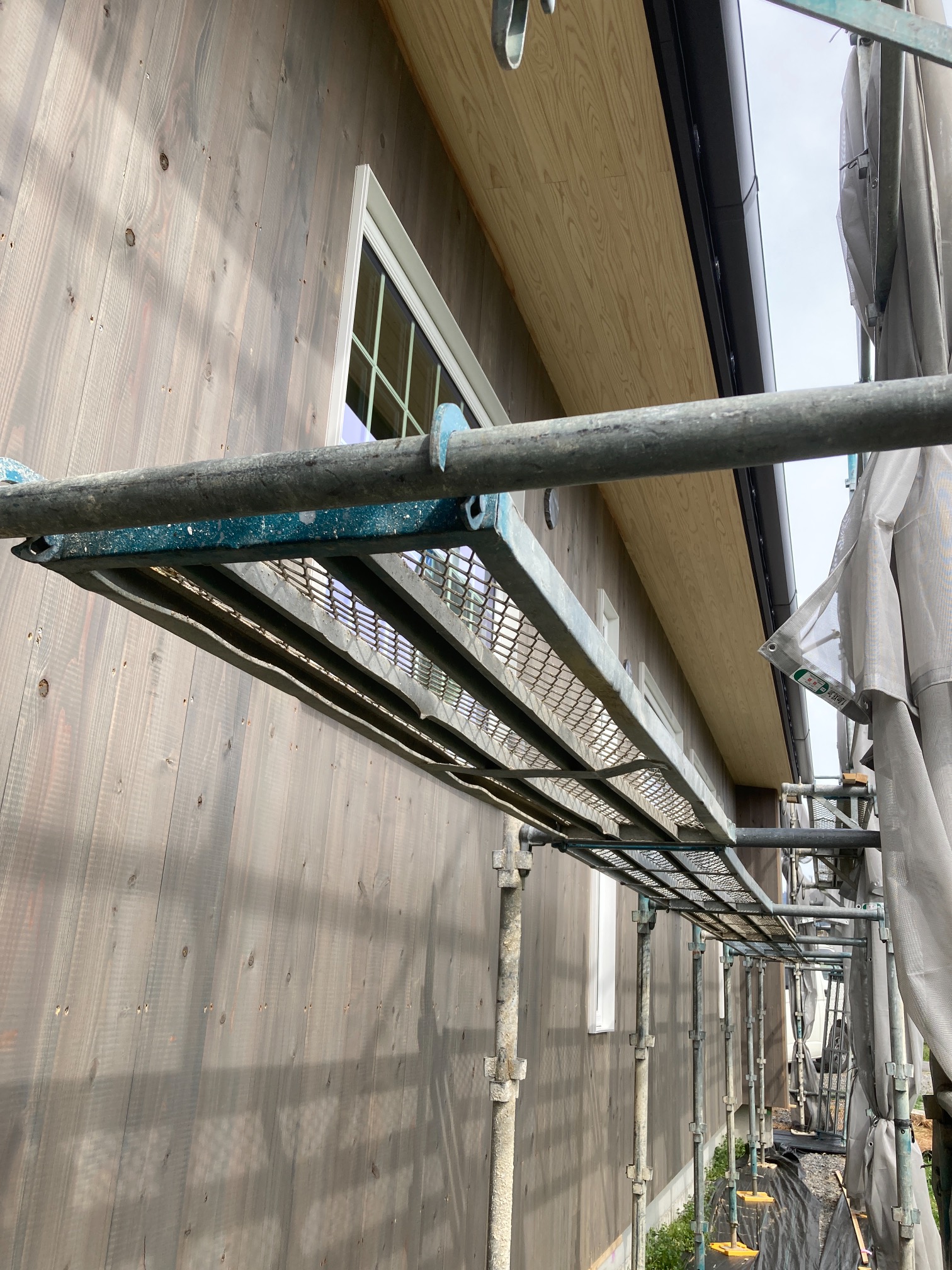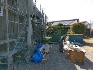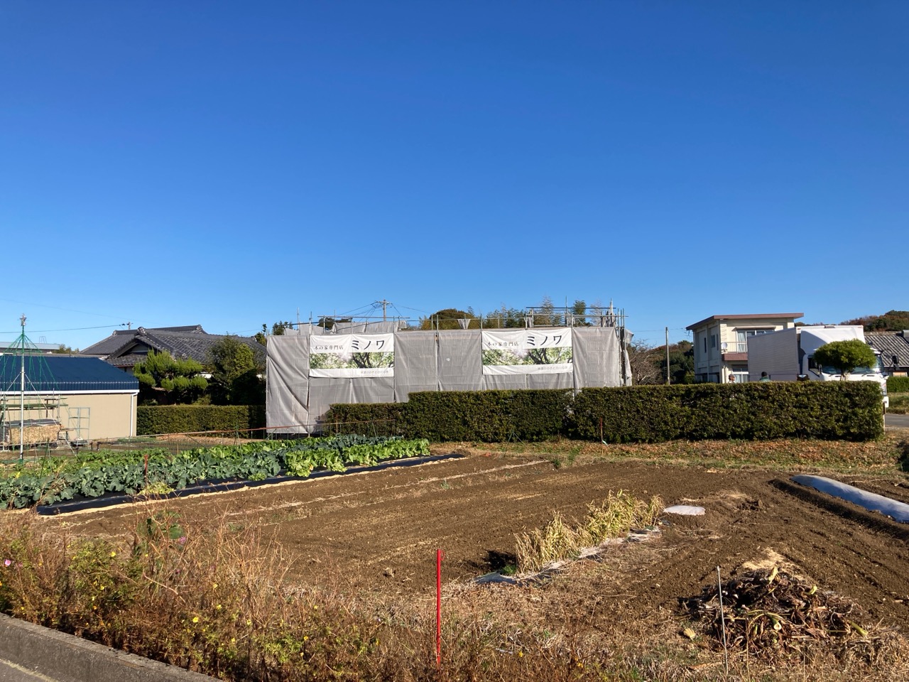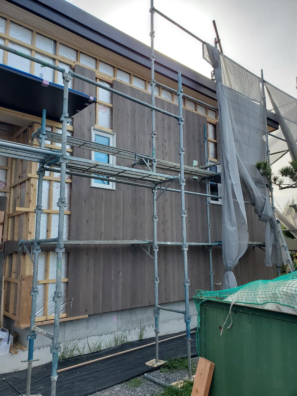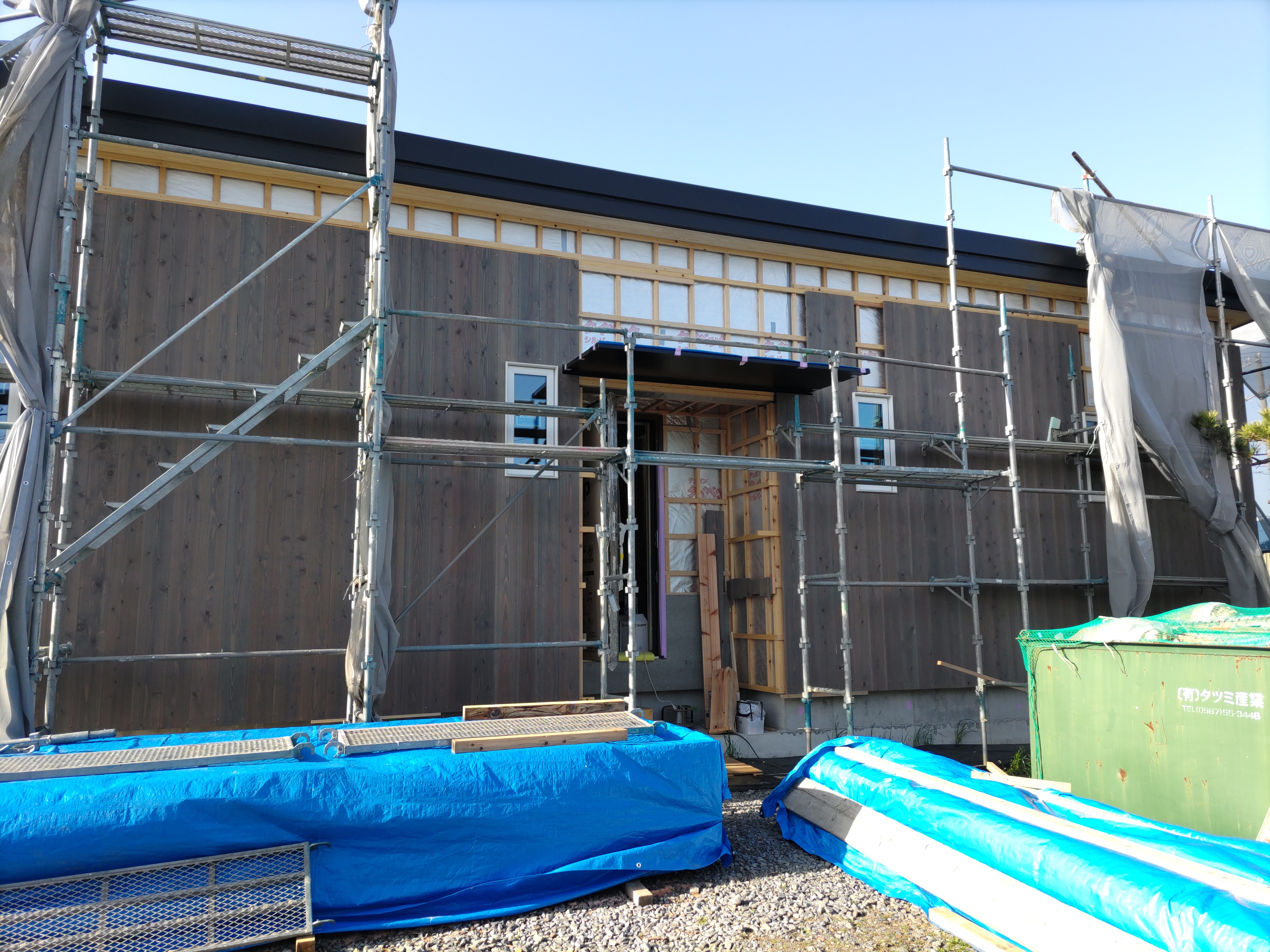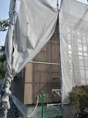 北世帯と南世帯に一枚ずつミノワの足場シートを掲げていましたが、お父様の案により『南の道路からよく見えるから両方南に取付けたらどう?』という事で2枚とも南世帯に掲げています。開けた南の道路からは良く見え、宣伝効果も2倍(当社比)です。