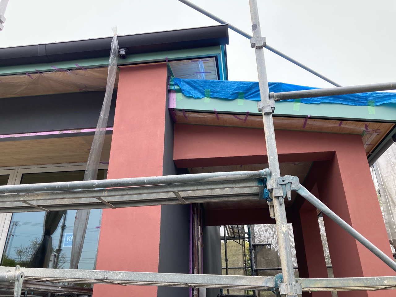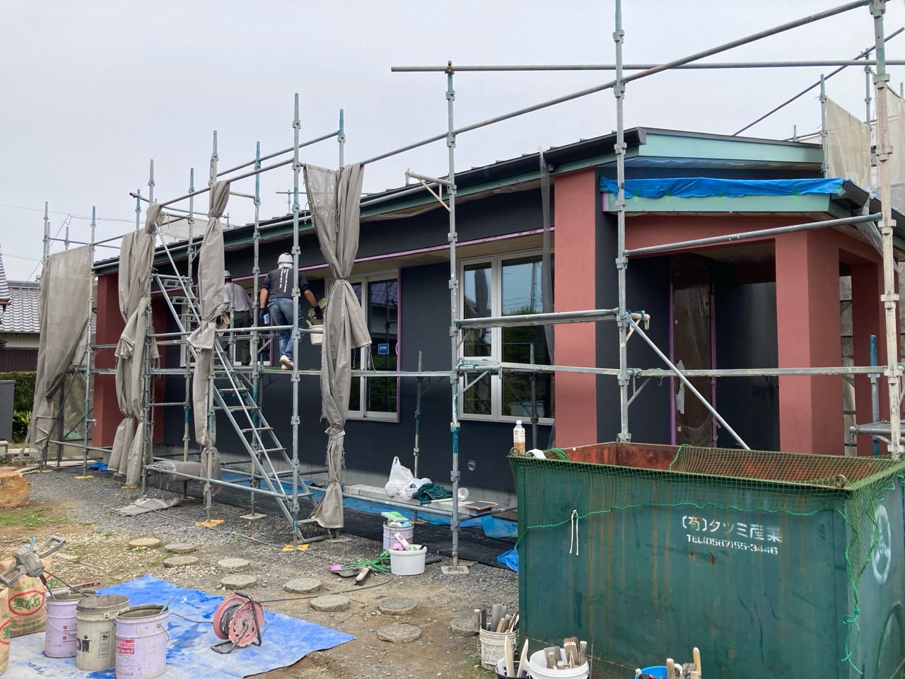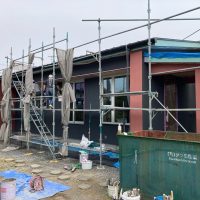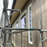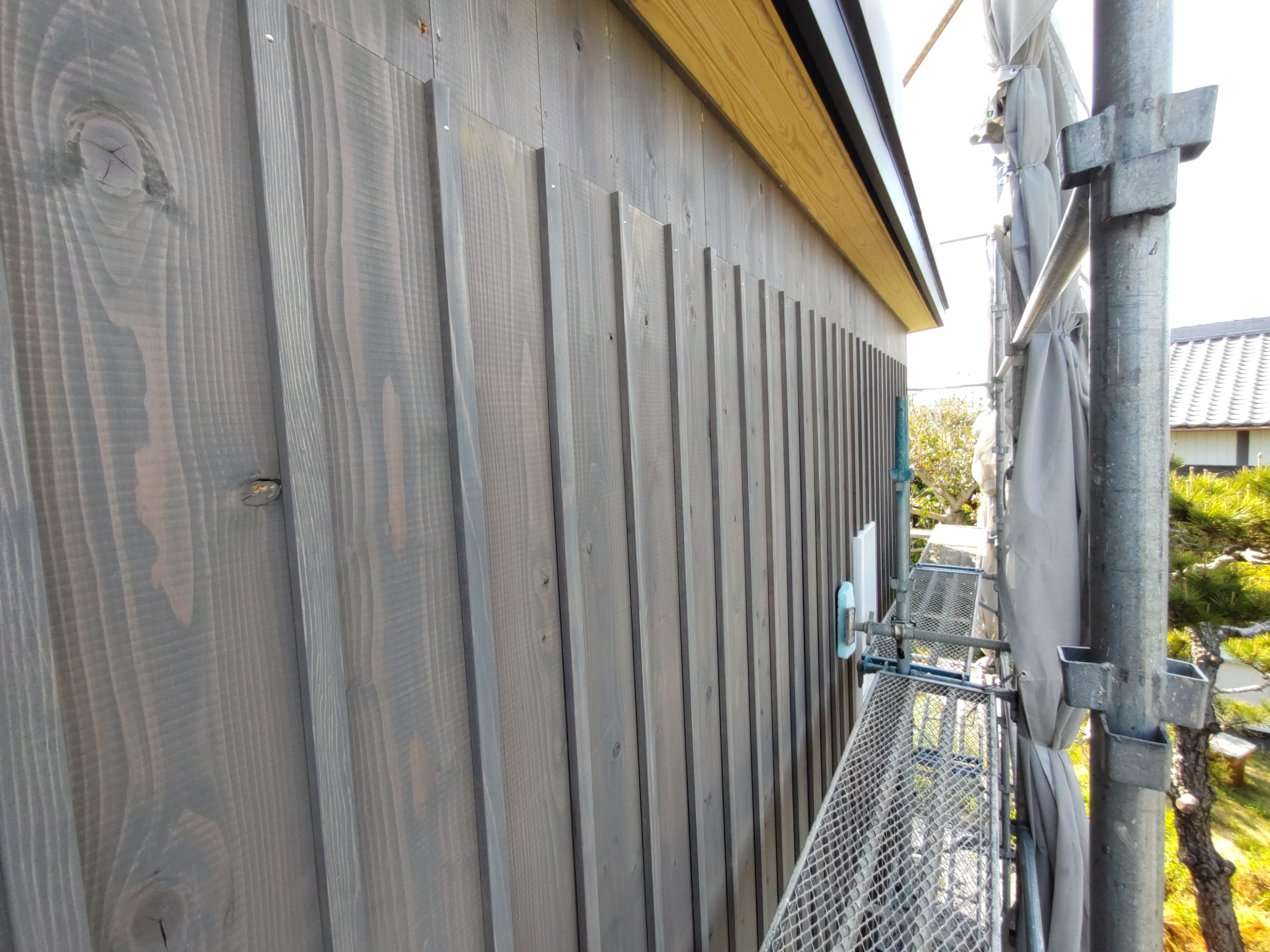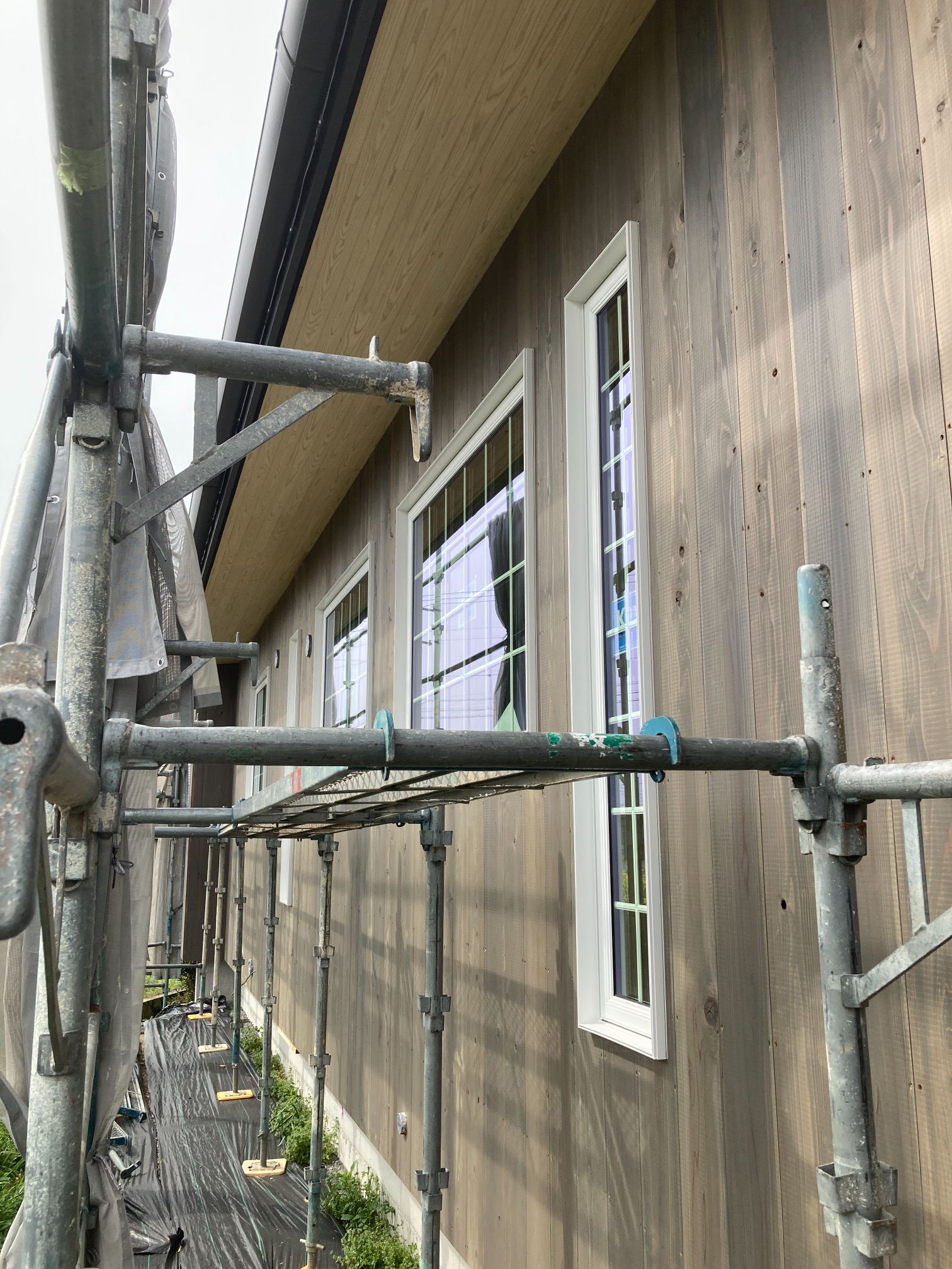 北世帯と南世帯に一枚ずつミノワの足場シートを掲げていましたが、お父様の案により『南の道路からよく見えるから両方南に取付けたらどう?』という事で2枚とも南世帯に掲げています。開けた南の道路からは良く見え、宣伝効果も2倍(当社比)です。