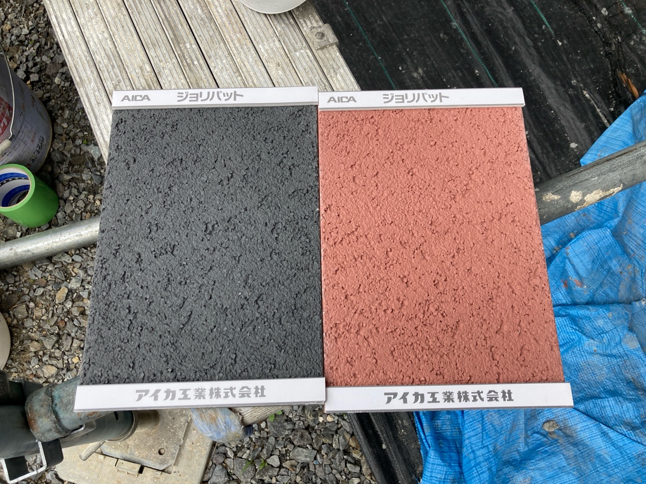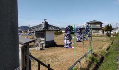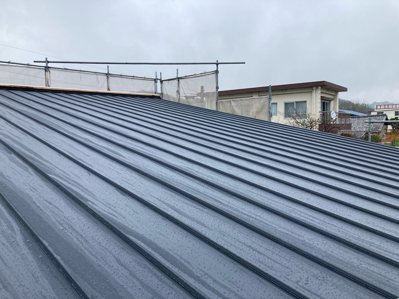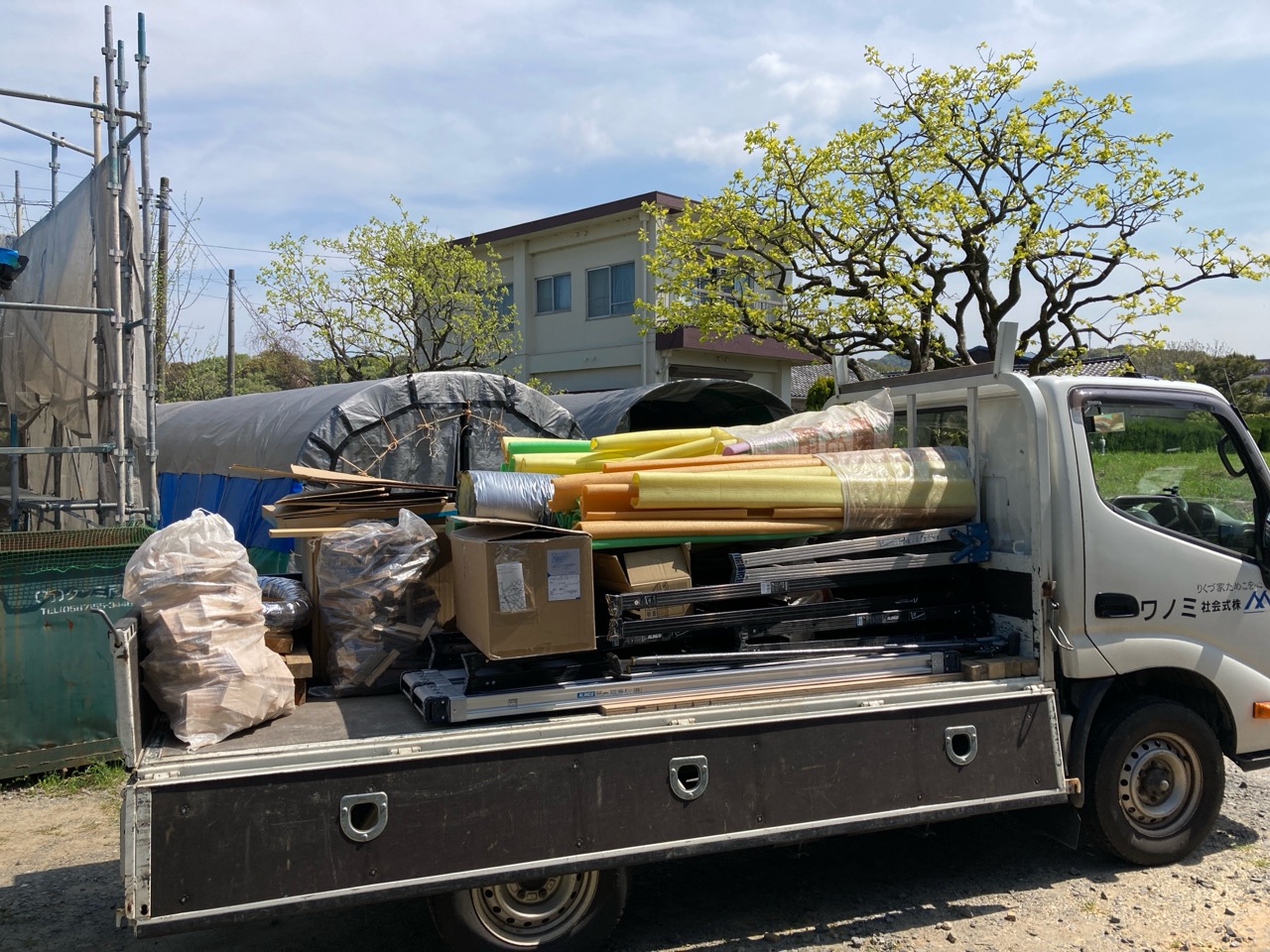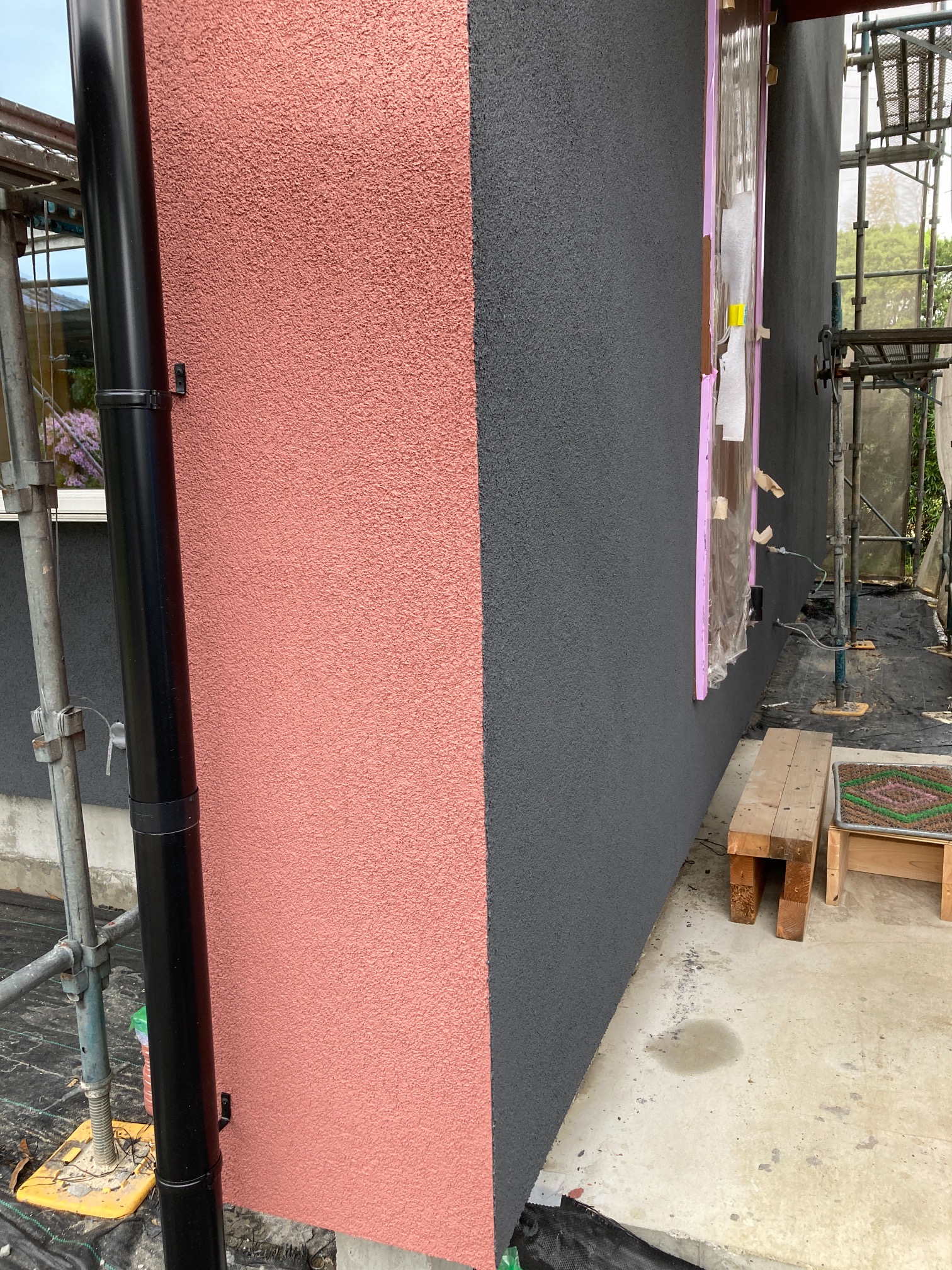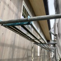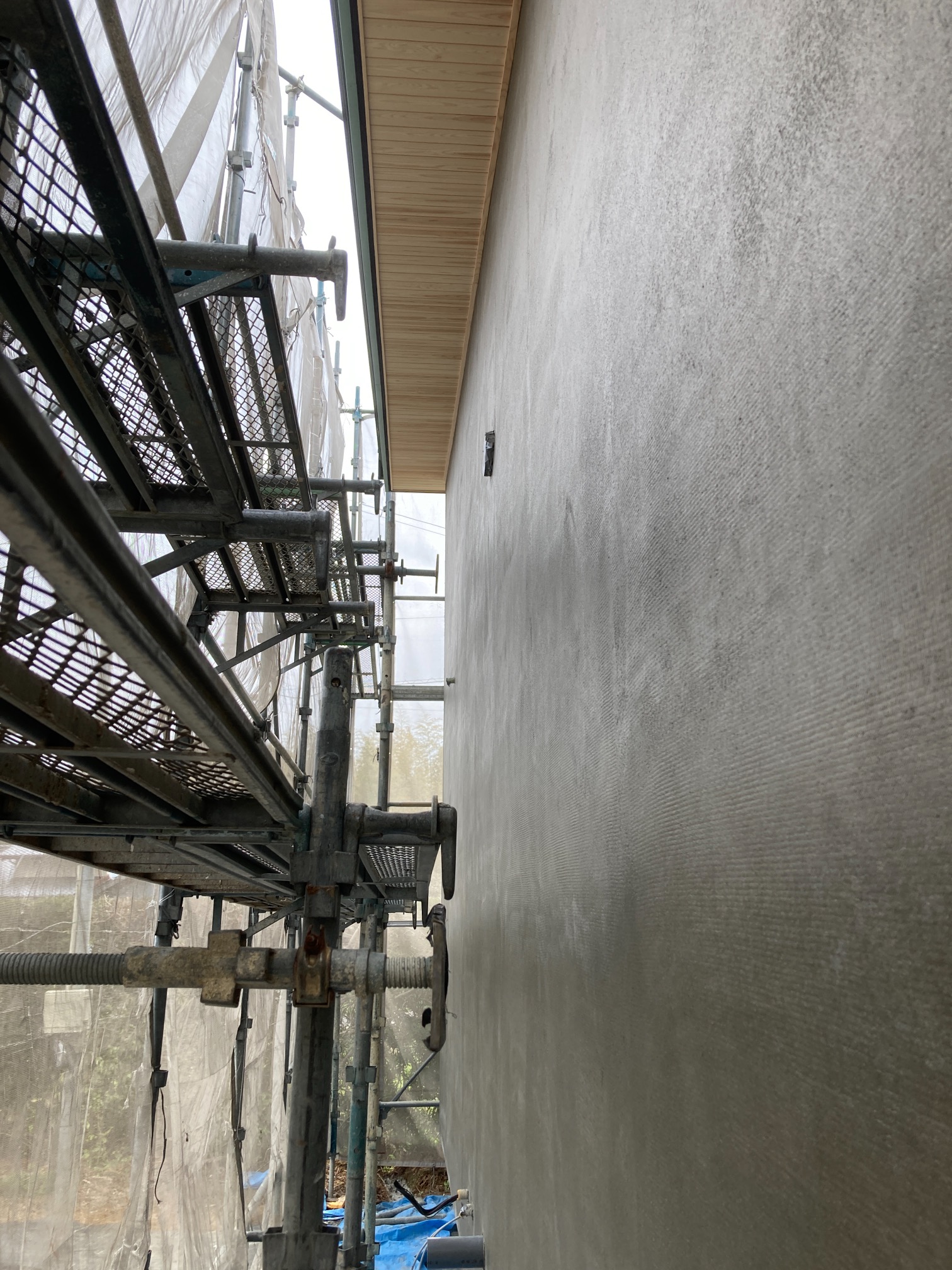 北世帯と南世帯に一枚ずつミノワの足場シートを掲げていましたが、お父様の案により『南の道路からよく見えるから両方南に取付けたらどう?』という事で2枚とも南世帯に掲げています。開けた南の道路からは良く見え、宣伝効果も2倍(当社比)です。