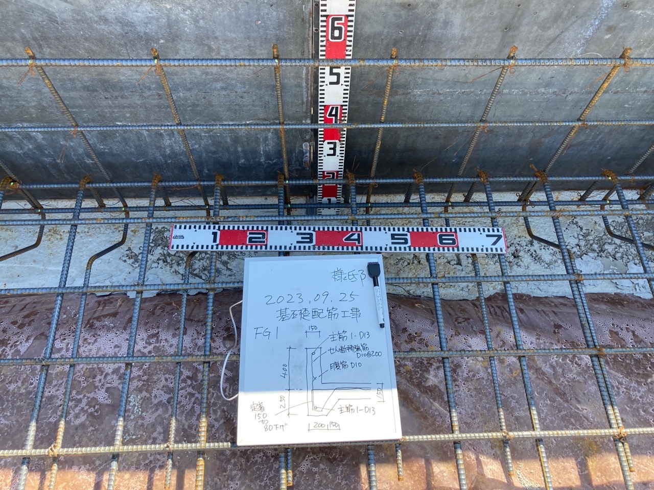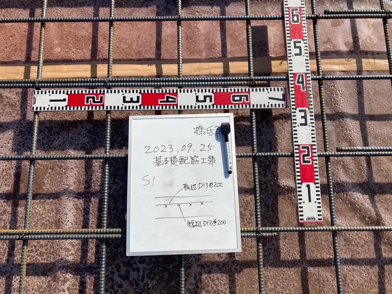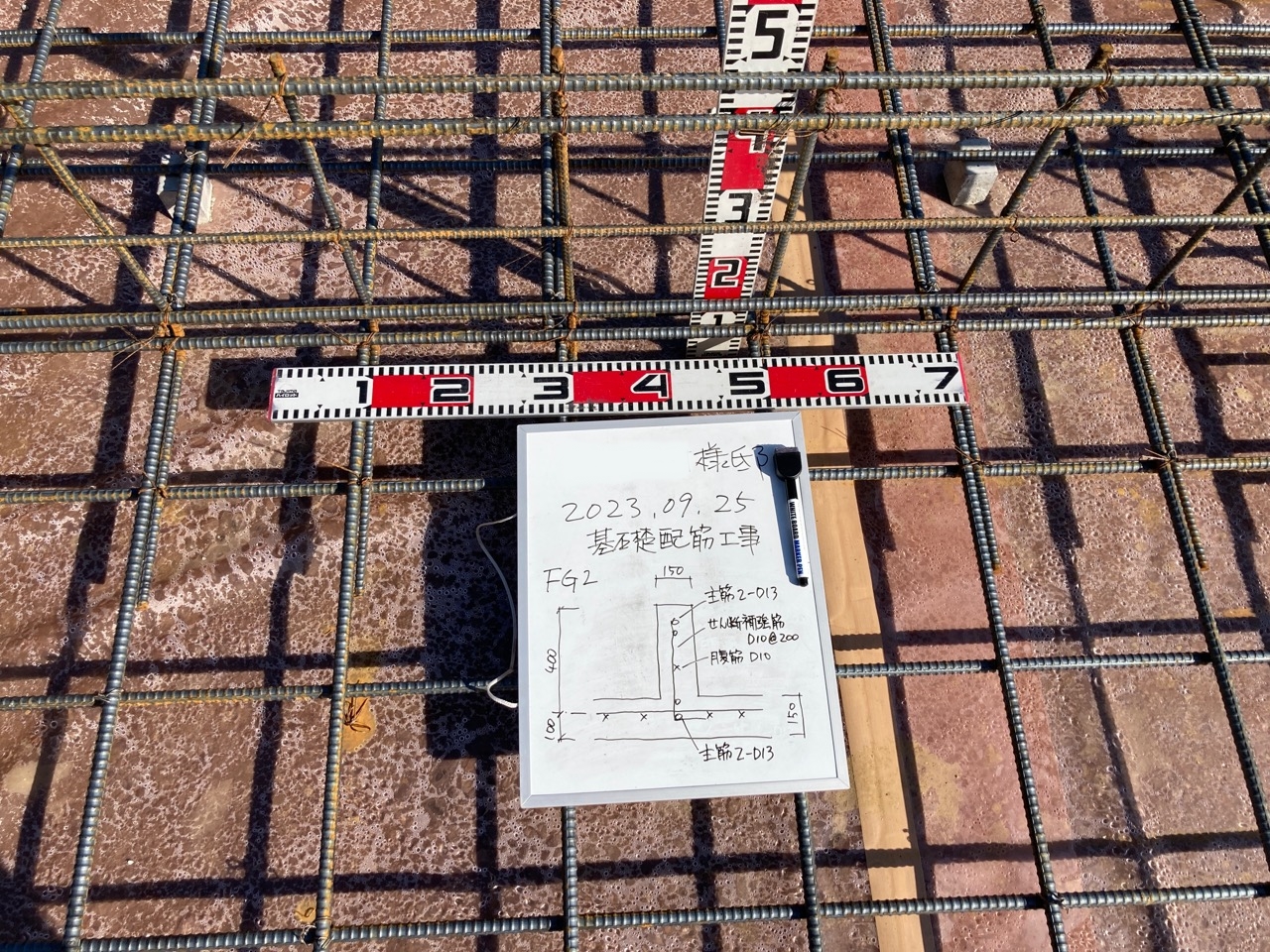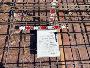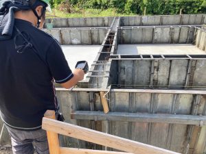 各箇所の配筋のピッチ、鉄筋の太さ、鉄筋同士の空き寸法、定着長さ、基礎梁の高さなどを細かくチェック。通常、自分で描いた配筋図ならばある程度暗記してますので検査もスムーズですが、今回は構造計算にもこだわりのある設計士さんの配筋。普段の図面に似ているものの、よくよく目を凝らして見ると微妙な違いがあります。それらをぬかりなくチェックするには多少の時間がかかります。この作業を2棟分行うため、普段よりも神経を使います。