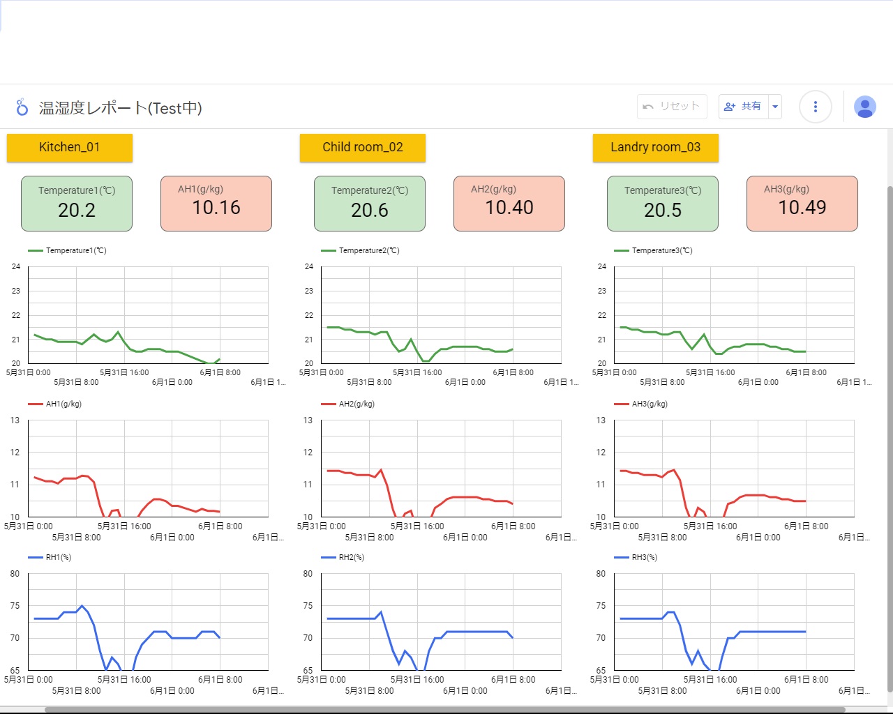 加えてy様がWi-Fi環境でデータを送信できる温湿度計『スイッチポッド』を室内に置いてくださっていましたので、温度、絶対湿度(水蒸気量)、相対湿度をグラフ化して見る事ができ、よりKAMI式システムの効果が分かりやすくなっています。