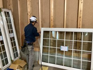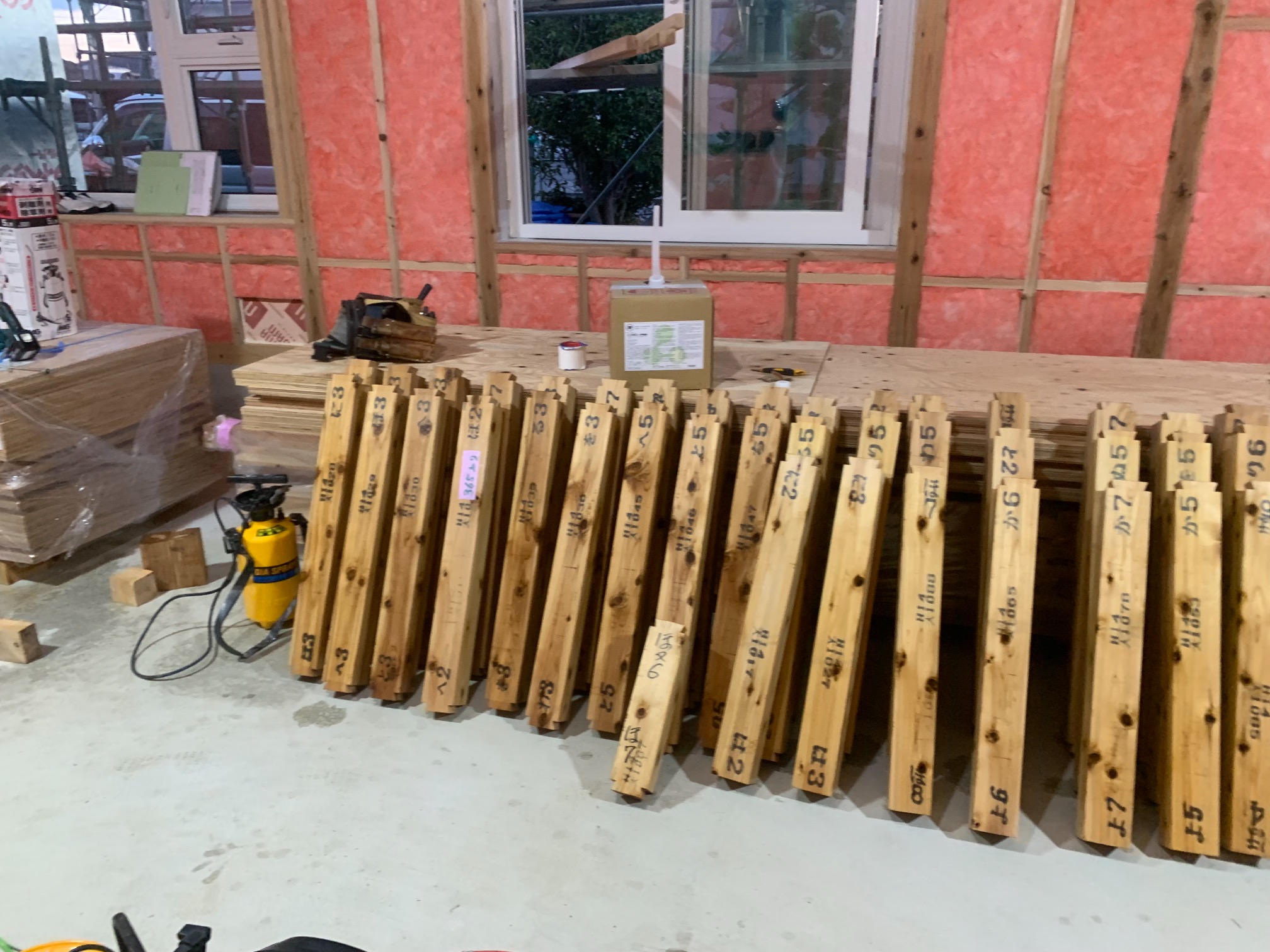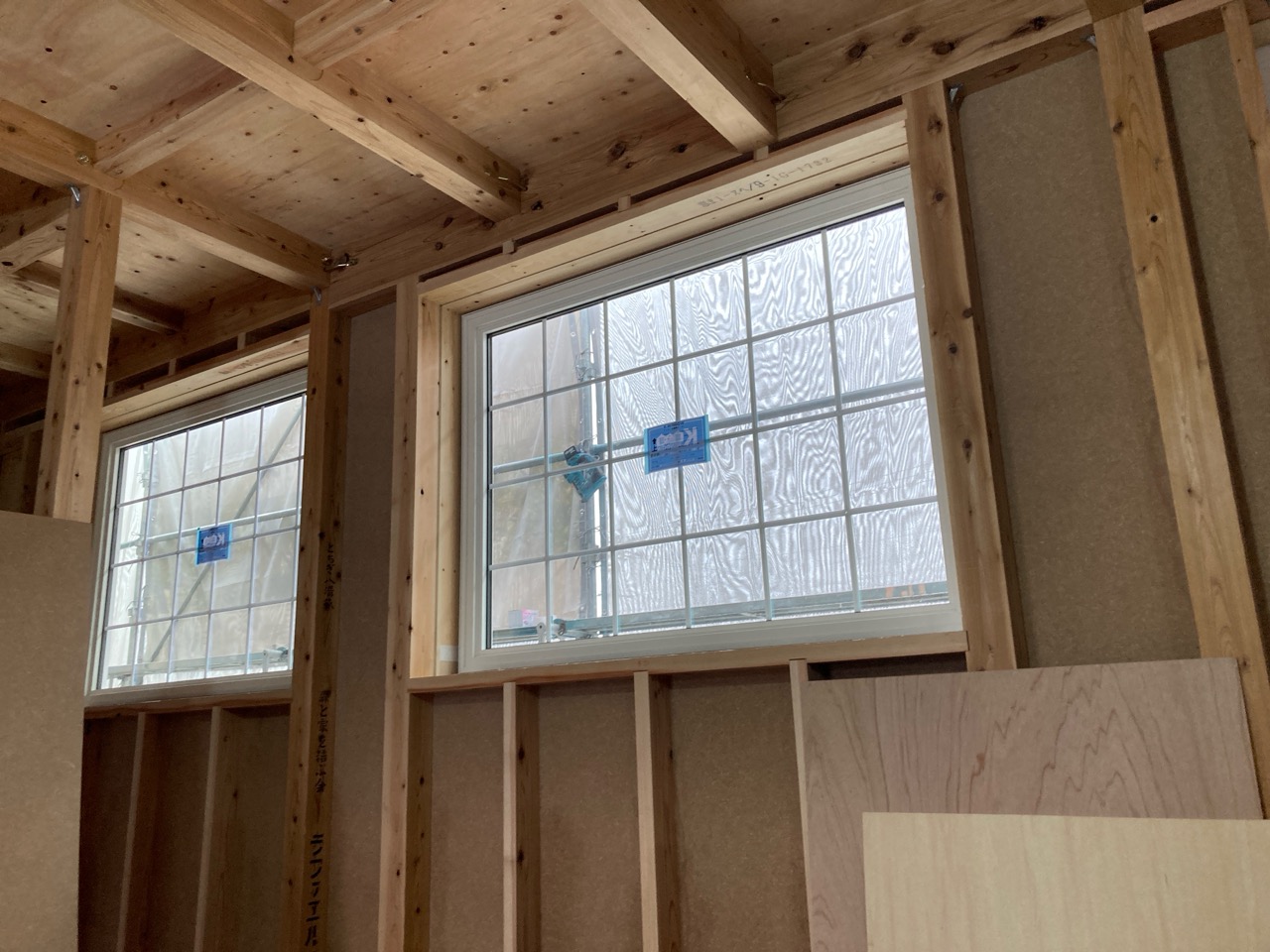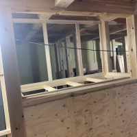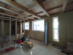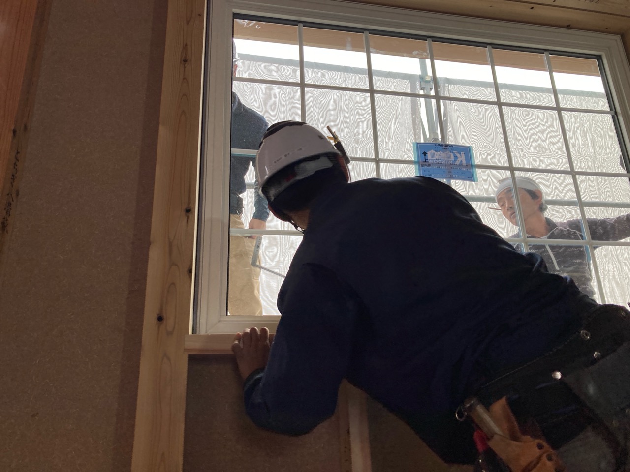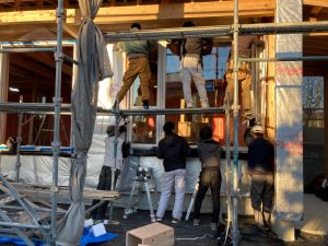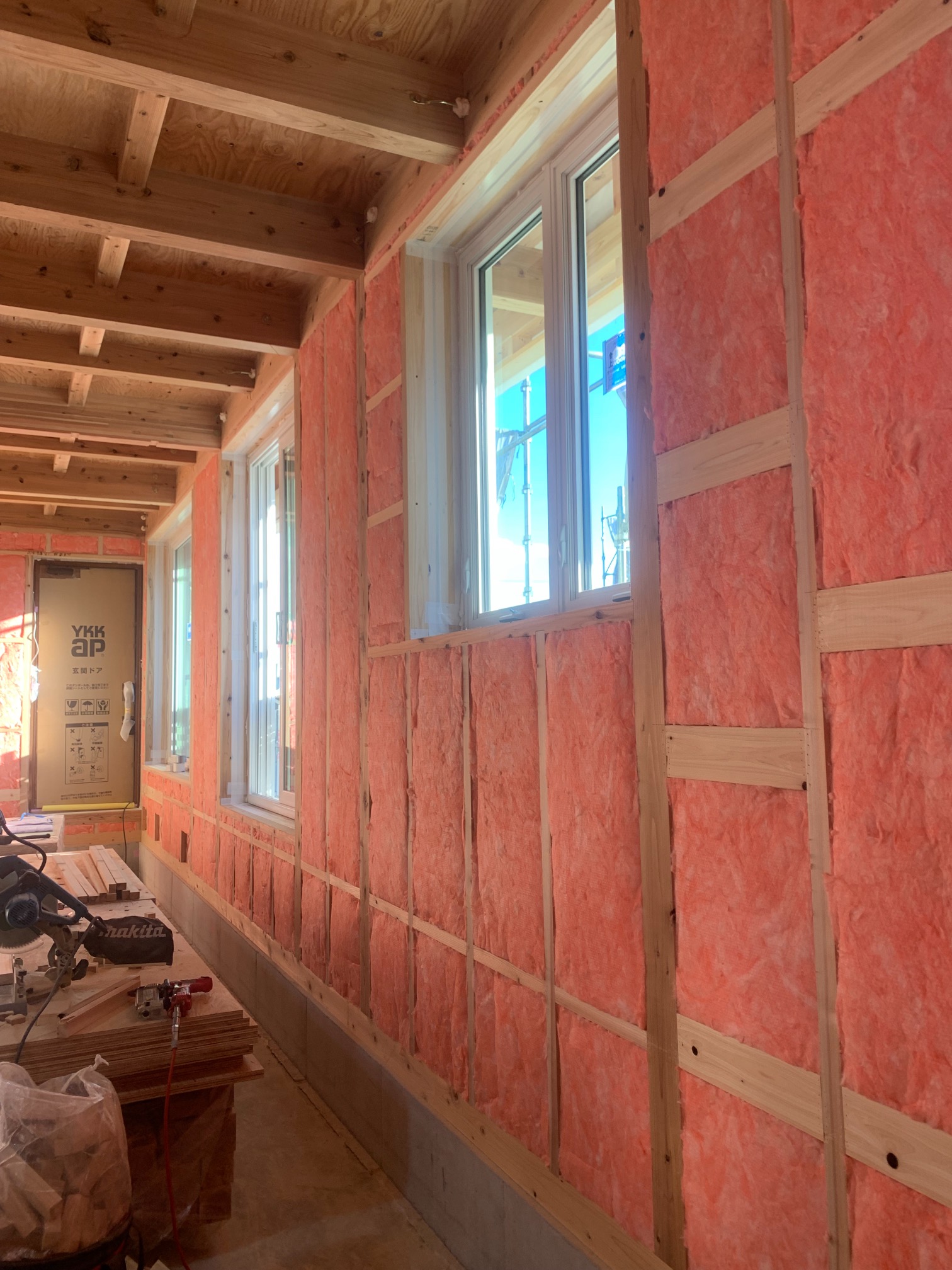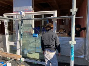 そんな中非常にデカいサッシが1セット登場。大開口FIXとすべり出し窓の連窓段窓の組み合わせのサッシがペアガラス入りで鎮座しています。重量にして大変なものでトラックから取付位置まで5人がかりで運搬。(一番手前に取付ける位置があり助かりました)