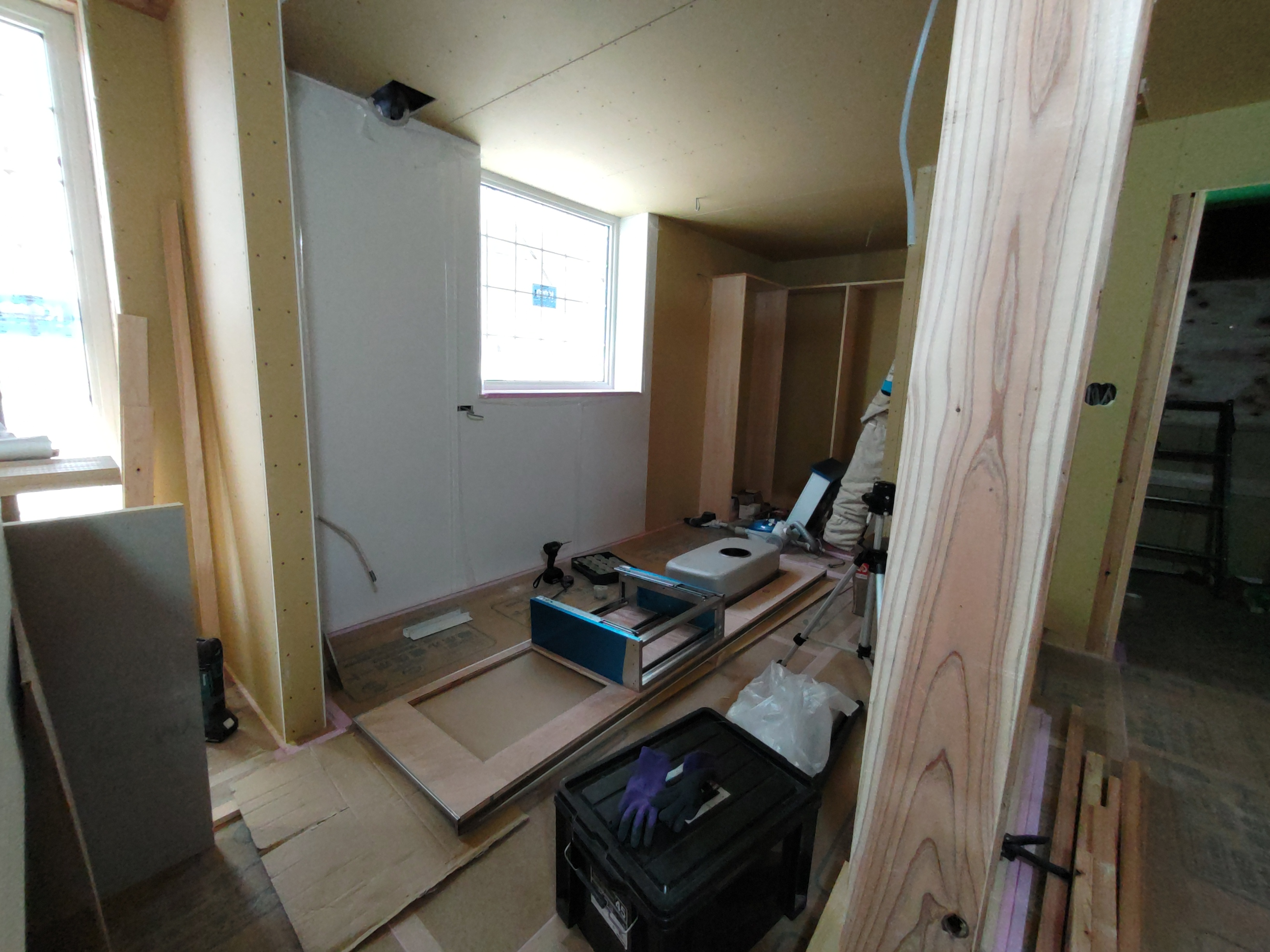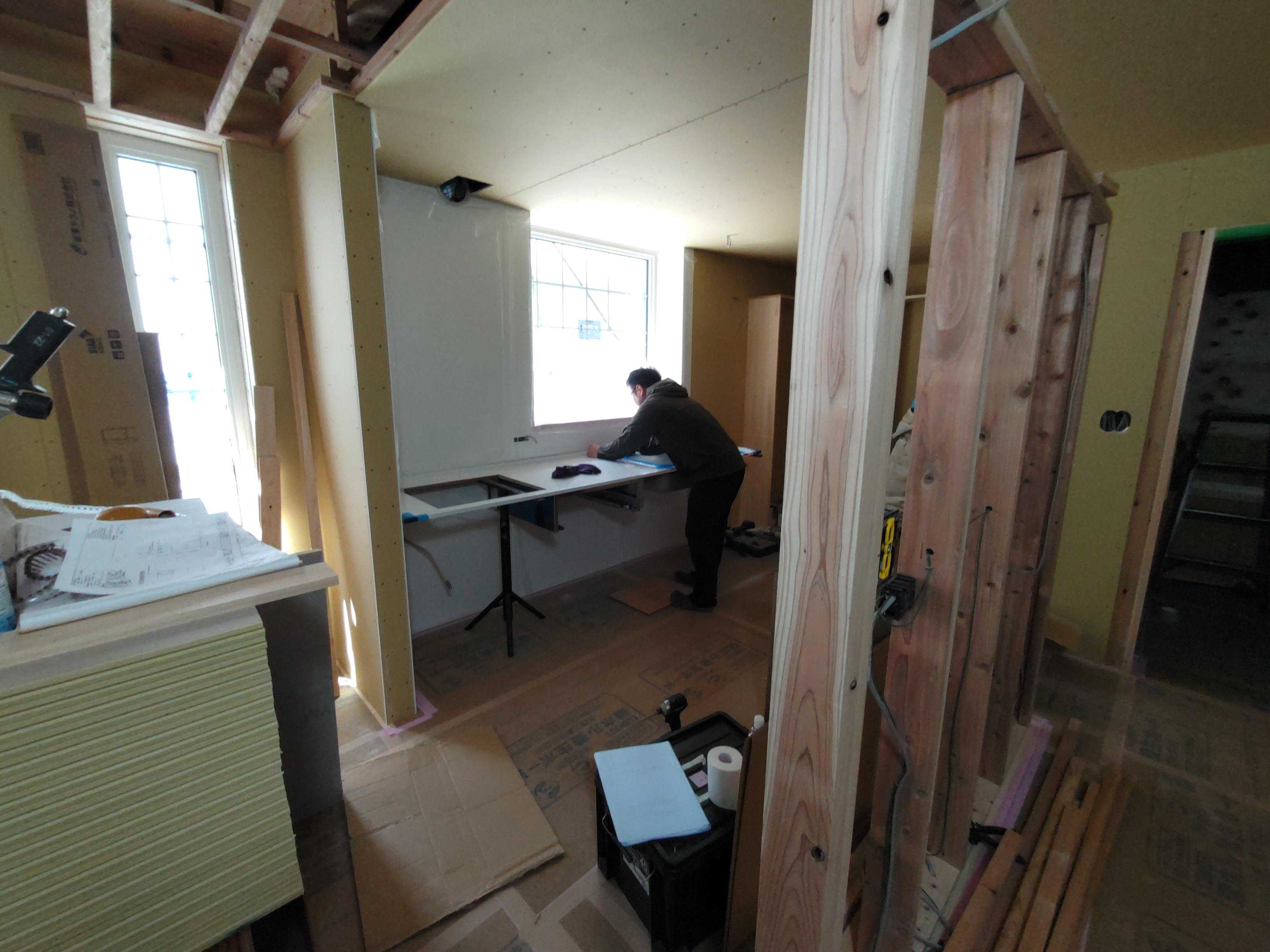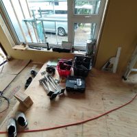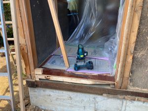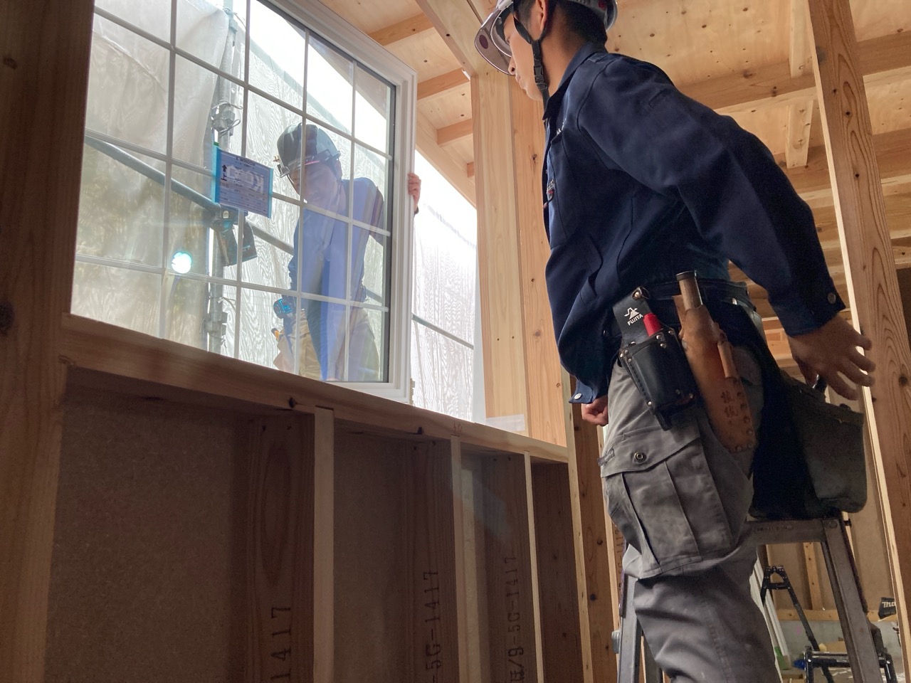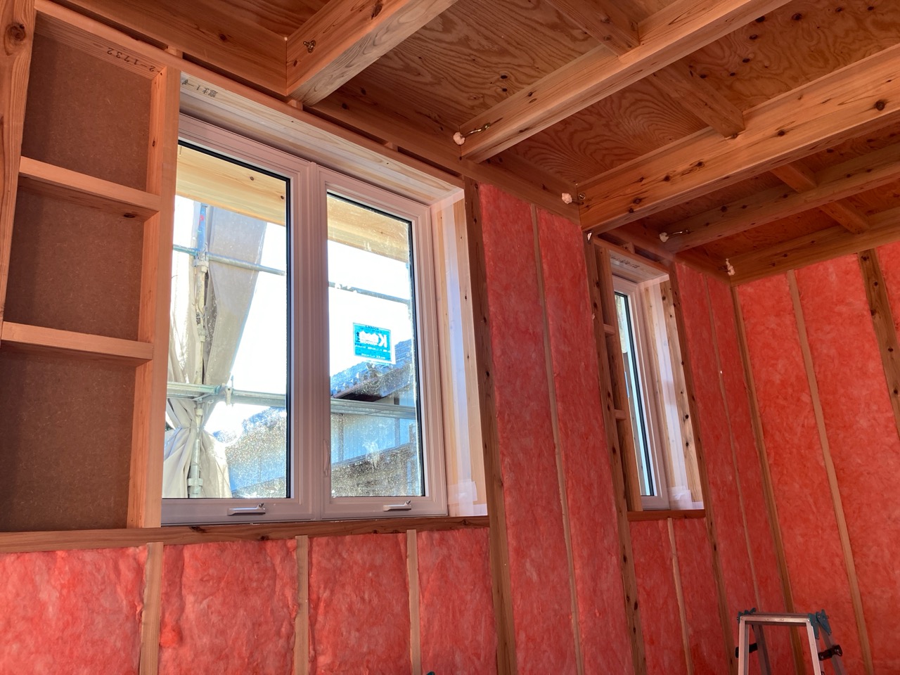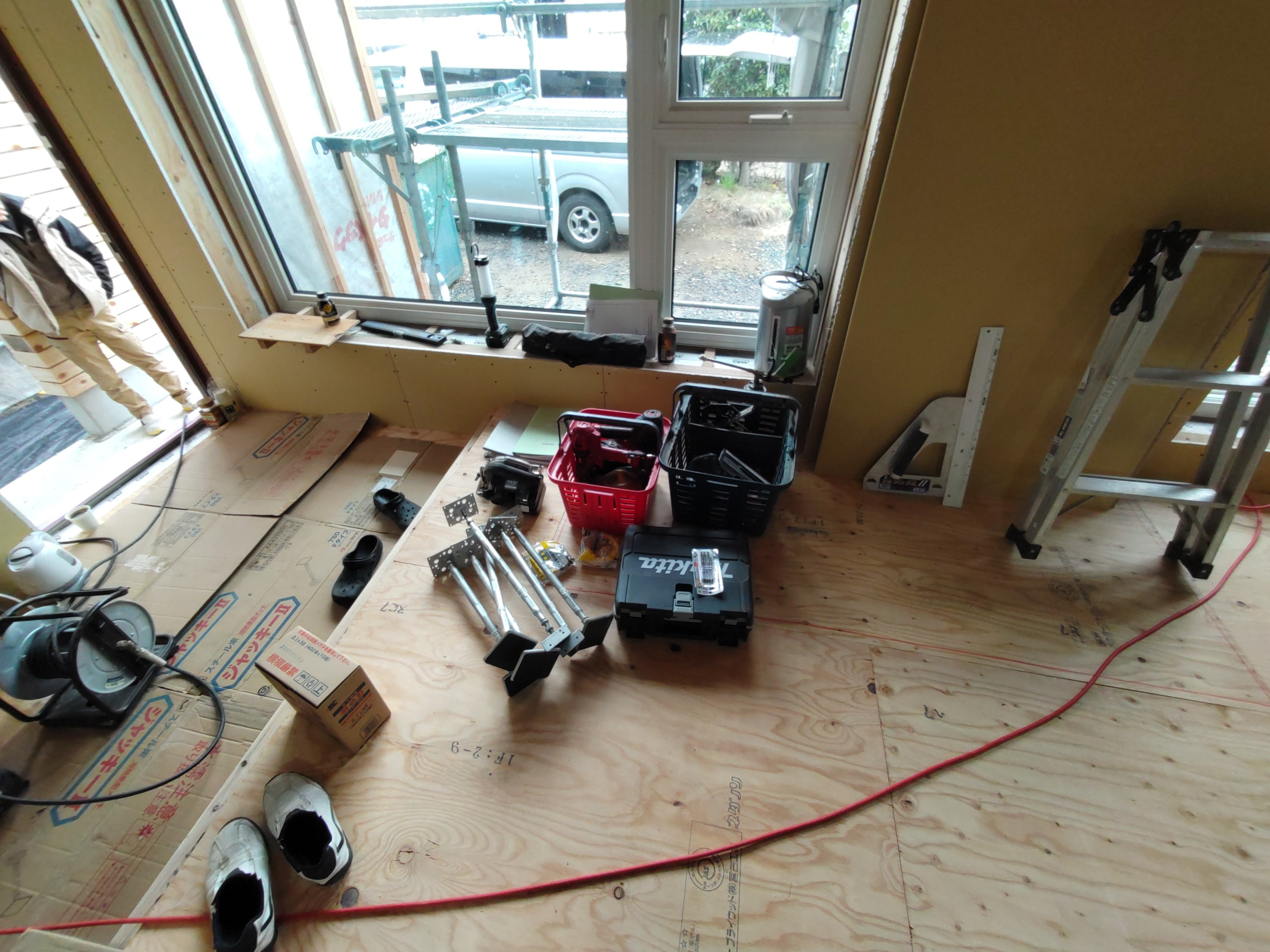 そんな中非常にデカいサッシが1セット登場。大開口FIXとすべり出し窓の連窓段窓の組み合わせのサッシがペアガラス入りで鎮座しています。重量にして大変なものでトラックから取付位置まで5人がかりで運搬。(一番手前に取付ける位置があり助かりました)
