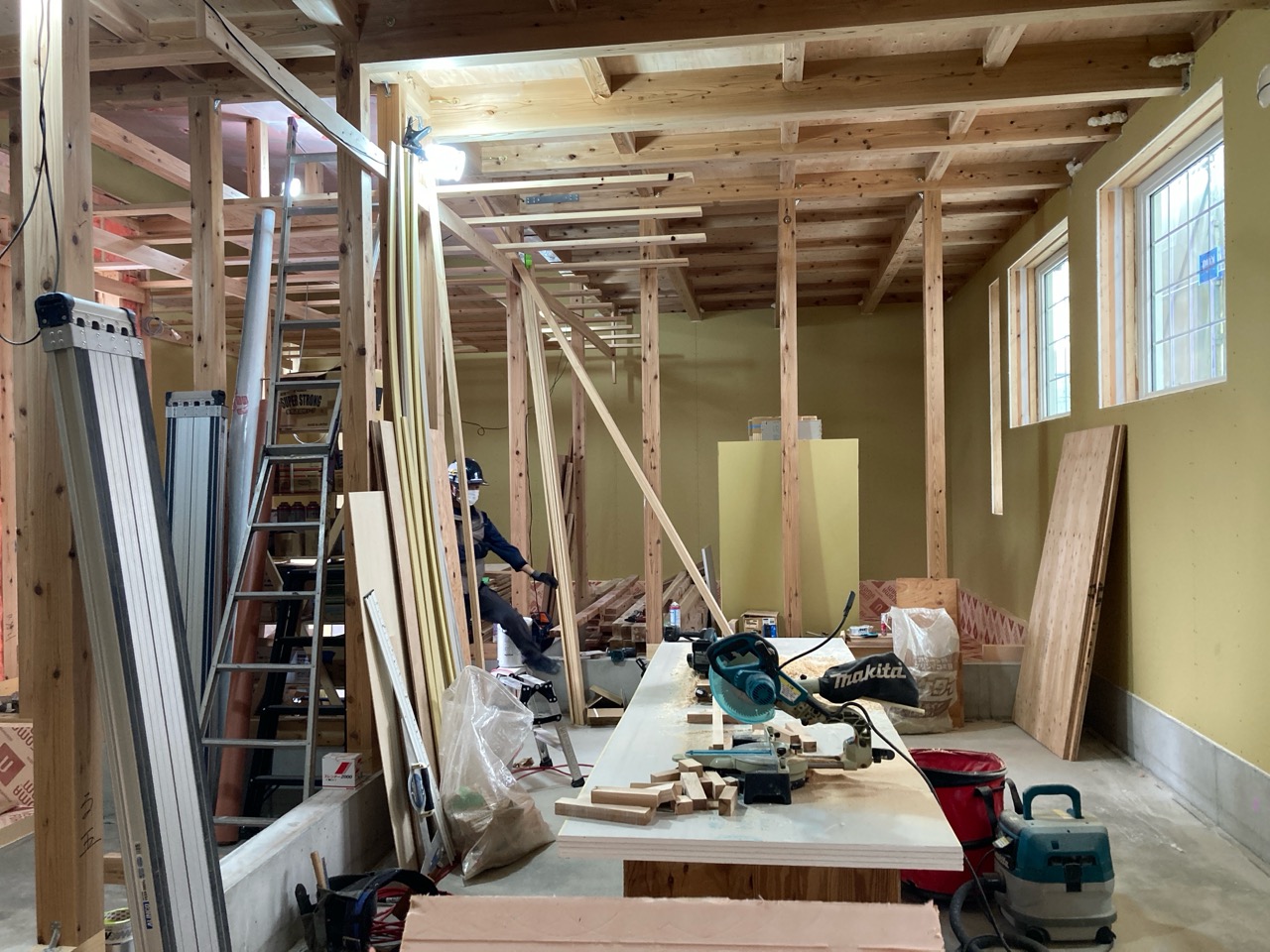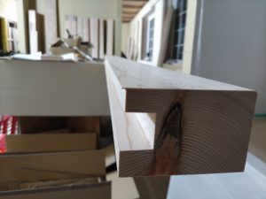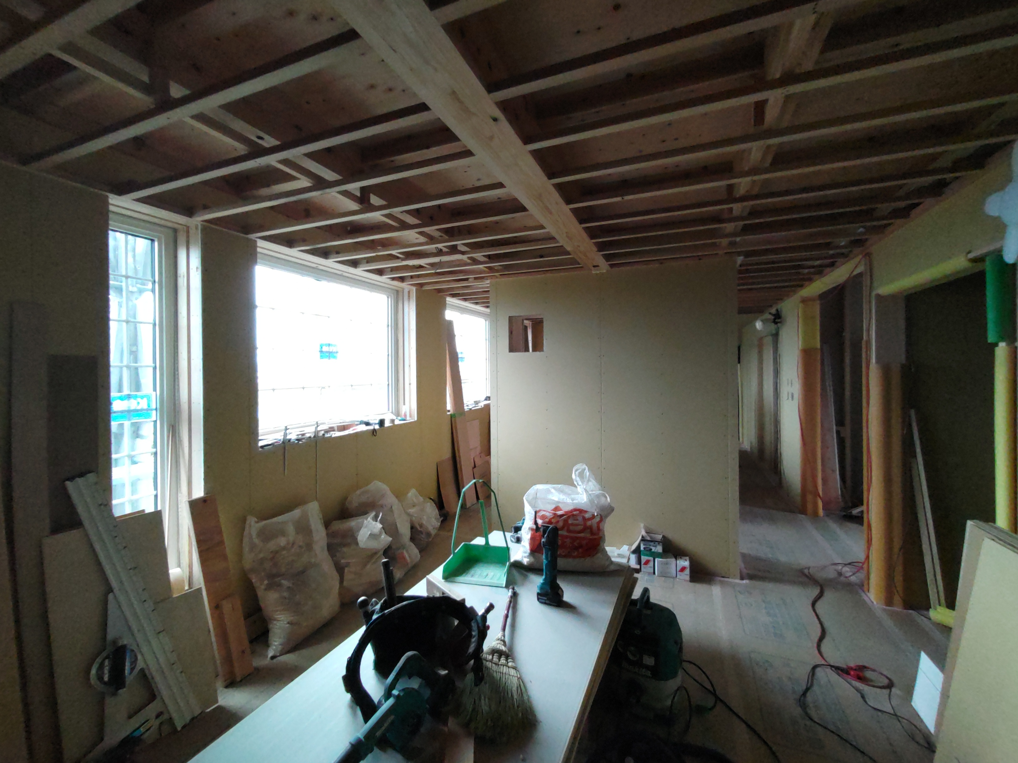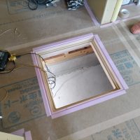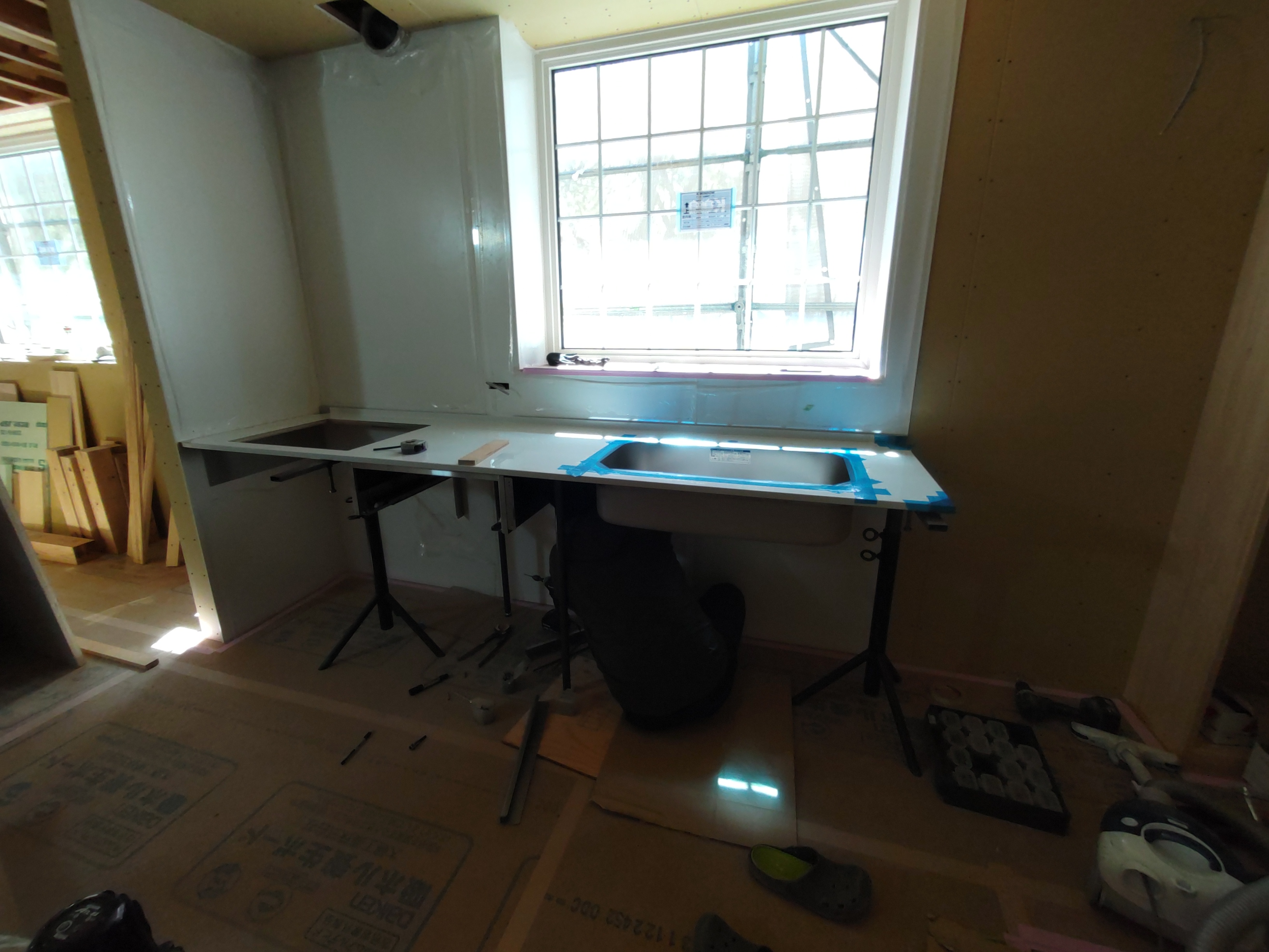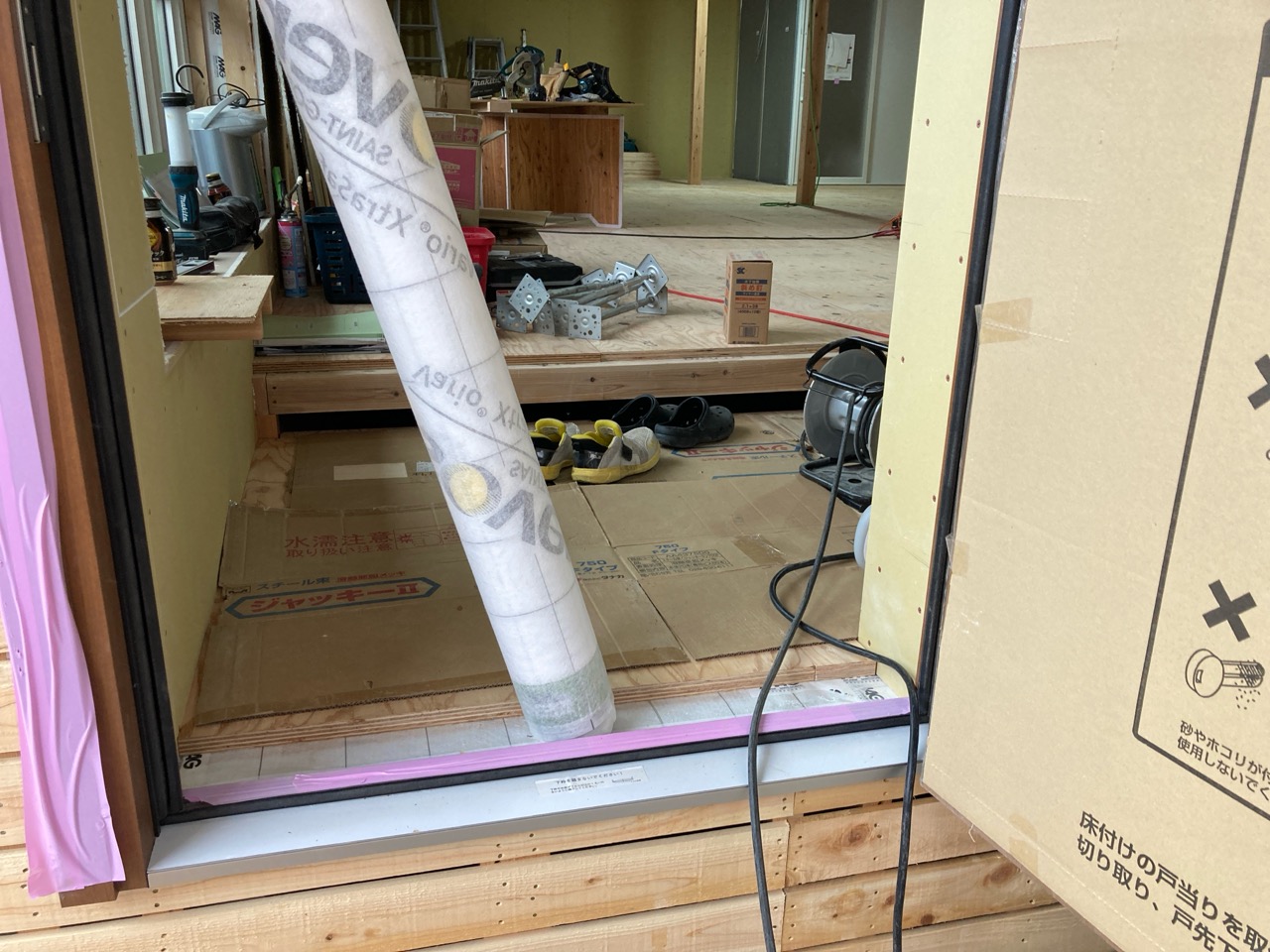 そんな中非常にデカいサッシが1セット登場。大開口FIXとすべり出し窓の連窓段窓の組み合わせのサッシがペアガラス入りで鎮座しています。重量にして大変なものでトラックから取付位置まで5人がかりで運搬。(一番手前に取付ける位置があり助かりました)