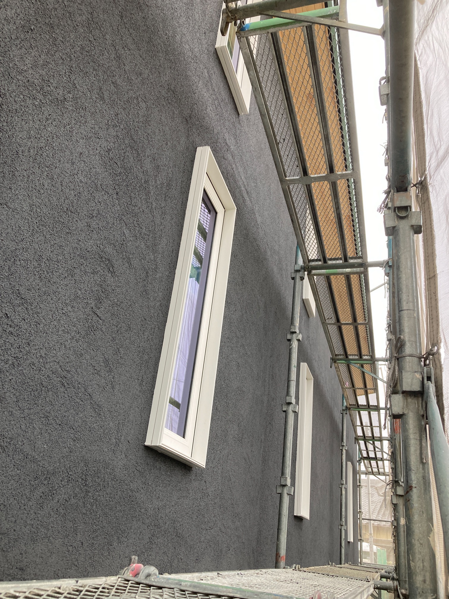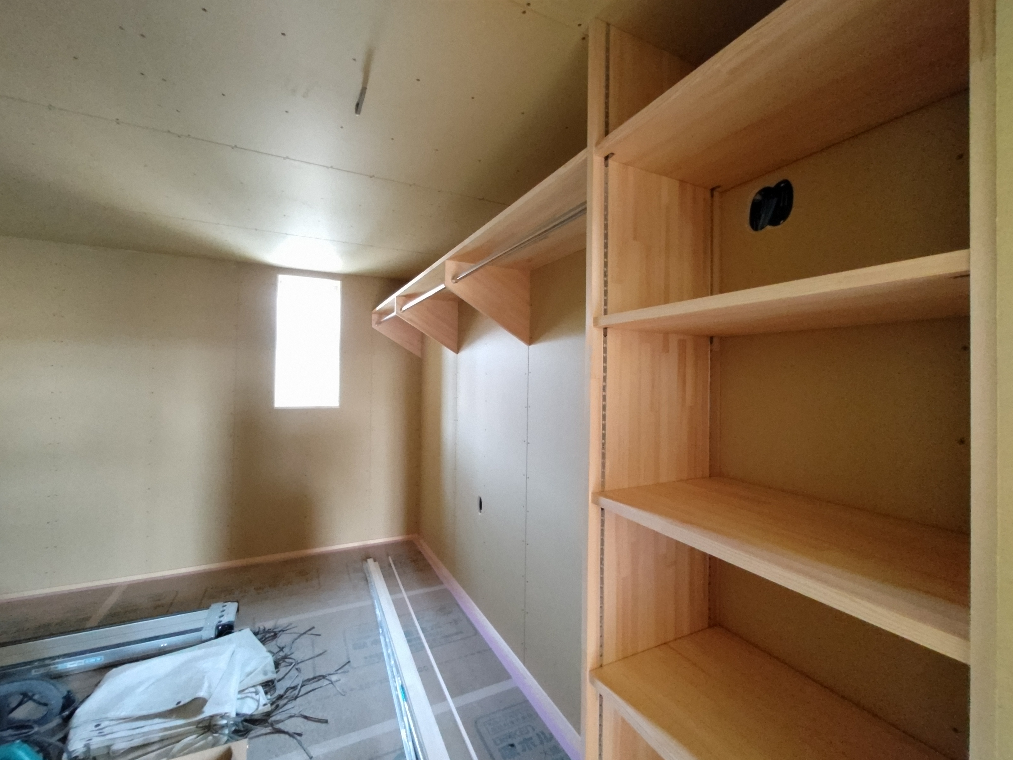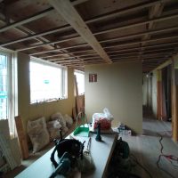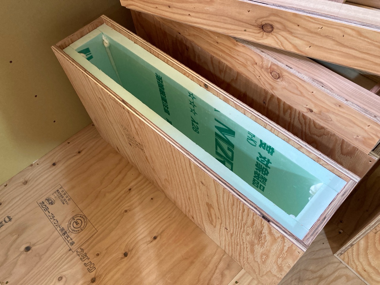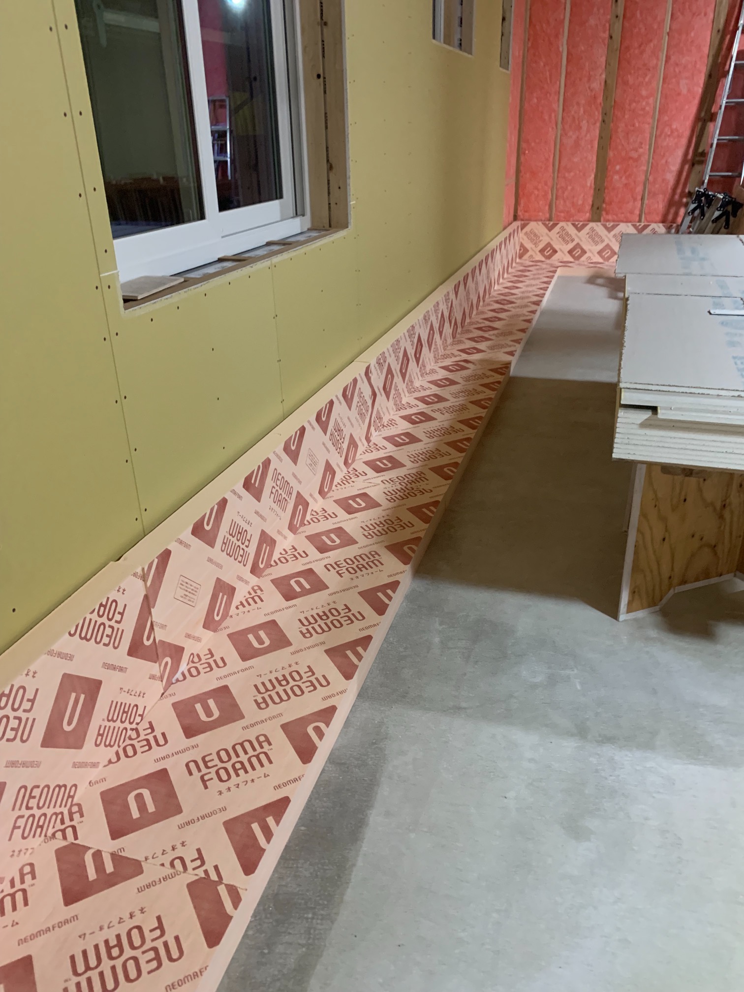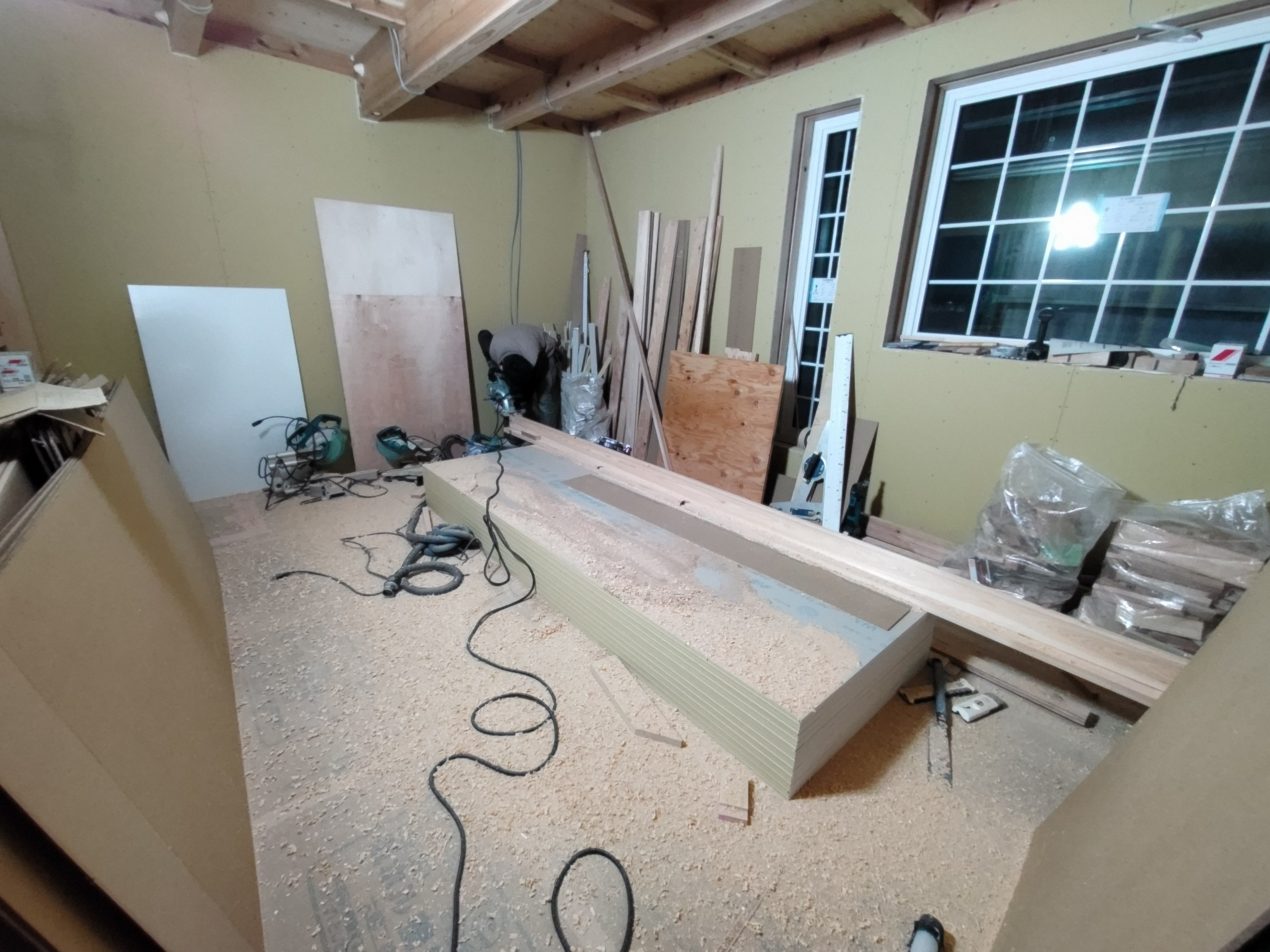 そんな中非常にデカいサッシが1セット登場。大開口FIXとすべり出し窓の連窓段窓の組み合わせのサッシがペアガラス入りで鎮座しています。重量にして大変なものでトラックから取付位置まで5人がかりで運搬。(一番手前に取付ける位置があり助かりました)