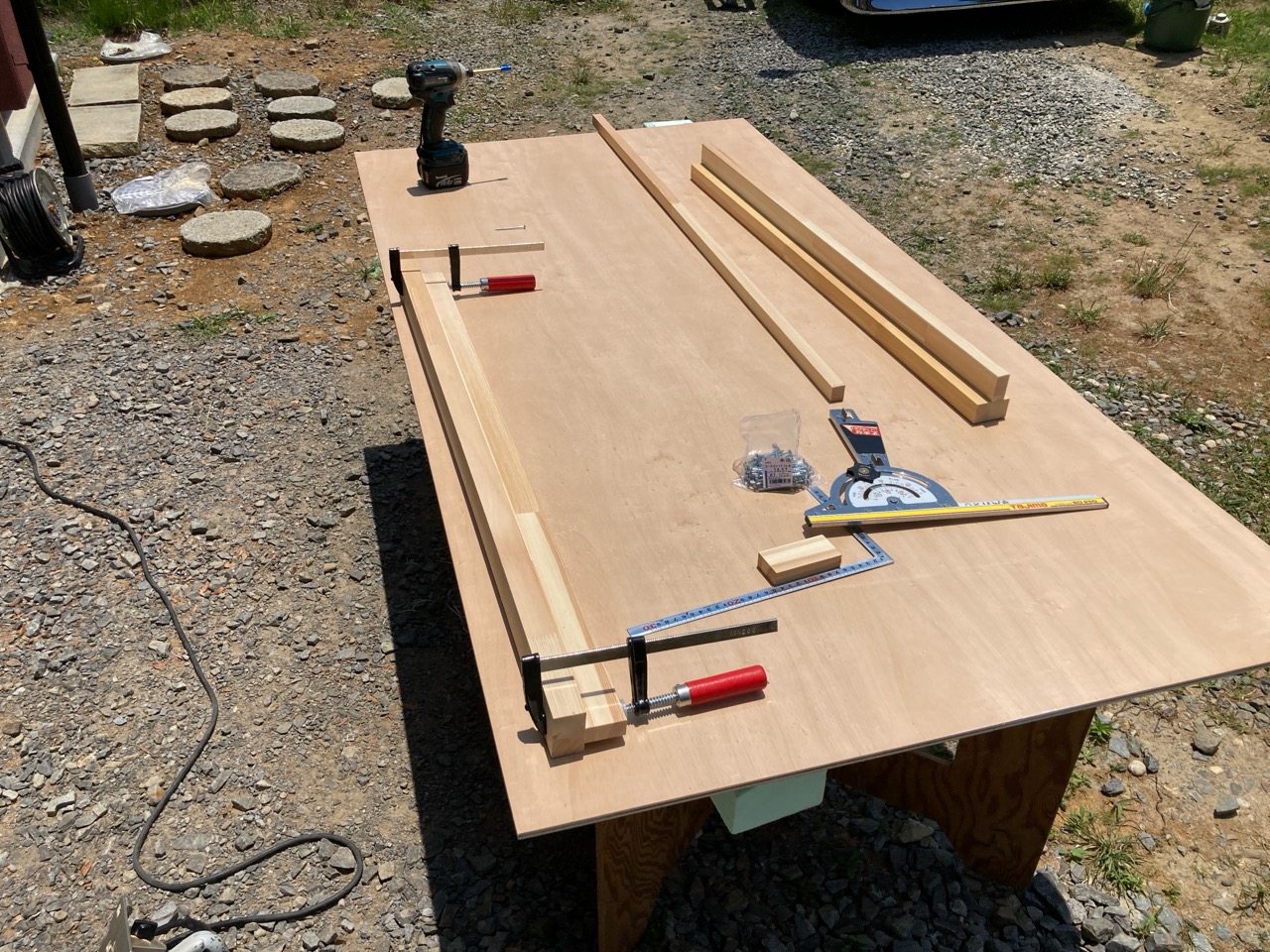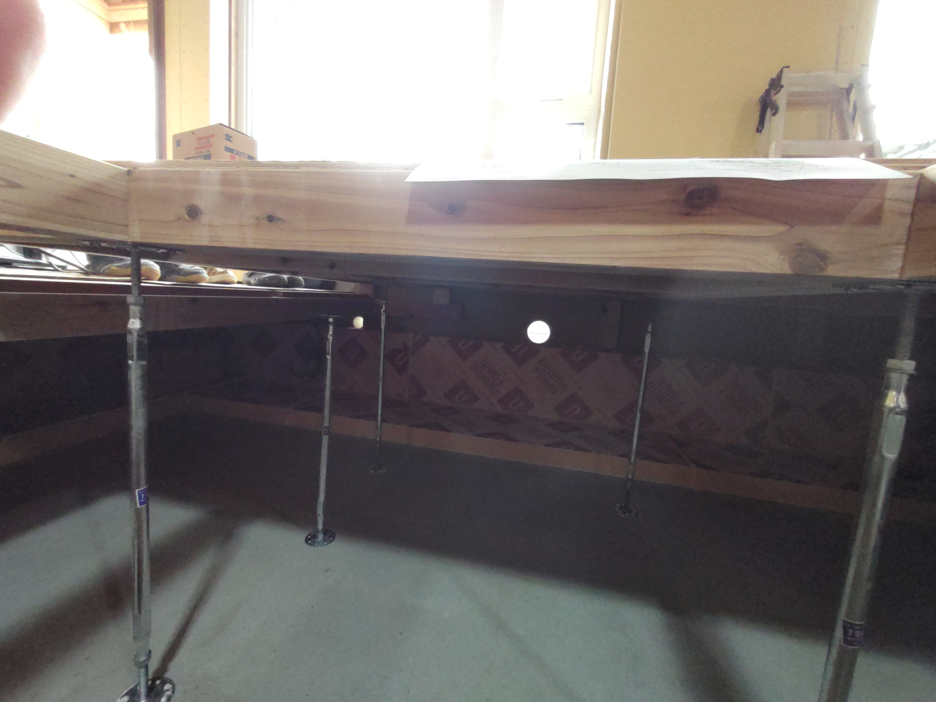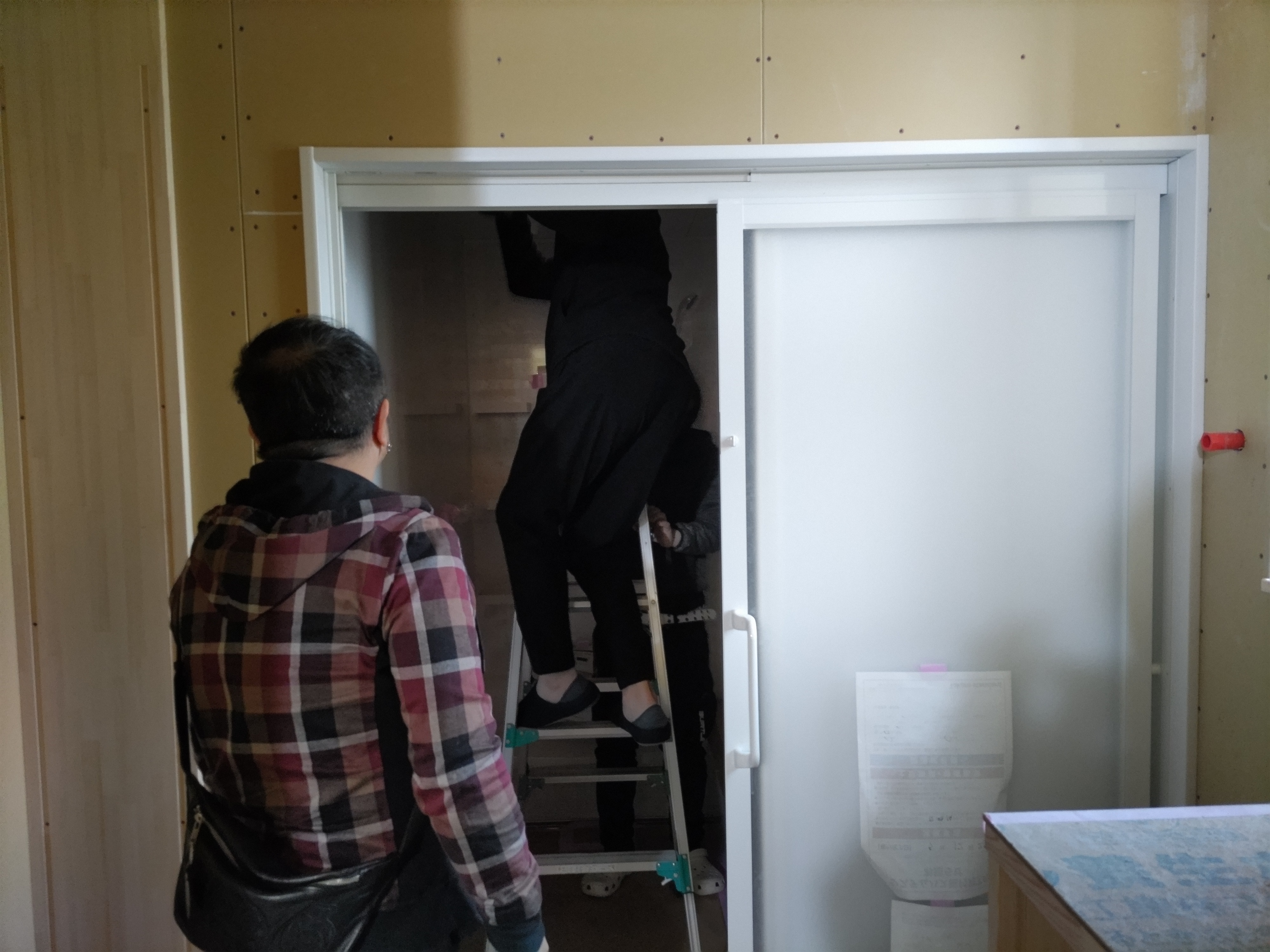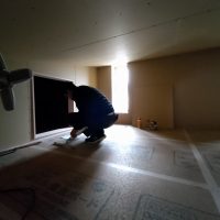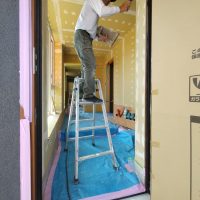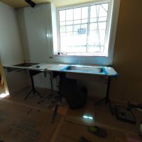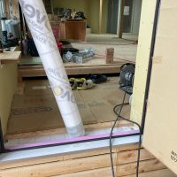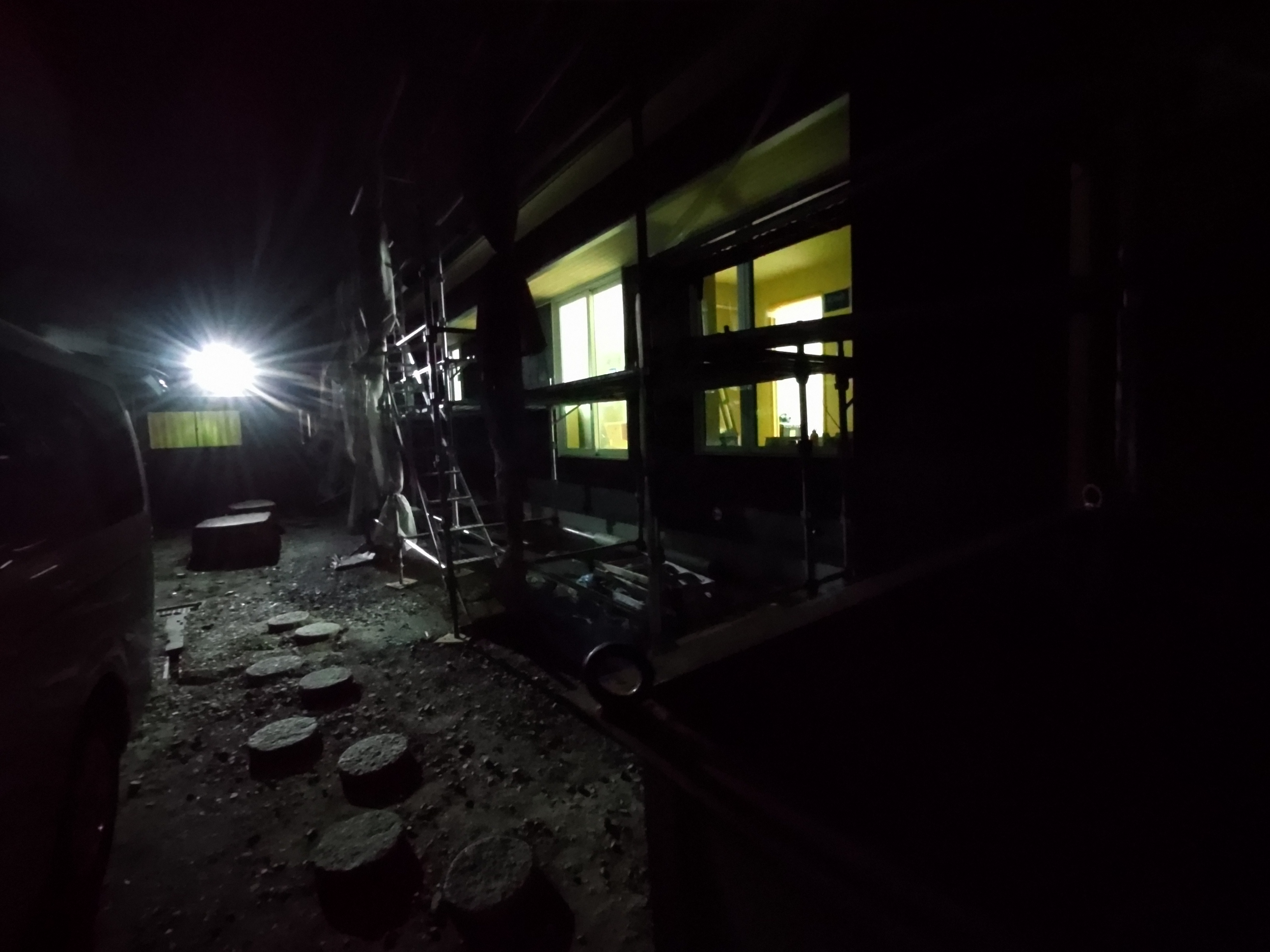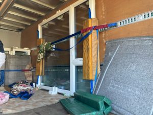 そんな中非常にデカいサッシが1セット登場。大開口FIXとすべり出し窓の連窓段窓の組み合わせのサッシがペアガラス入りで鎮座しています。重量にして大変なものでトラックから取付位置まで5人がかりで運搬。(一番手前に取付ける位置があり助かりました)