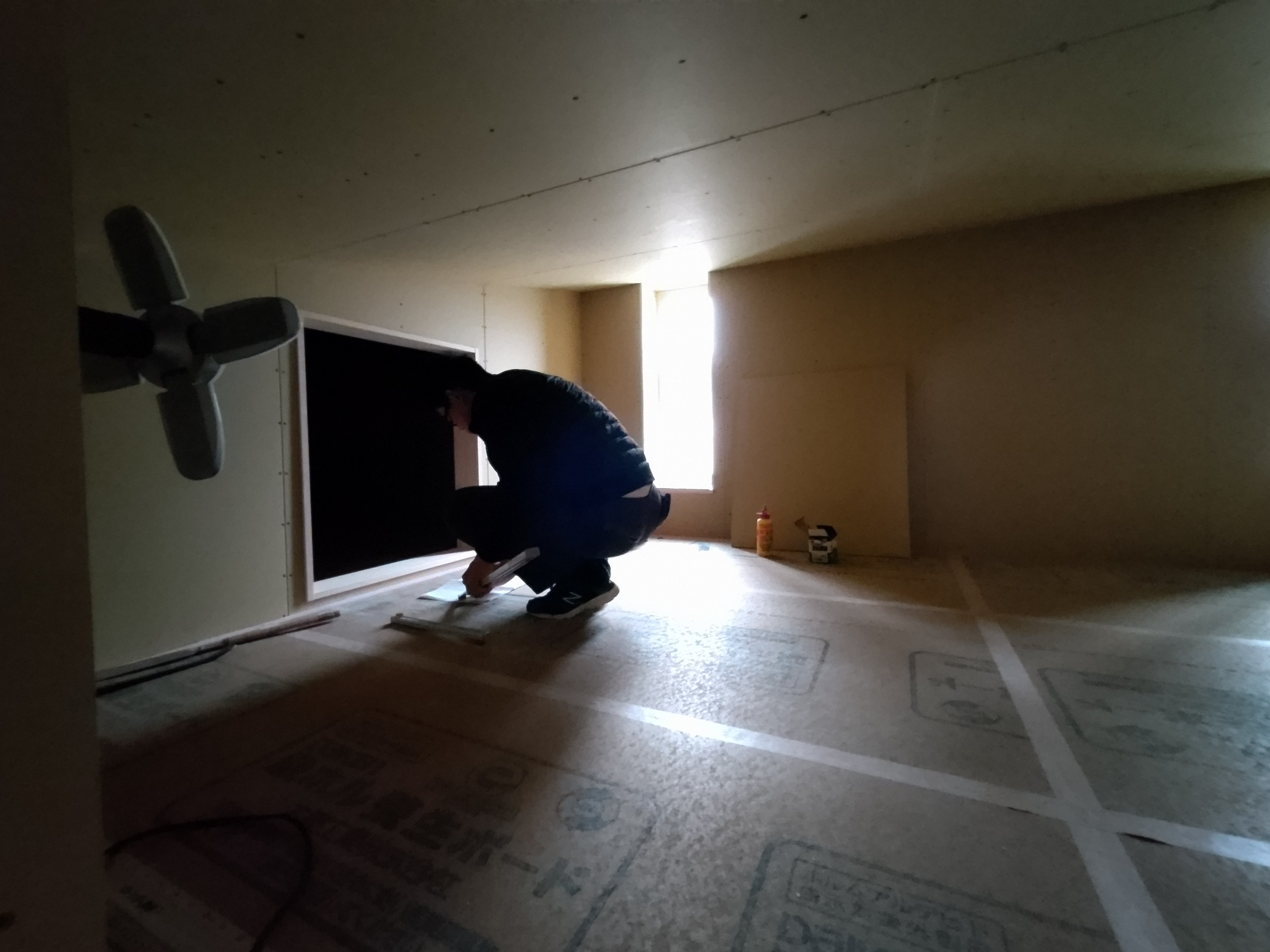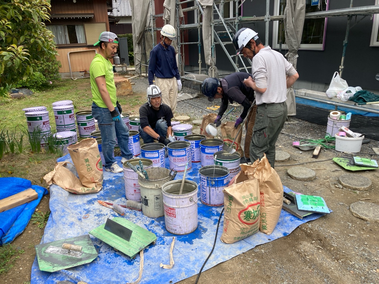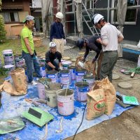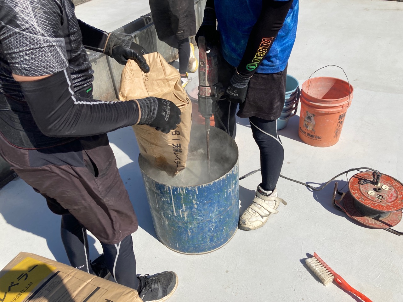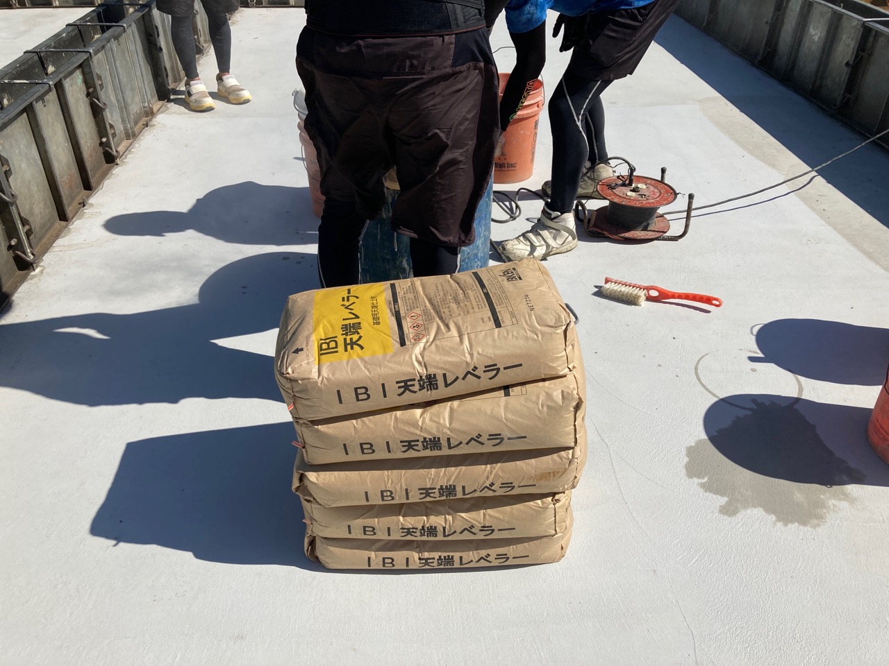 昼休憩の後、セルフレベリング材(レベラー)の打設に取り掛かりました。まずは材料と水を混ぜて攪拌、グレーの色をした生クリームくらいの柔らかさの液体ができあがります。