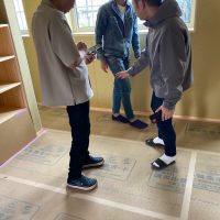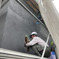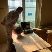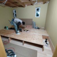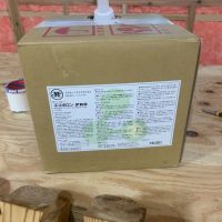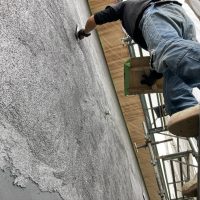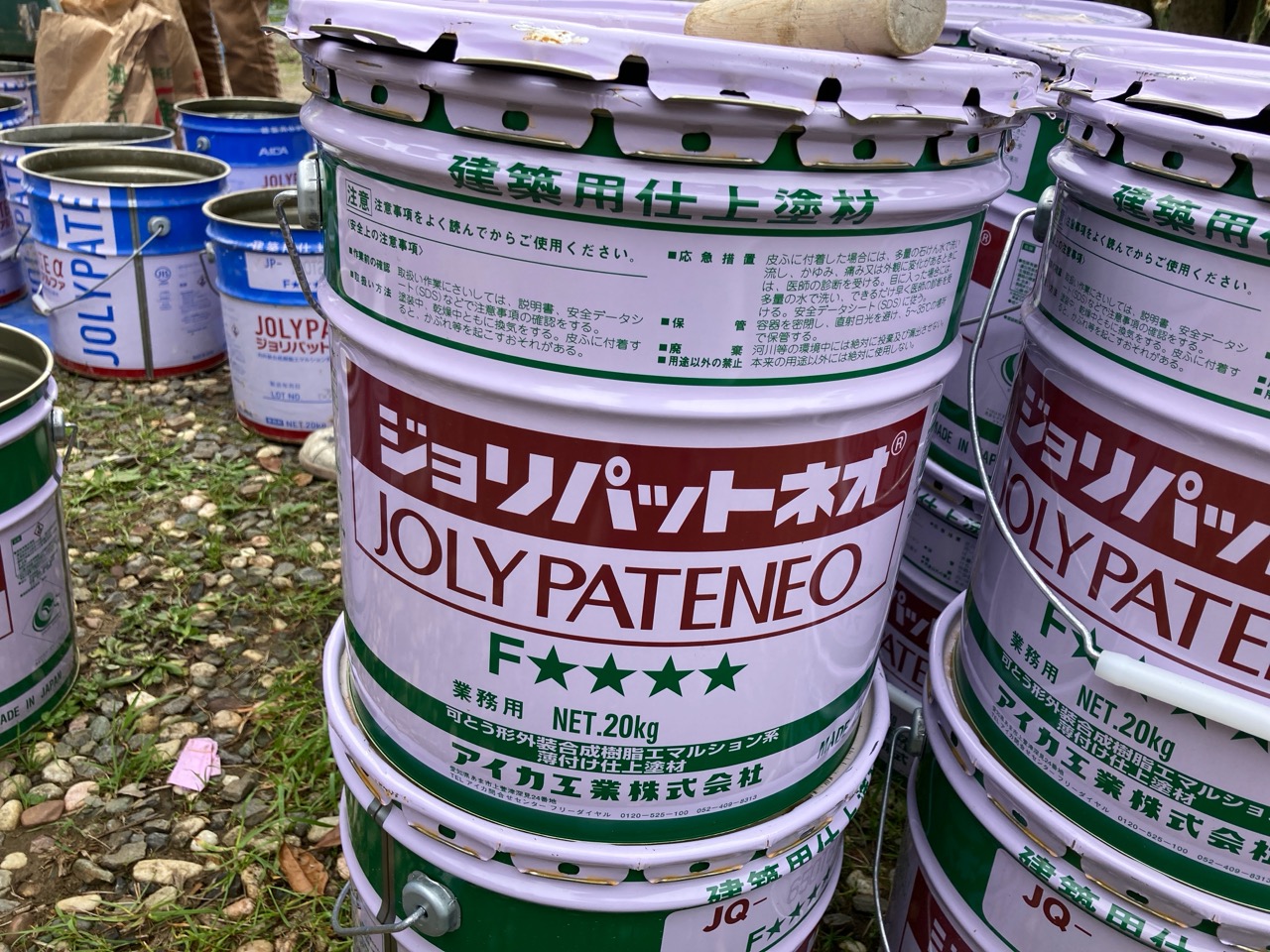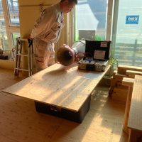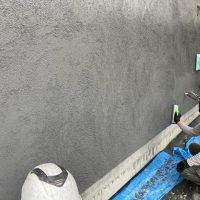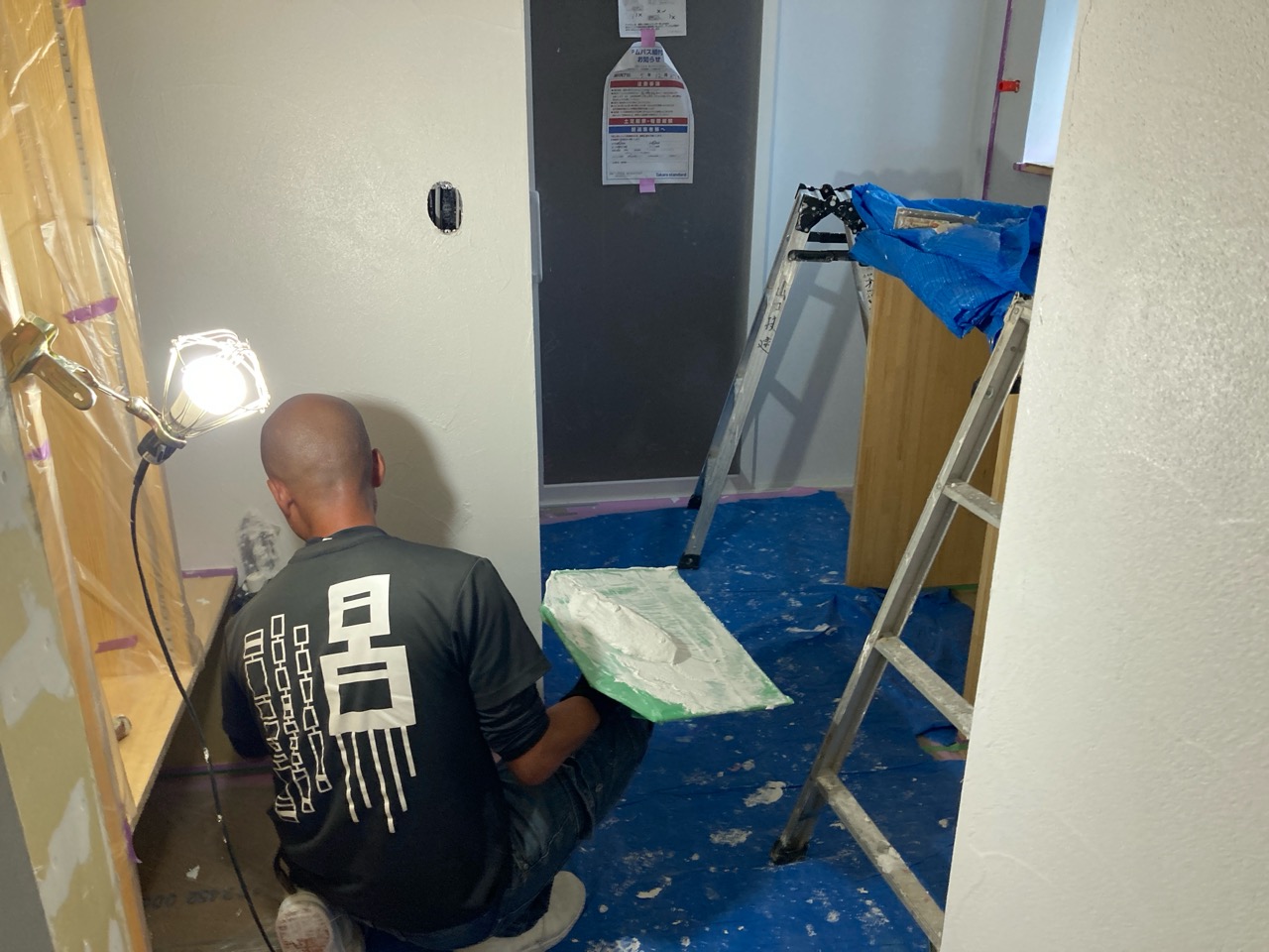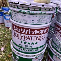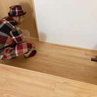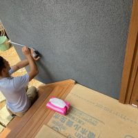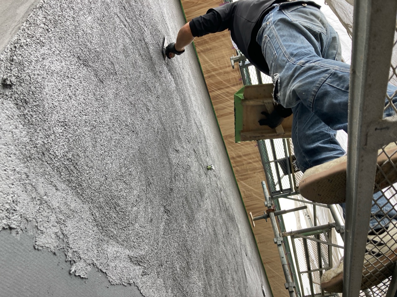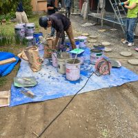 昼休憩の後、セルフレベリング材(レベラー)の打設に取り掛かりました。まずは材料と水を混ぜて攪拌、グレーの色をした生クリームくらいの柔らかさの液体ができあがります。