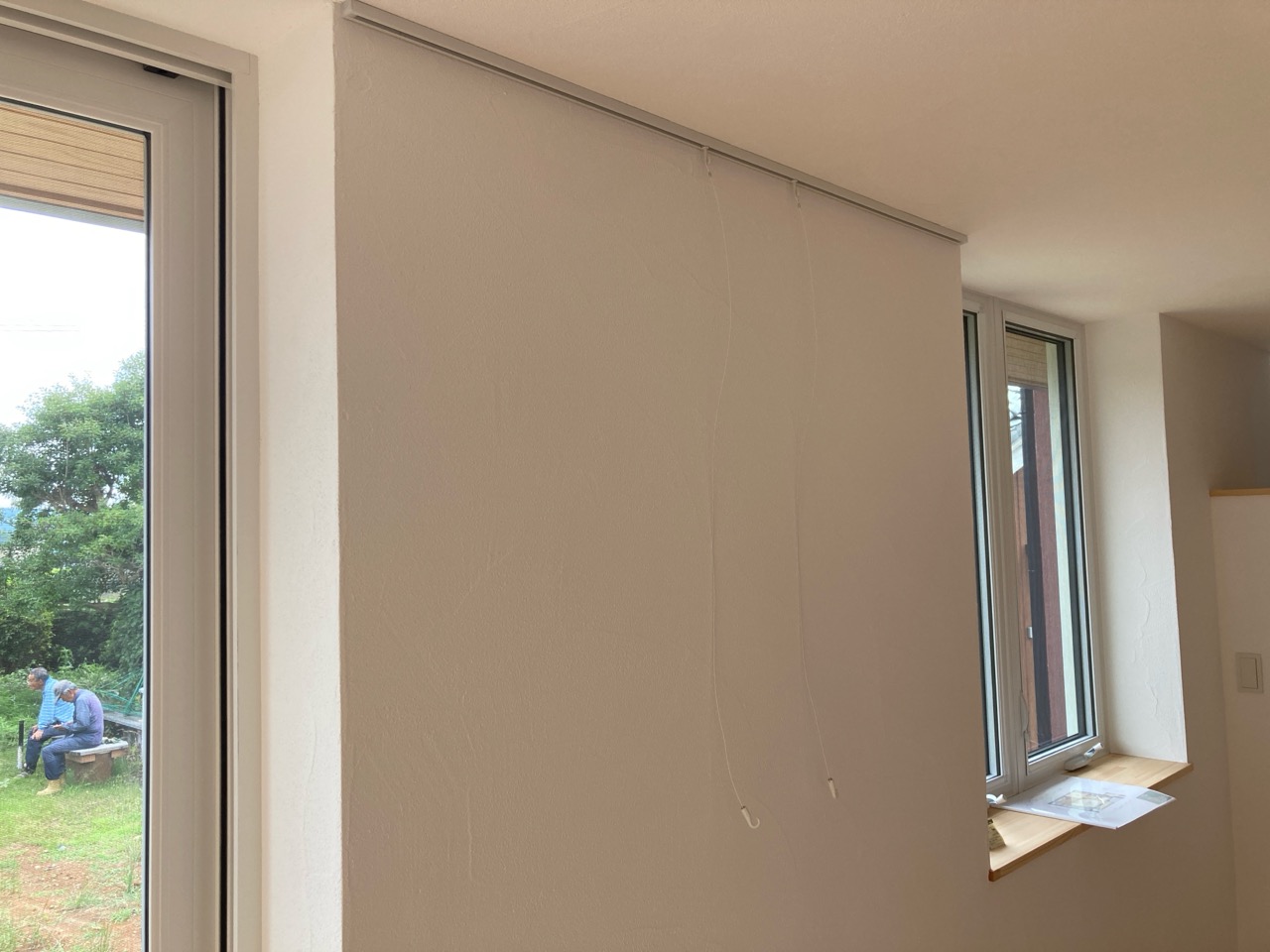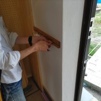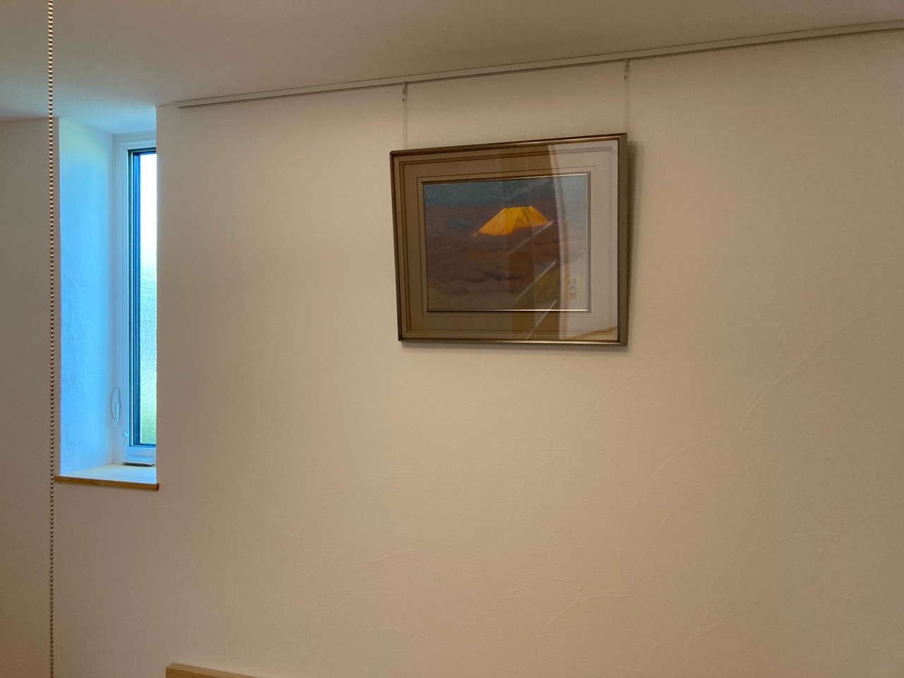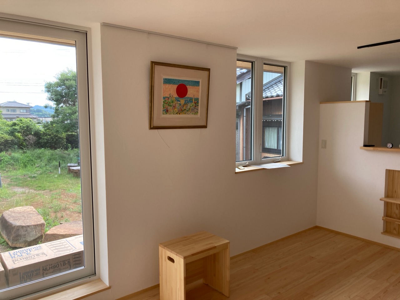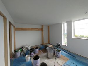 住宅完成、お引渡しも目前に迫った本日は最後の作業として北世帯のピクチャーレールを取付けに来ました。まさか最後の作業が筆者になろうとは。取付後、お母様が以前から飾りたかったという念願の絵画を掛けてみました。漆喰塗りで真っ白な壁に彩を加えてくれるようなアクセントになりました。