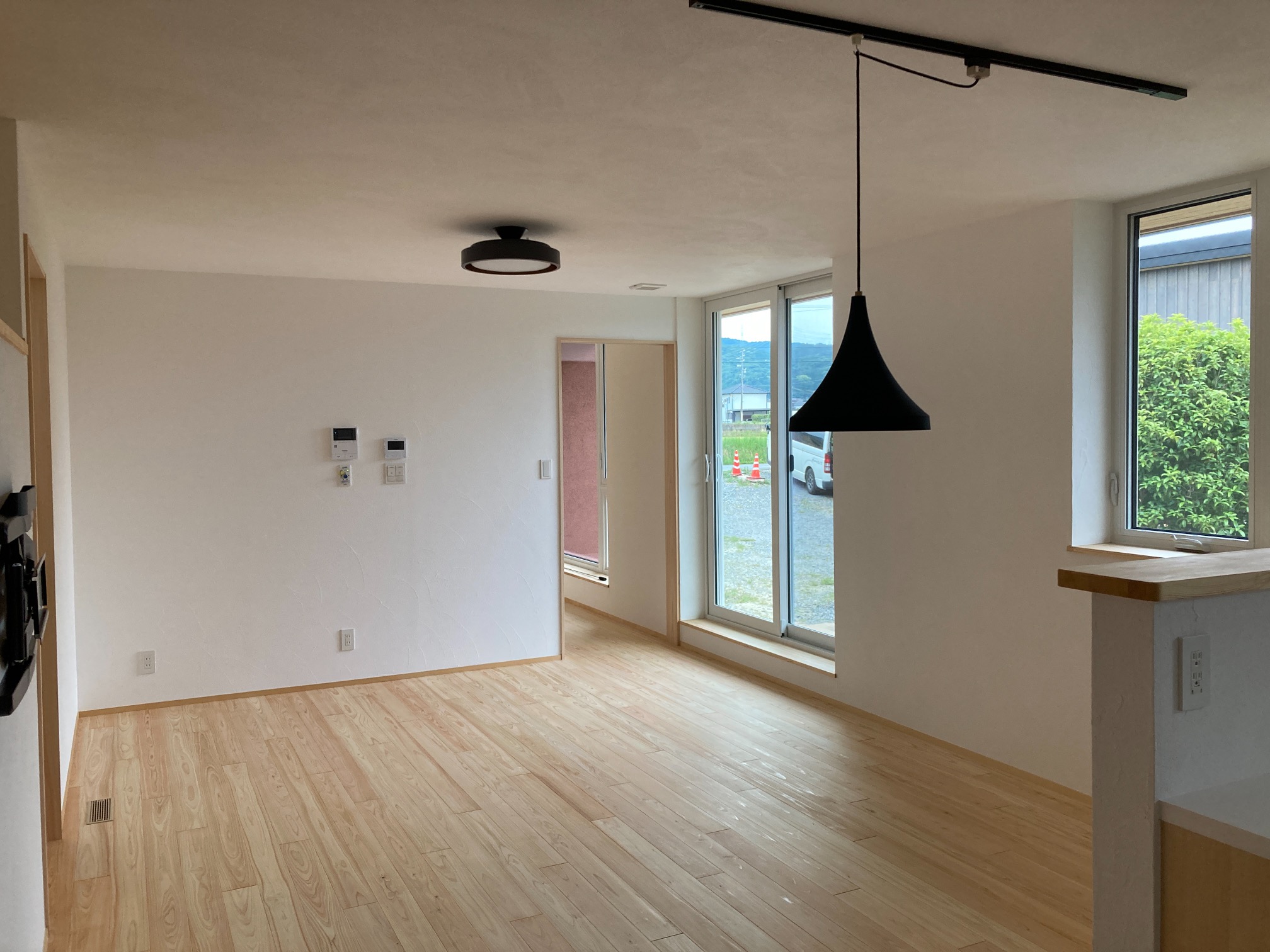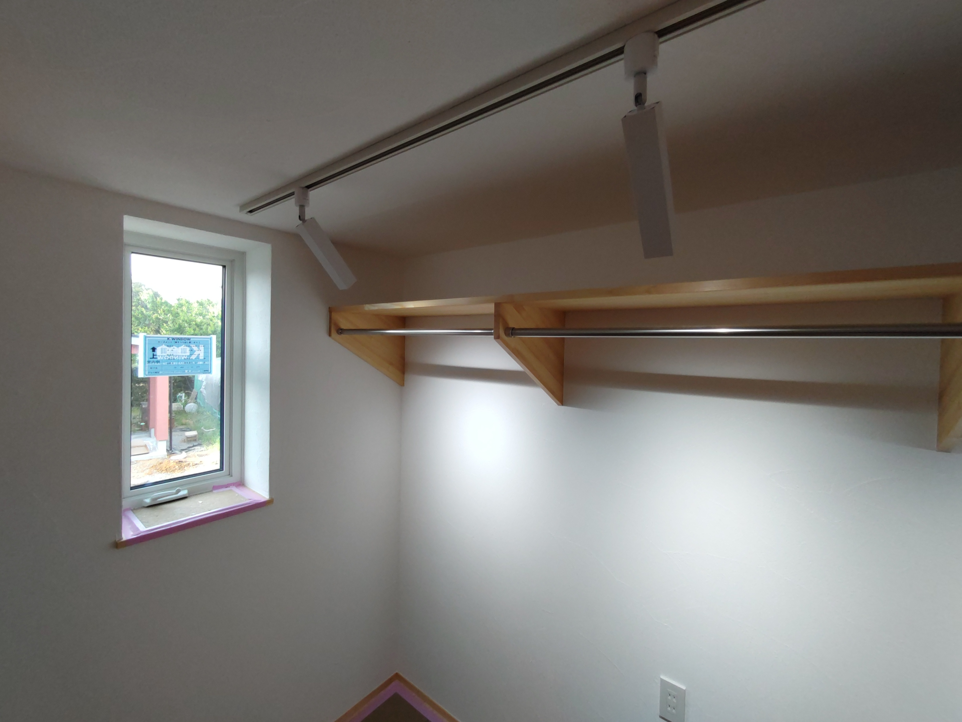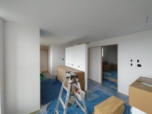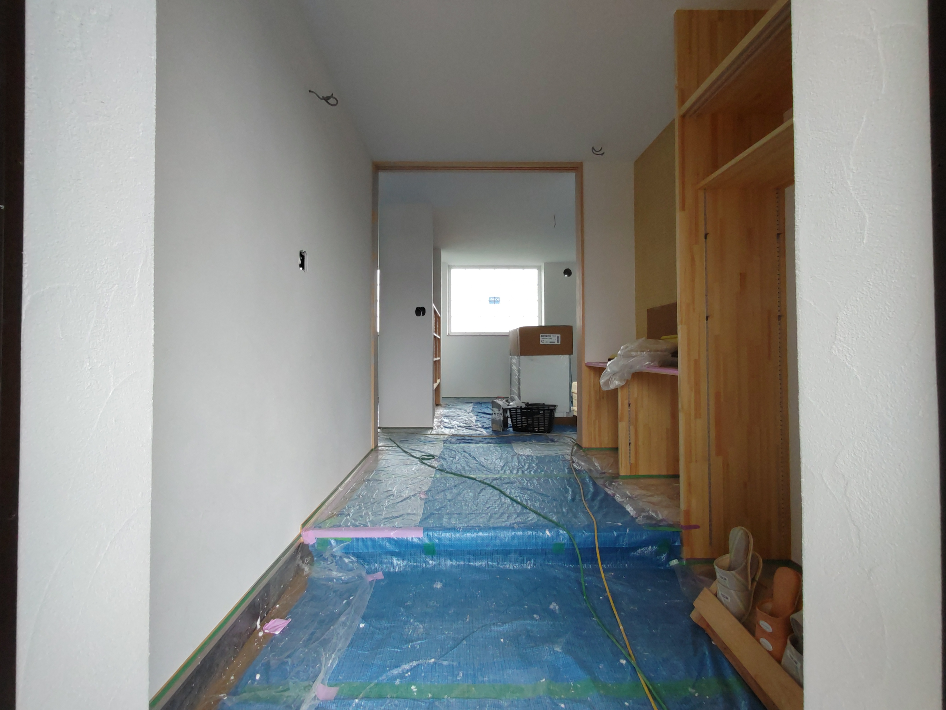 住宅完成、お引渡しも目前に迫った本日は最後の作業として北世帯のピクチャーレールを取付けに来ました。まさか最後の作業が筆者になろうとは。取付後、お母様が以前から飾りたかったという念願の絵画を掛けてみました。漆喰塗りで真っ白な壁に彩を加えてくれるようなアクセントになりました。