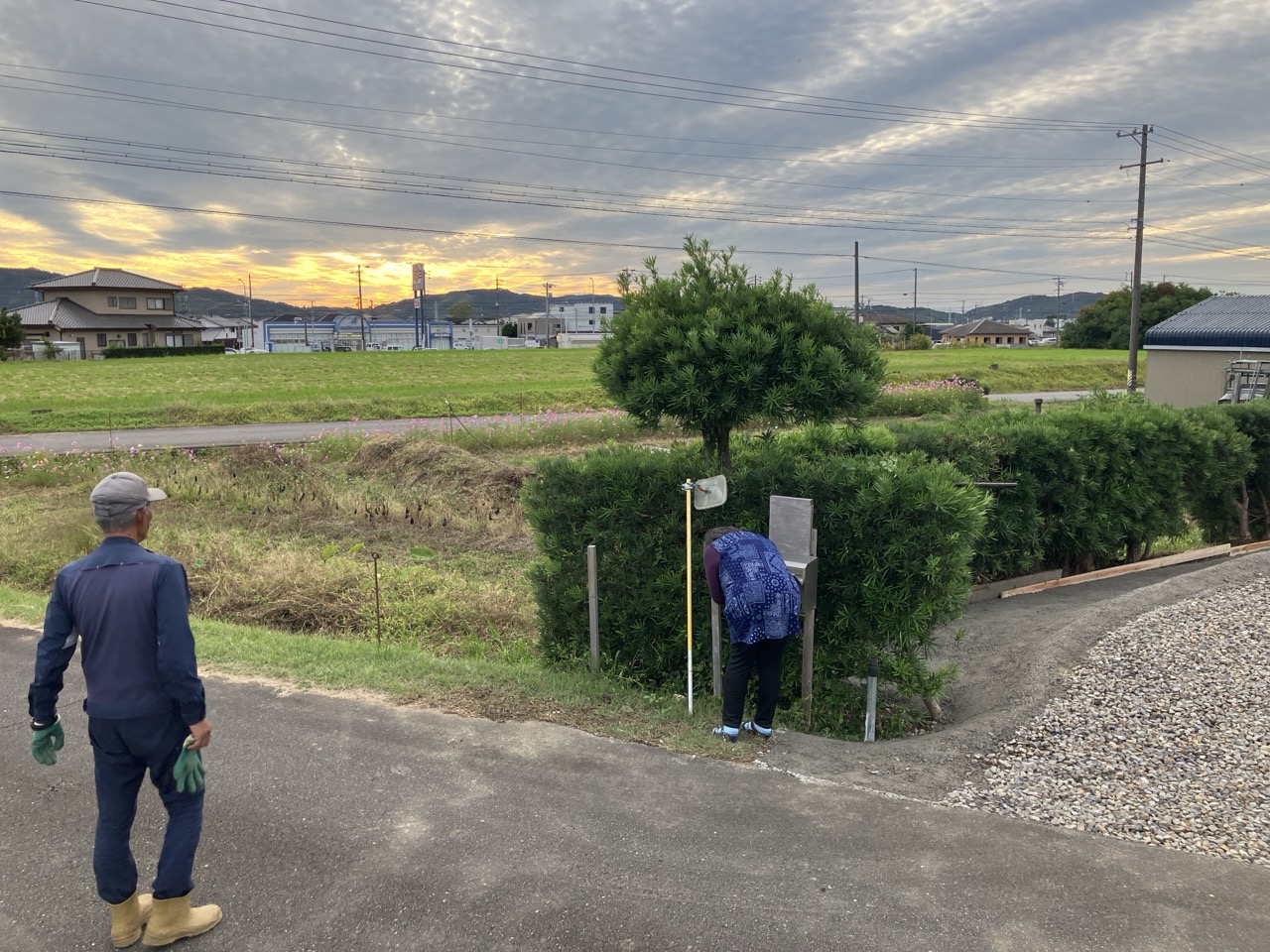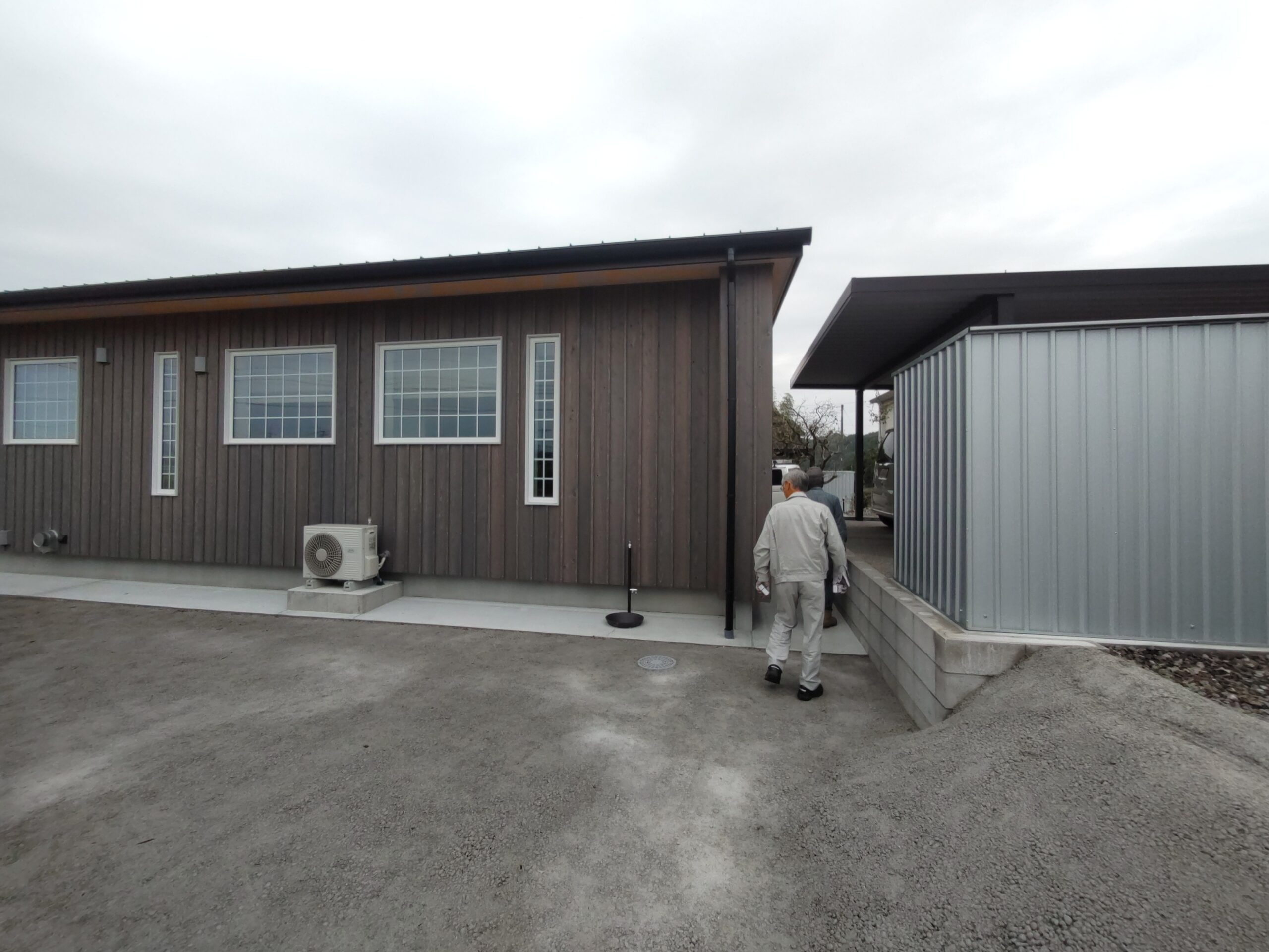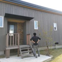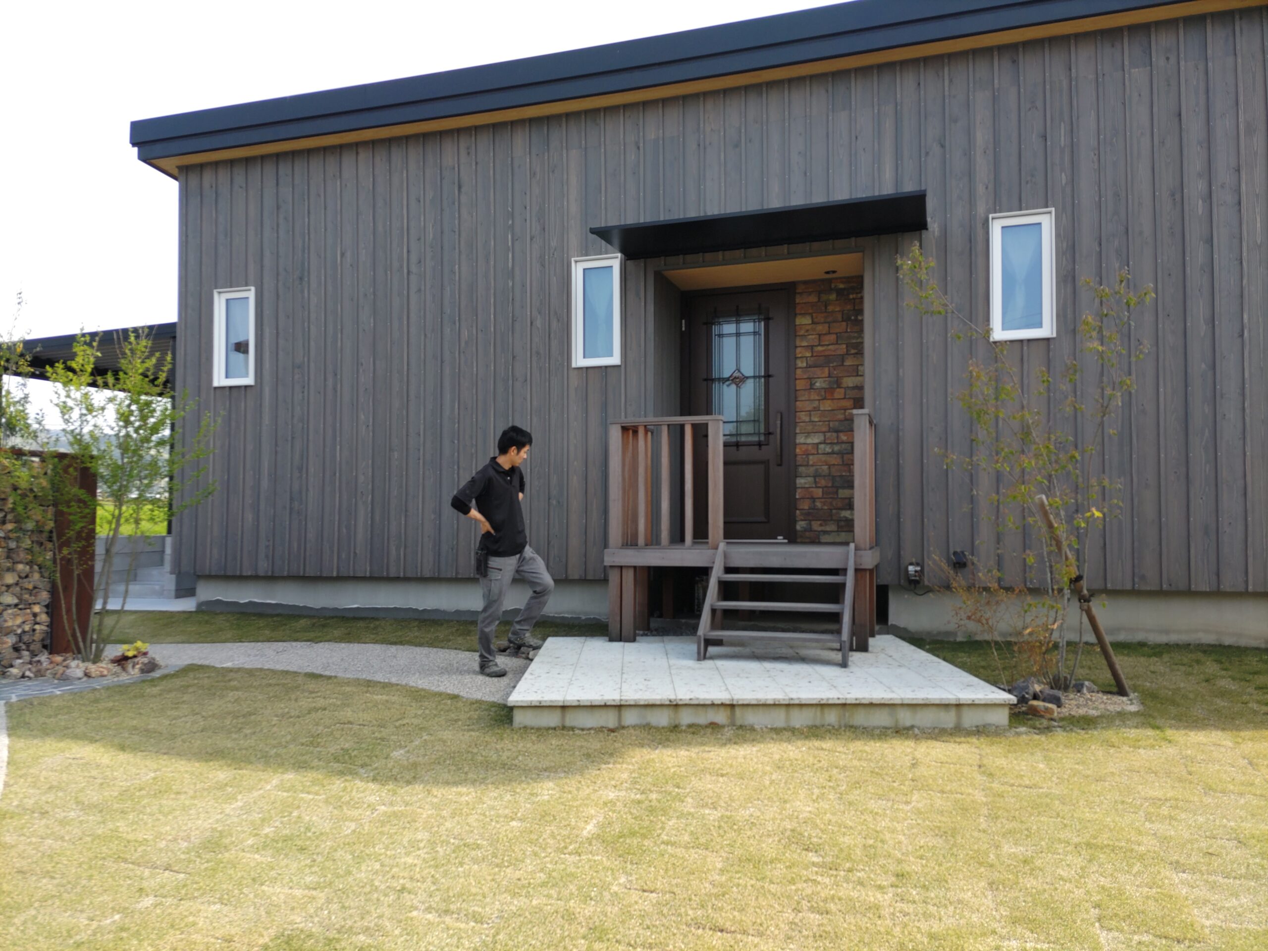 棟梁は外構工事まで終わった現場を初めて確認します。自分が丹精込めた仕事のその後の状態を見つめる漢の背中・・画になるねぇ。 s様邸はここから近いのでお父様も時々見に来られるとの事。まだ1年しか経っていませんが、工事中は関係者全員にとって非常に濃密な時間だった事もあり思い出話にも花が咲きそうです。