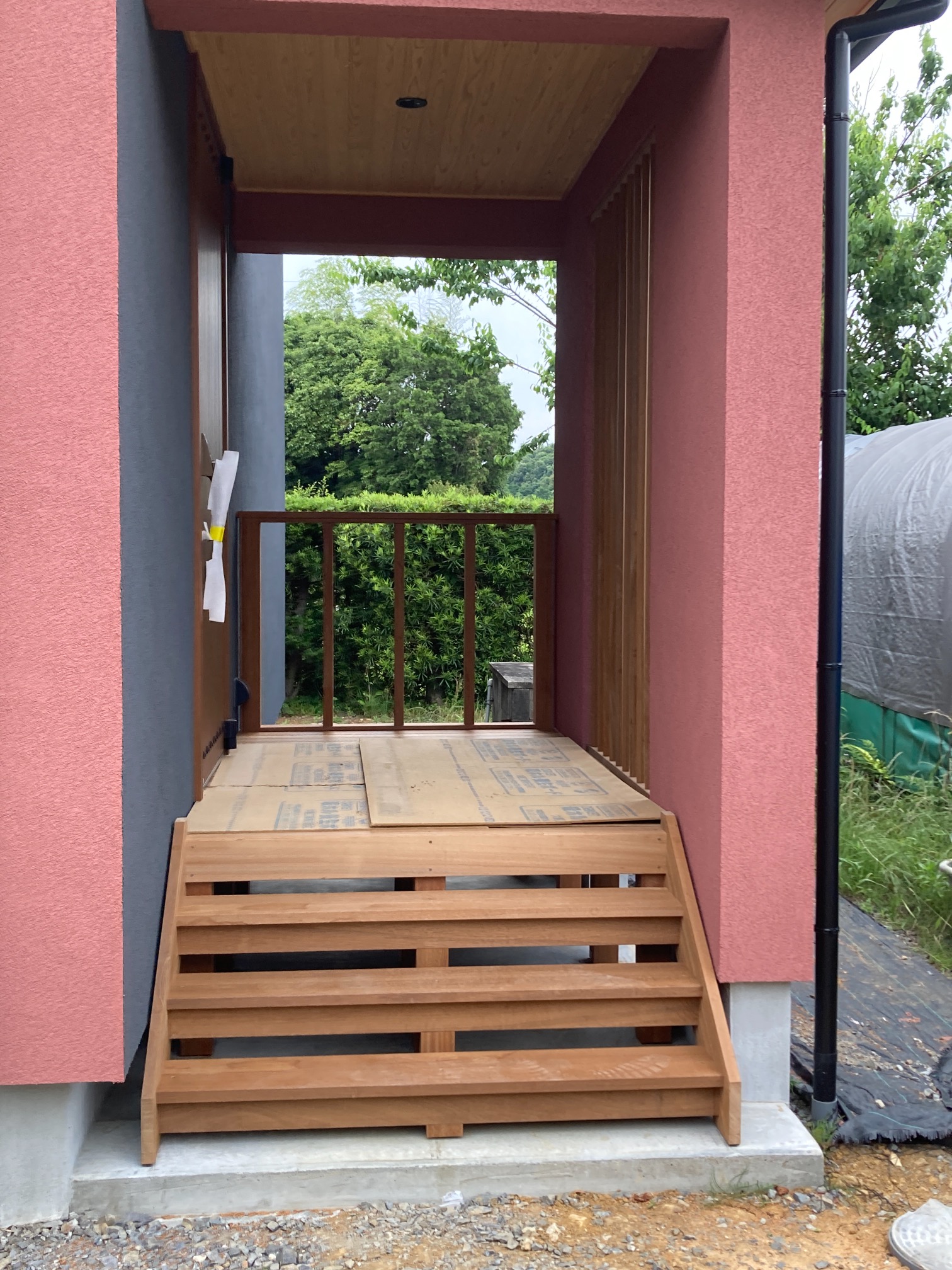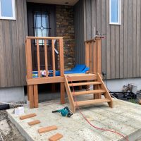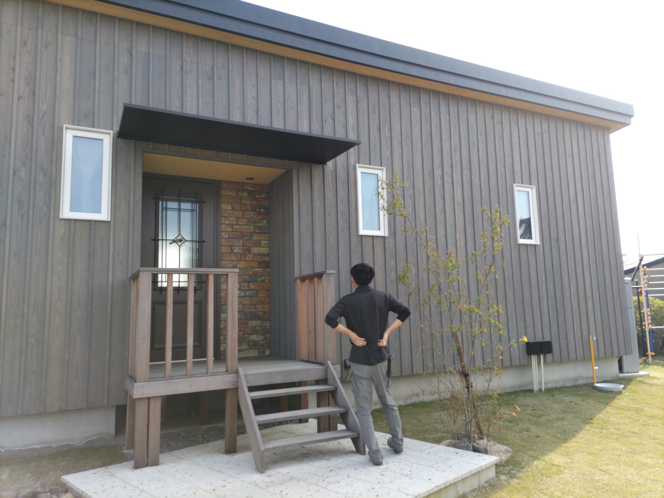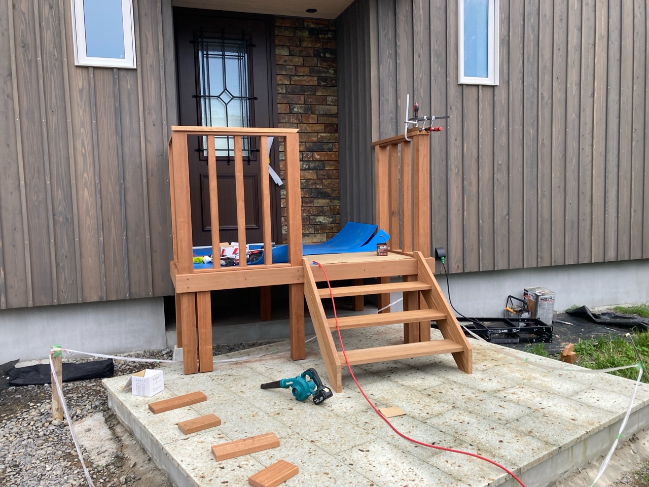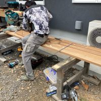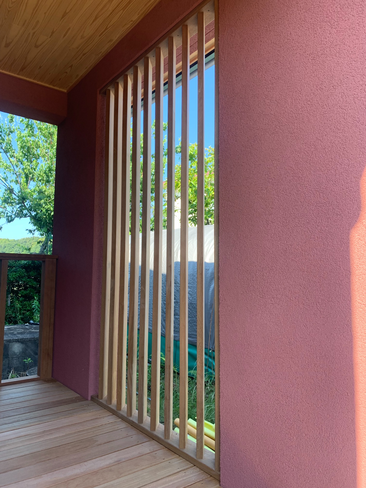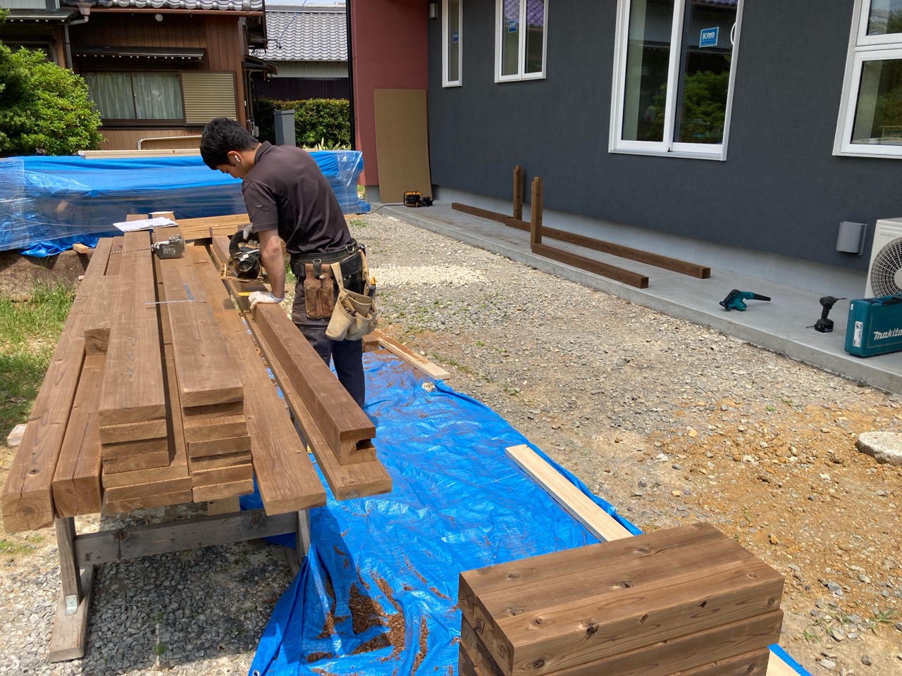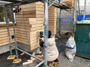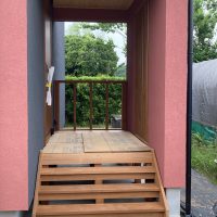 玄関ポーチも南世帯同様、セランカンバツ材でのデッキが完了しました。玄関ドアの正面は目隠しをするべくルーバーを設置していますが、羽を1本ずつ取付けるのではなく上下の桟を組んでから建て起こします。非常に重量がある材料のため、k保木棟梁が一人では持ち上げられなかったところまたまたお父様に手伝っていただいたそうです。お力添えありがとうございます。