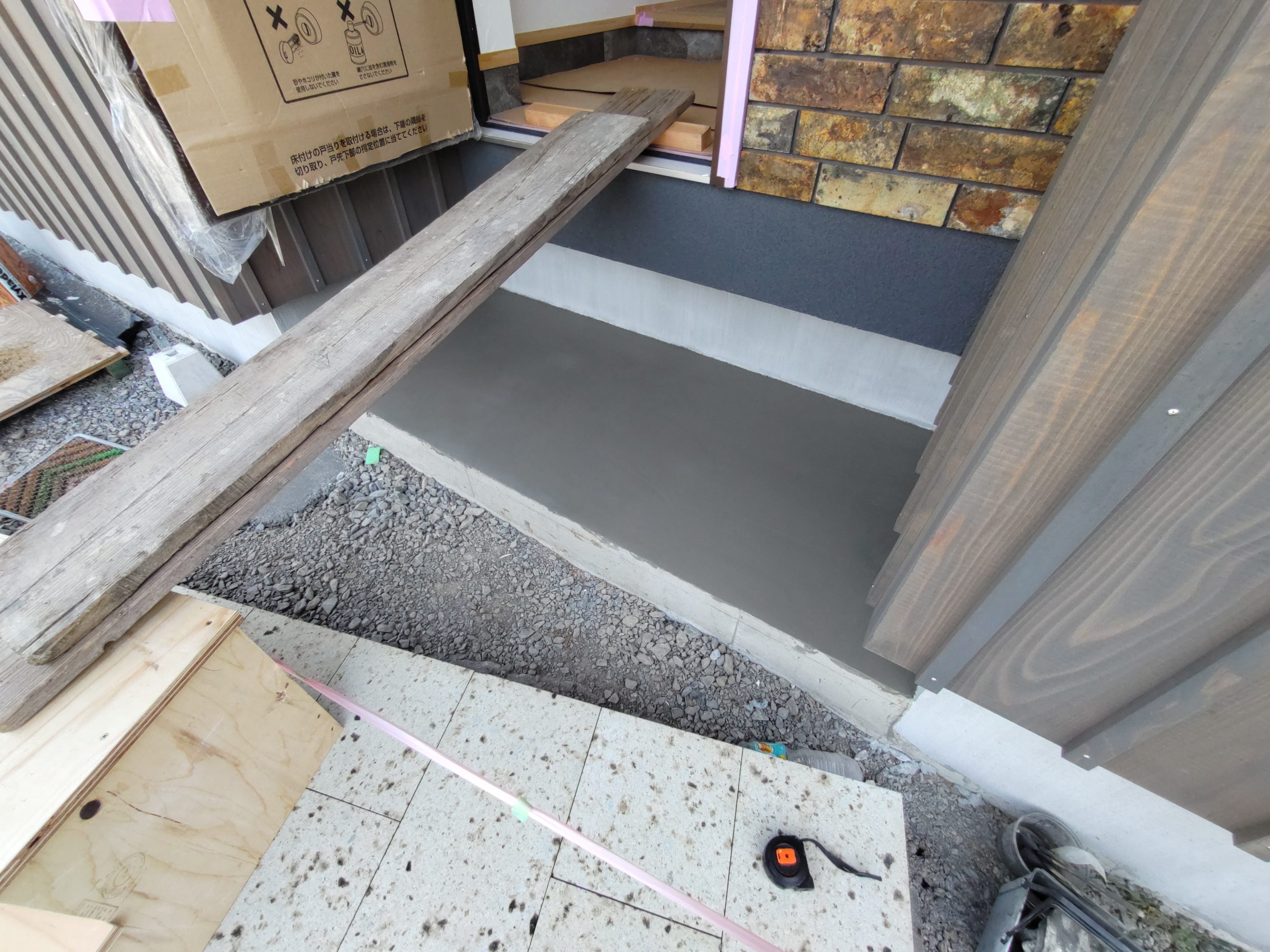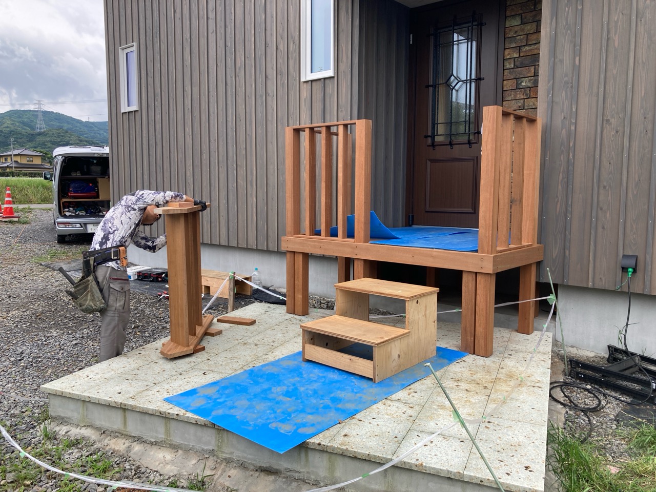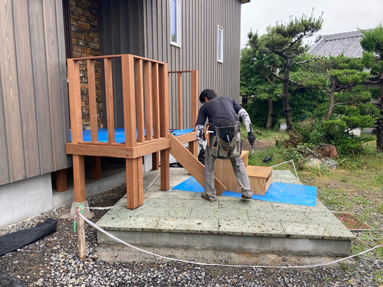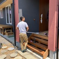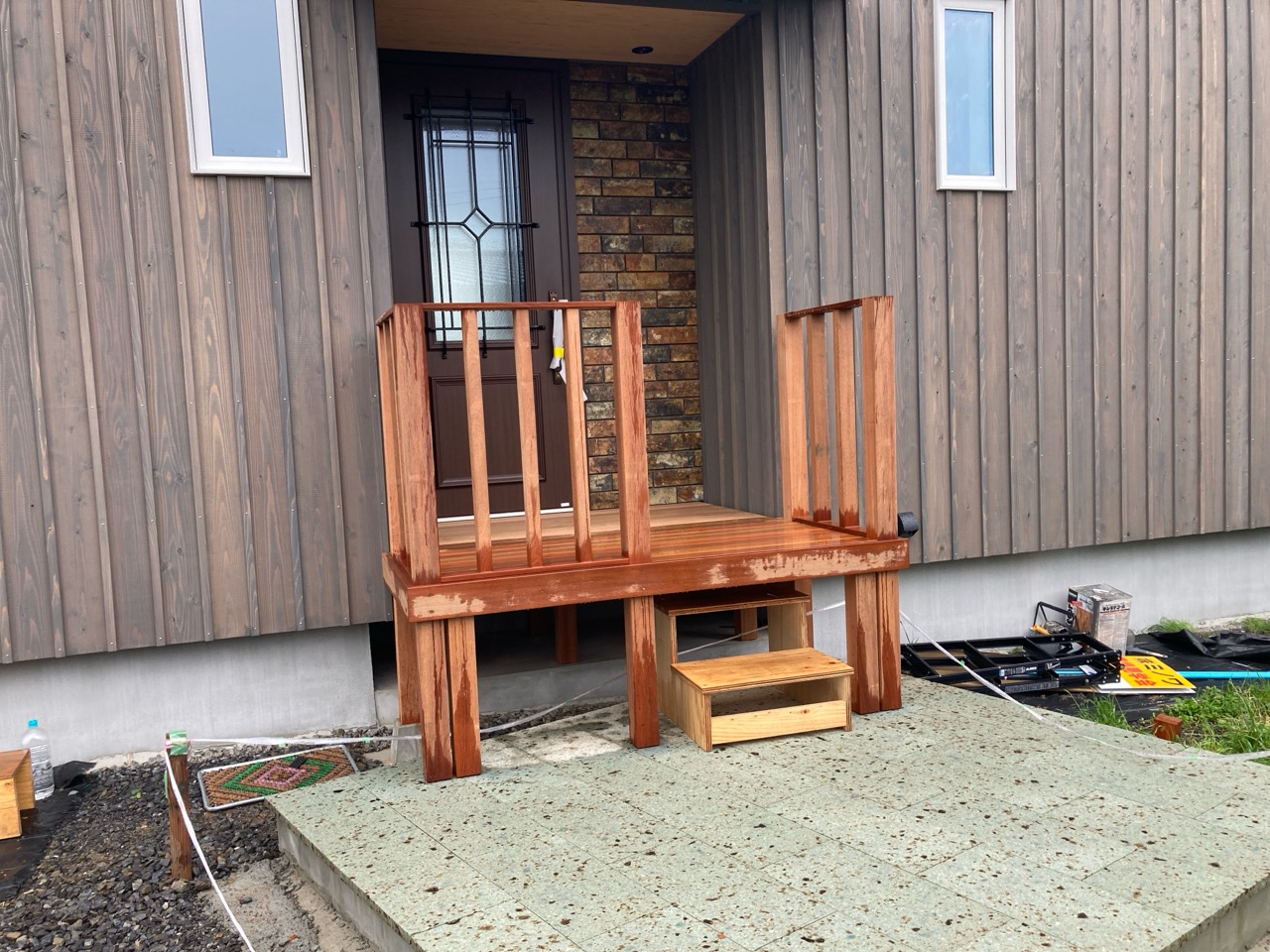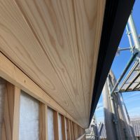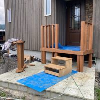 玄関ポーチも南世帯同様、セランカンバツ材でのデッキが完了しました。玄関ドアの正面は目隠しをするべくルーバーを設置していますが、羽を1本ずつ取付けるのではなく上下の桟を組んでから建て起こします。非常に重量がある材料のため、k保木棟梁が一人では持ち上げられなかったところまたまたお父様に手伝っていただいたそうです。お力添えありがとうございます。