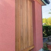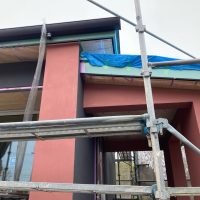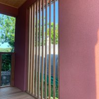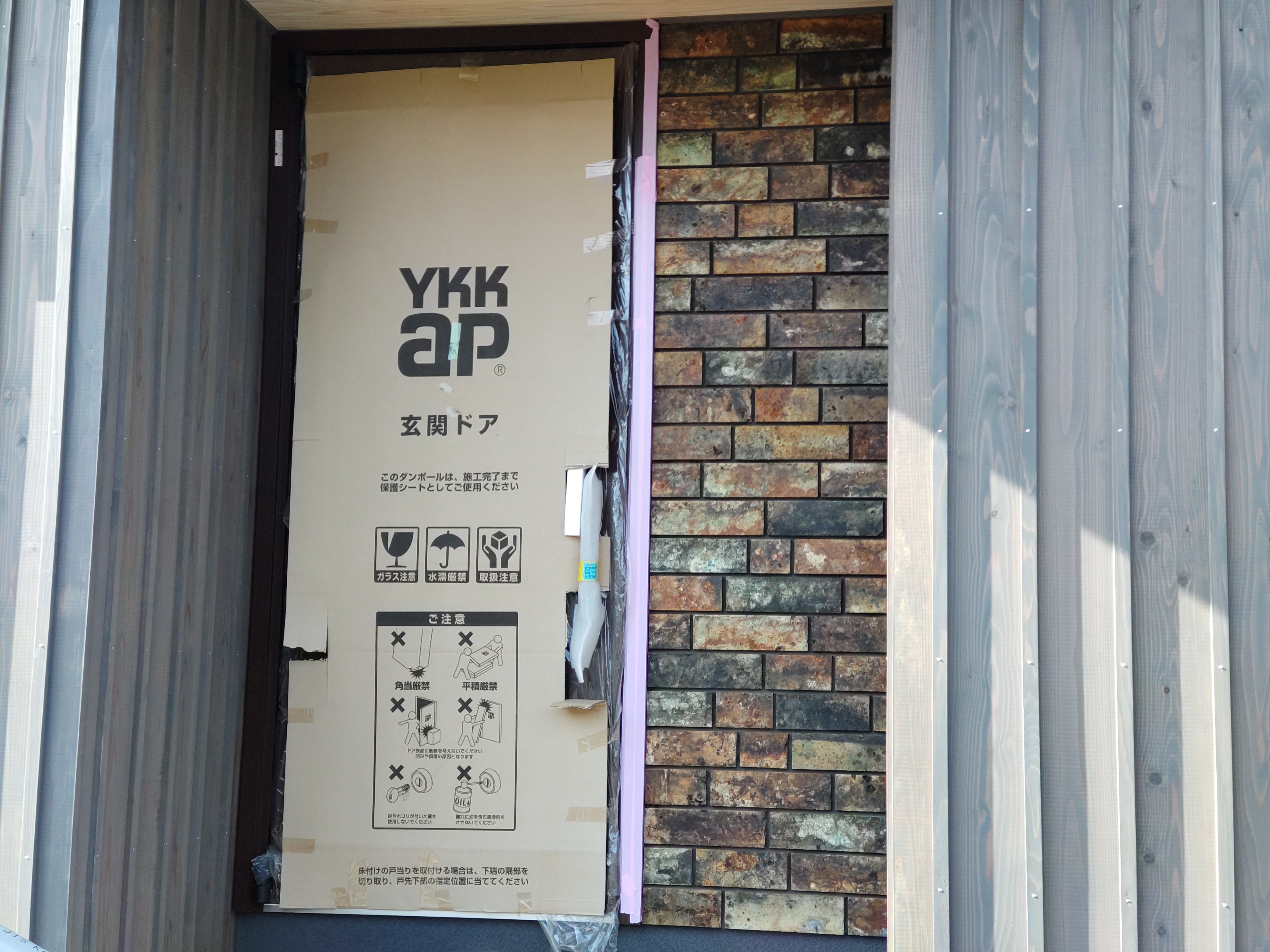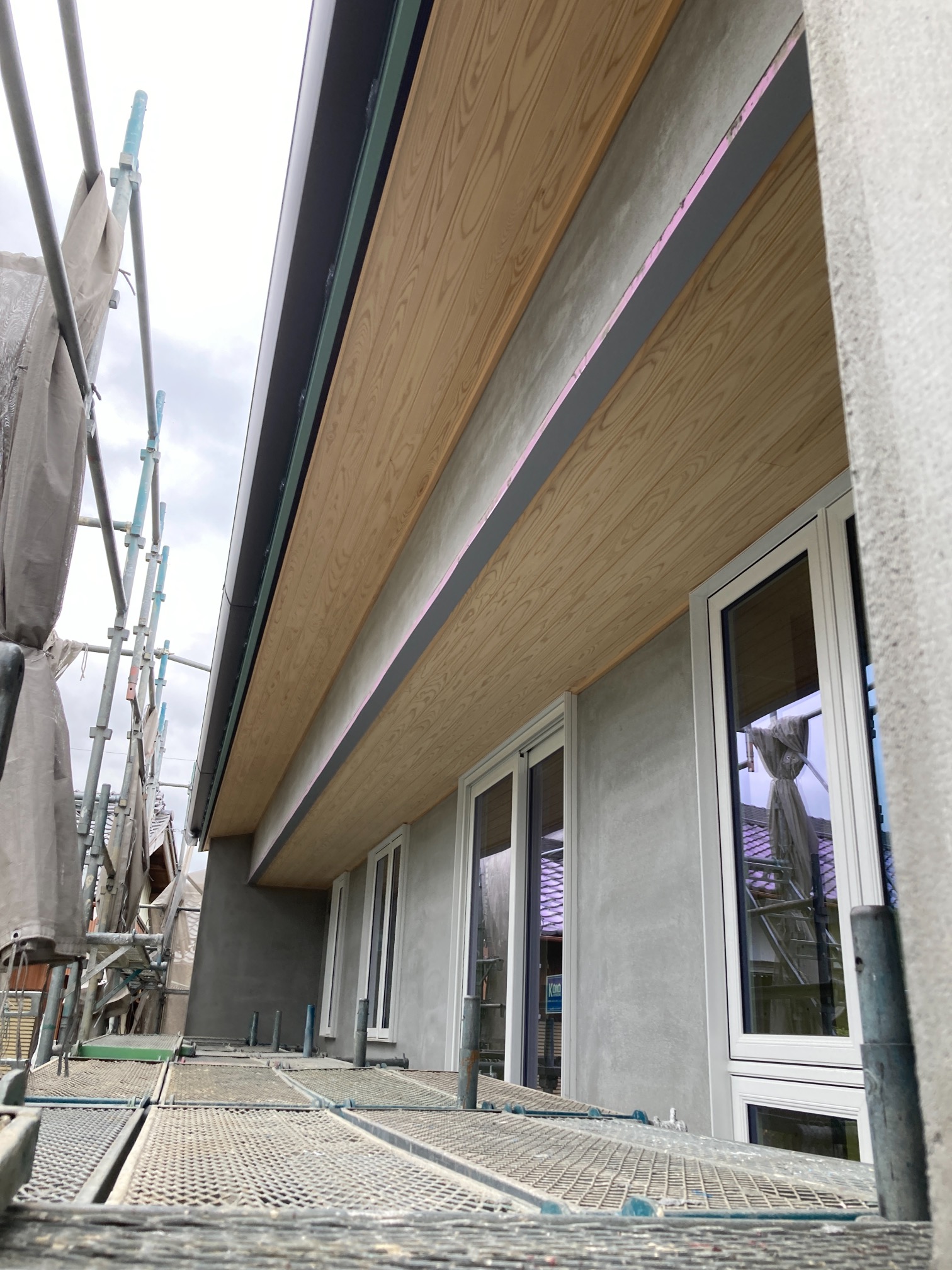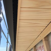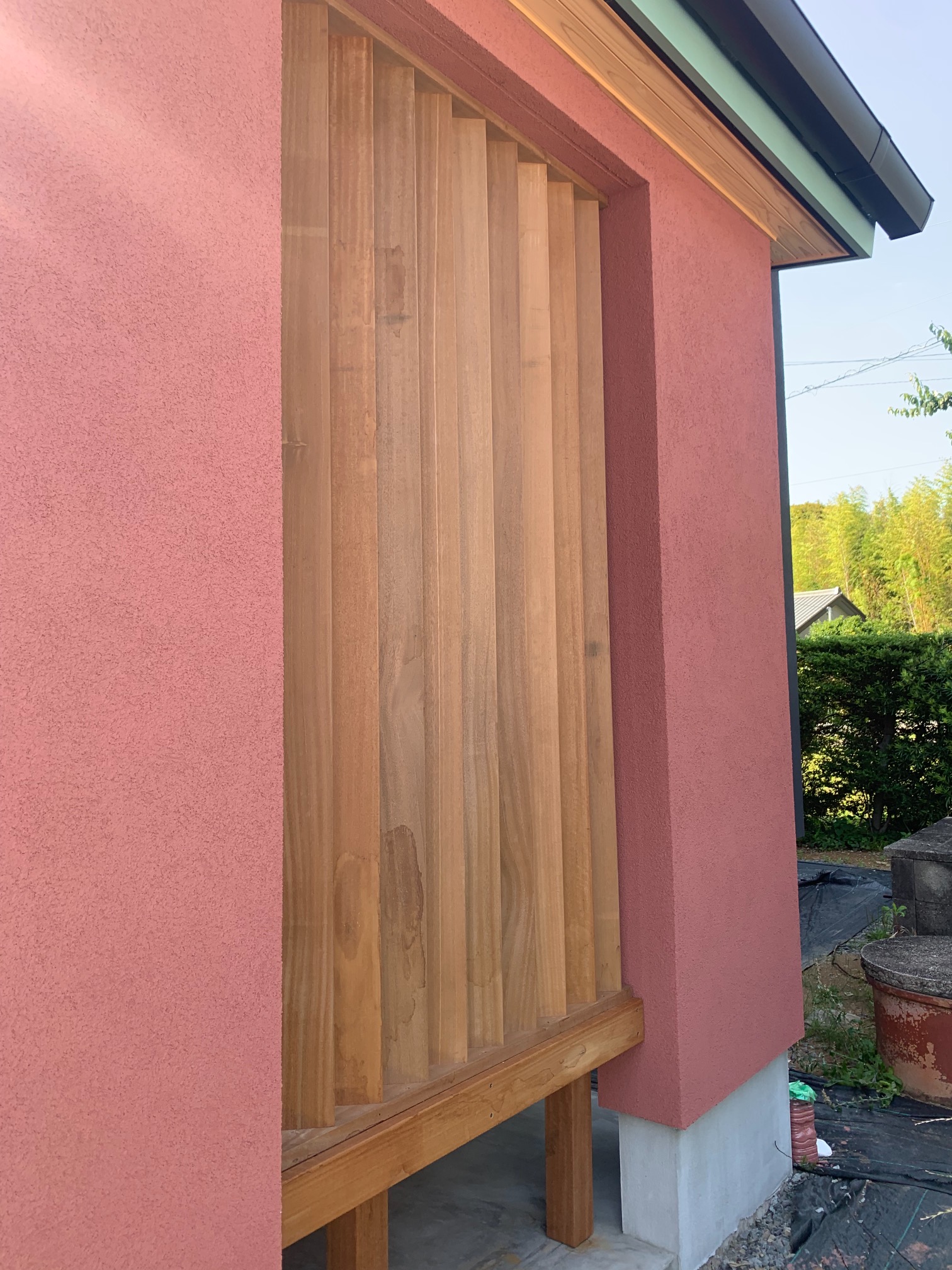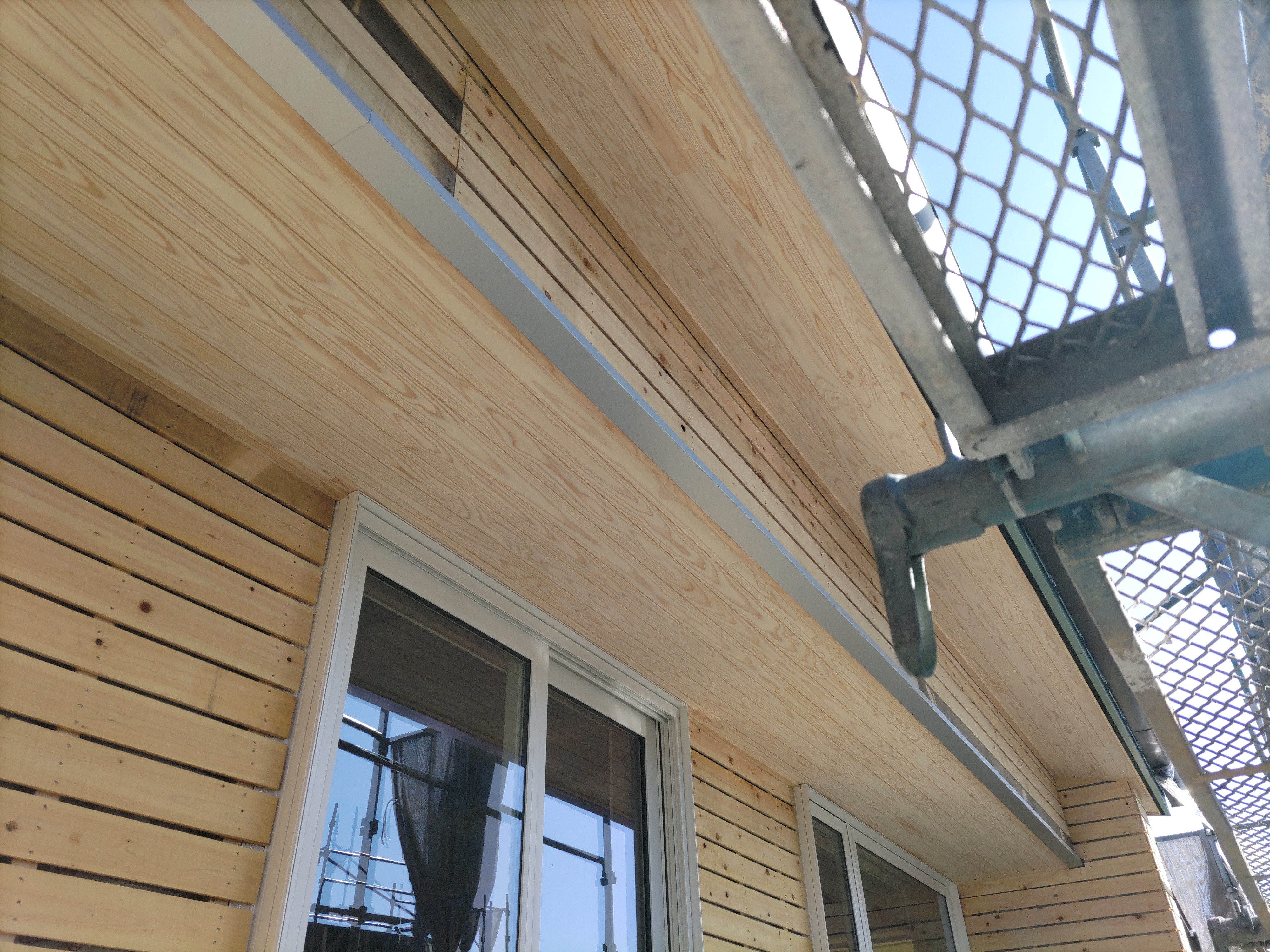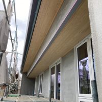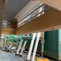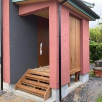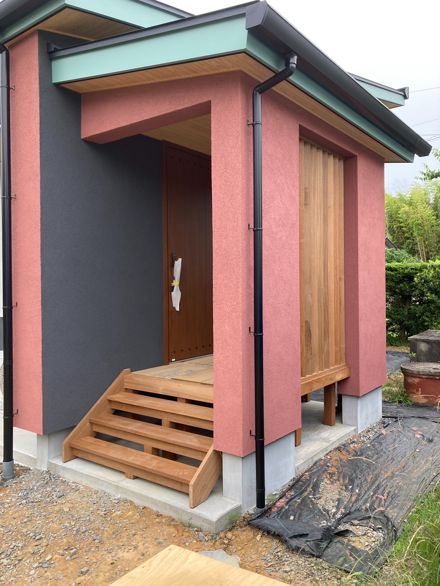 玄関ポーチも南世帯同様、セランカンバツ材でのデッキが完了しました。玄関ドアの正面は目隠しをするべくルーバーを設置していますが、羽を1本ずつ取付けるのではなく上下の桟を組んでから建て起こします。非常に重量がある材料のため、k保木棟梁が一人では持ち上げられなかったところまたまたお父様に手伝っていただいたそうです。お力添えありがとうございます。