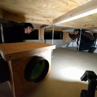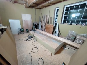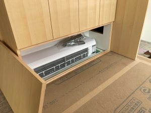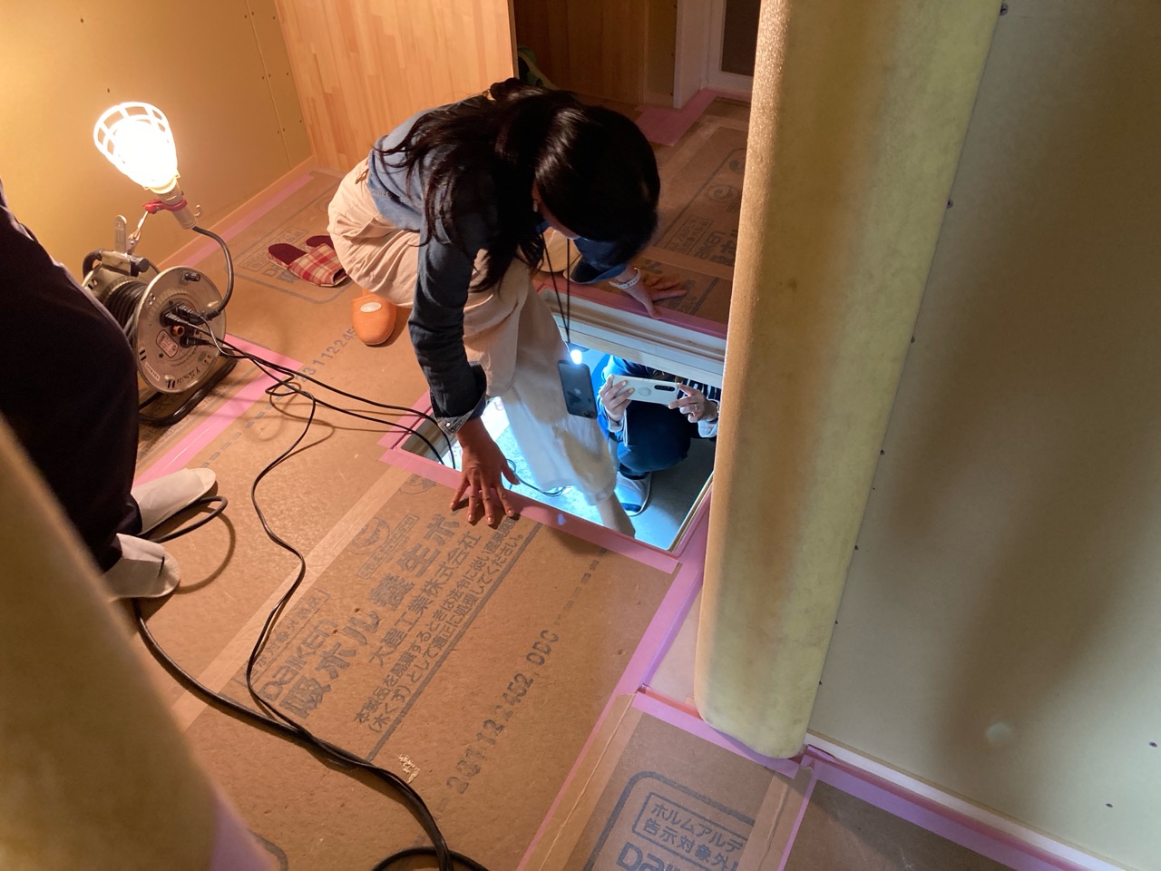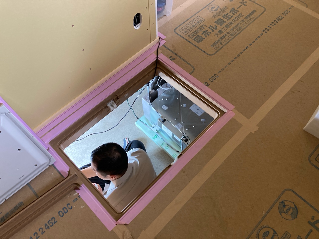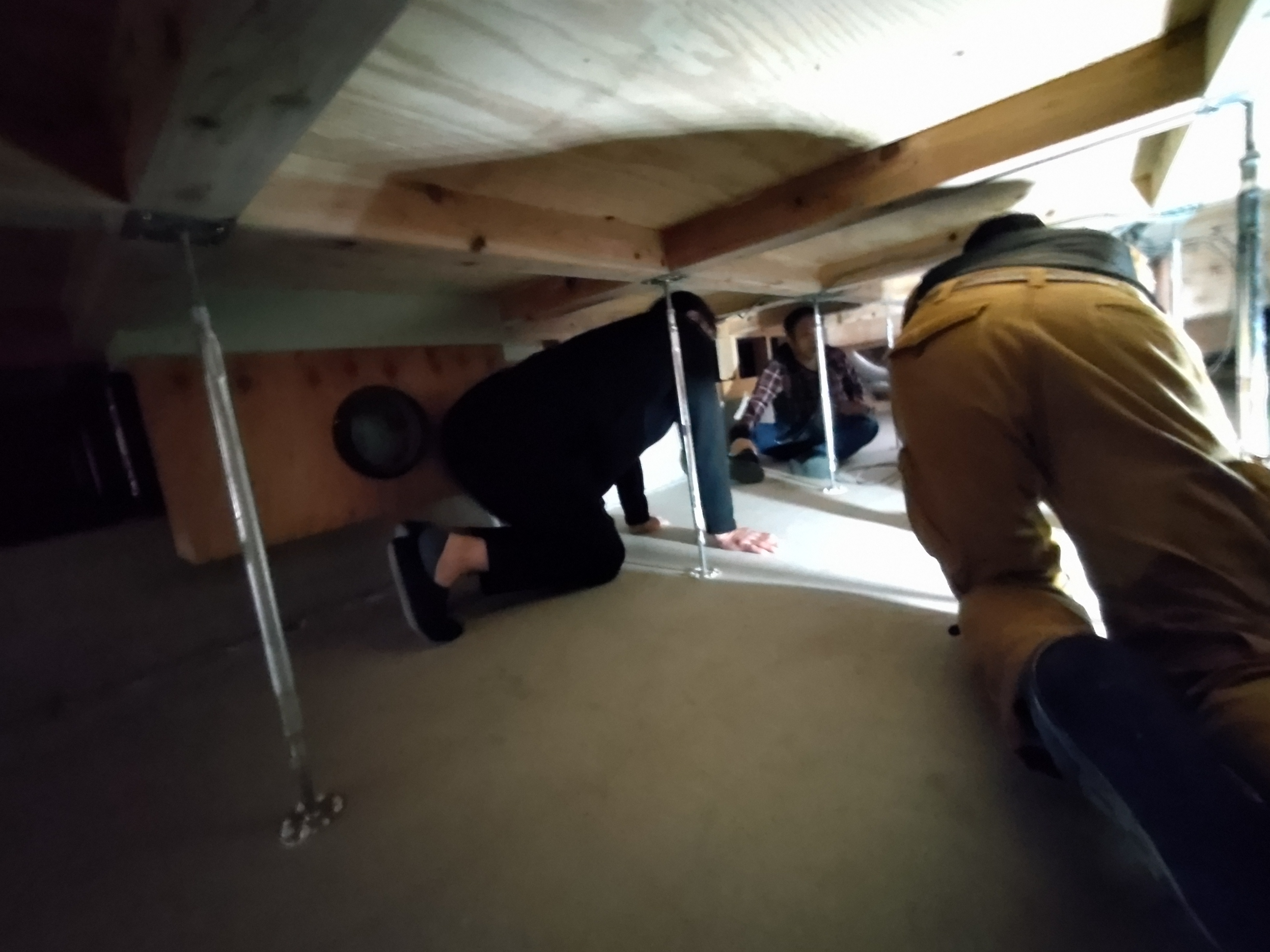 家具の中や床下に仕込まれているシステムの最終チェック。異常が無いか点検に潜ります。