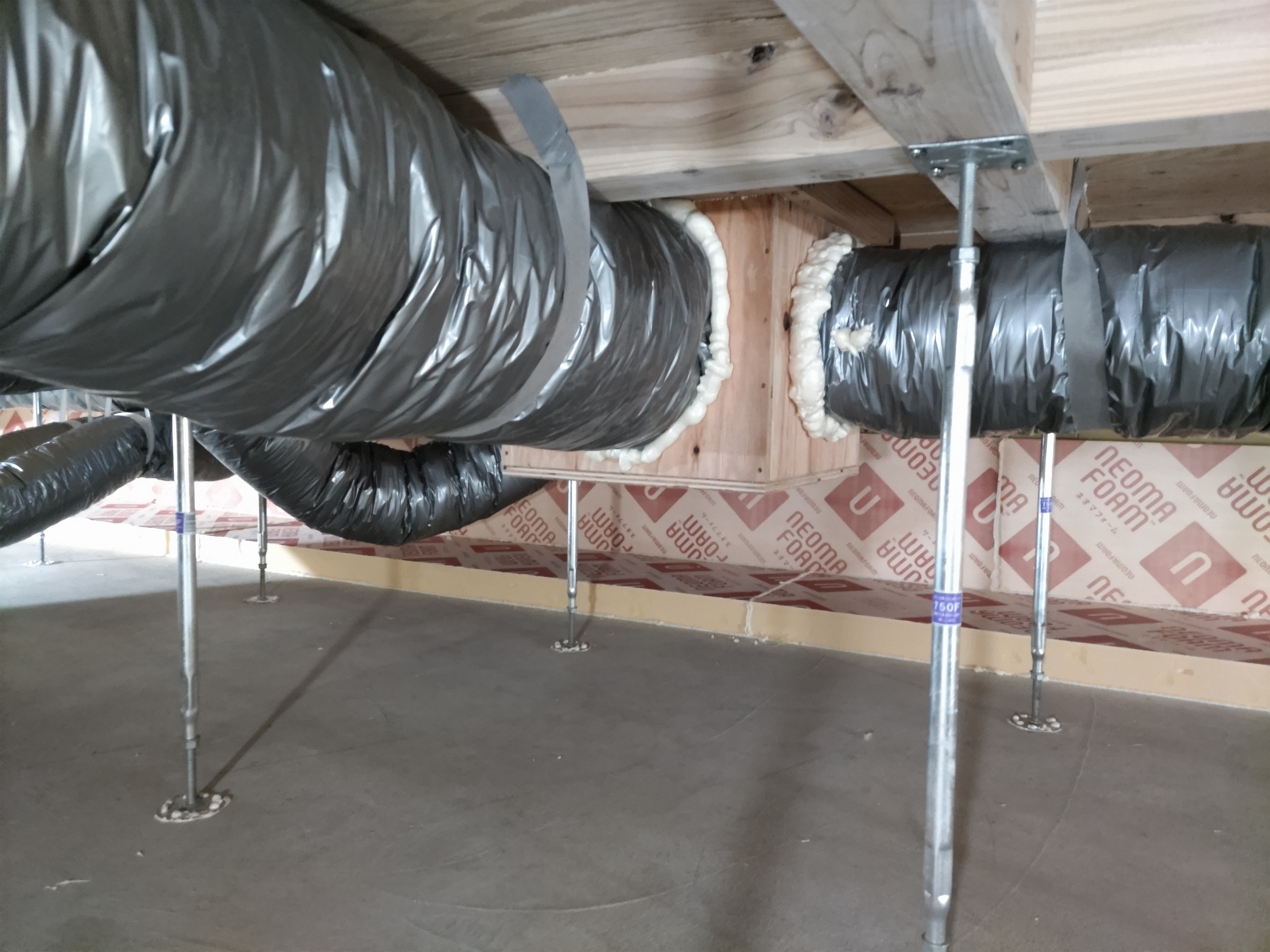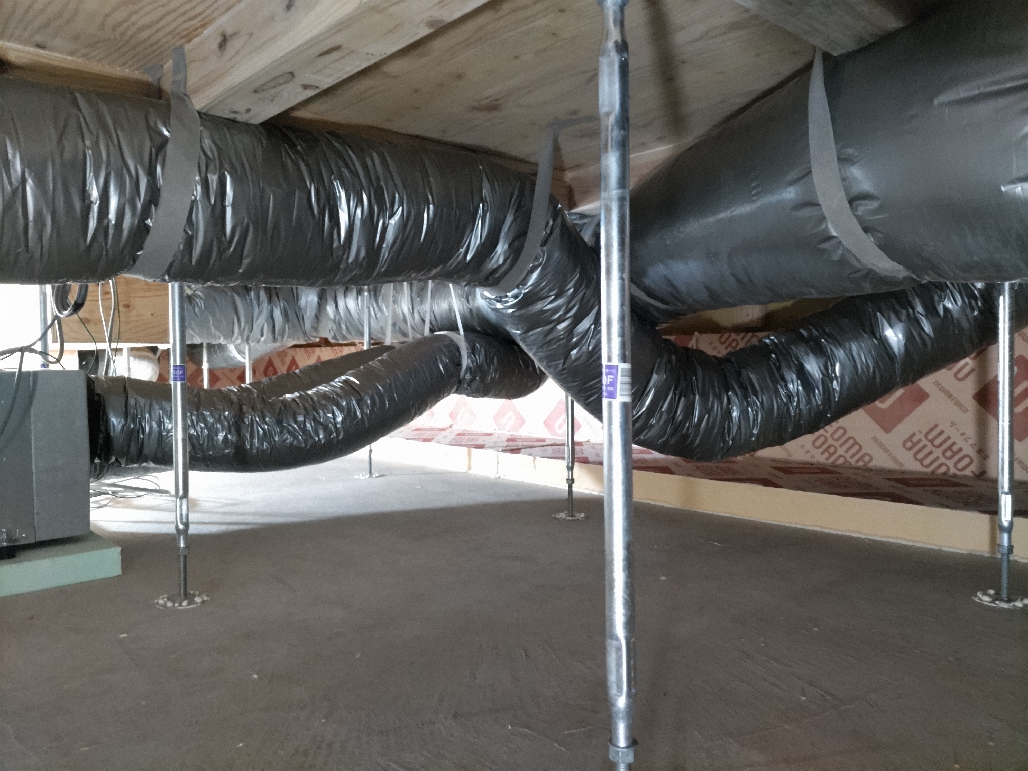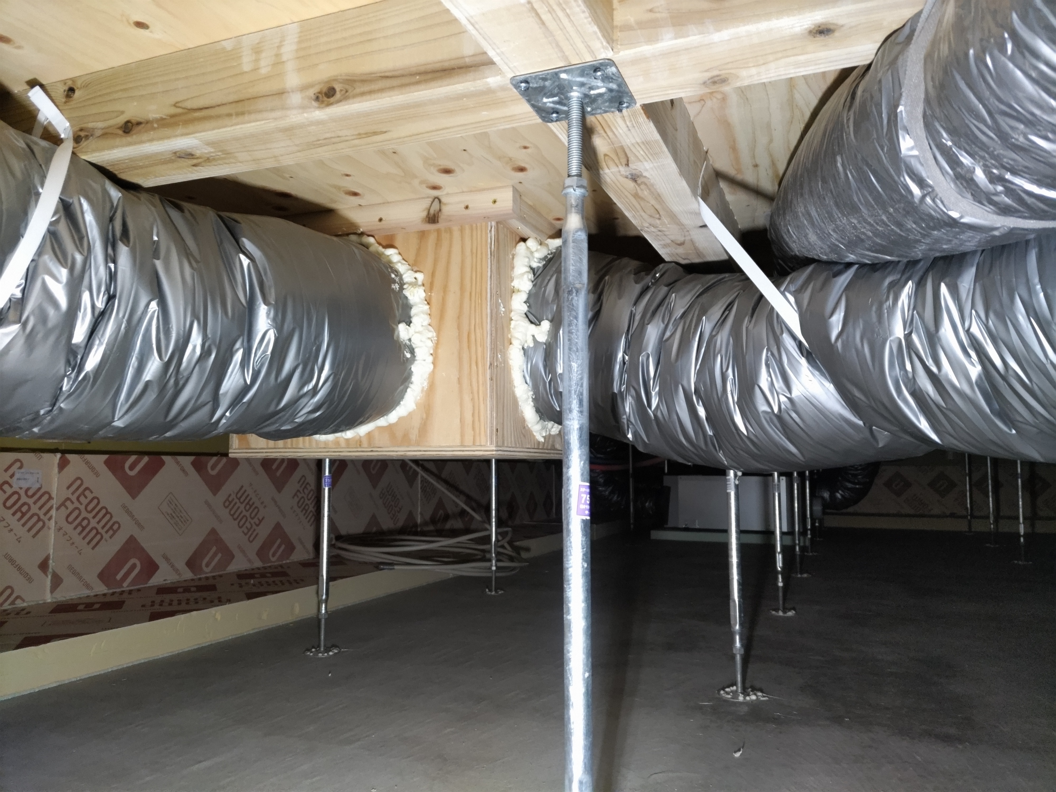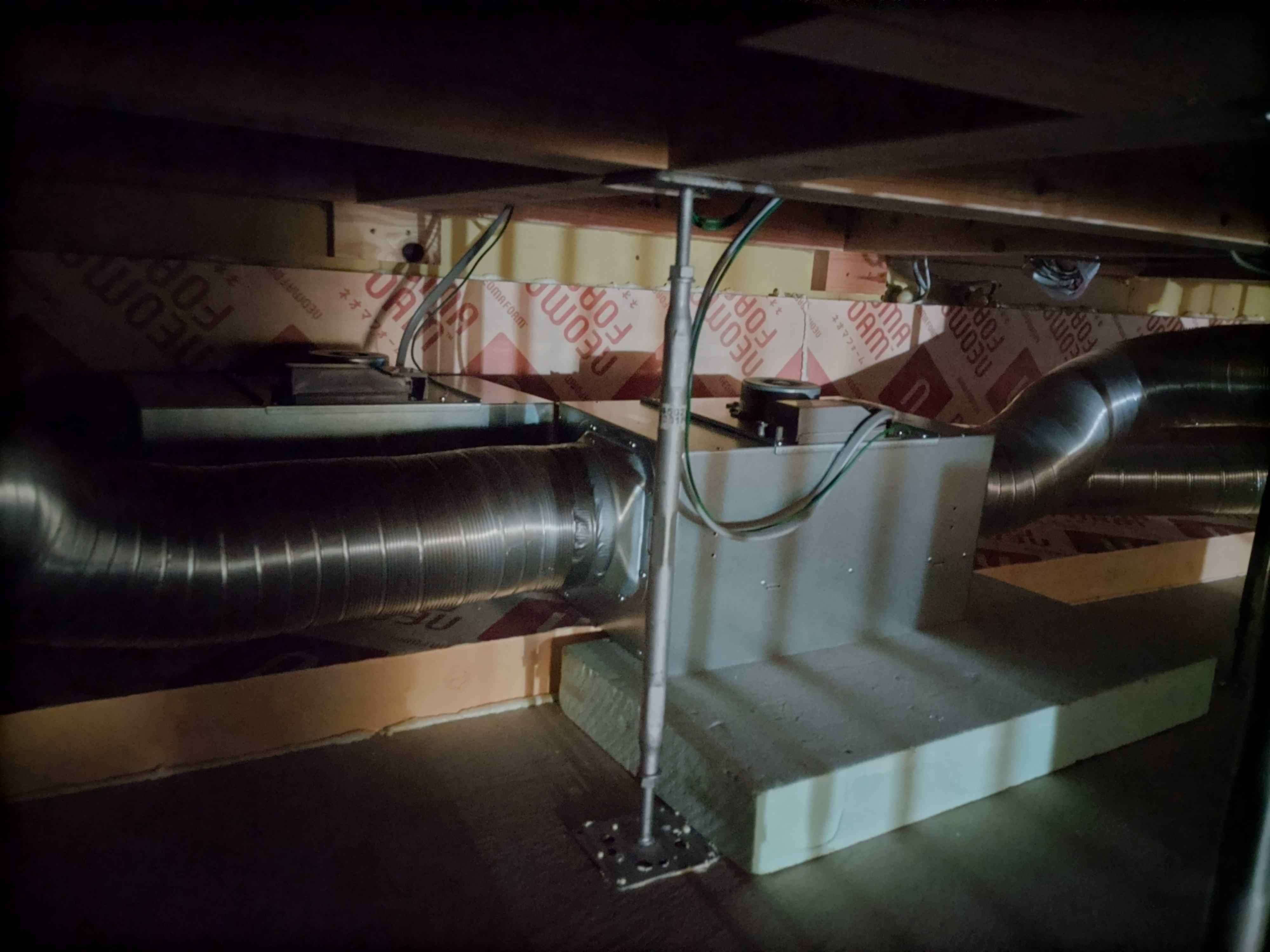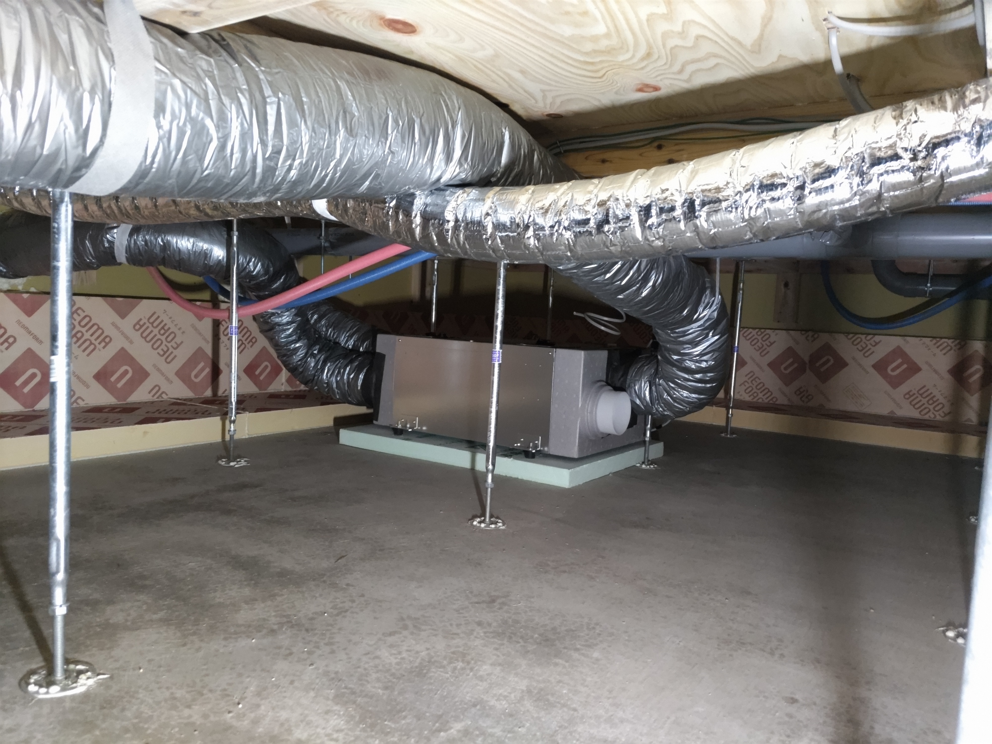 床下の熱交換機、ダクト類も確認。k長先生の方式はダクト類も重装備で、思いのほか風量が大きいため、テーピングが甘いと接続部で外れるという事例があるそうです。まだ1年ですがこれからテープの接着力が落ちてきた時が要注意です。