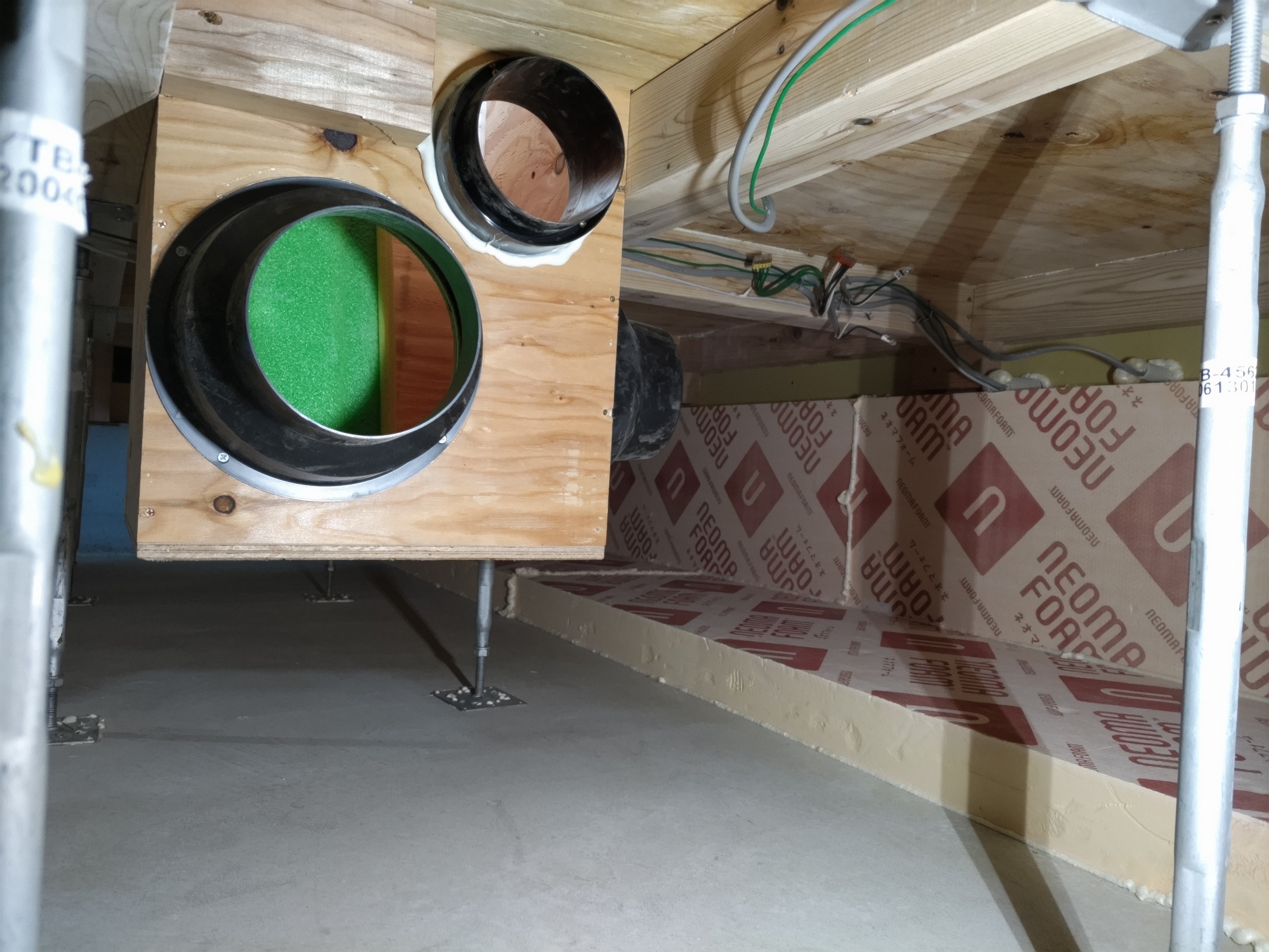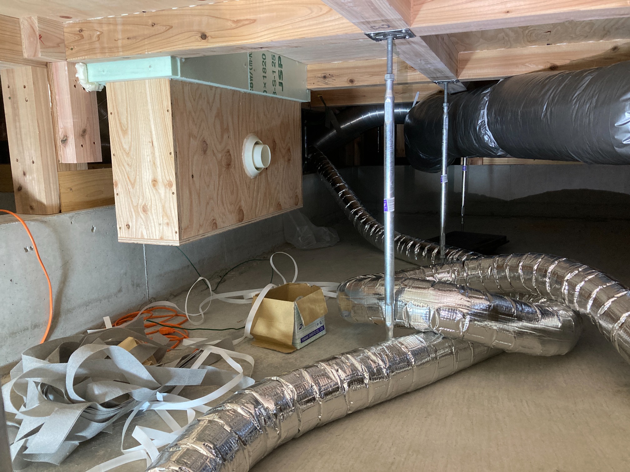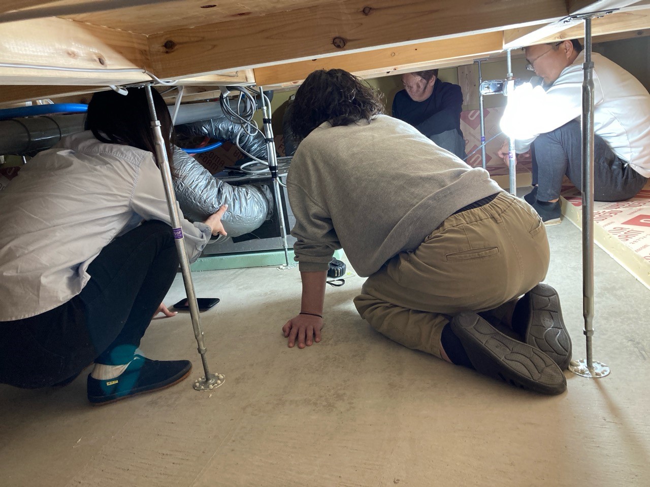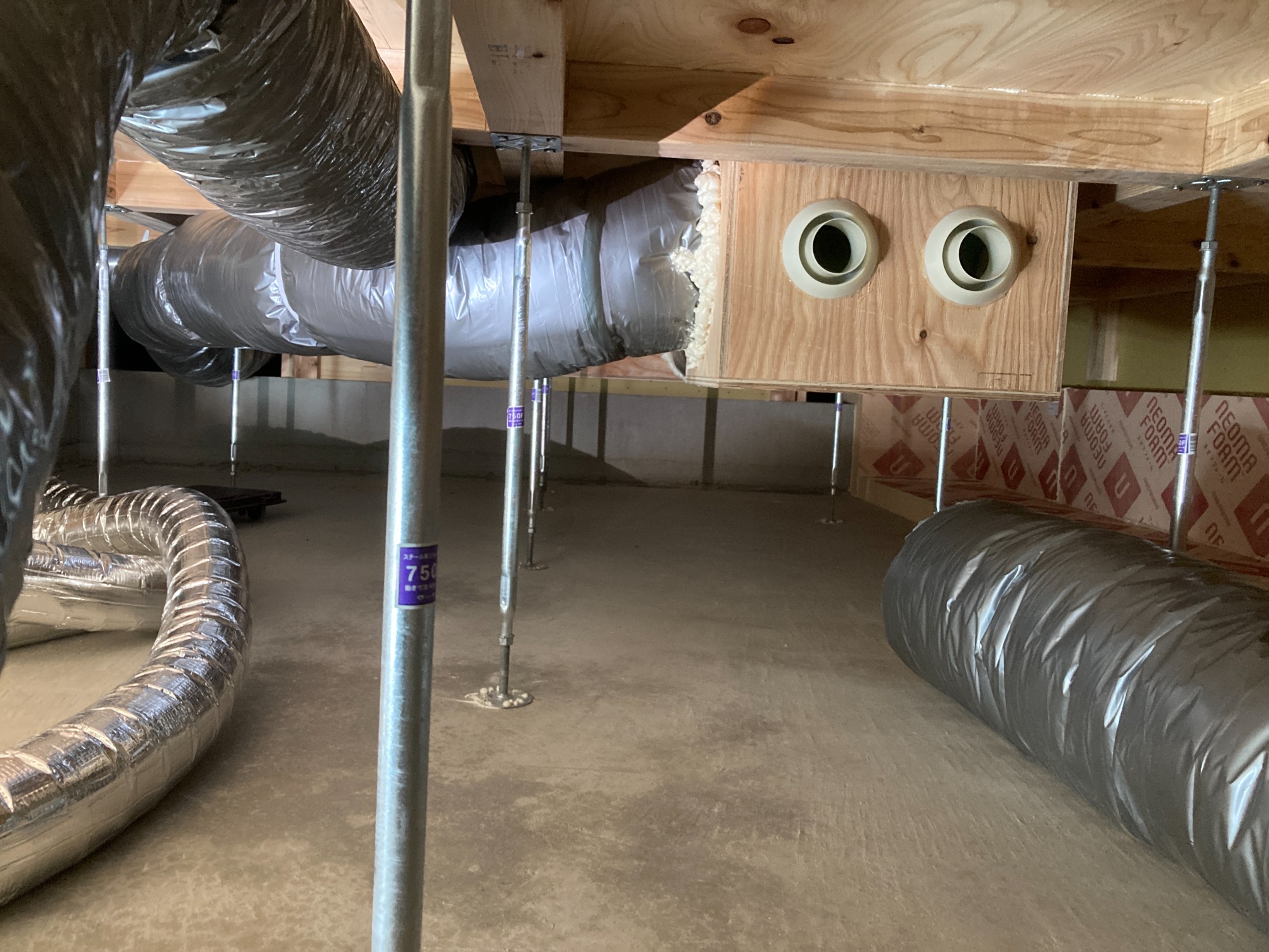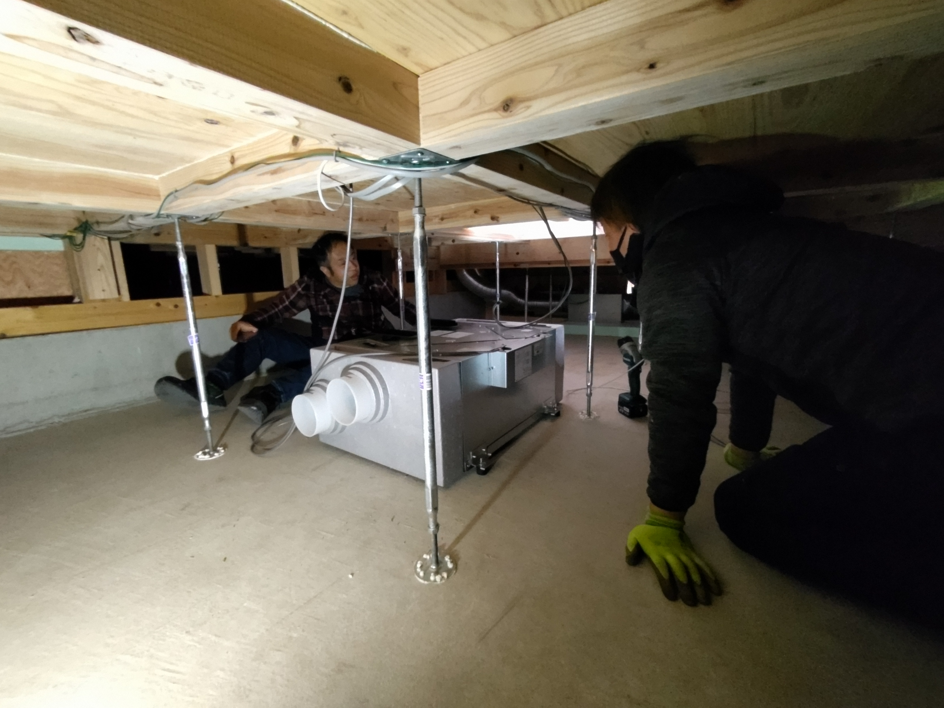 床下の熱交換機、ダクト類も確認。k長先生の方式はダクト類も重装備で、思いのほか風量が大きいため、テーピングが甘いと接続部で外れるという事例があるそうです。まだ1年ですがこれからテープの接着力が落ちてきた時が要注意です。