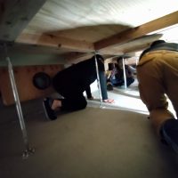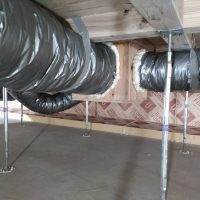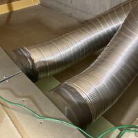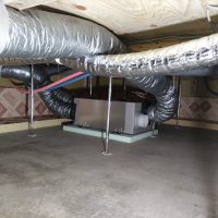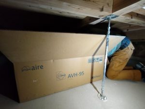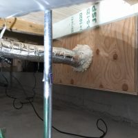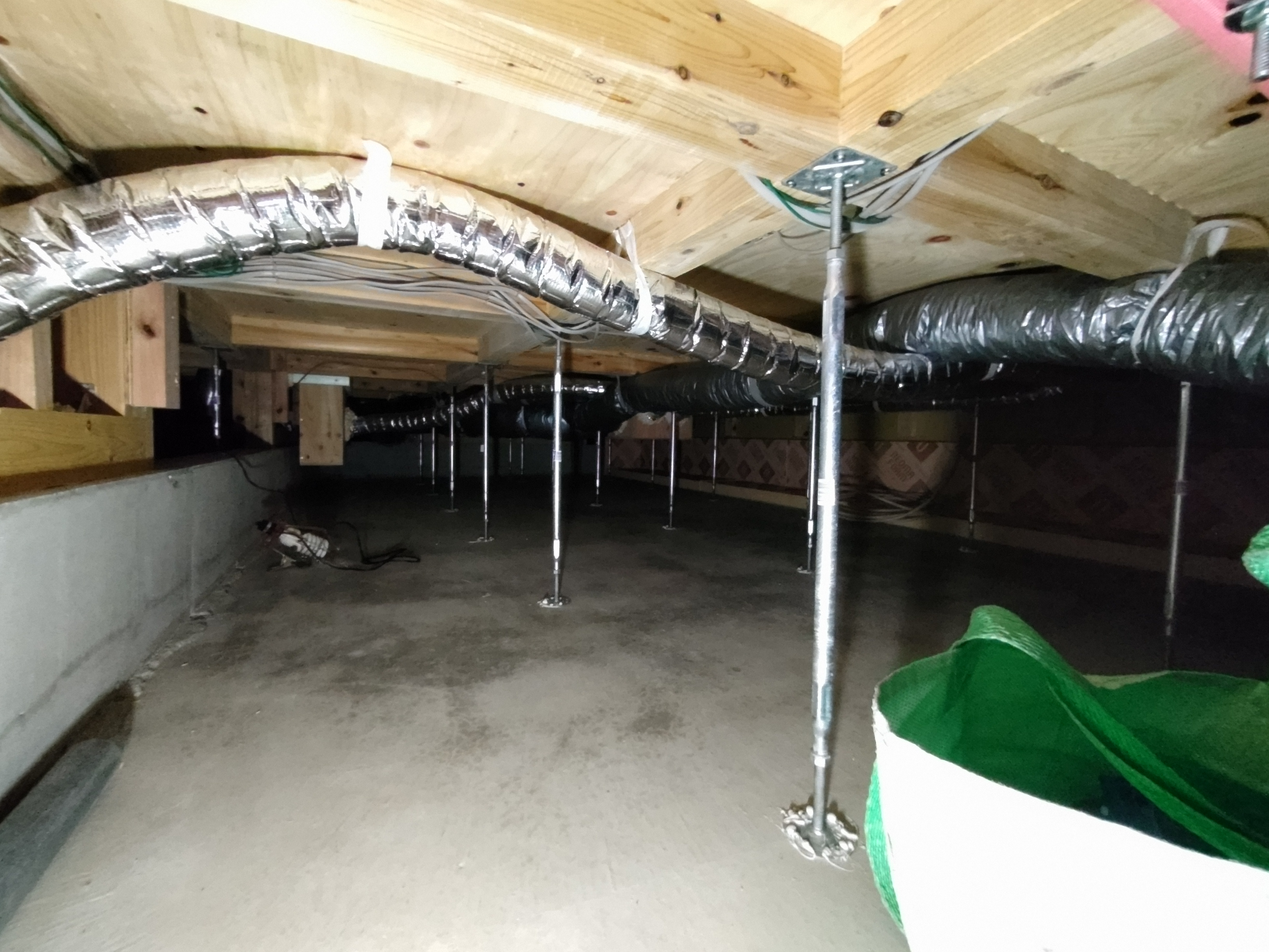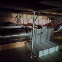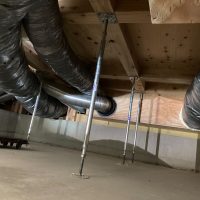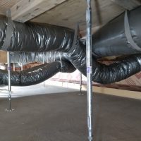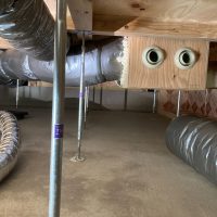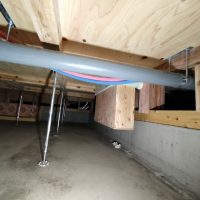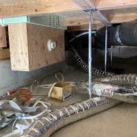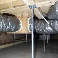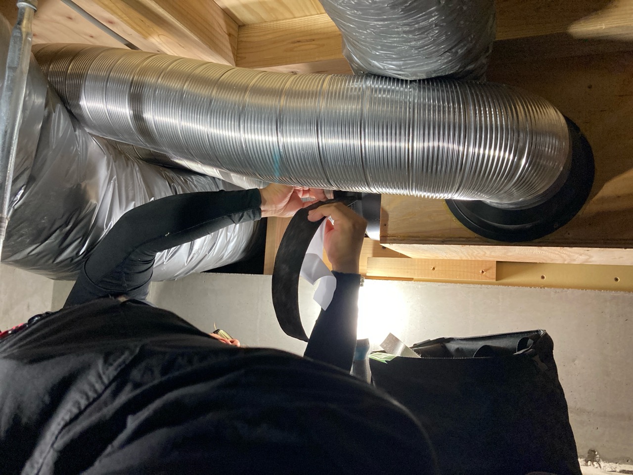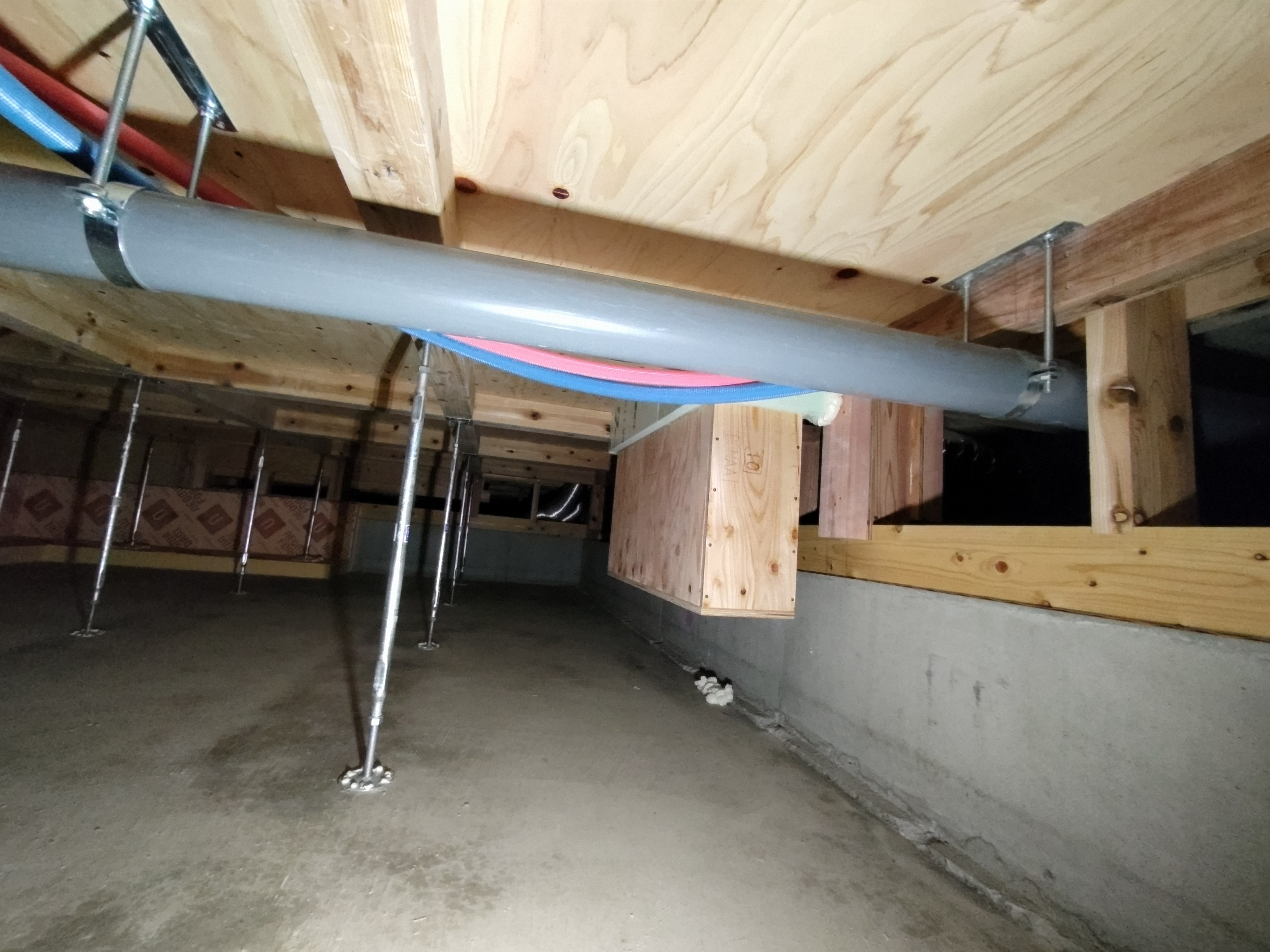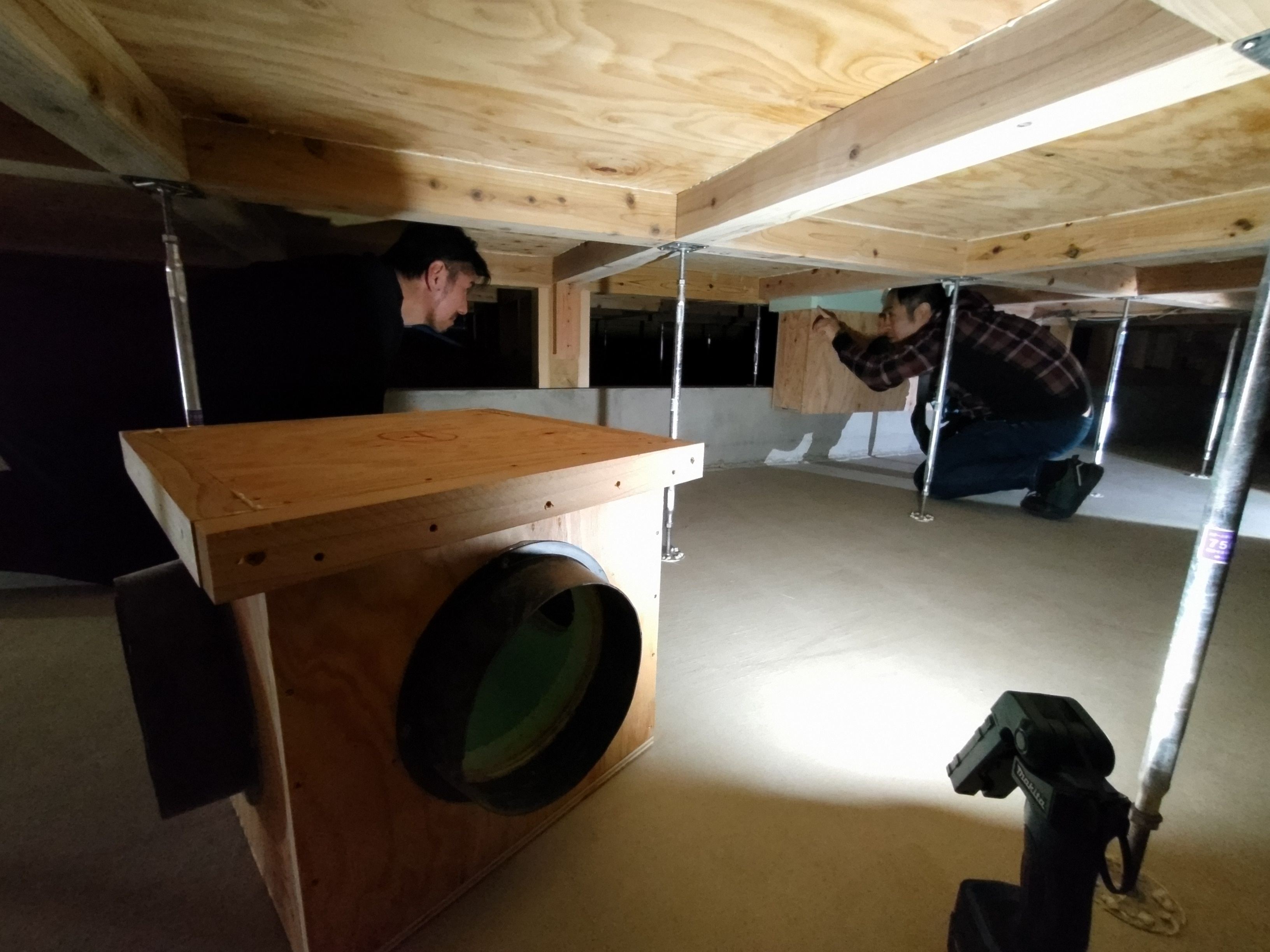 床下の熱交換機、ダクト類も確認。k長先生の方式はダクト類も重装備で、思いのほか風量が大きいため、テーピングが甘いと接続部で外れるという事例があるそうです。まだ1年ですがこれからテープの接着力が落ちてきた時が要注意です。