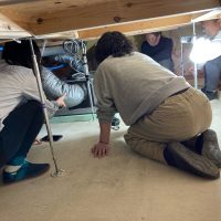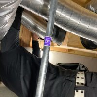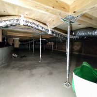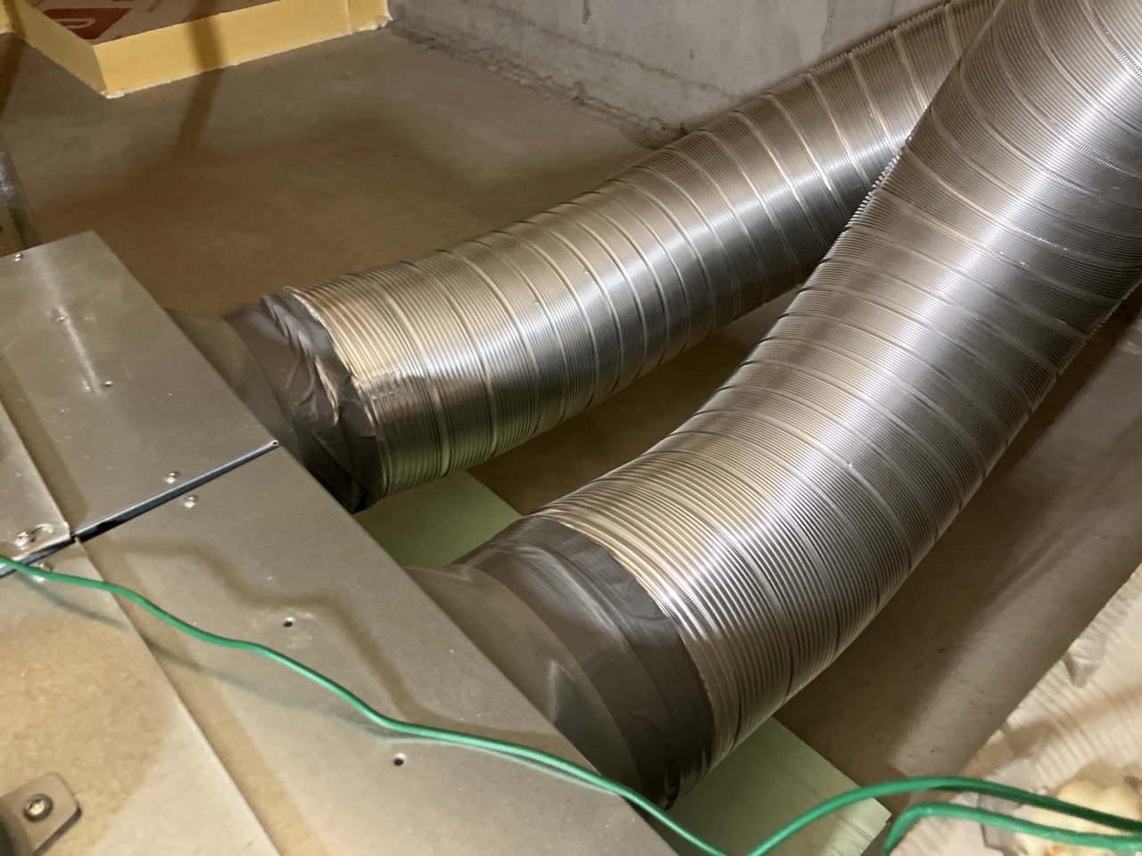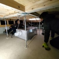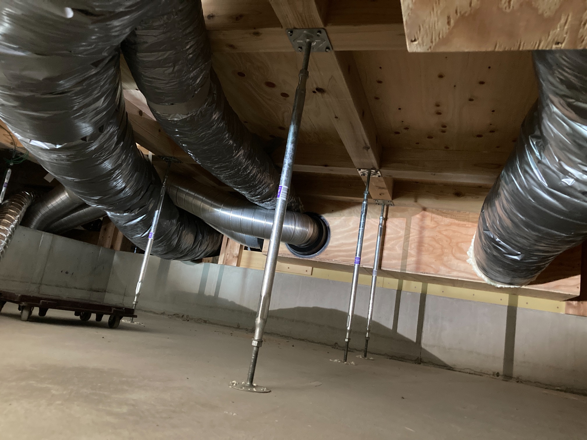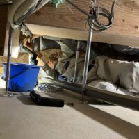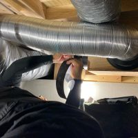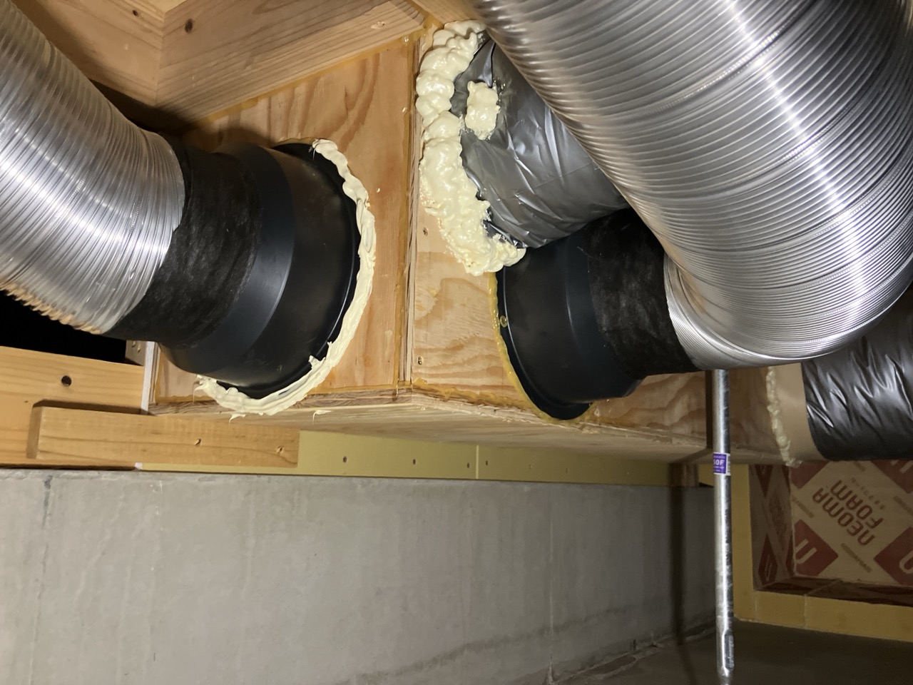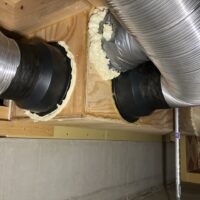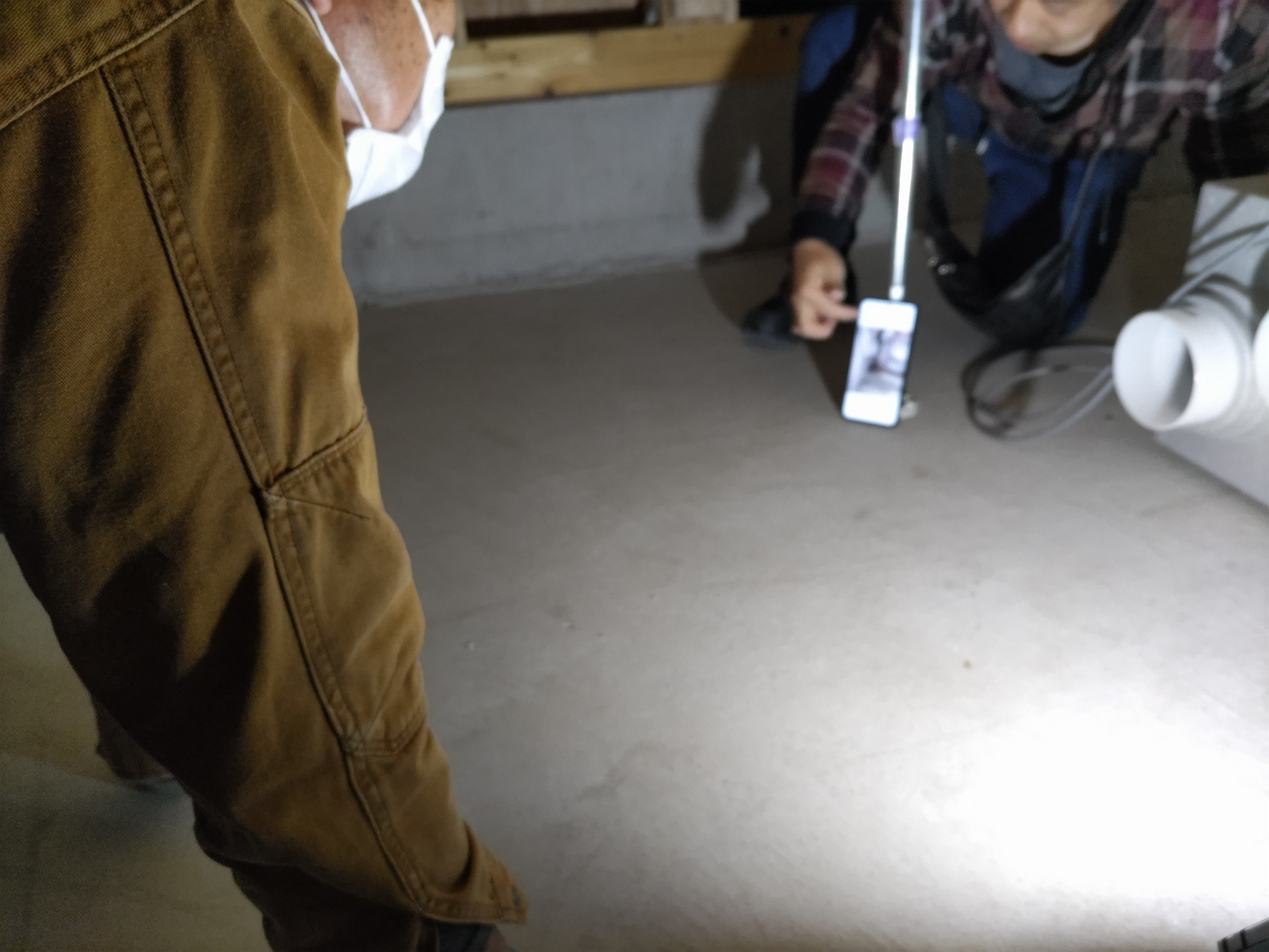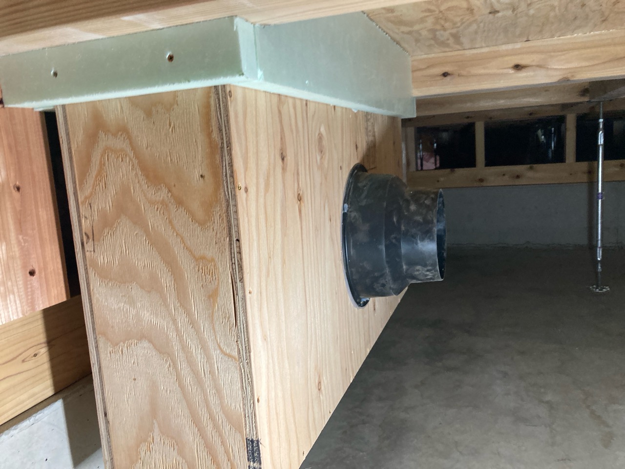 床下の熱交換機、ダクト類も確認。k長先生の方式はダクト類も重装備で、思いのほか風量が大きいため、テーピングが甘いと接続部で外れるという事例があるそうです。まだ1年ですがこれからテープの接着力が落ちてきた時が要注意です。
