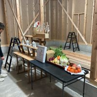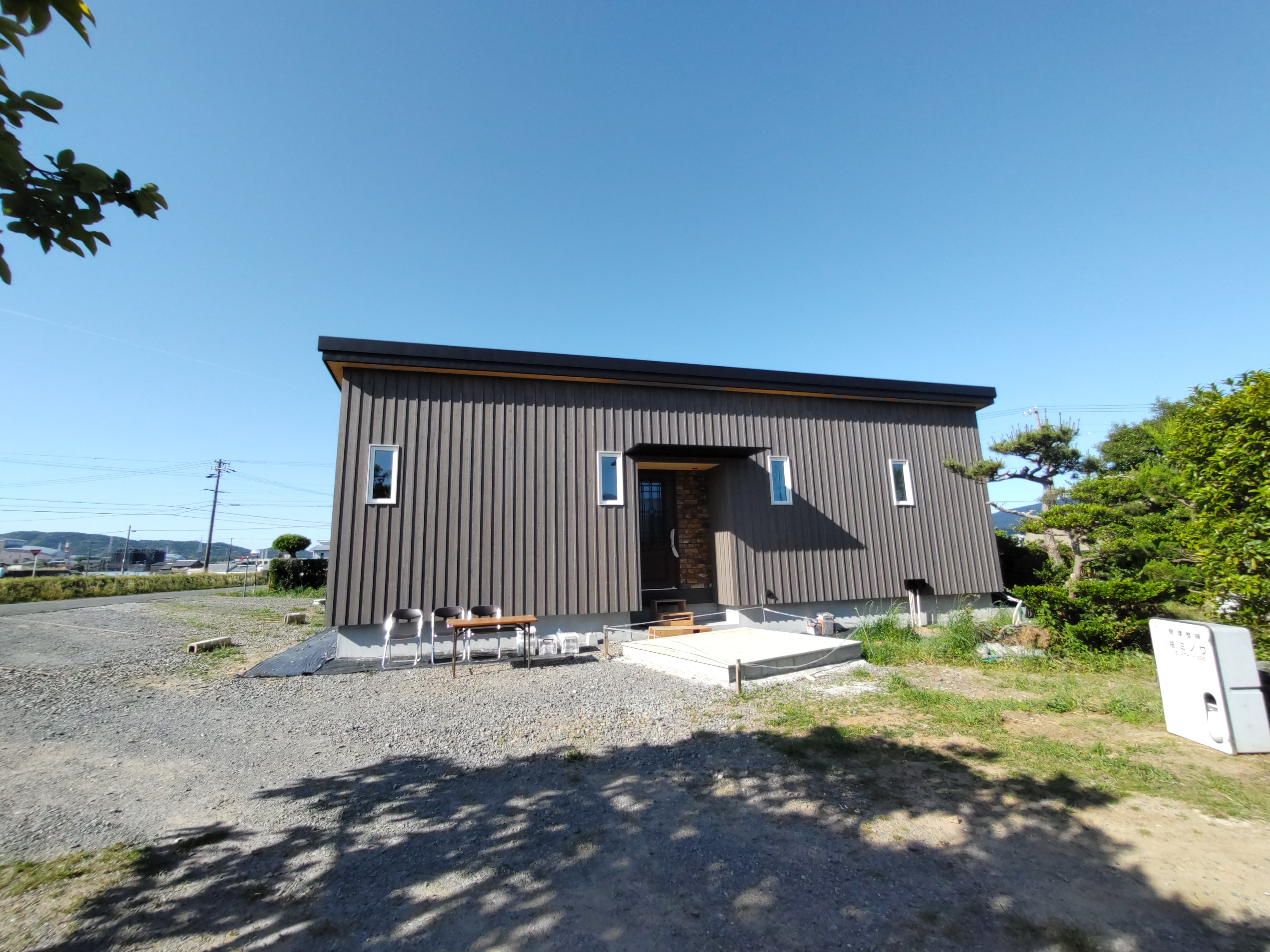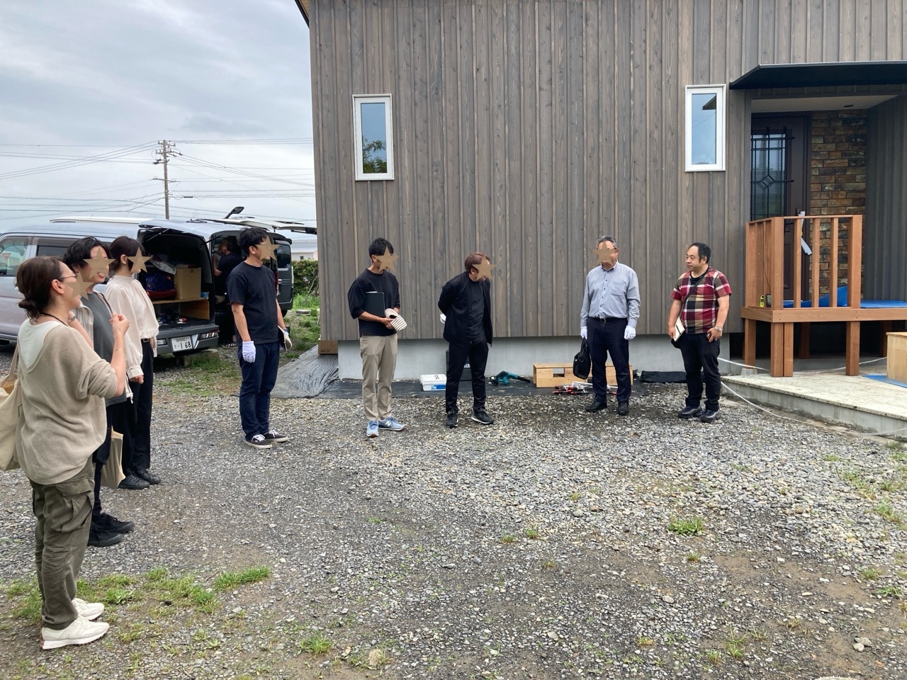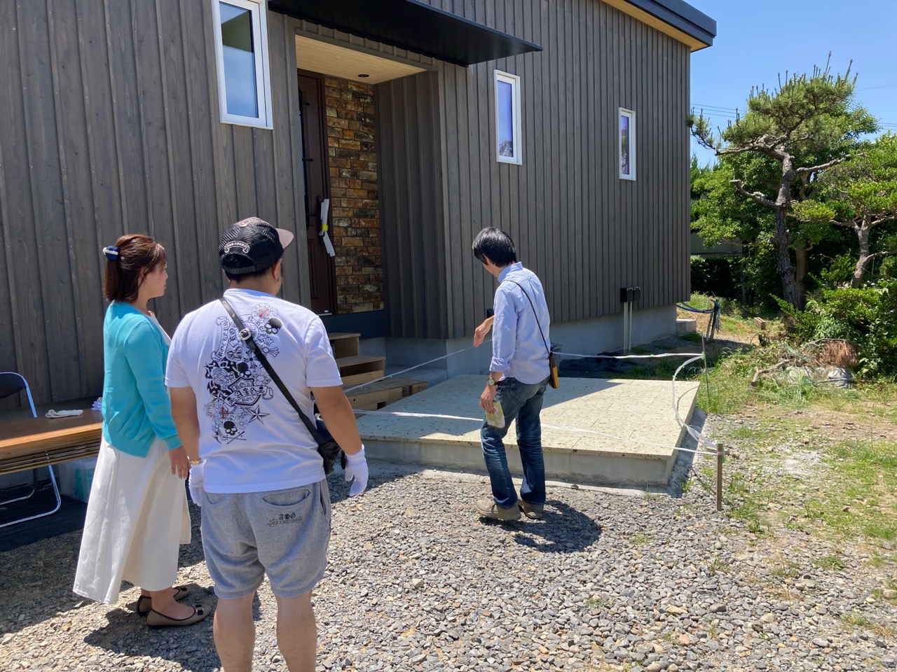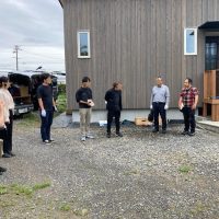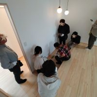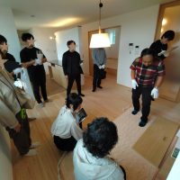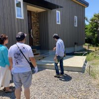 見学会初日、朝からよく晴れ渡った空に南世帯の杉板押縁張りの外壁がよく映えています。今回は遠方につきお客様もスタッフも少数精鋭で行われます。