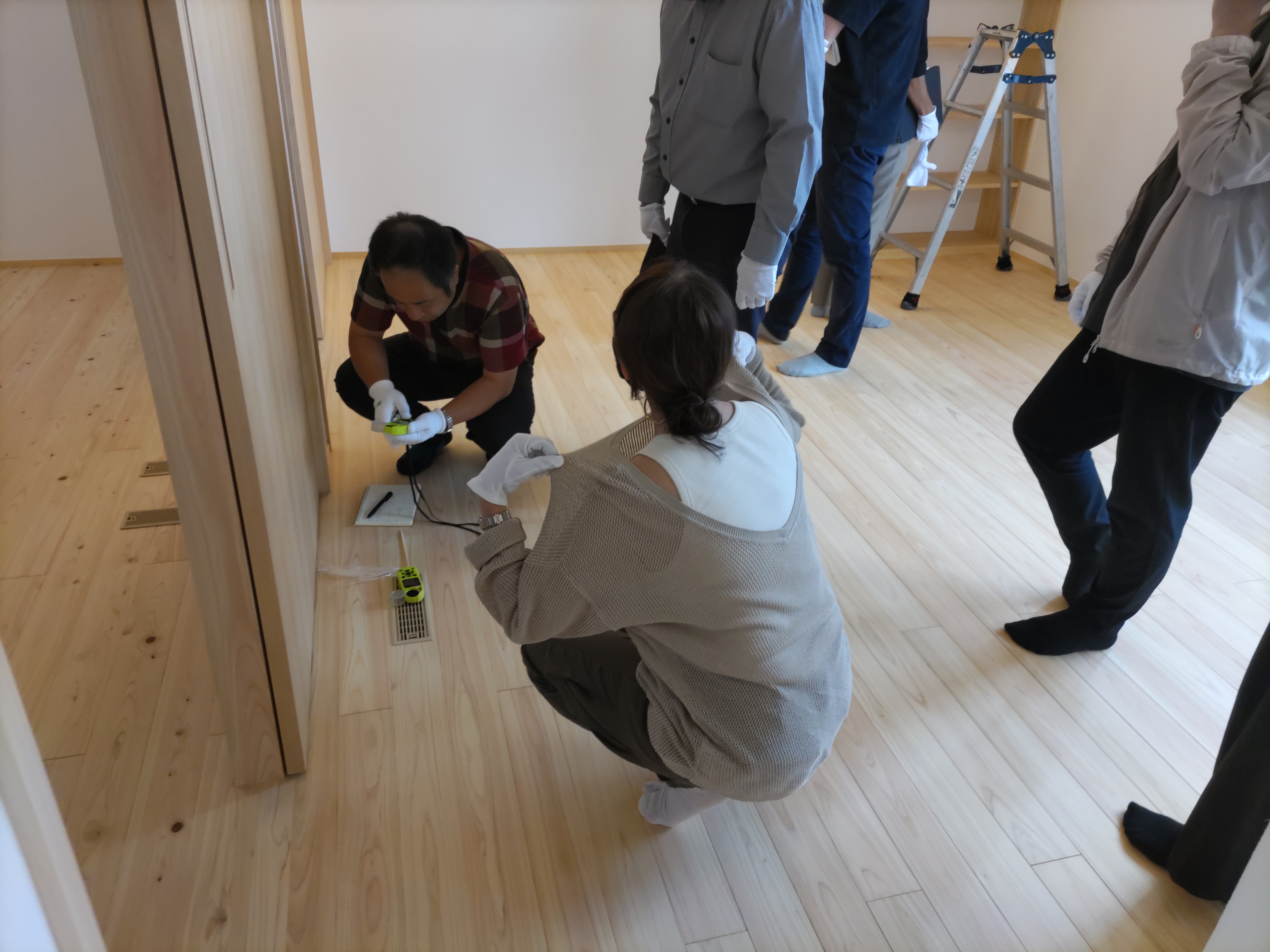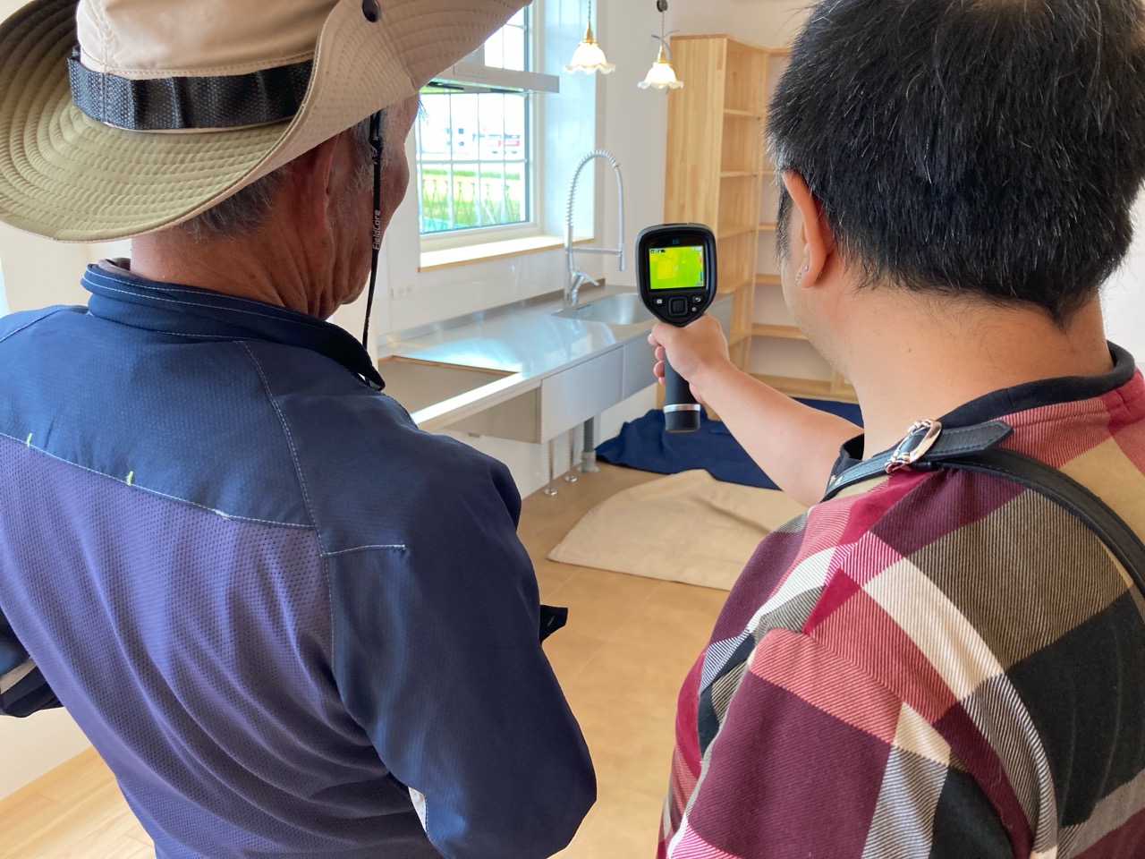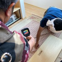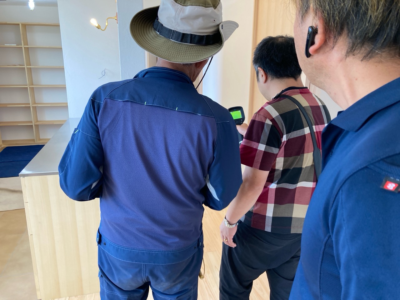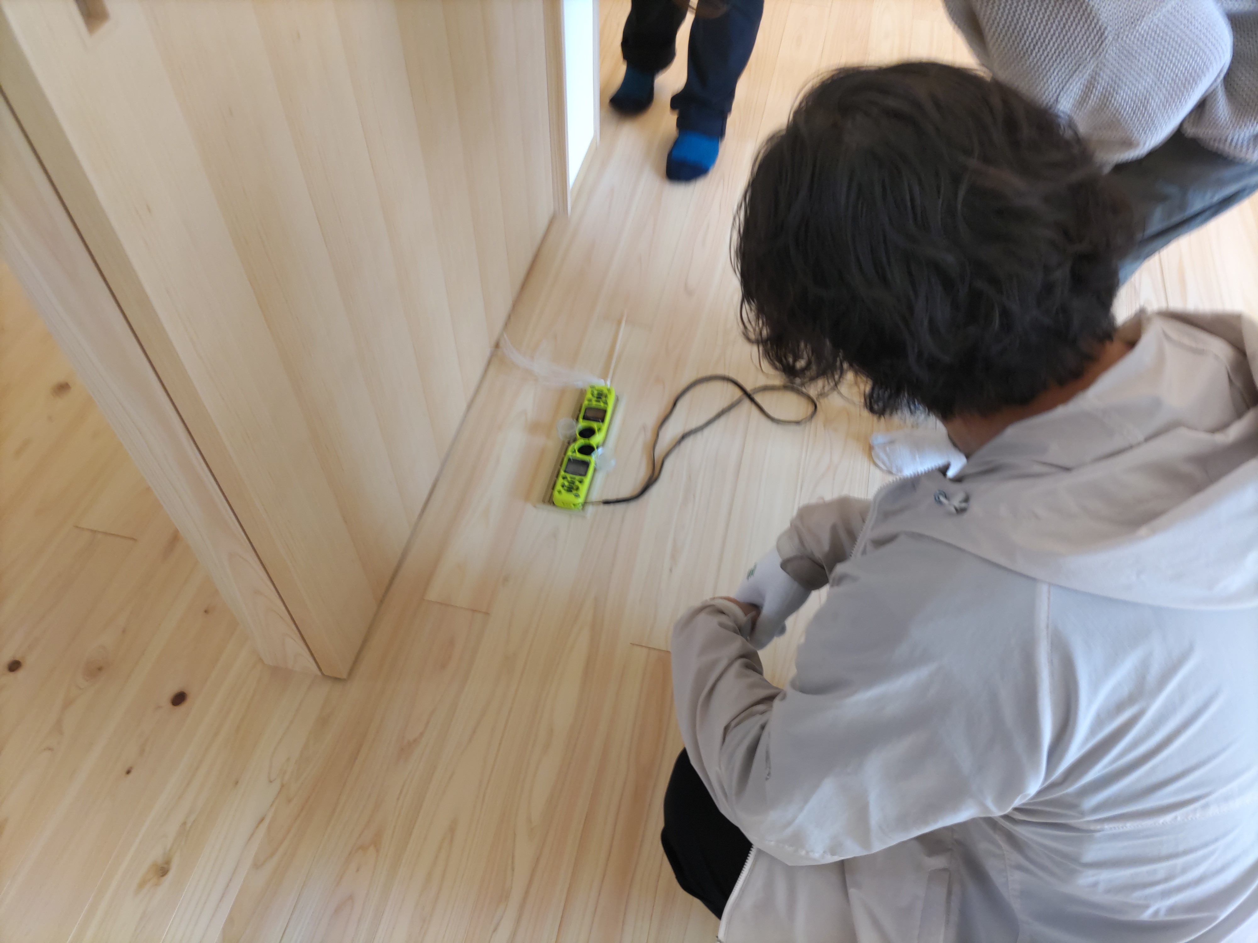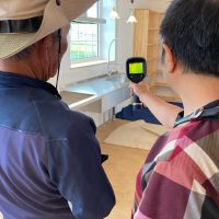 そして『室温が目に見える』温度計で各箇所を検温。大工さんも測定していましたがさすがは普段k長先生と仕事をして見える方々で、測定器の扱いも手慣れたものです。各部分の温度も安定しているようです。