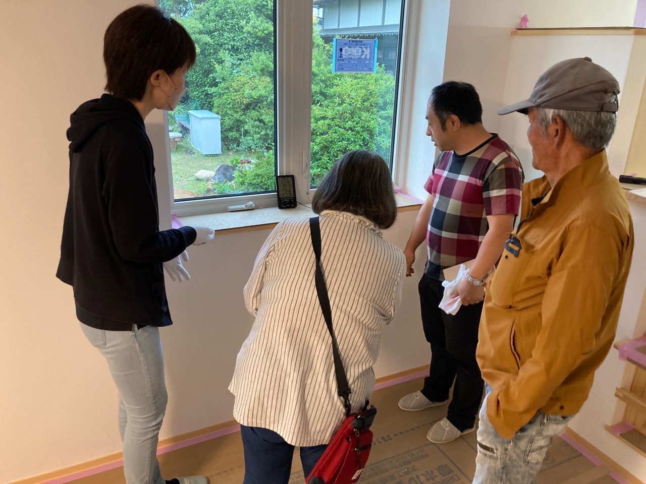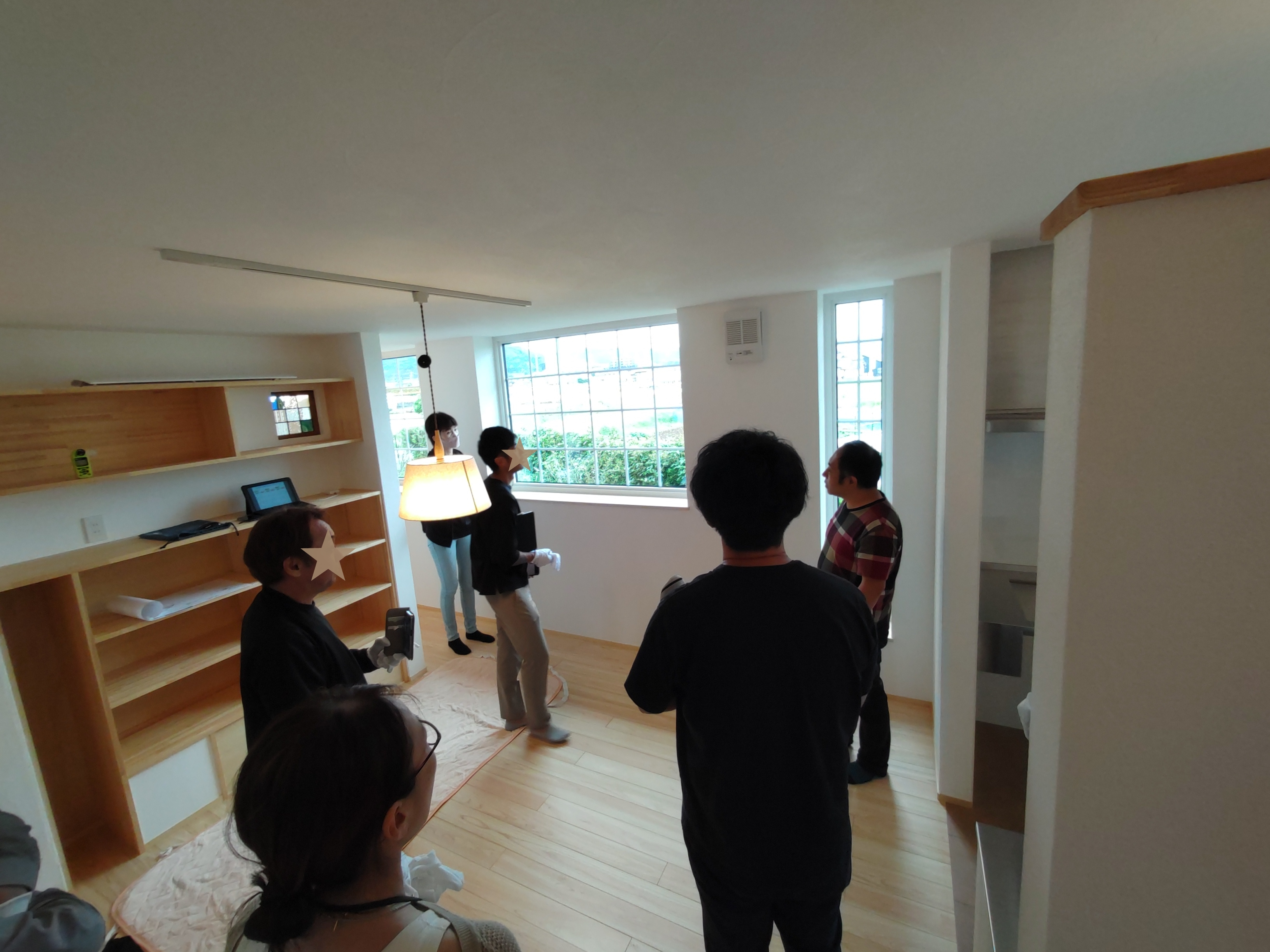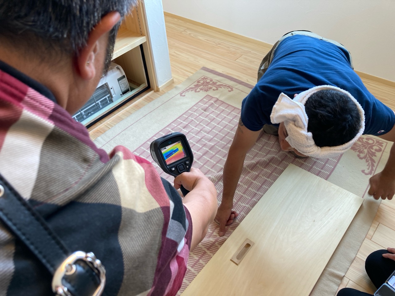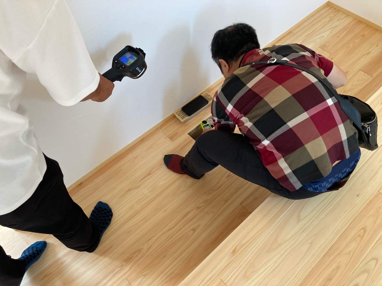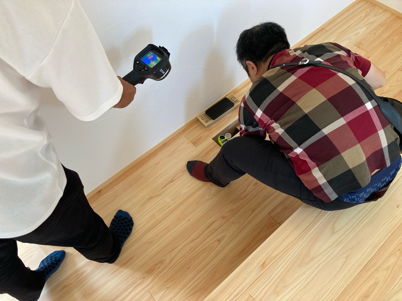 そして『室温が目に見える』温度計で各箇所を検温。大工さんも測定していましたがさすがは普段k長先生と仕事をして見える方々で、測定器の扱いも手慣れたものです。各部分の温度も安定しているようです。