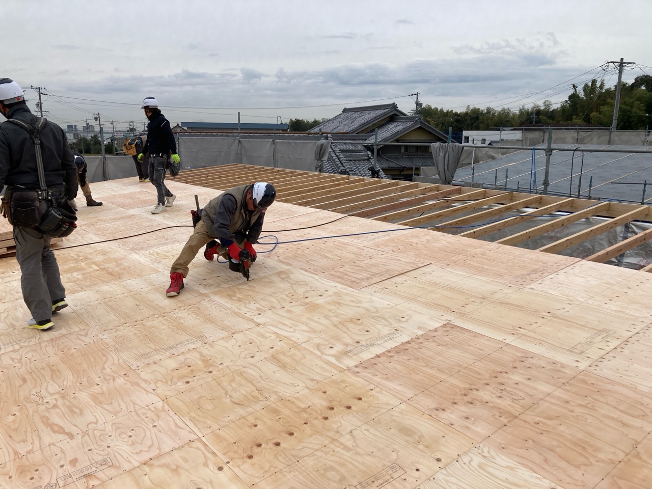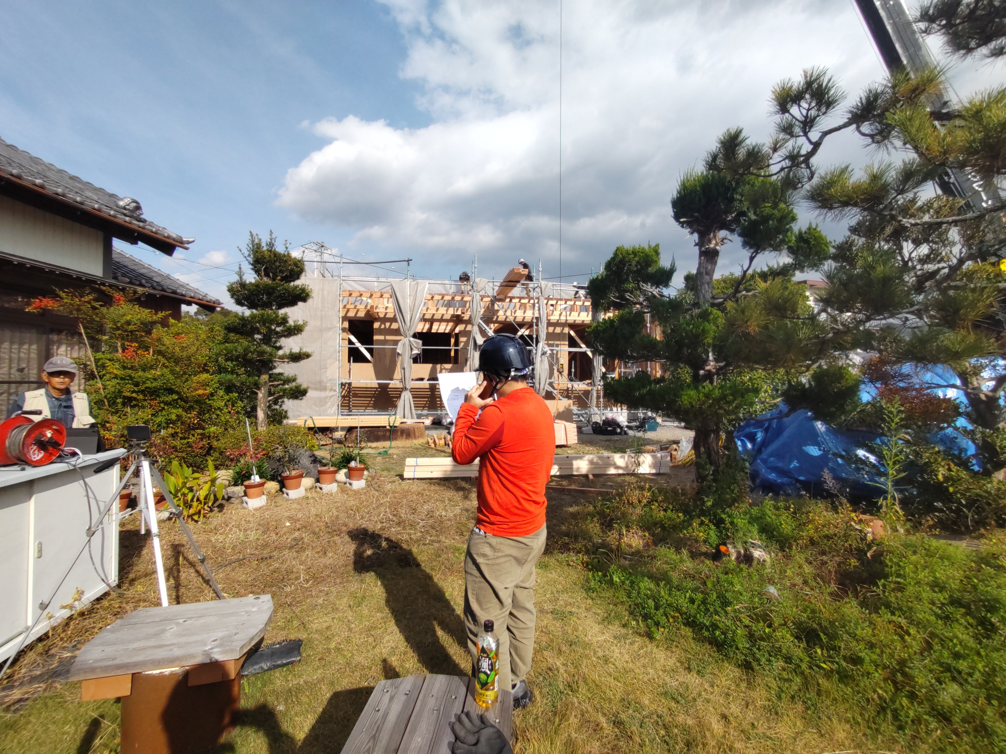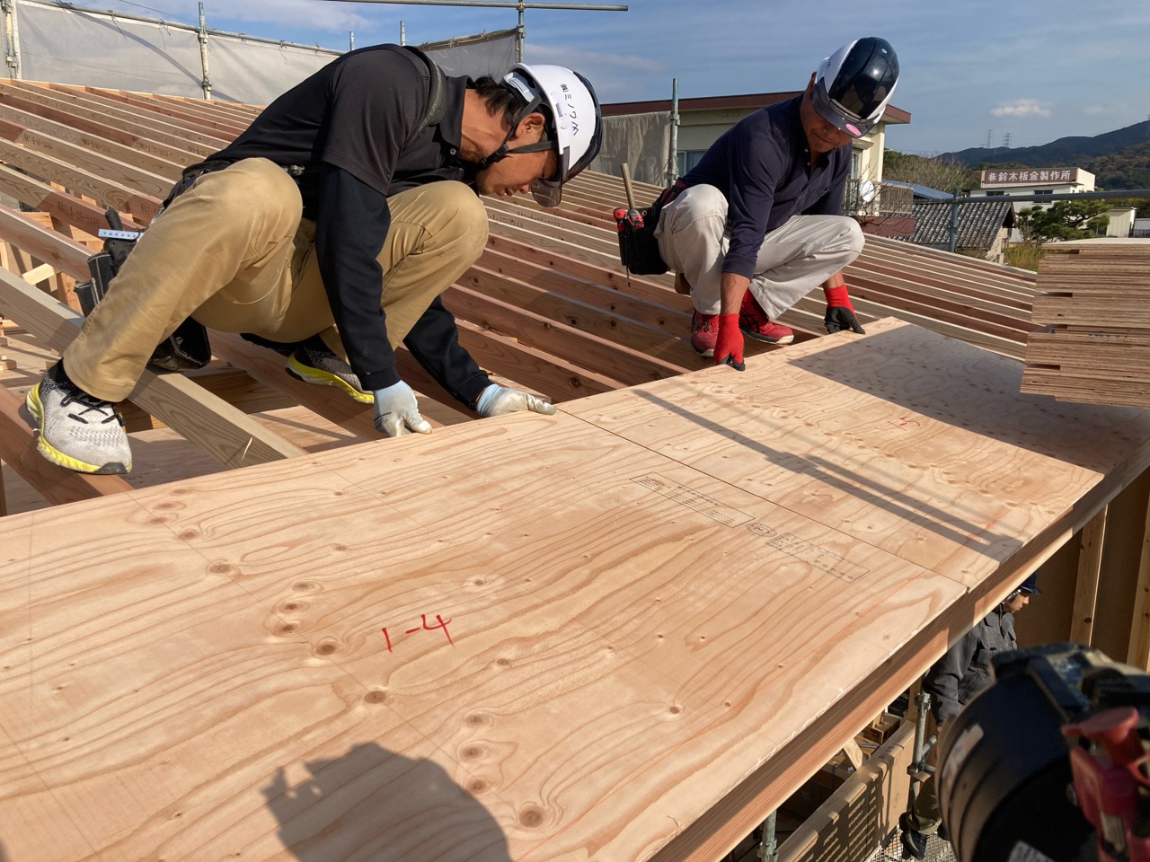 面材を打つパート、小屋組みを進めていくパートに分かれて、非常にチームワークよく作業が進んでいきます。今日の大工さんは5人、作業しているのは7人。あとの二人は…?
