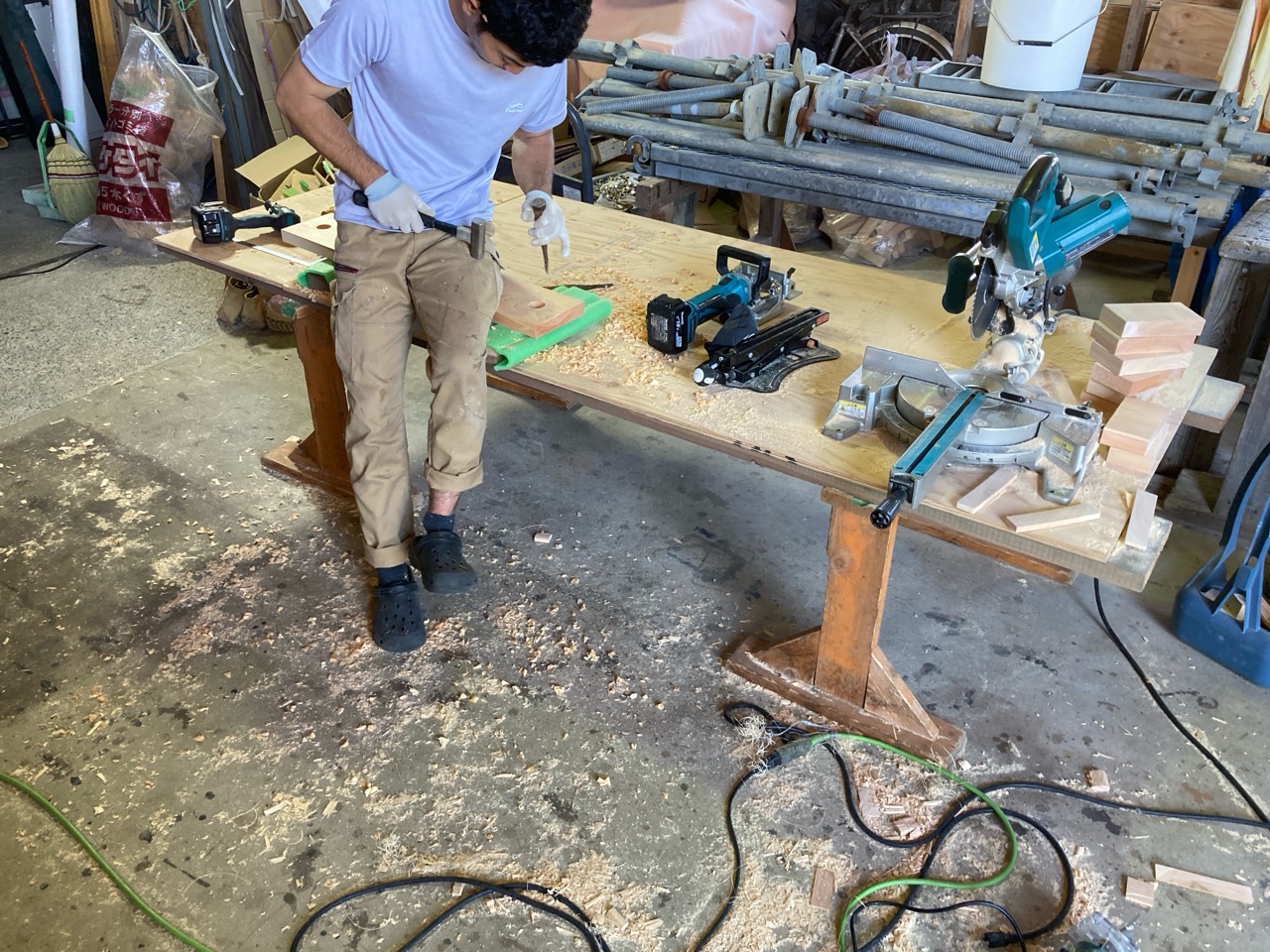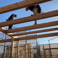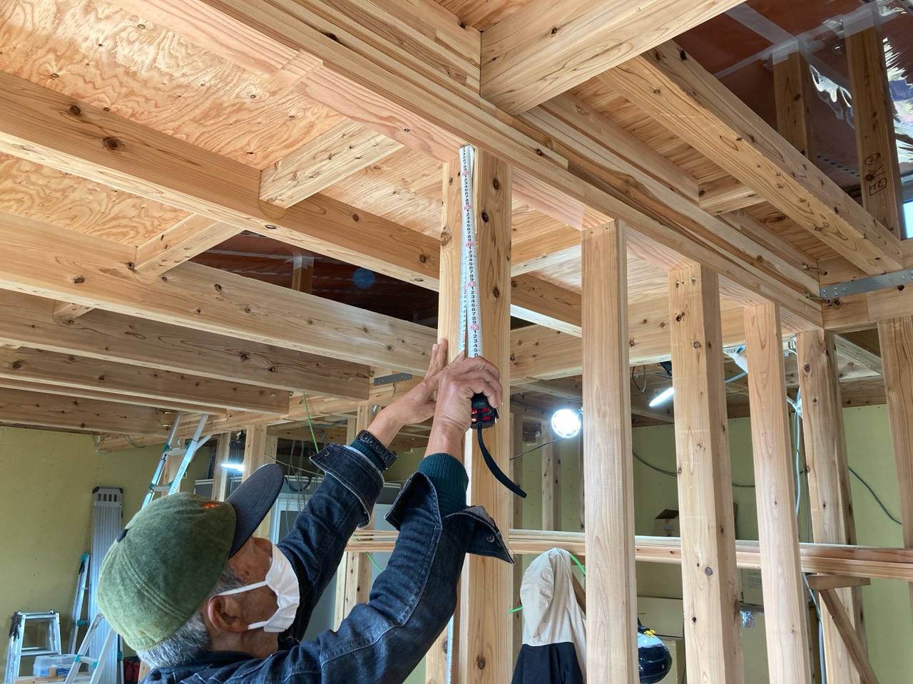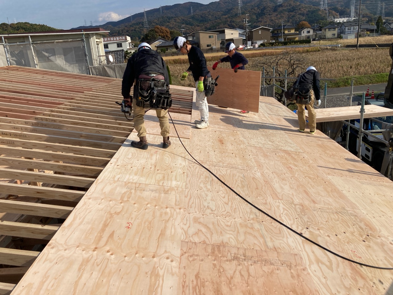 面材を打つパート、小屋組みを進めていくパートに分かれて、非常にチームワークよく作業が進んでいきます。今日の大工さんは5人、作業しているのは7人。あとの二人は…?