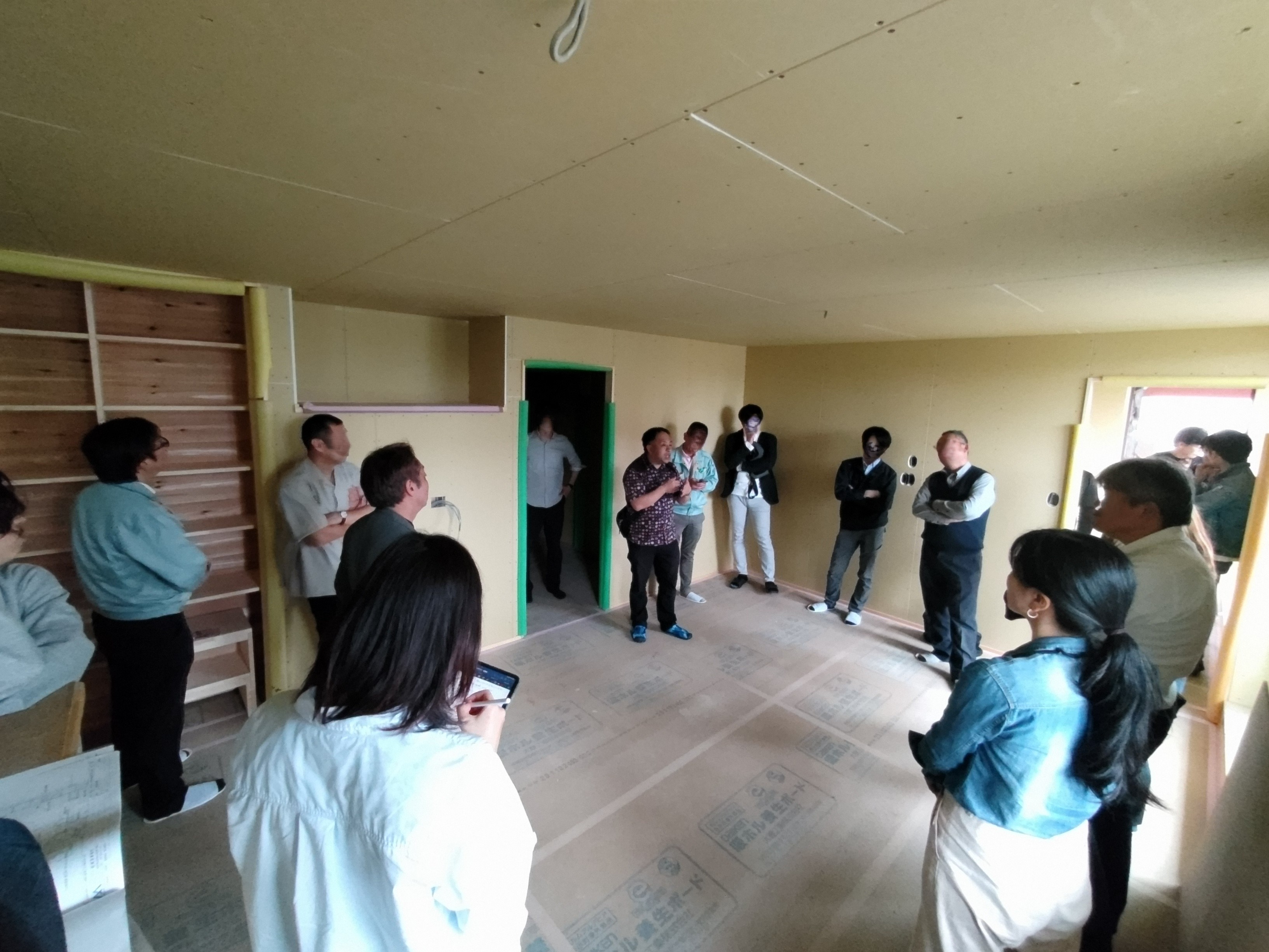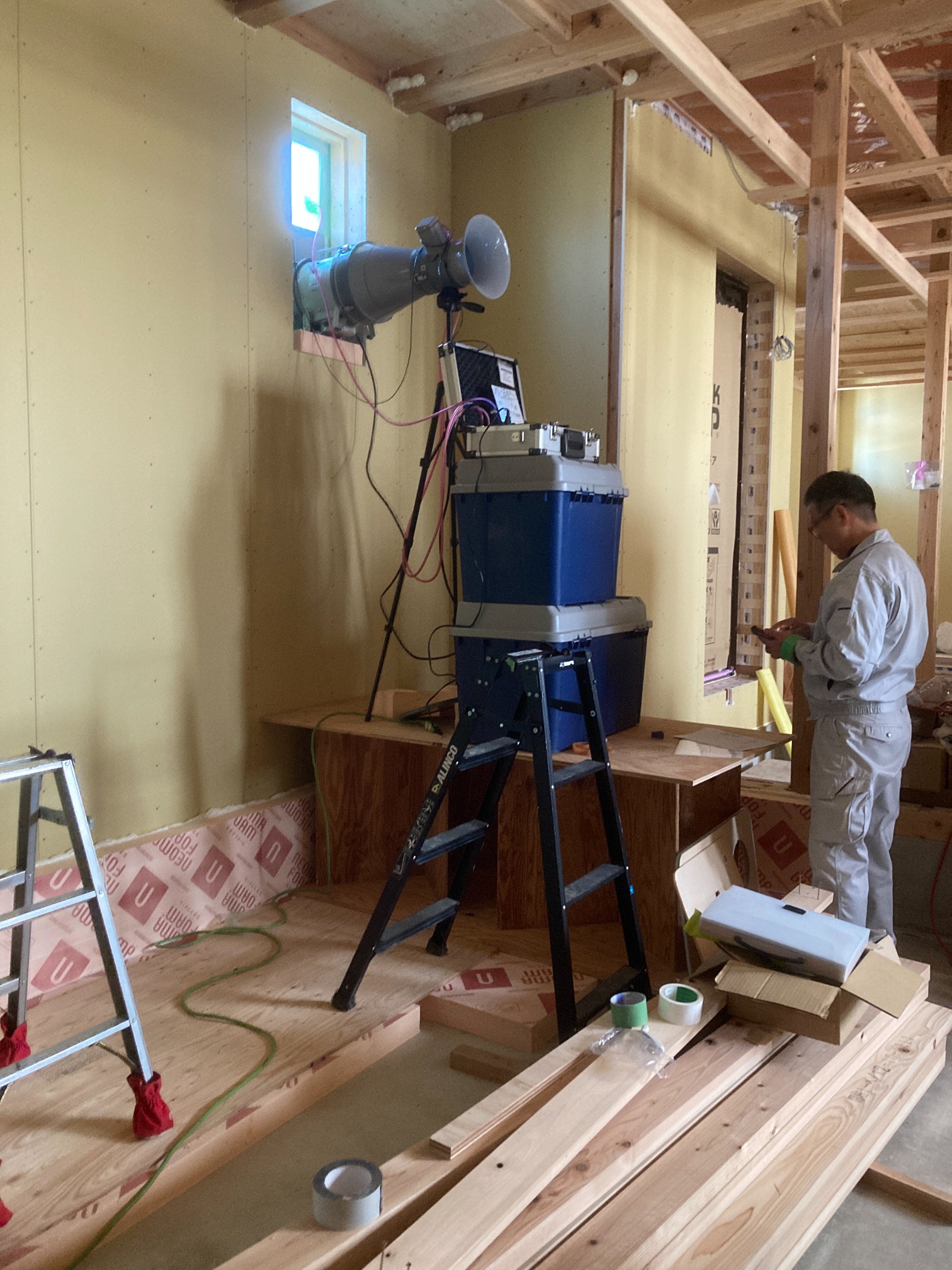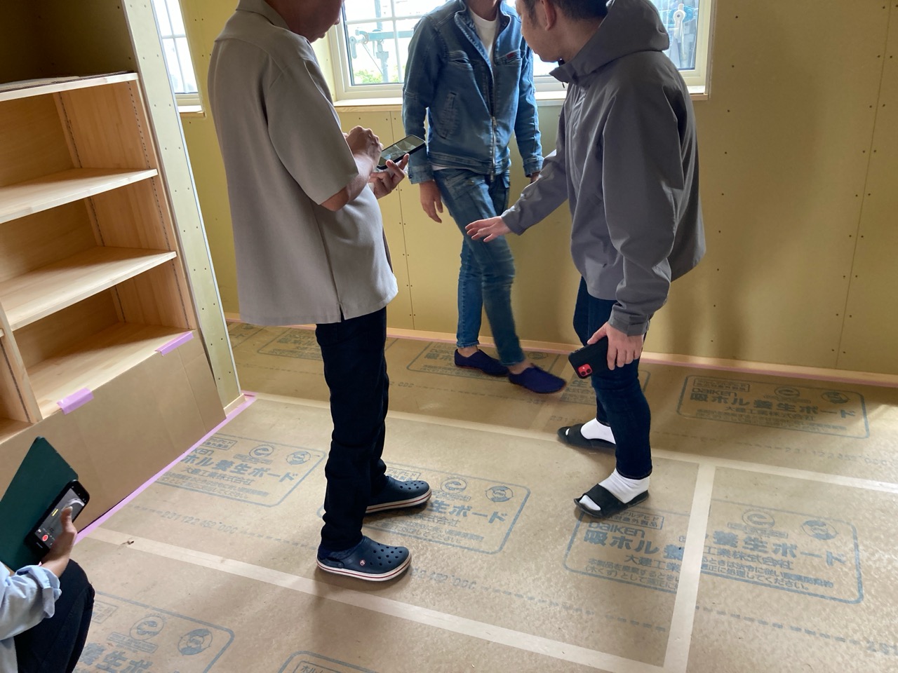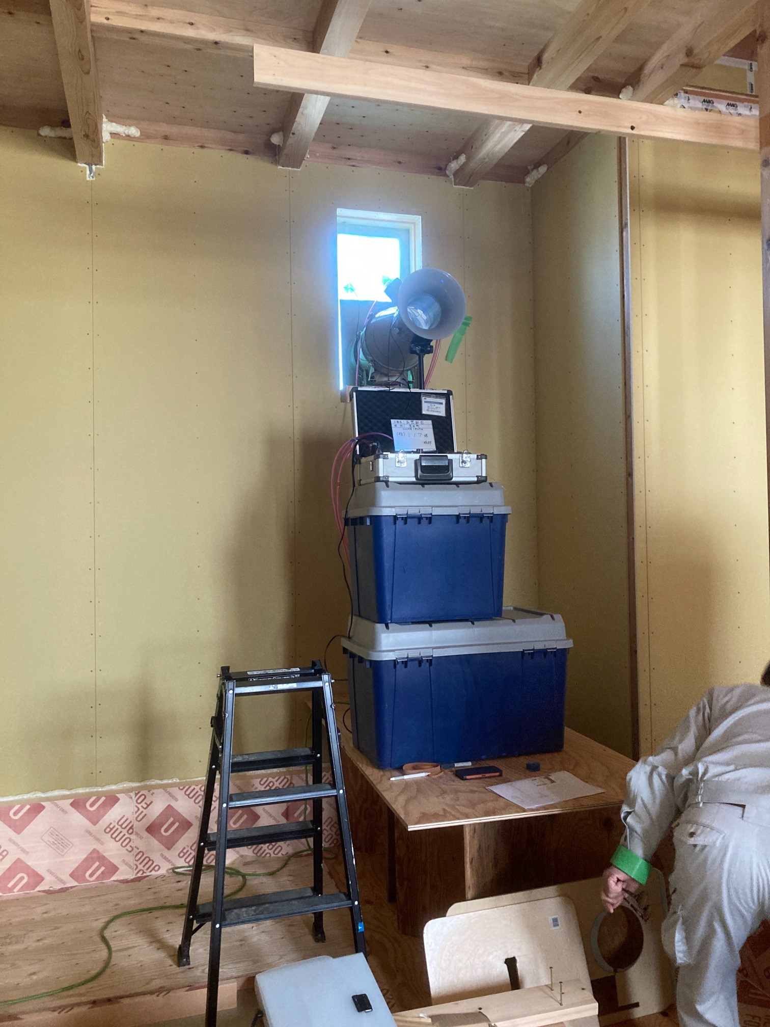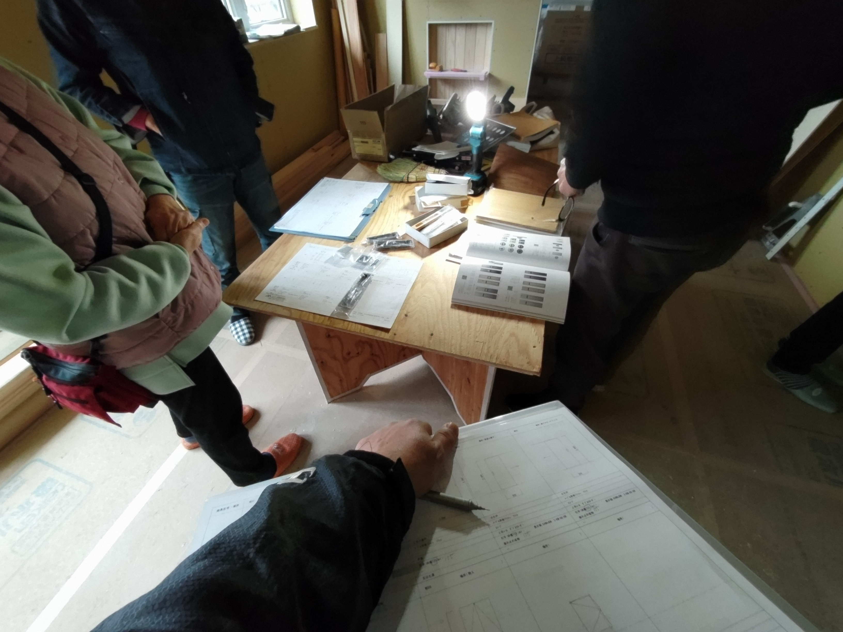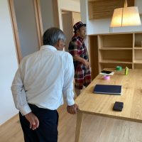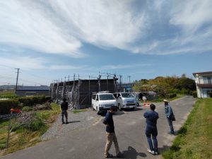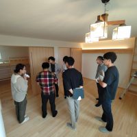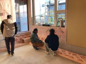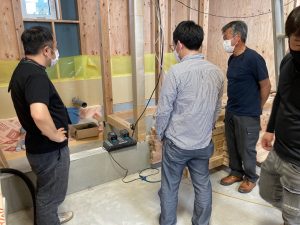 また本日はできあがったシステムのチェックのためにk長先生が普段宇都宮市で一緒に仕事をされている大工さん3名と現場に来場されました。今回のシステムは通常施工されている仕様とは少しマイナーチェンジをされているそうで、大工さんたちも結果を確認するために朝4:30集合ではるばるやってきていただきました。・・・毎度のことながら遠路ご苦労様です。