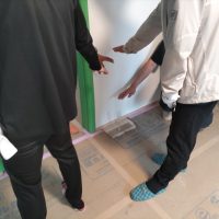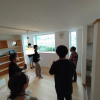 前回は工事途中のため、主にKAMI式のシステムのダクト配管やチャンバーボックスの構成などを中心に講義されましたが、今回は完成後にエアコン、熱交換器、循環ファンがどのように稼働、作用しているかを体感を交えて講義されました。当日台風1号が列島東をかすめていった影響で朝から小雨で少し肌寒い気候。ともすれば室温より気温の方が低い時間帯があるため、冷房の威力が少し分かりにくい事が難点でしたが、エアコンの設定温度を少し低めにして(参加者は厚着をして)勉強会に臨みました。それでも屋外の湿気に対して屋内は冷房と除湿が効いているため、非常に過ごしやすい環境となっています。