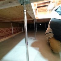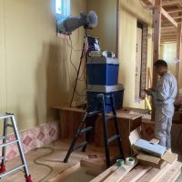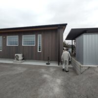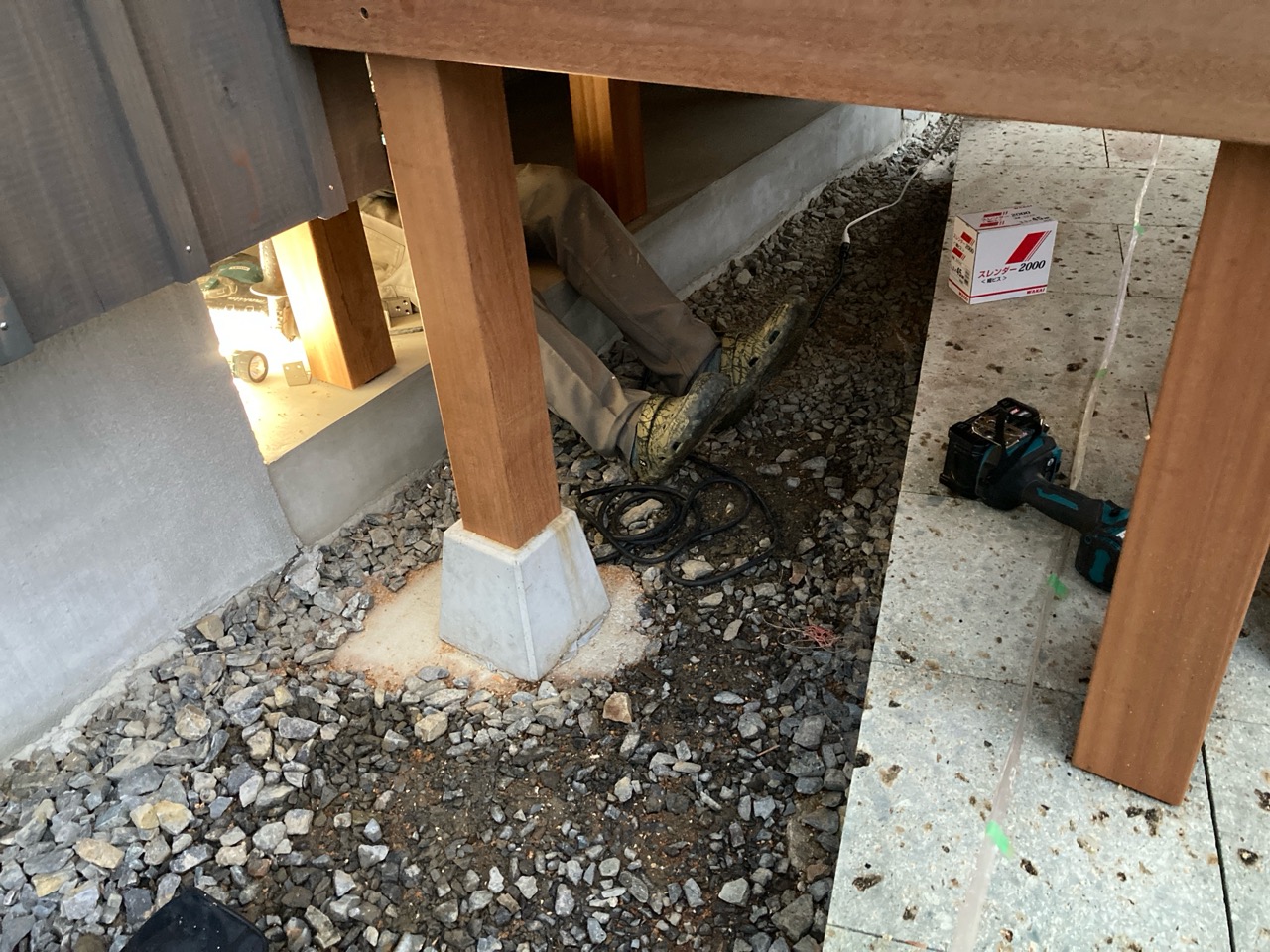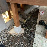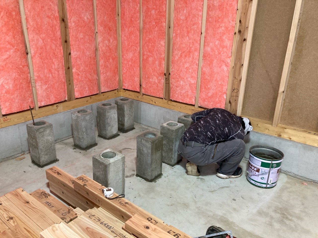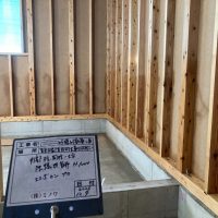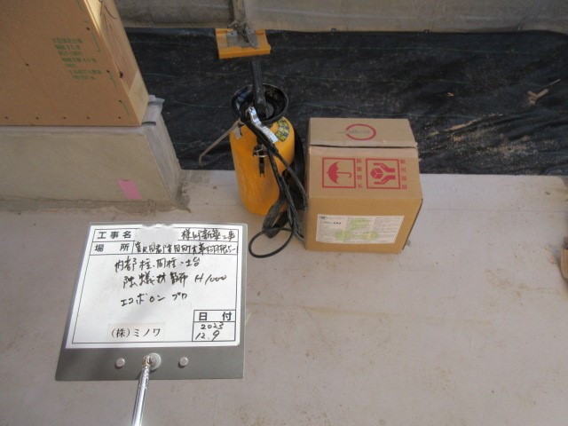 検査後、仕様によりまだ大引や床合板は敷設されていませんが、その間に土台、柱に防蟻処理を施しました。考え様によっては床があるより塗布作業は非常にやりやすい状態でできます。大引や床合板に対しての塗布は敷設前のバラの状態で行えます。
