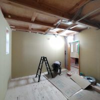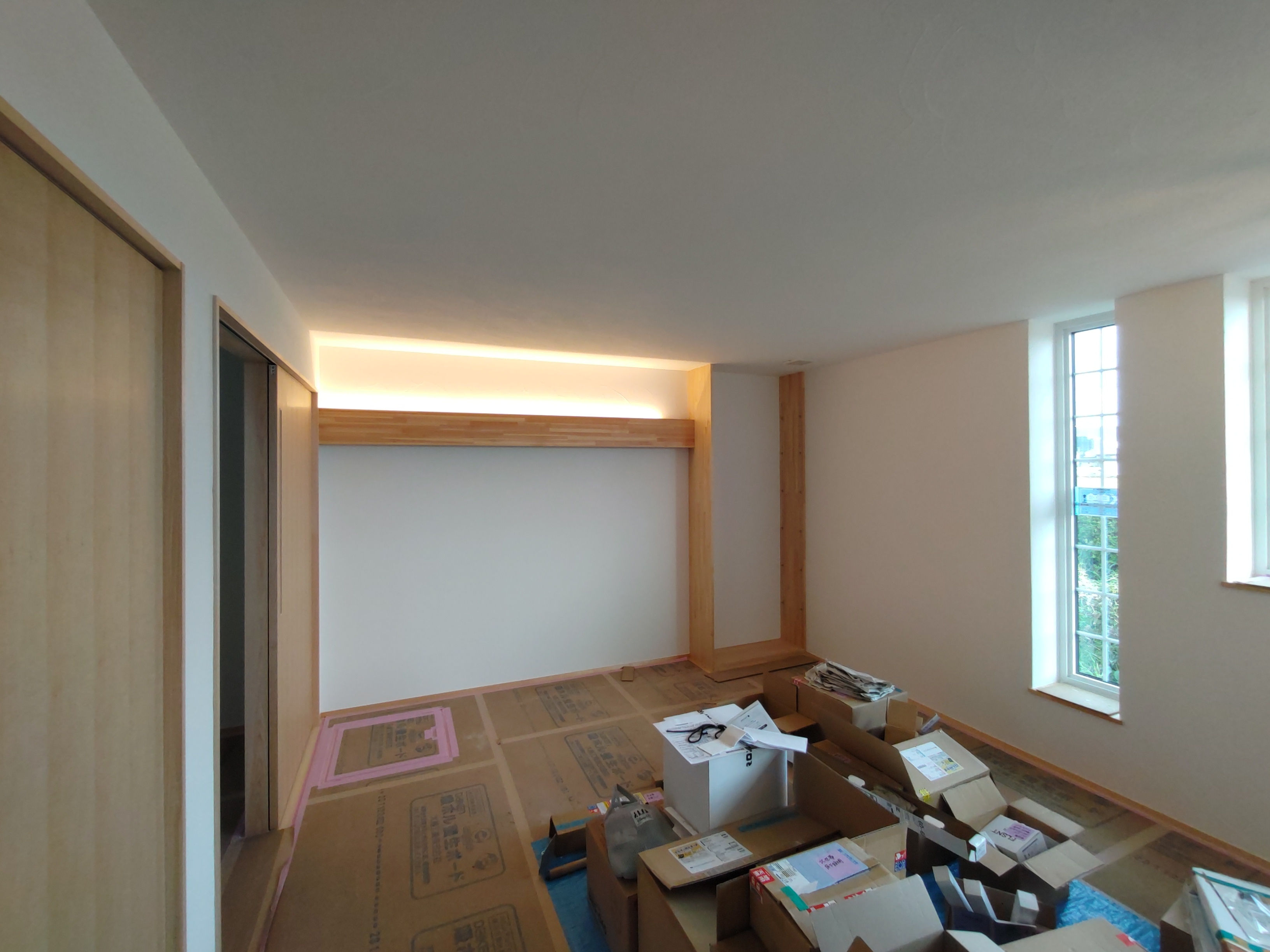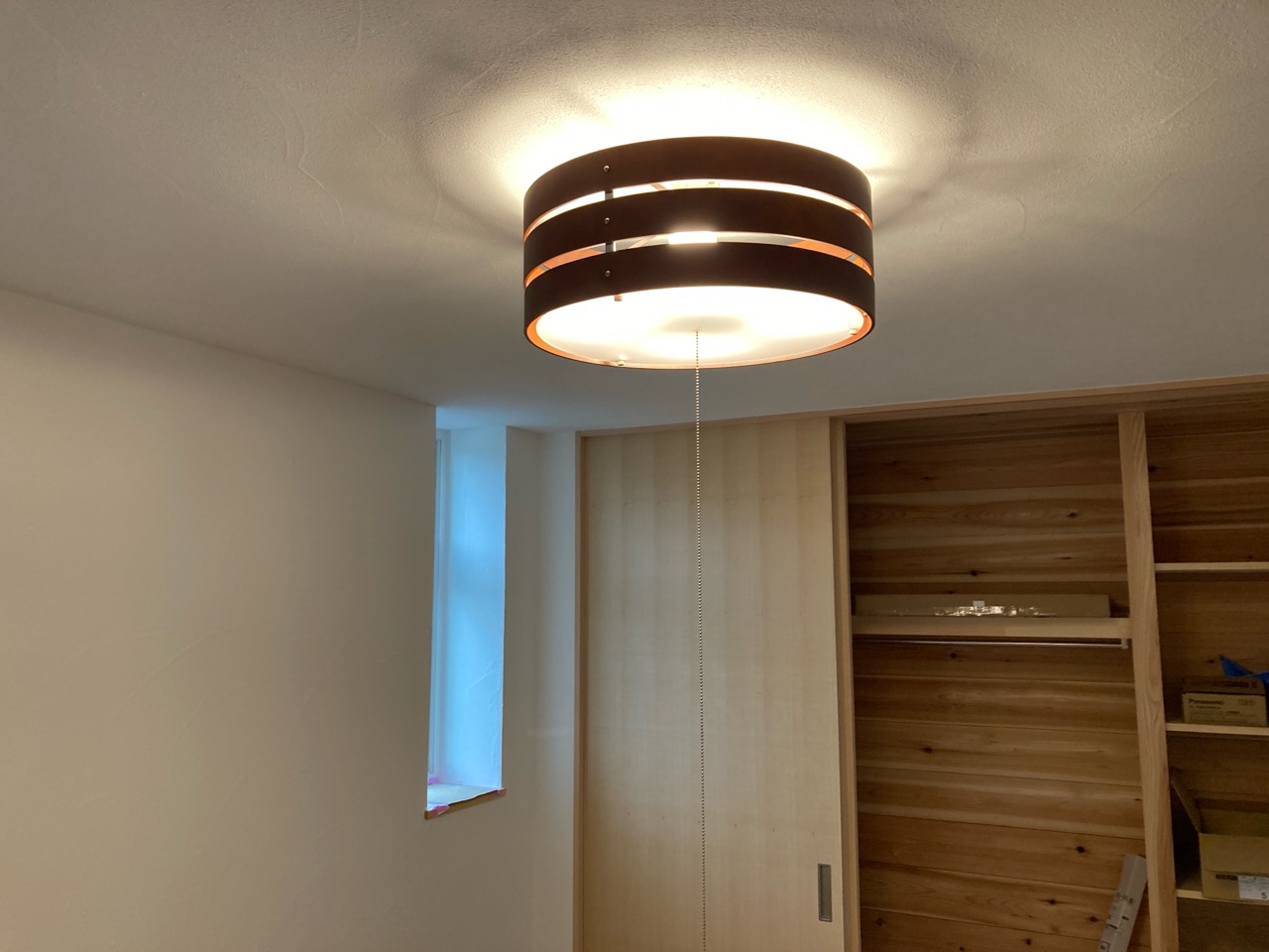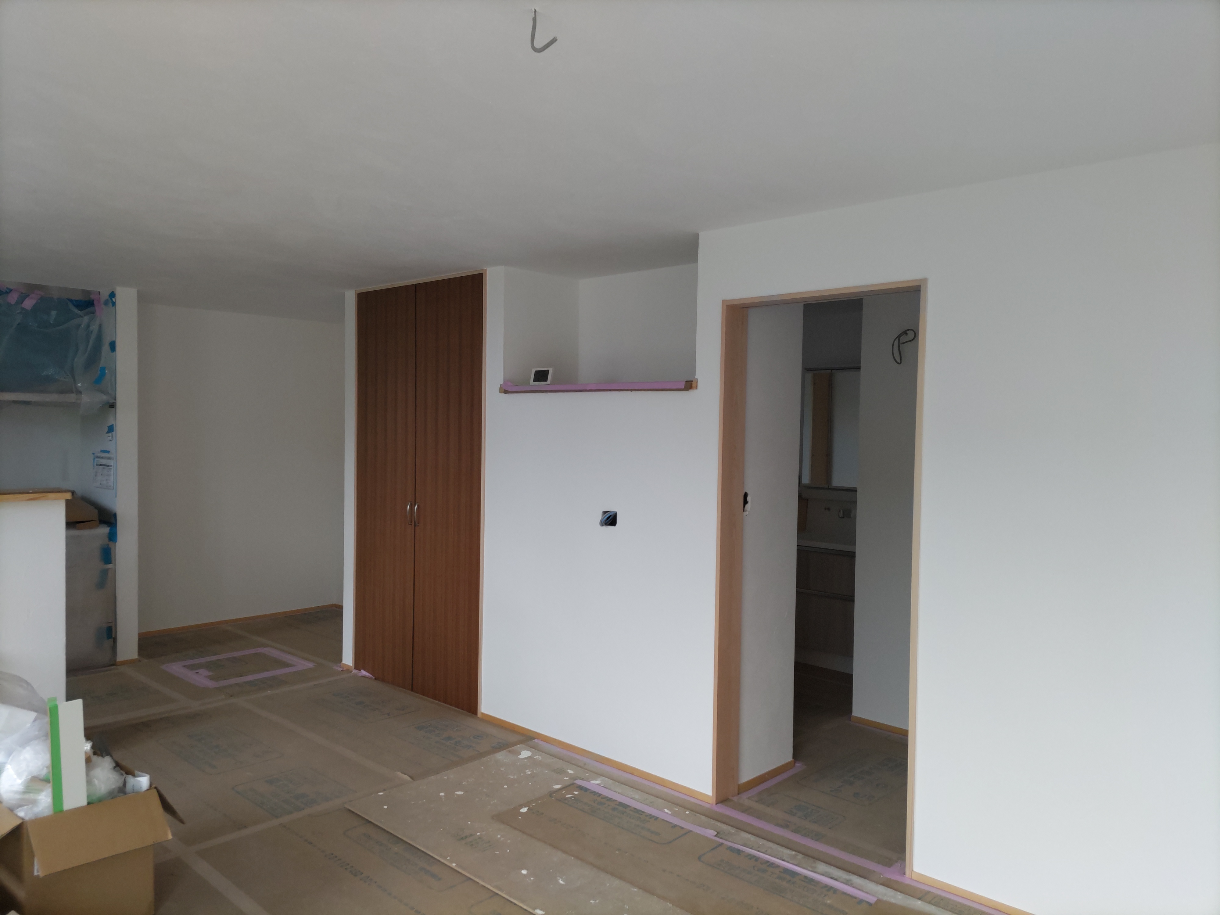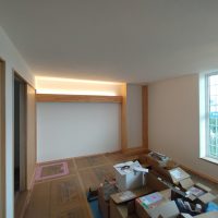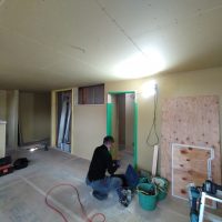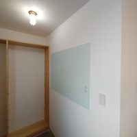 南世帯ではy様は主としてテレビは設置せず、漆喰壁にプロジェクタで投影する事で映像を見る、というスタイルをとられます。これであれば見たい場所に機器を移動して見たい時に見たい角度で観賞する事ができるという生活スタイルです。極端な話天井に投影して仰向けに寝ながらでも見る事ができるのです。工事中、照明器具のお打ち合わせの時に、シーリングライトではなくペンダントライトを室の中央を避けて縁の方に配置するのをご希望されていたのはこのためです、とうかがった時には目からウロコの思いでした。なんか、時代も変わってきたな・・・としみじみ。