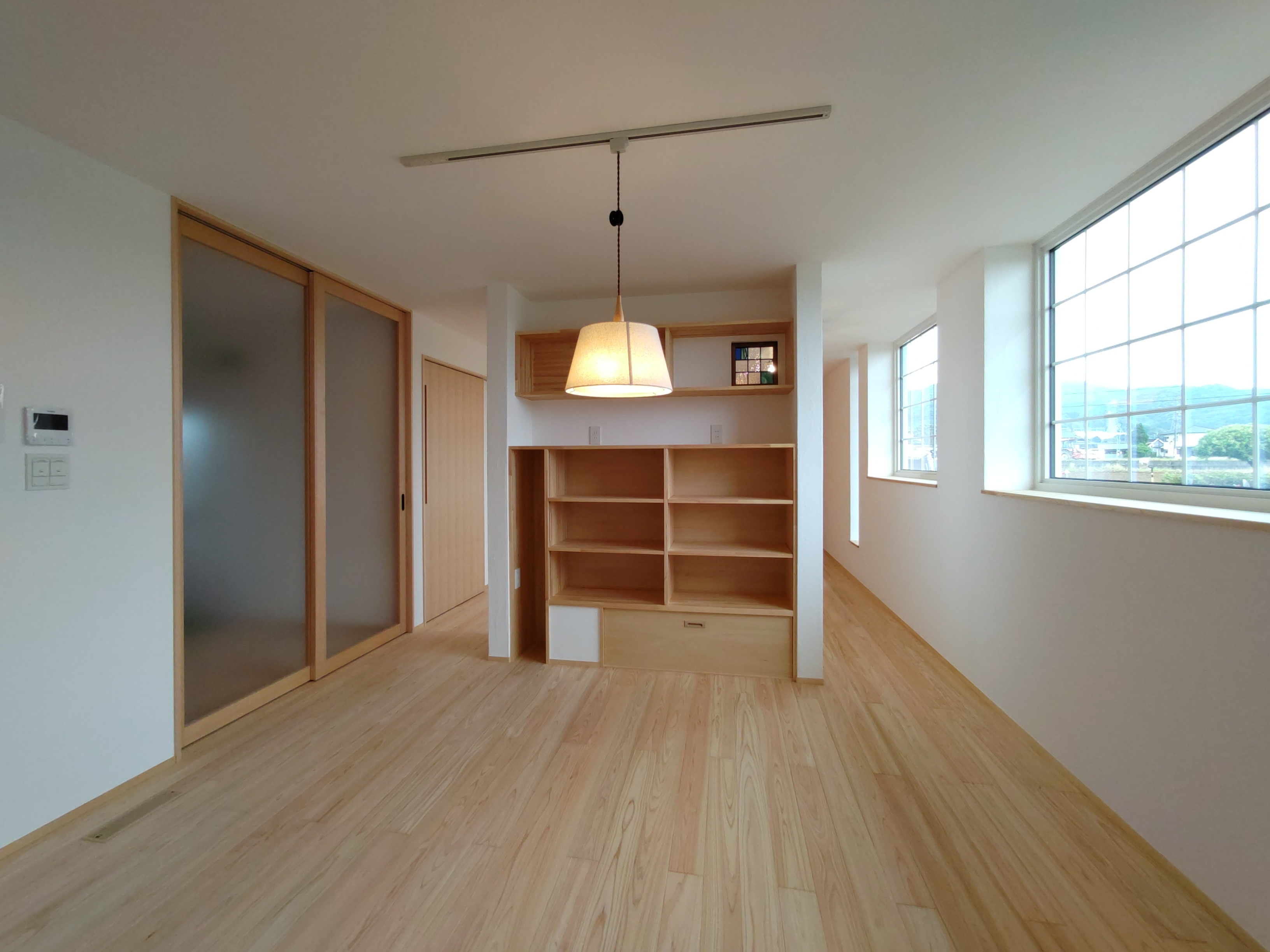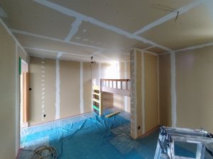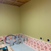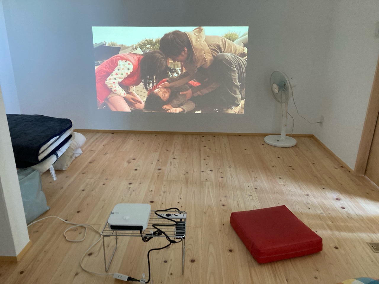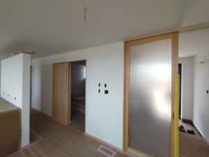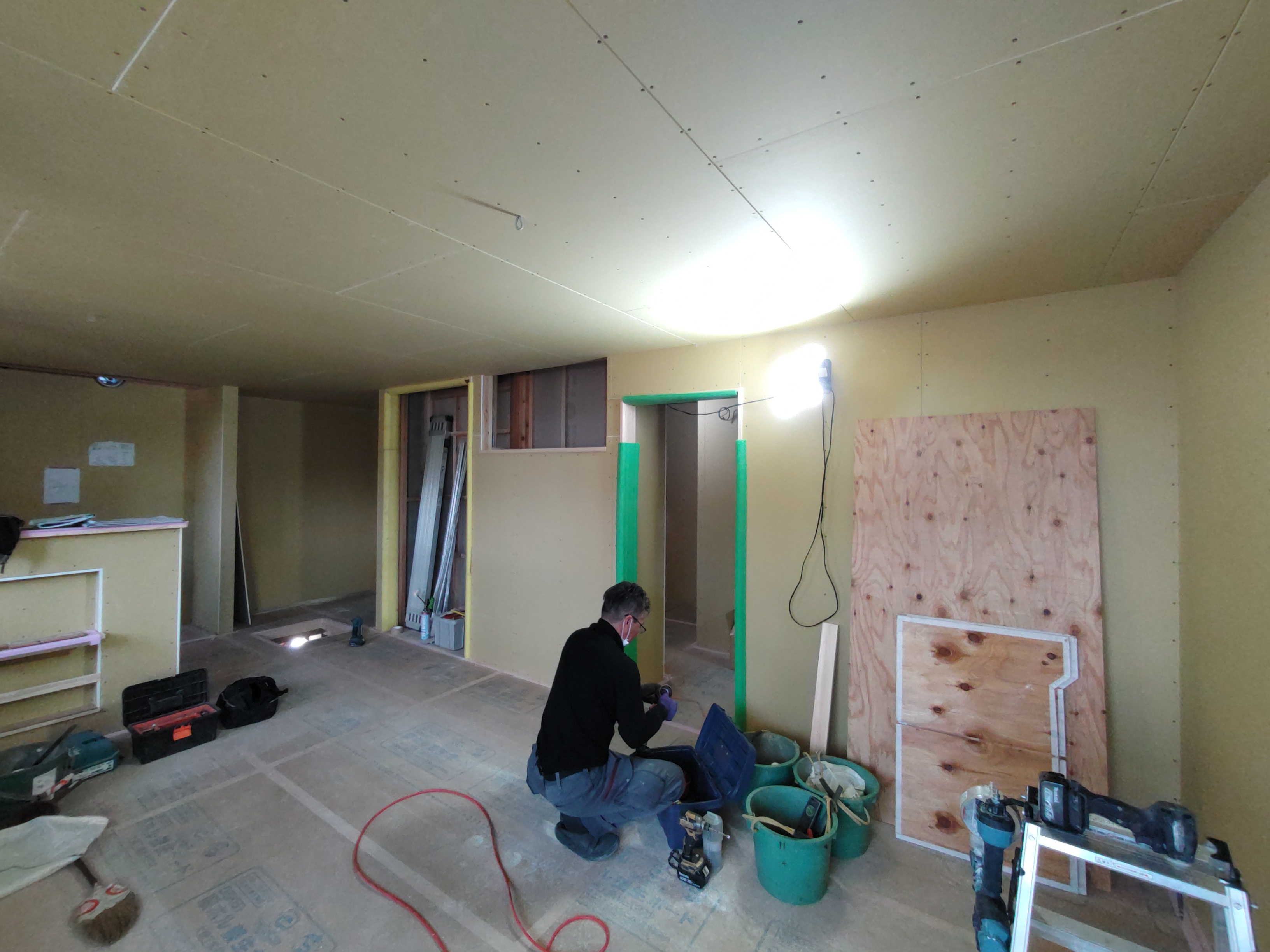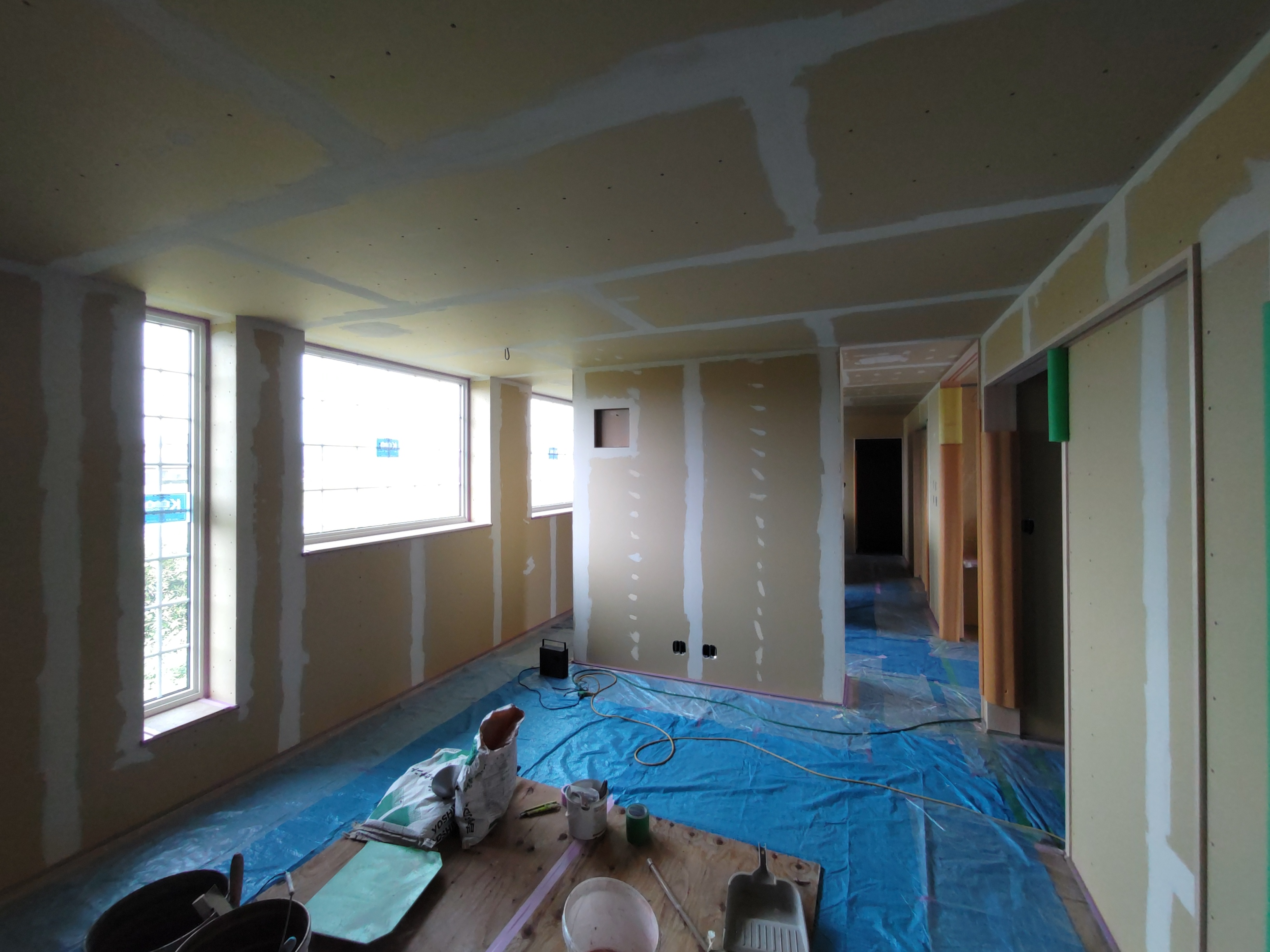 南世帯ではy様は主としてテレビは設置せず、漆喰壁にプロジェクタで投影する事で映像を見る、というスタイルをとられます。これであれば見たい場所に機器を移動して見たい時に見たい角度で観賞する事ができるという生活スタイルです。極端な話天井に投影して仰向けに寝ながらでも見る事ができるのです。工事中、照明器具のお打ち合わせの時に、シーリングライトではなくペンダントライトを室の中央を避けて縁の方に配置するのをご希望されていたのはこのためです、とうかがった時には目からウロコの思いでした。なんか、時代も変わってきたな・・・としみじみ。